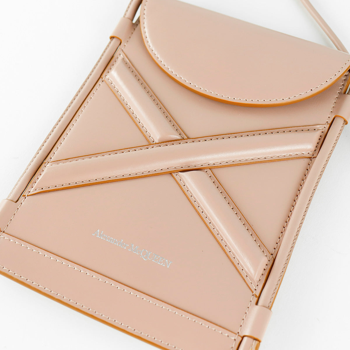 Bolso tipo crossbody Alexander McQueen, de la colección Curve, diseño aplanado con tiras cruzadas acolchadas en alto relieve, confeccionado en suave piel de cordero color rosa claro y vino al interior.