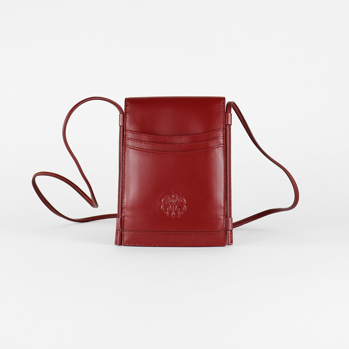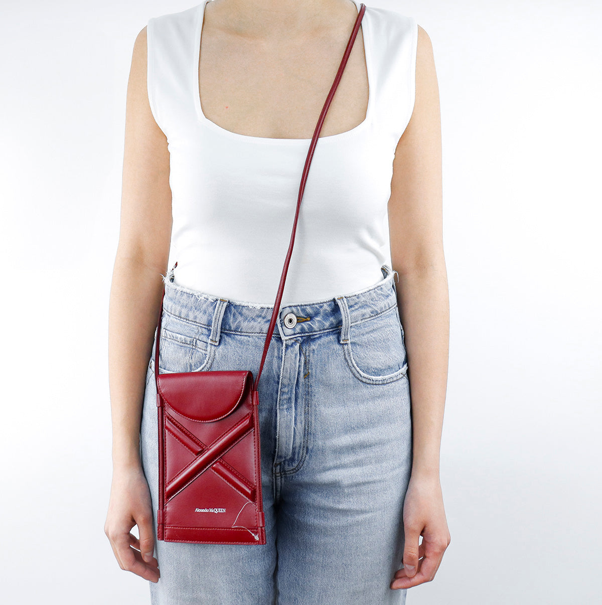 Bolso tipo crossbody Alexander McQueen, de la colección Curve, diseño aplanado con tiras cruzadas acolchadas en alto relieve, confeccionado en suave piel de cordero color vino y rojo al interior.