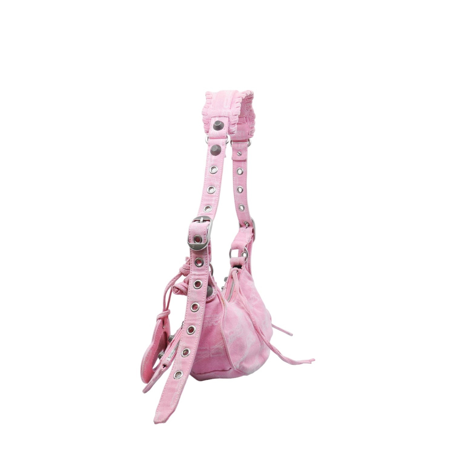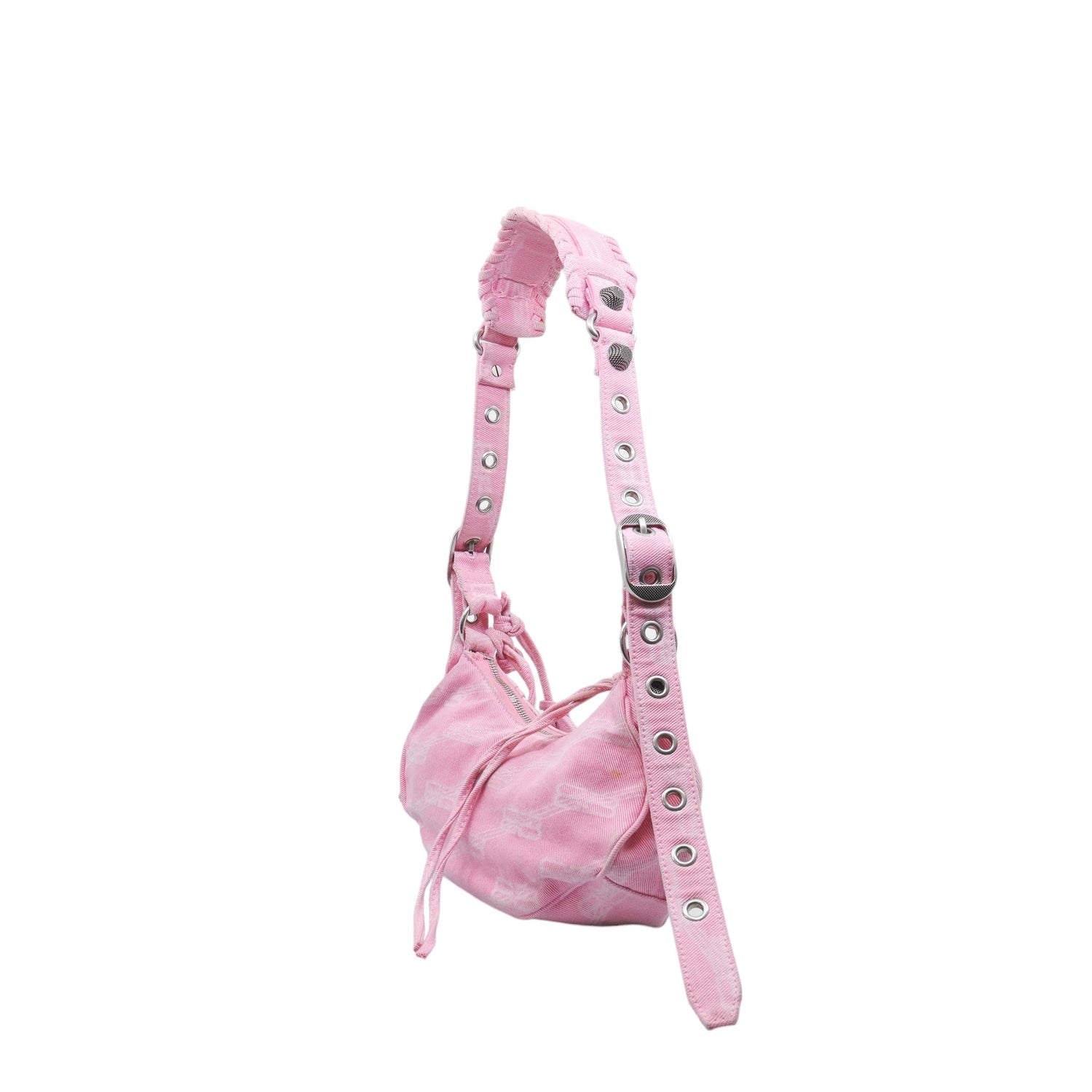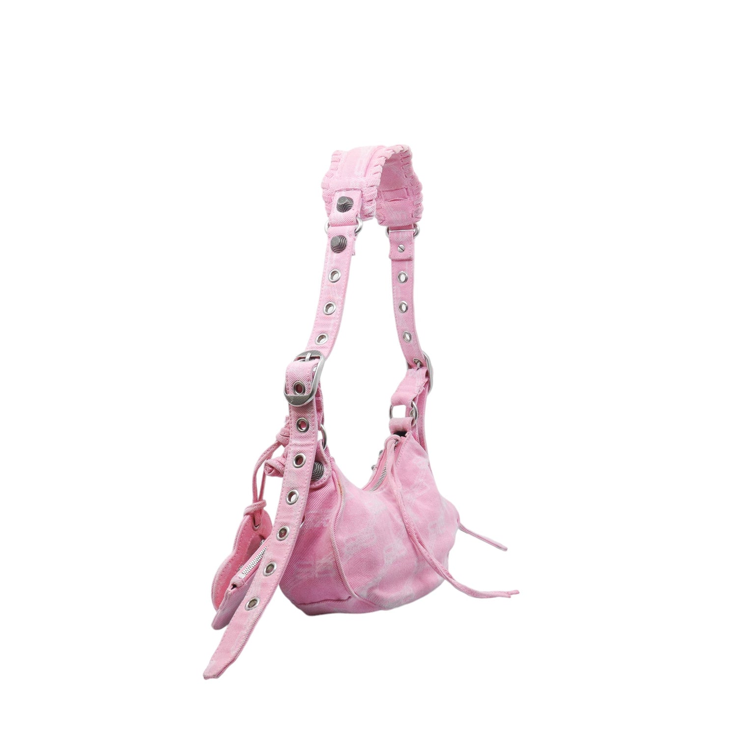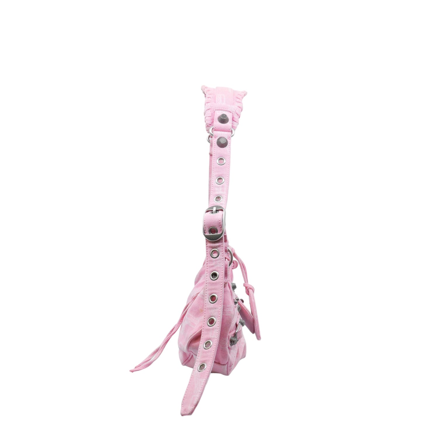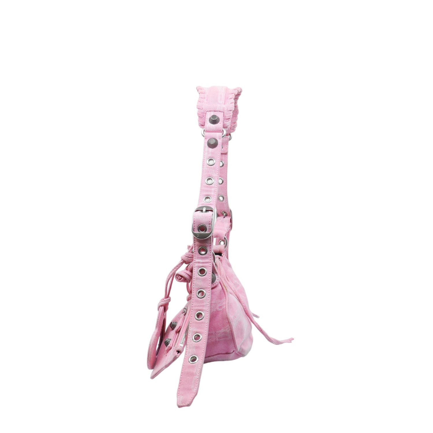 Bolso Balenciaga de la línea Le Cagole, confecionado en demin de algodón color rosa, forro textil en color negro, con estoperoles y herrajes en color plata desgastada, asa ajustable al hombro y espejo, sucia por uspo regular. ARTíCULO DE SEGUNDA MANO EN BUEN ESTADO. No cuenta con cubre polvo.