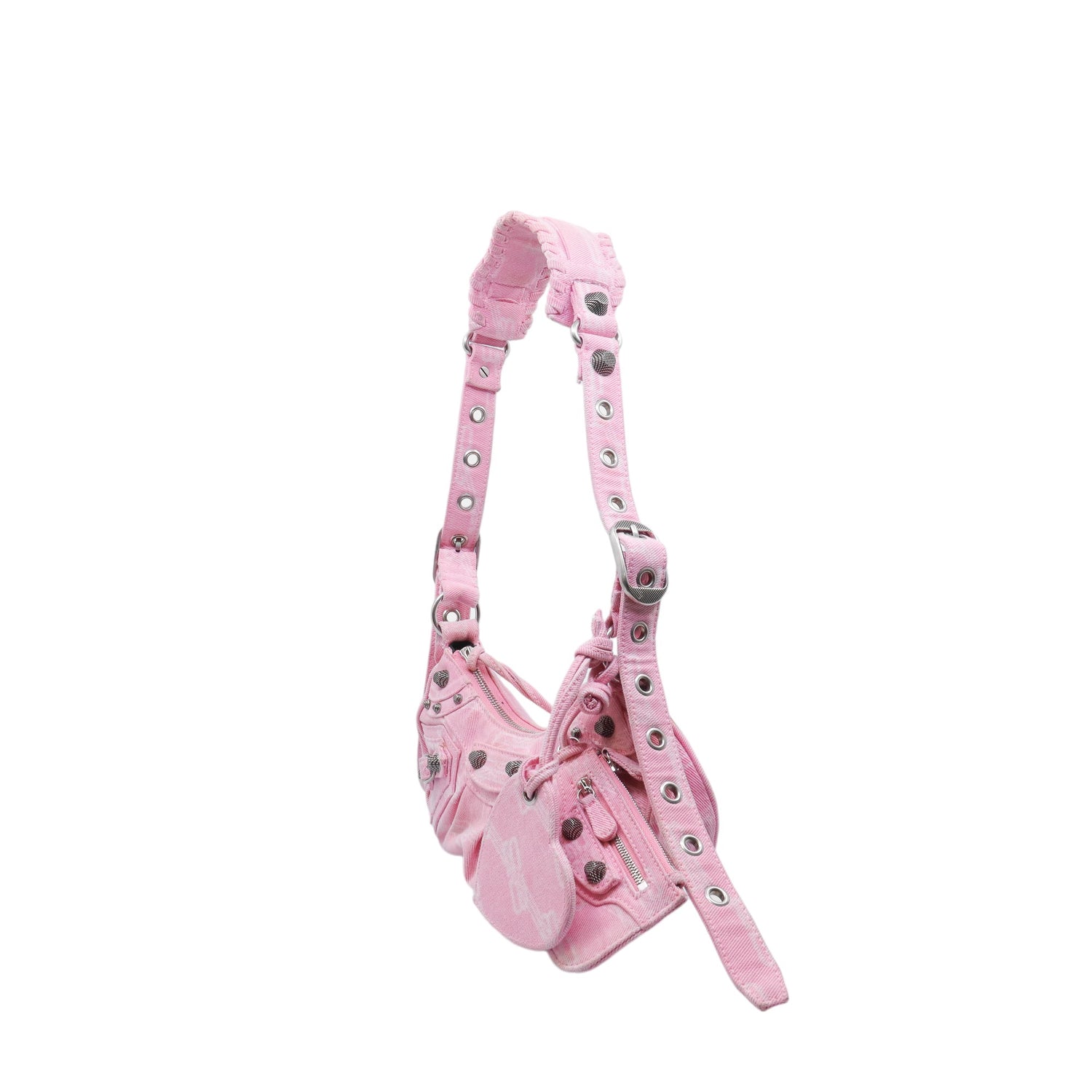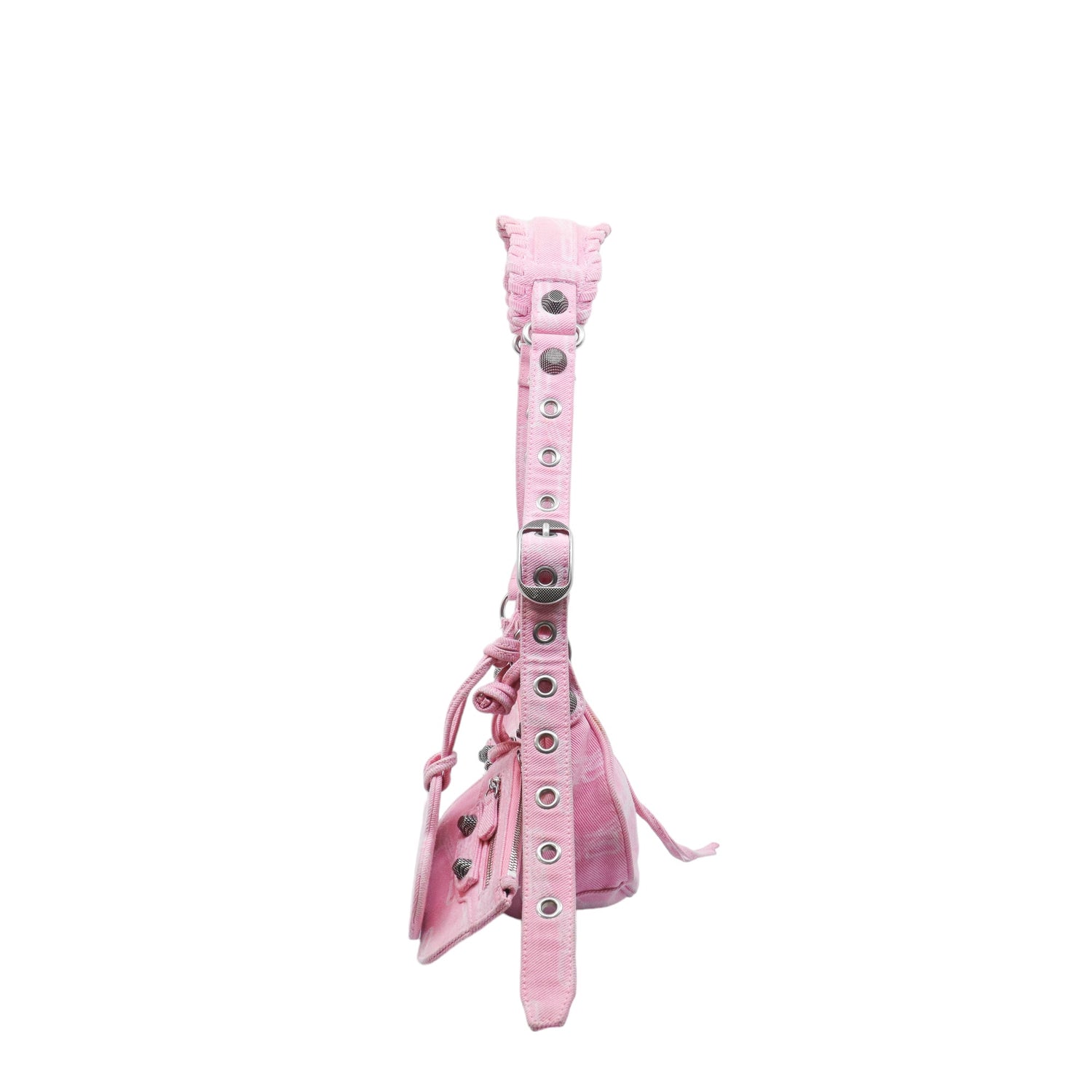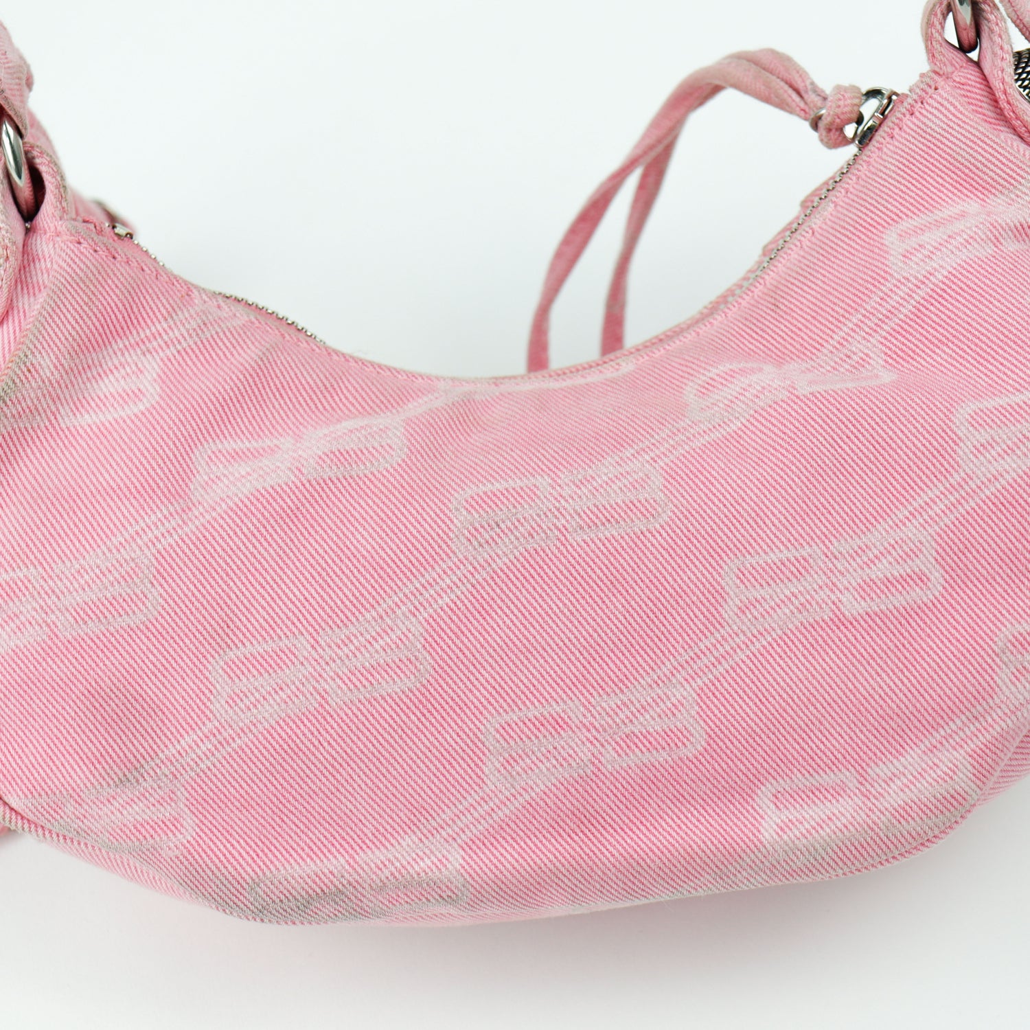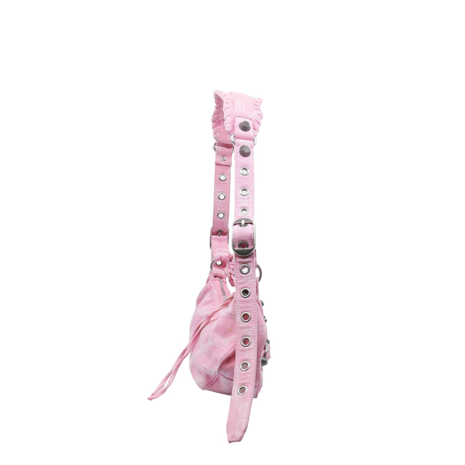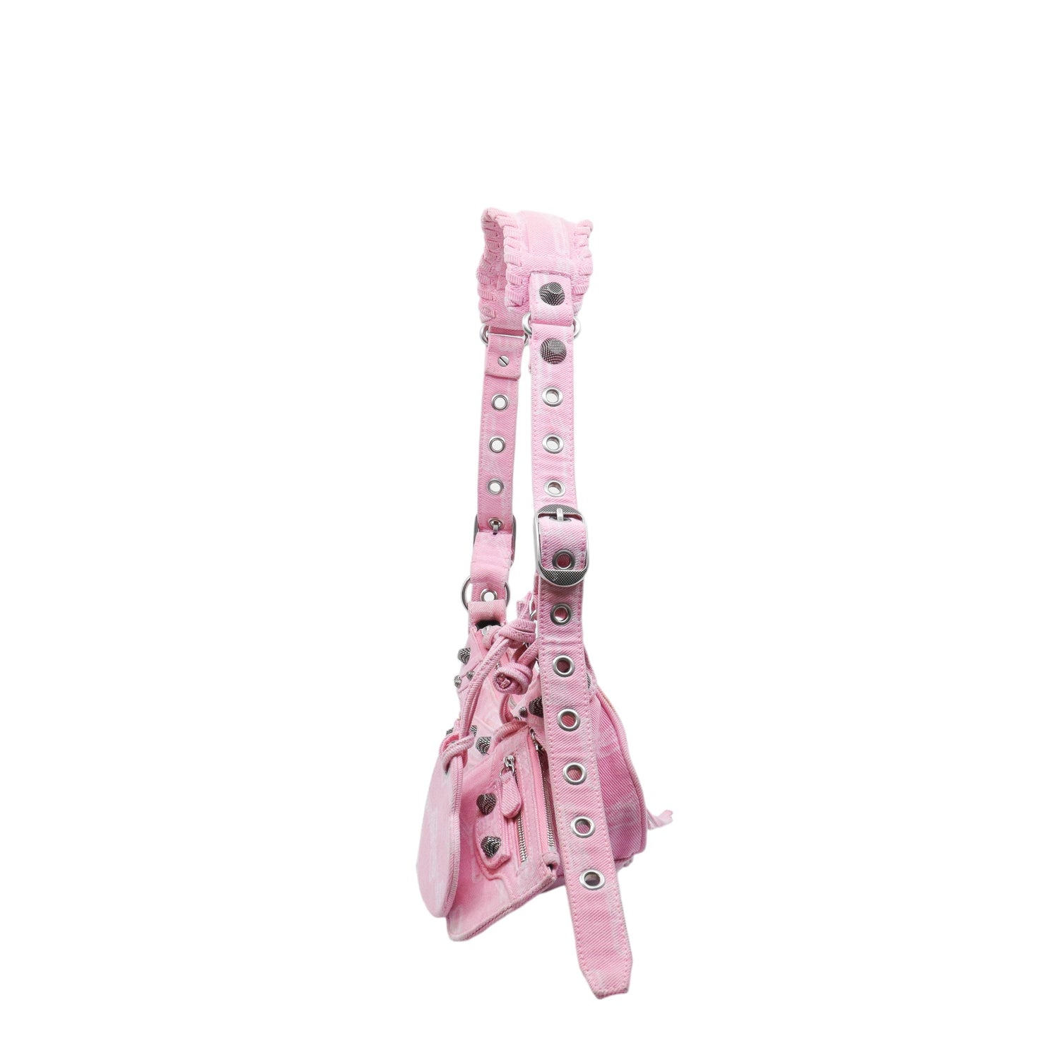 Bolso Balenciaga de la línea Le Cagole, confecionado en demin de algodón color rosa, forro textil en color negro, con estoperoles y herrajes en color plata desgastada, asa ajustable al hombro y espejo, sucia por uspo regular. ARTíCULO DE SEGUNDA MANO EN BUEN ESTADO. No cuenta con cubre polvo.