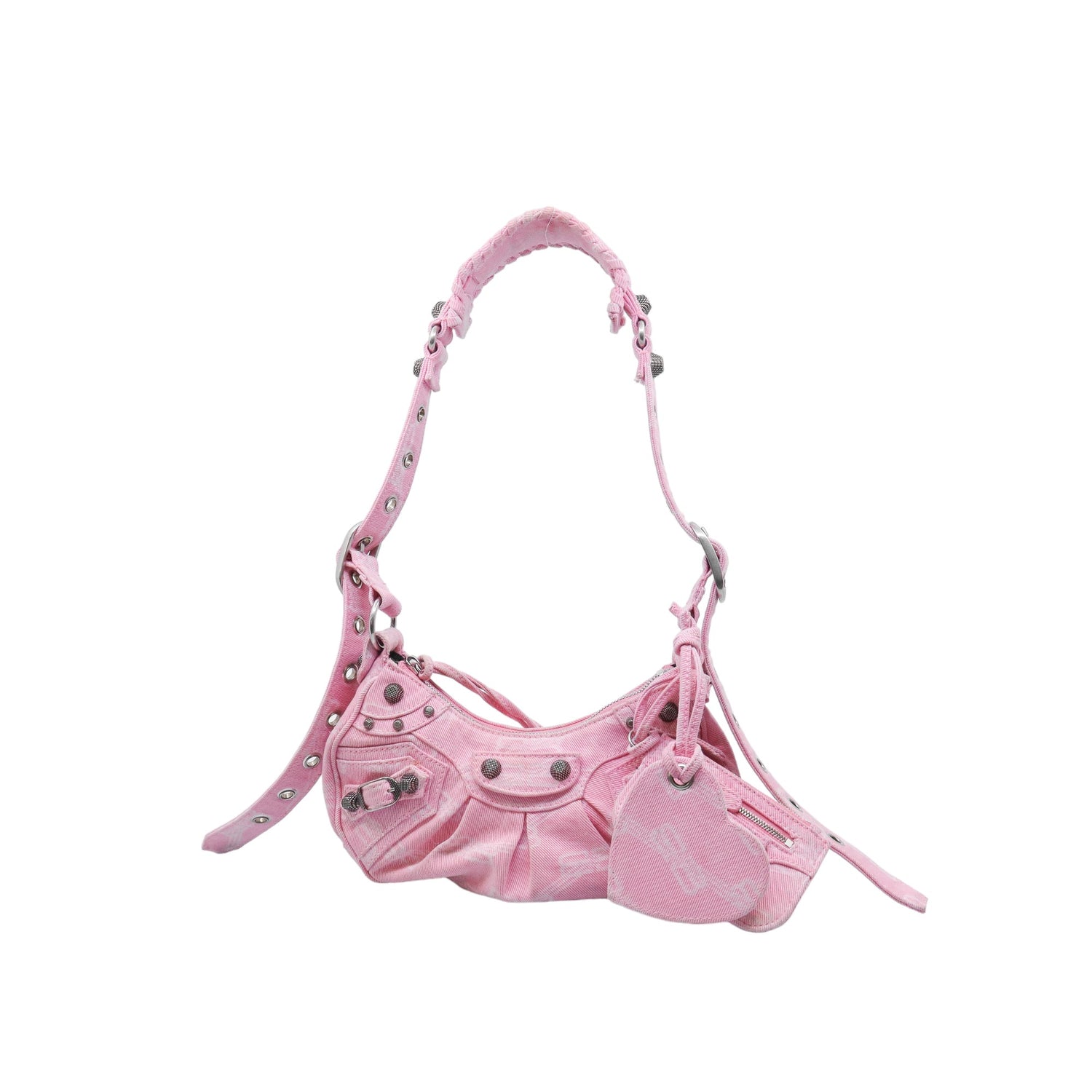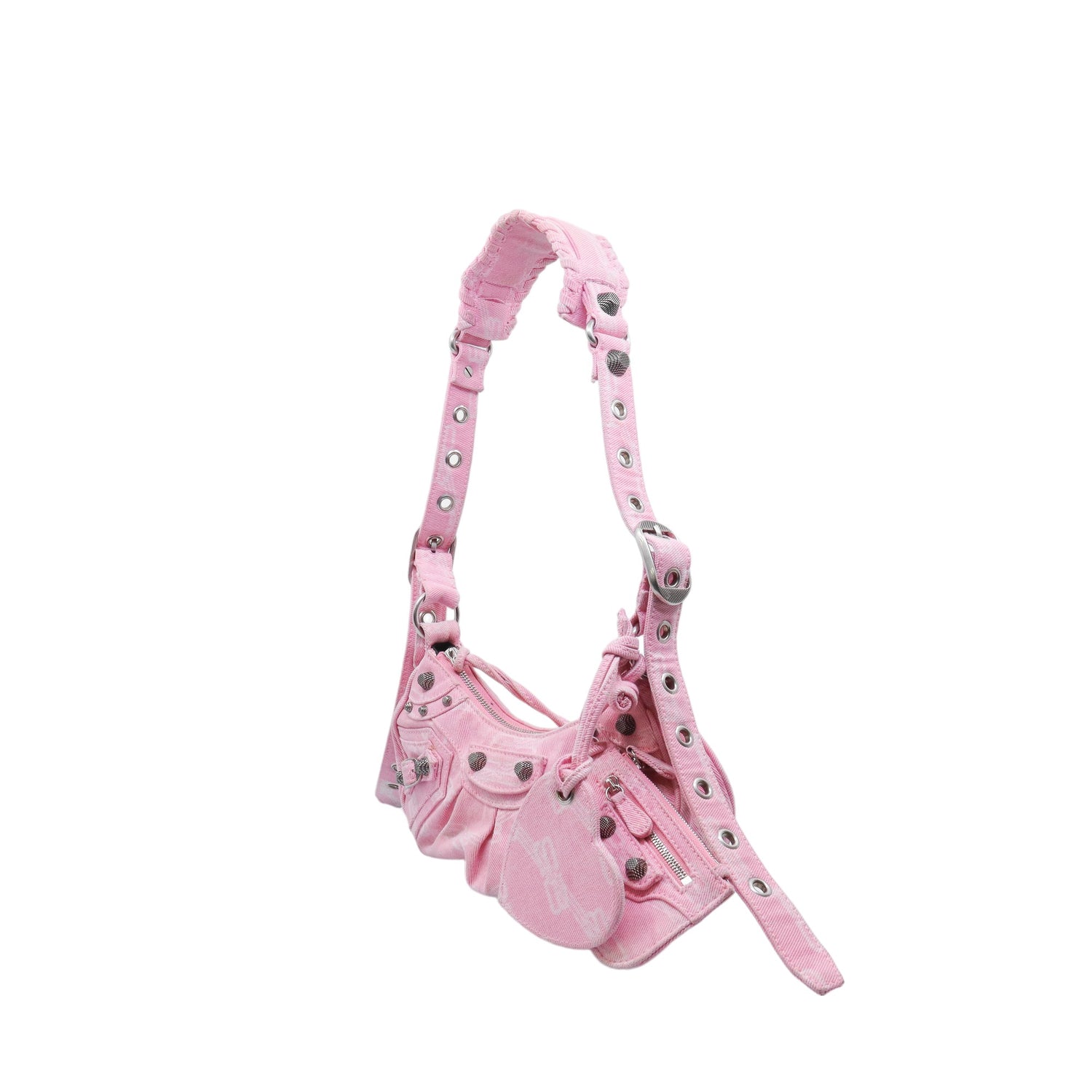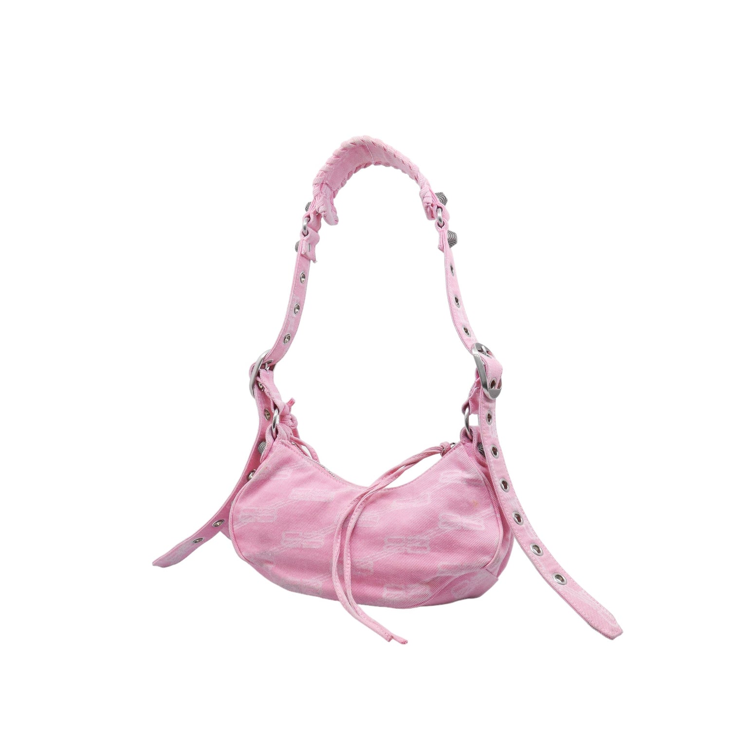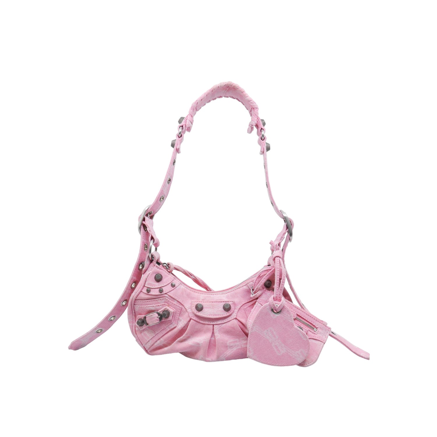 Bolso Balenciaga de la línea Le Cagole, confecionado en demin de algodón color rosa, forro textil en color negro, con estoperoles y herrajes en color plata desgastada, asa ajustable al hombro y espejo, sucia por uspo regular. ARTíCULO DE SEGUNDA MANO EN BUEN ESTADO. No cuenta con cubre polvo.