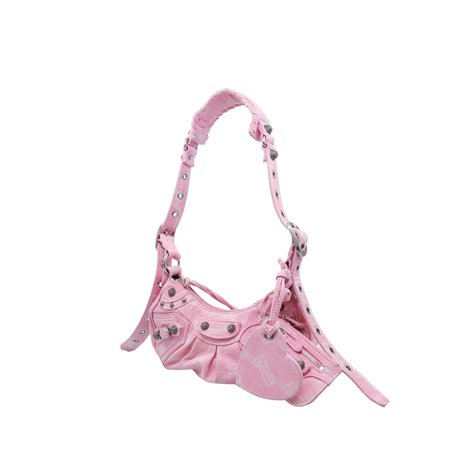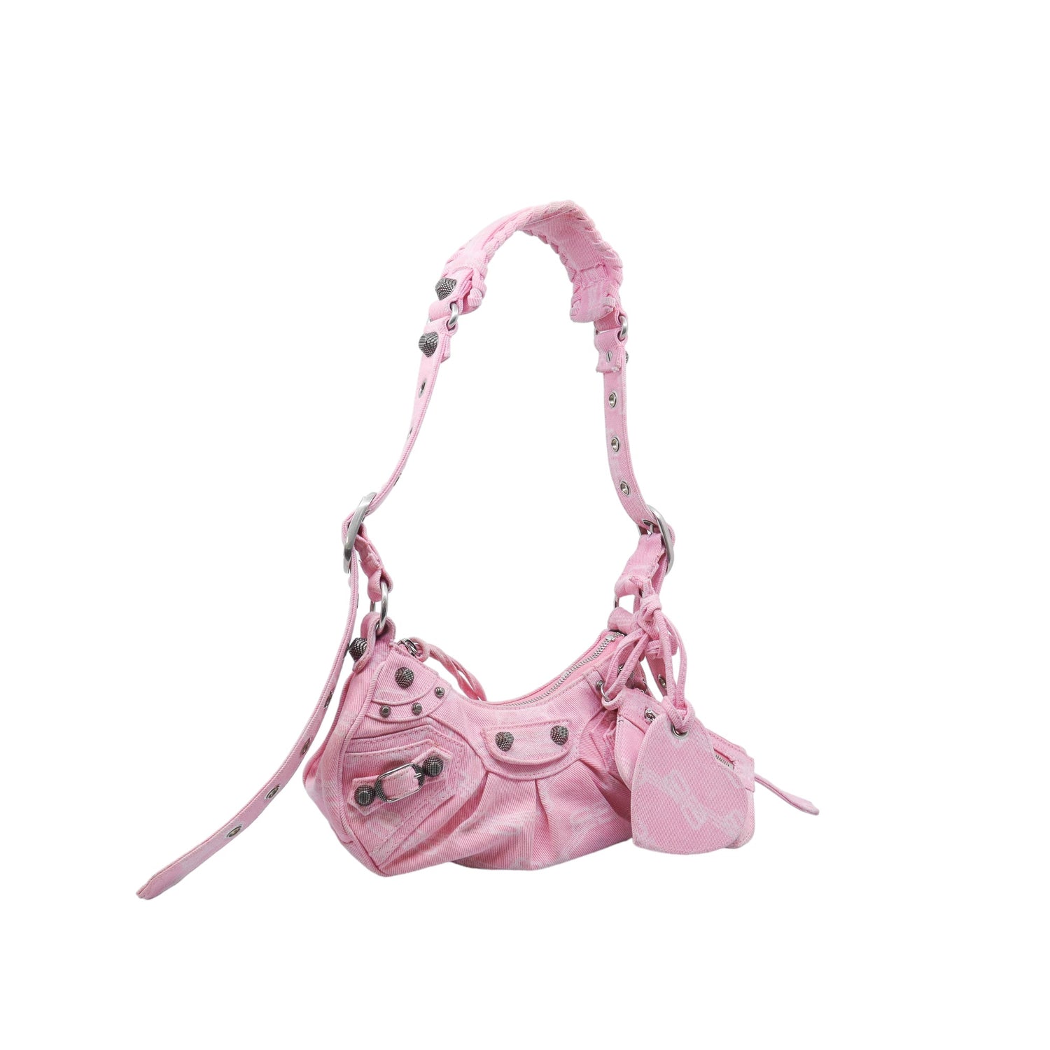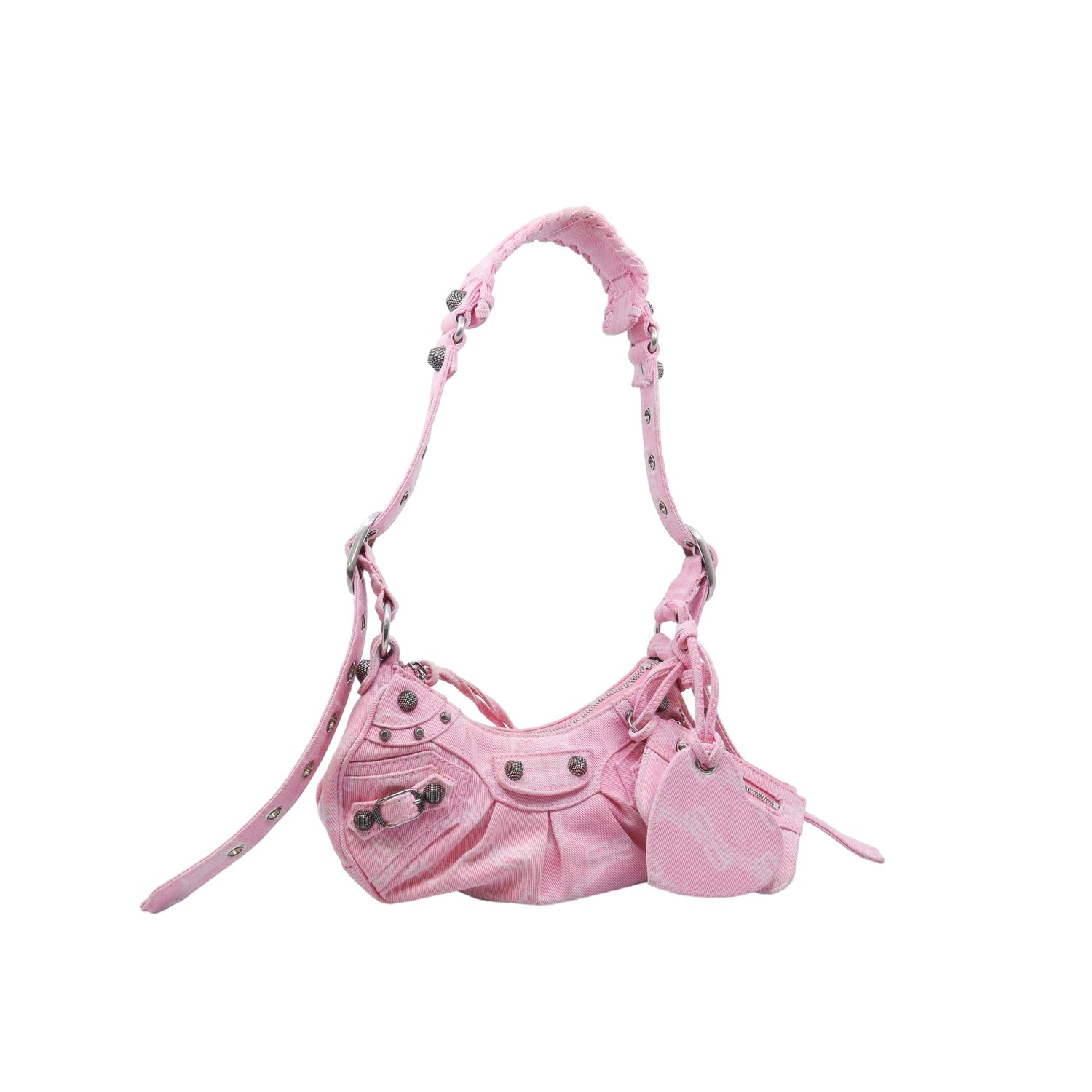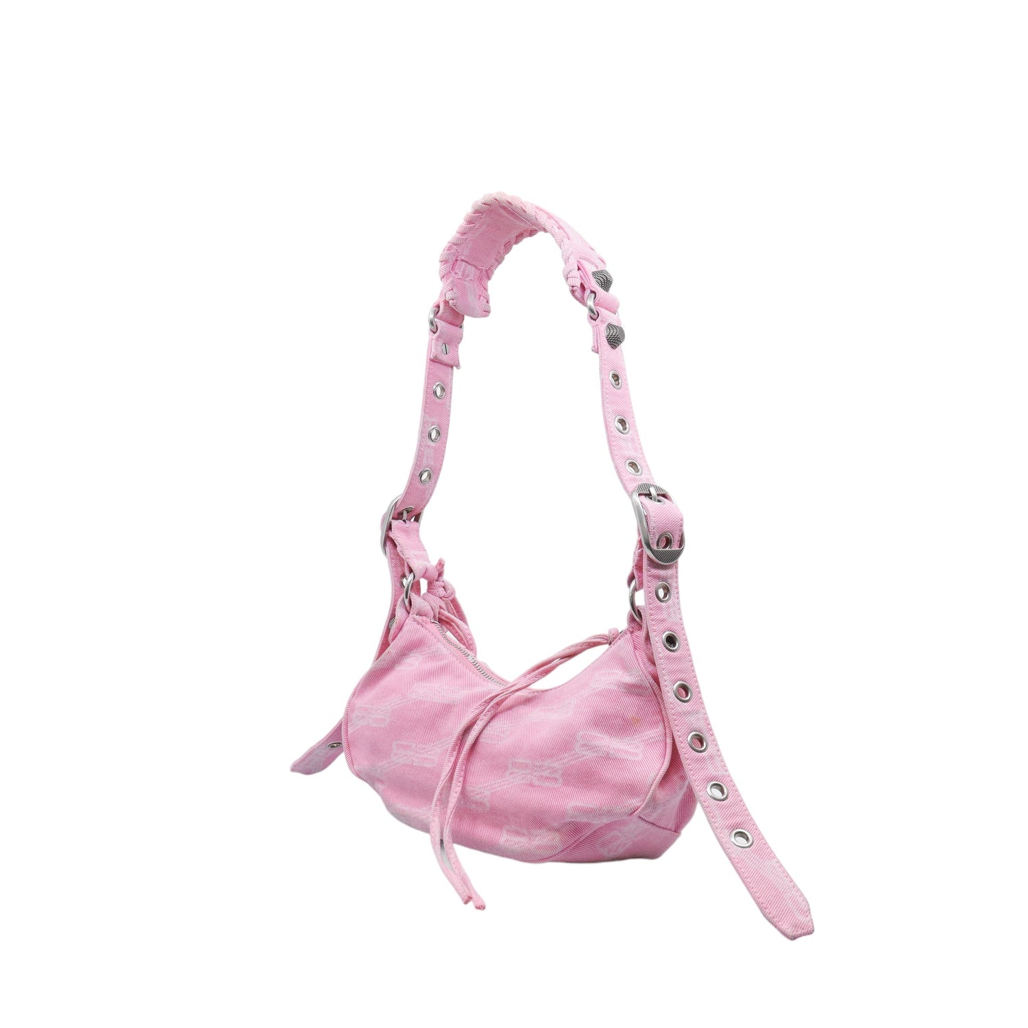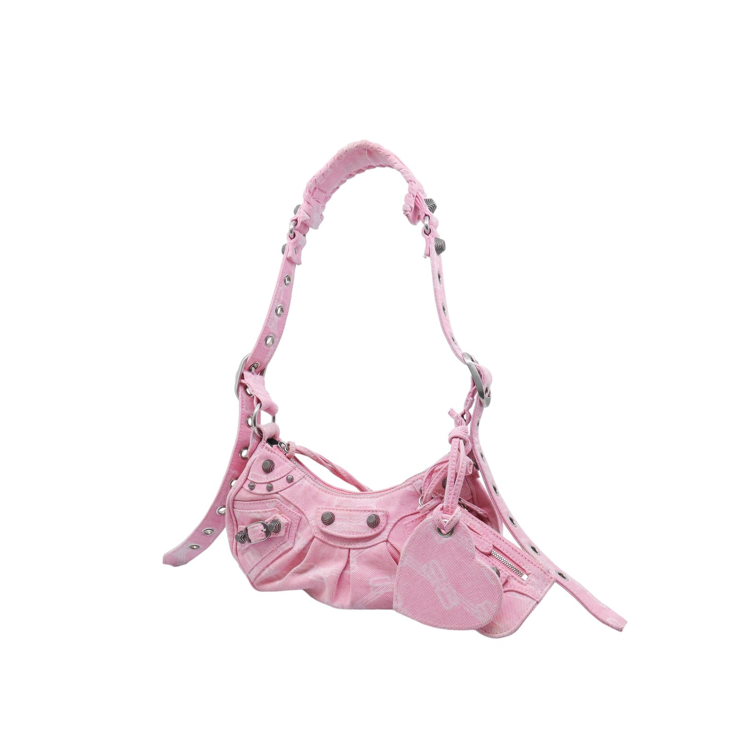 Bolso Balenciaga de la línea Le Cagole, confecionado en demin de algodón color rosa, forro textil en color negro, con estoperoles y herrajes en color plata desgastada, asa ajustable al hombro y espejo, sucia por uspo regular. ARTíCULO DE SEGUNDA MANO EN BUEN ESTADO. No cuenta con cubre polvo.