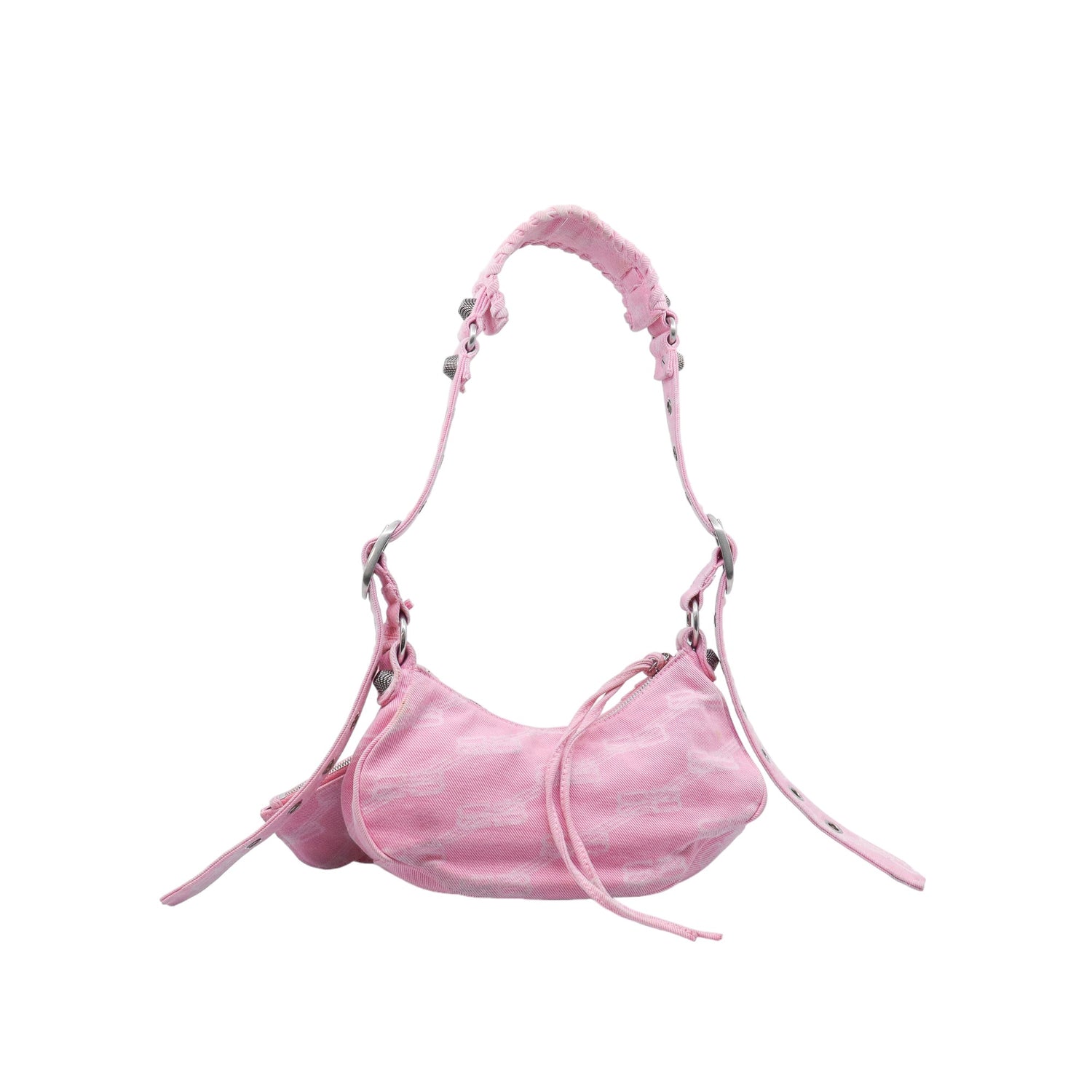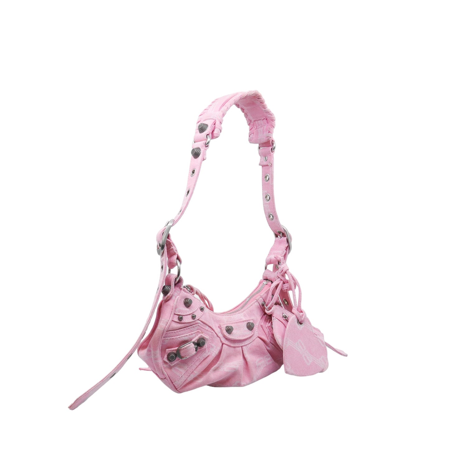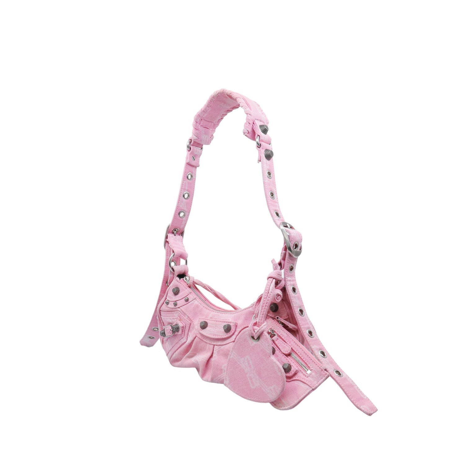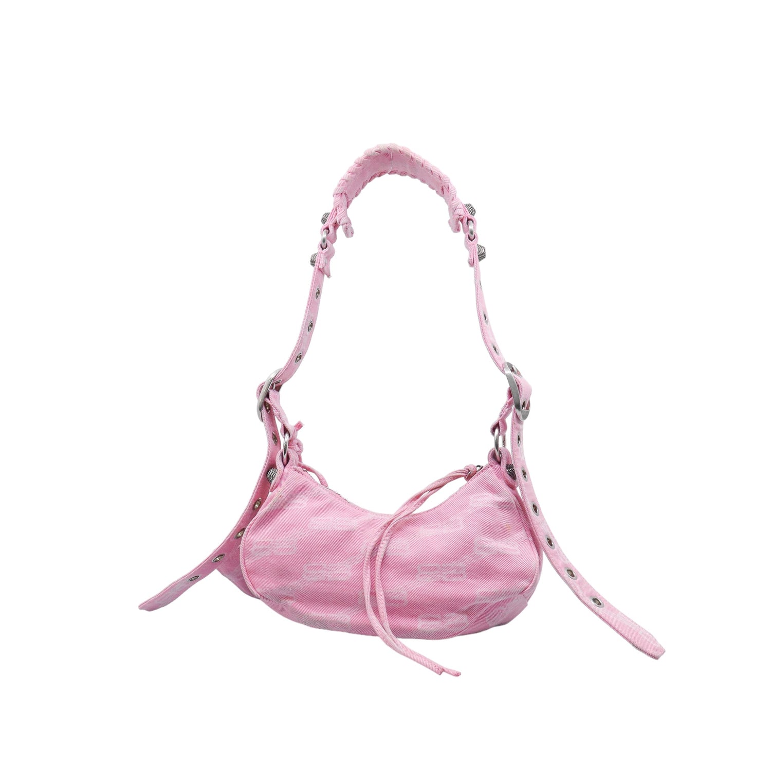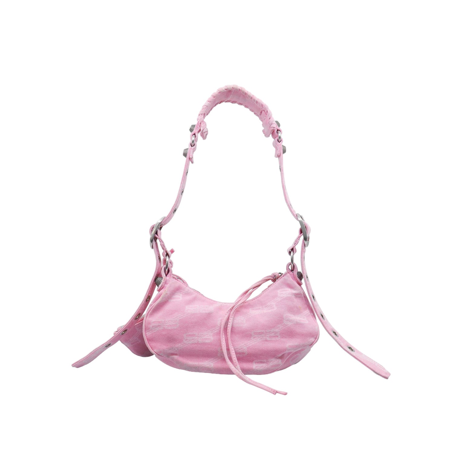 Bolso Balenciaga de la línea Le Cagole, confecionado en demin de algodón color rosa, forro textil en color negro, con estoperoles y herrajes en color plata desgastada, asa ajustable al hombro y espejo, sucia por uspo regular. ARTíCULO DE SEGUNDA MANO EN BUEN ESTADO. No cuenta con cubre polvo.