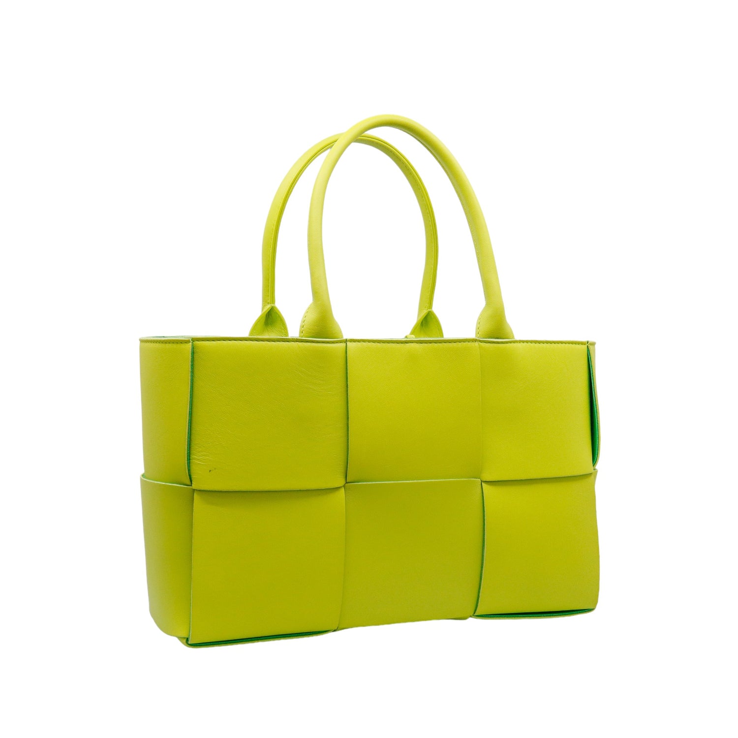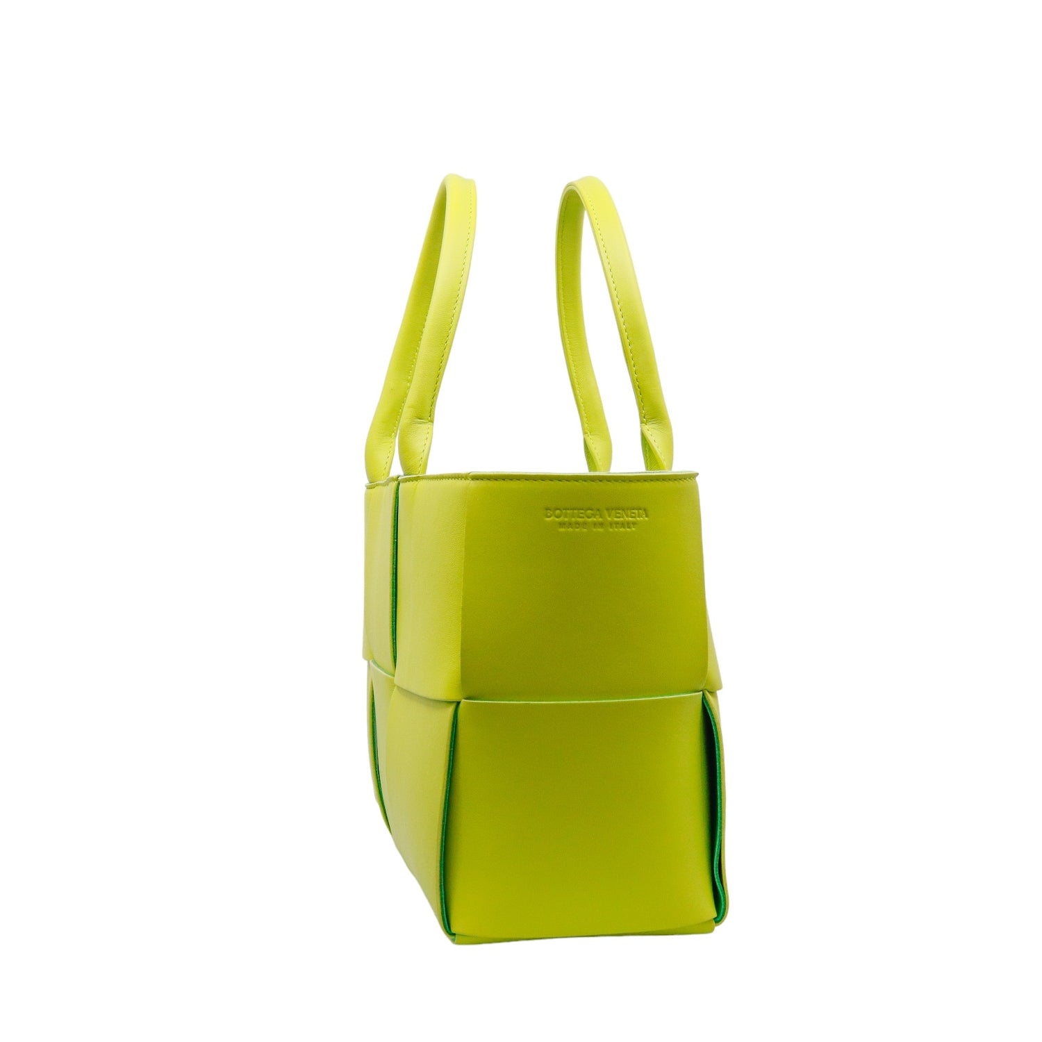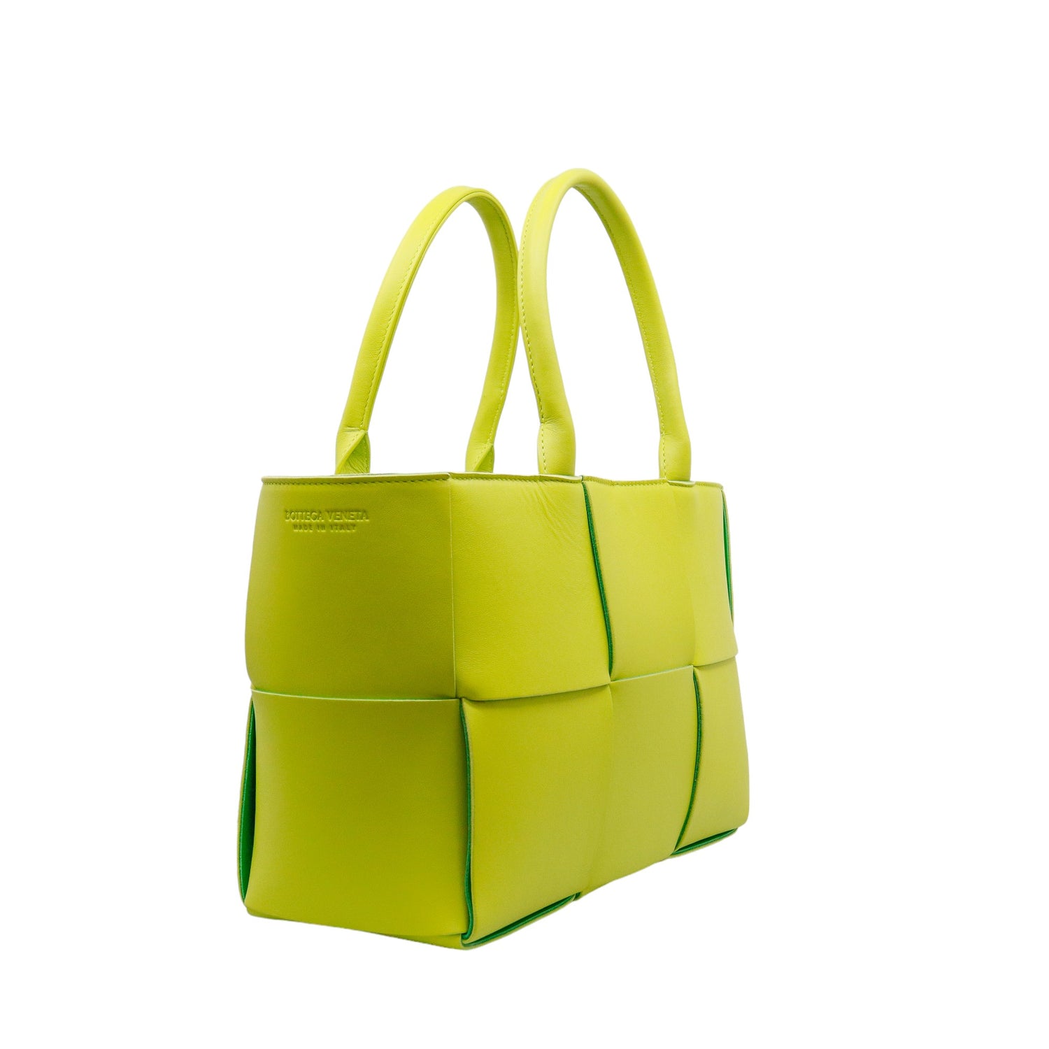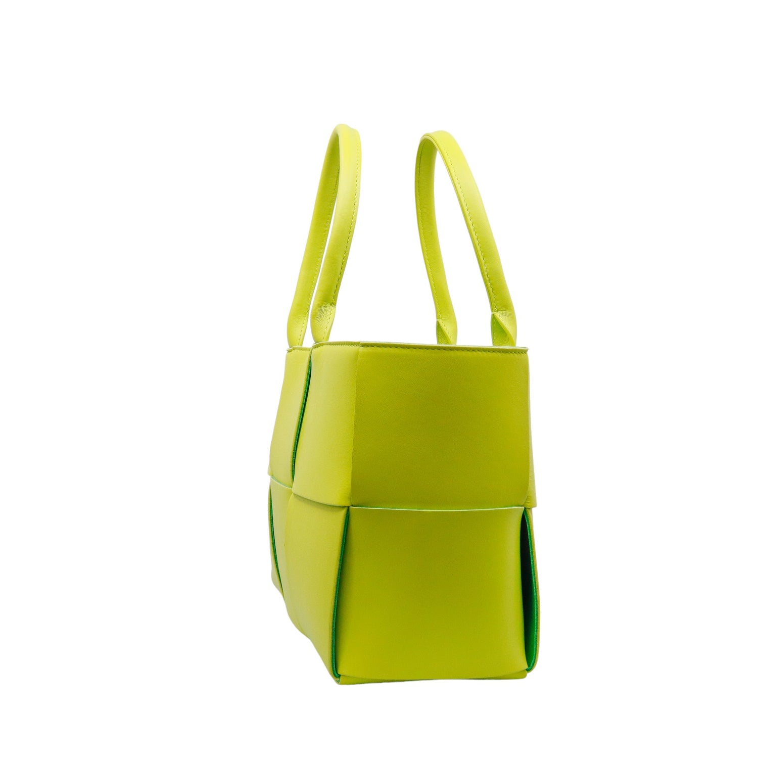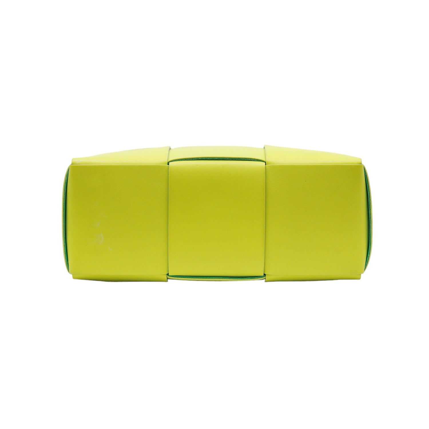 Bolso tipo tote Bottega Veneta Intrecciato de la línea Arco, confeccionado en piel color verde limón, bolso interno extraíble y forro en color verde, con 2 asas rígidas, pequeña mancha al interior.
