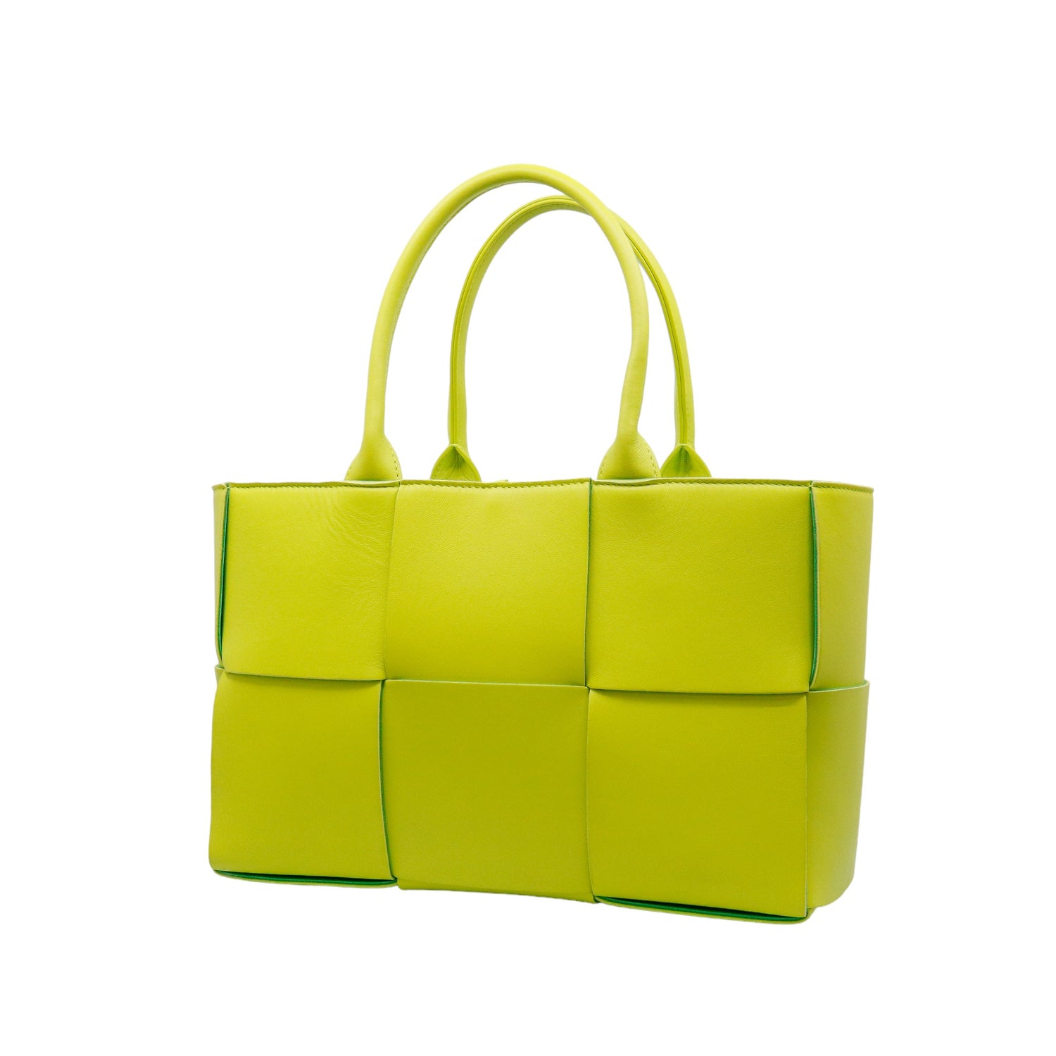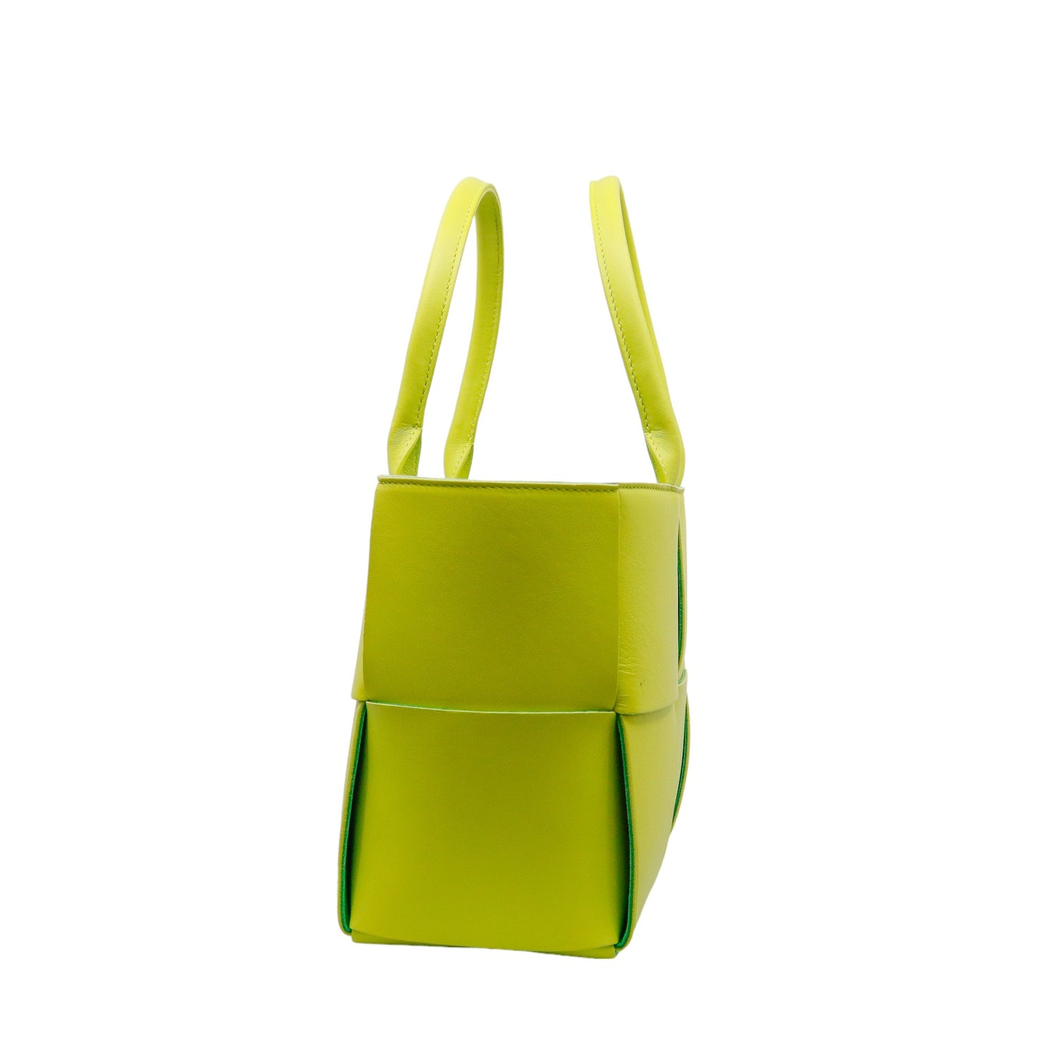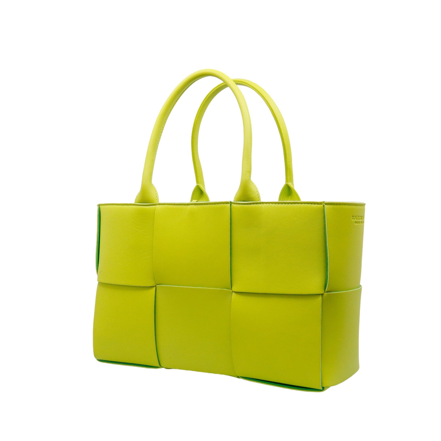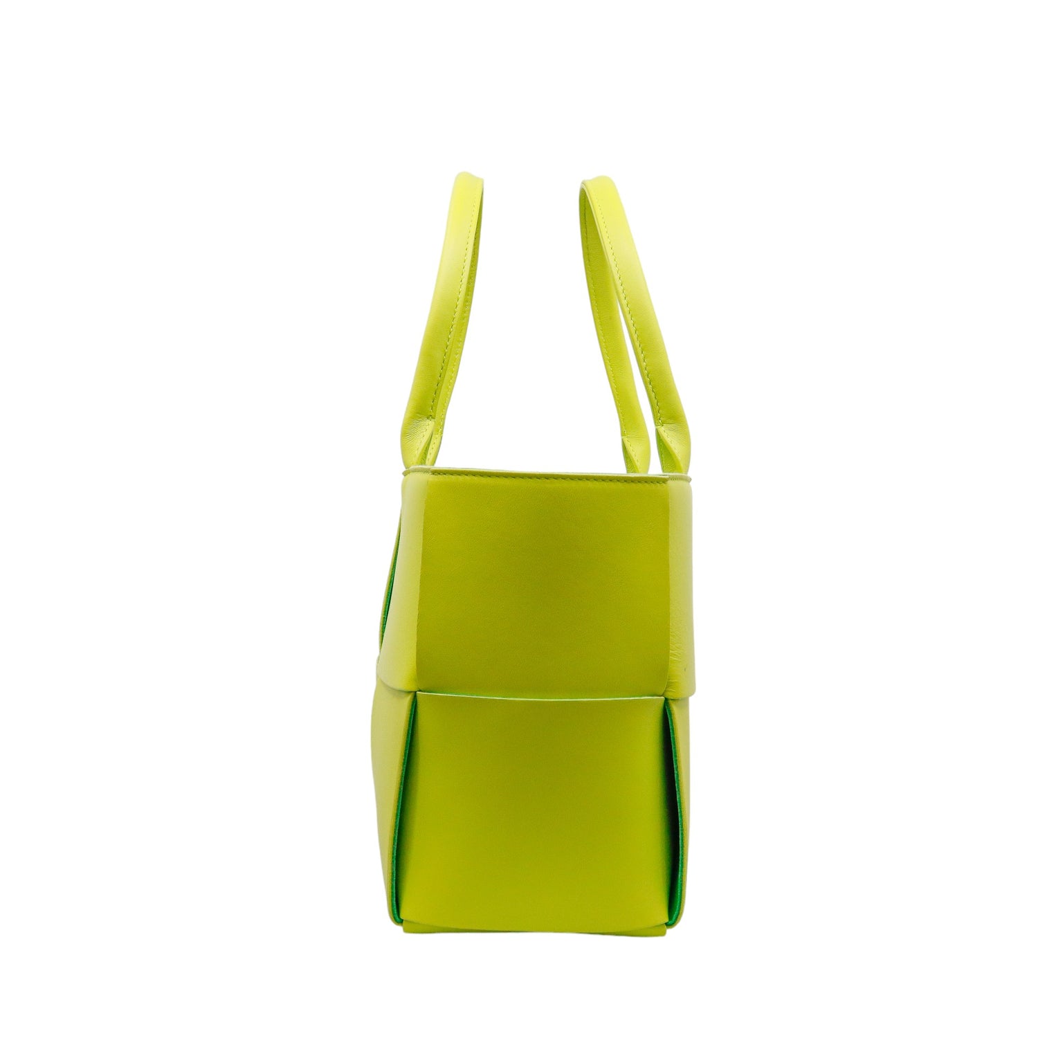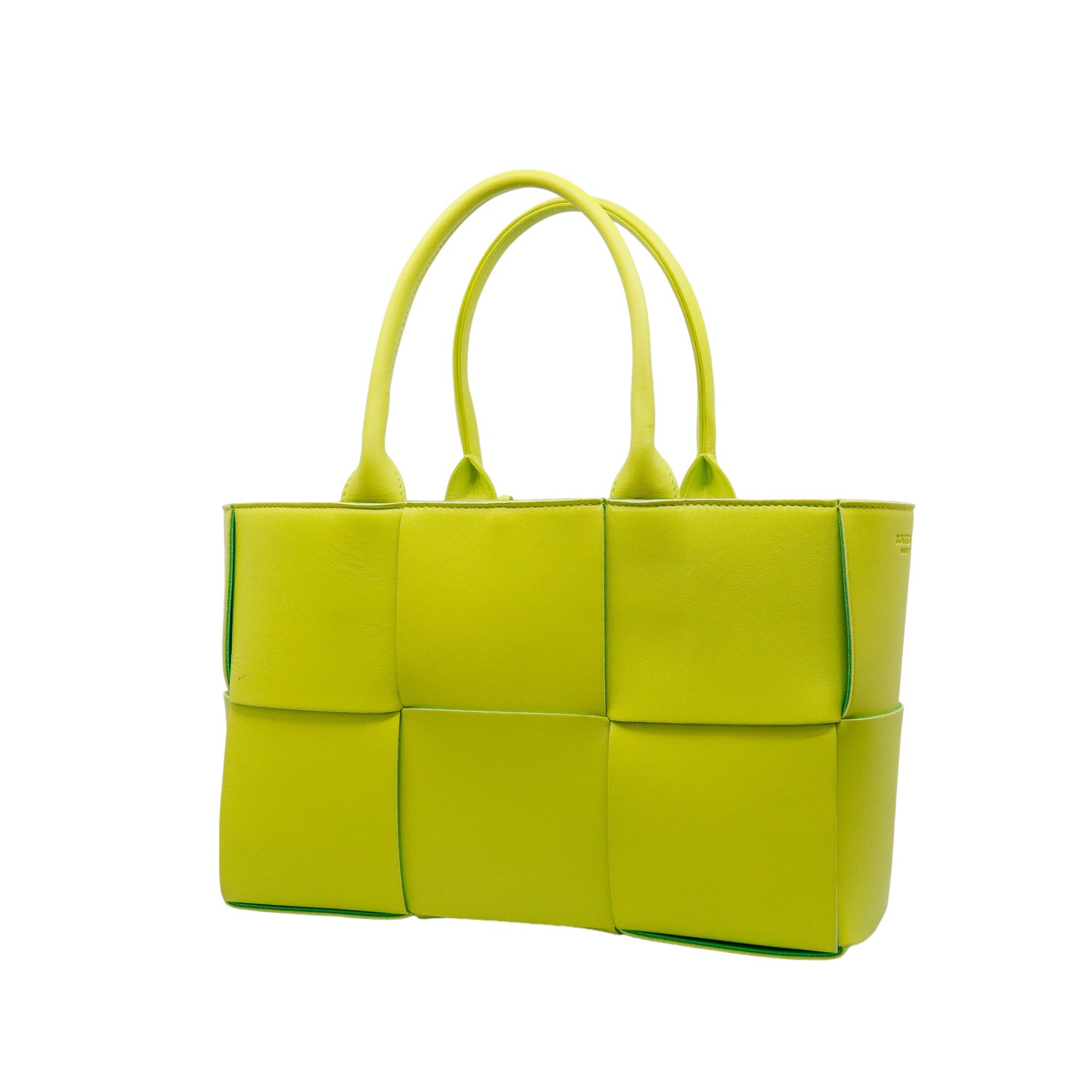 Bolso tipo tote Bottega Veneta Intrecciato de la línea Arco, confeccionado en piel color verde limón, bolso interno extraíble y forro en color verde, con 2 asas rígidas, pequeña mancha al interior.