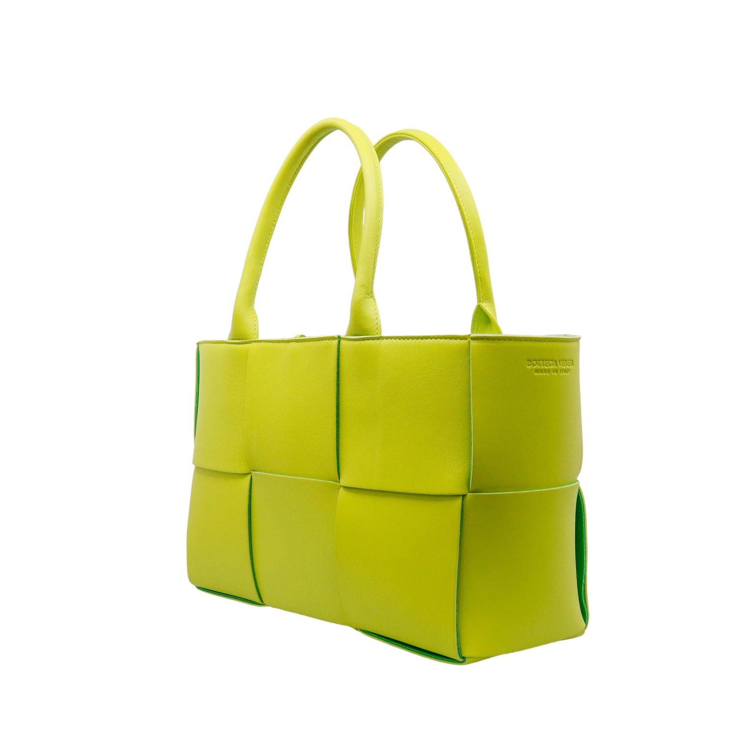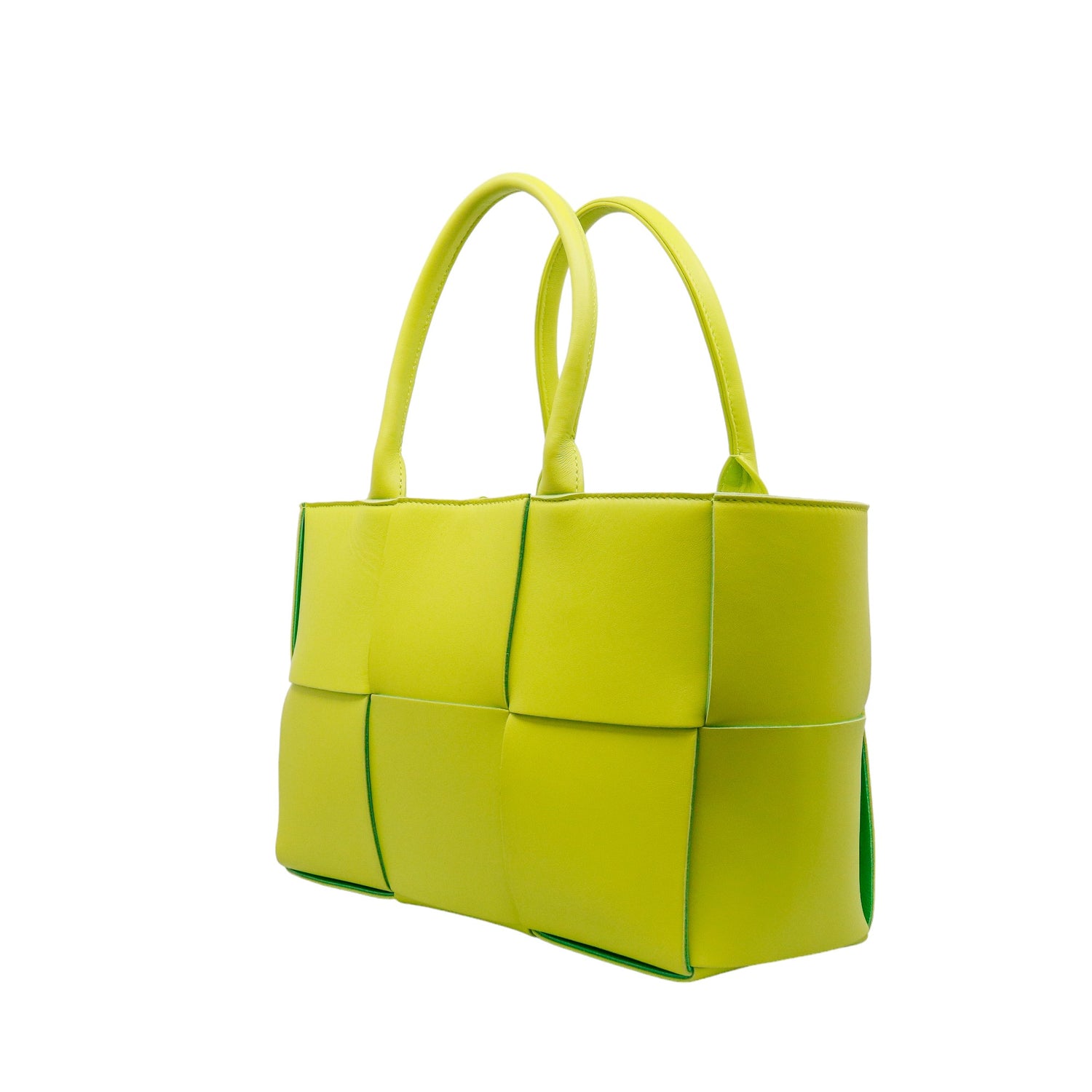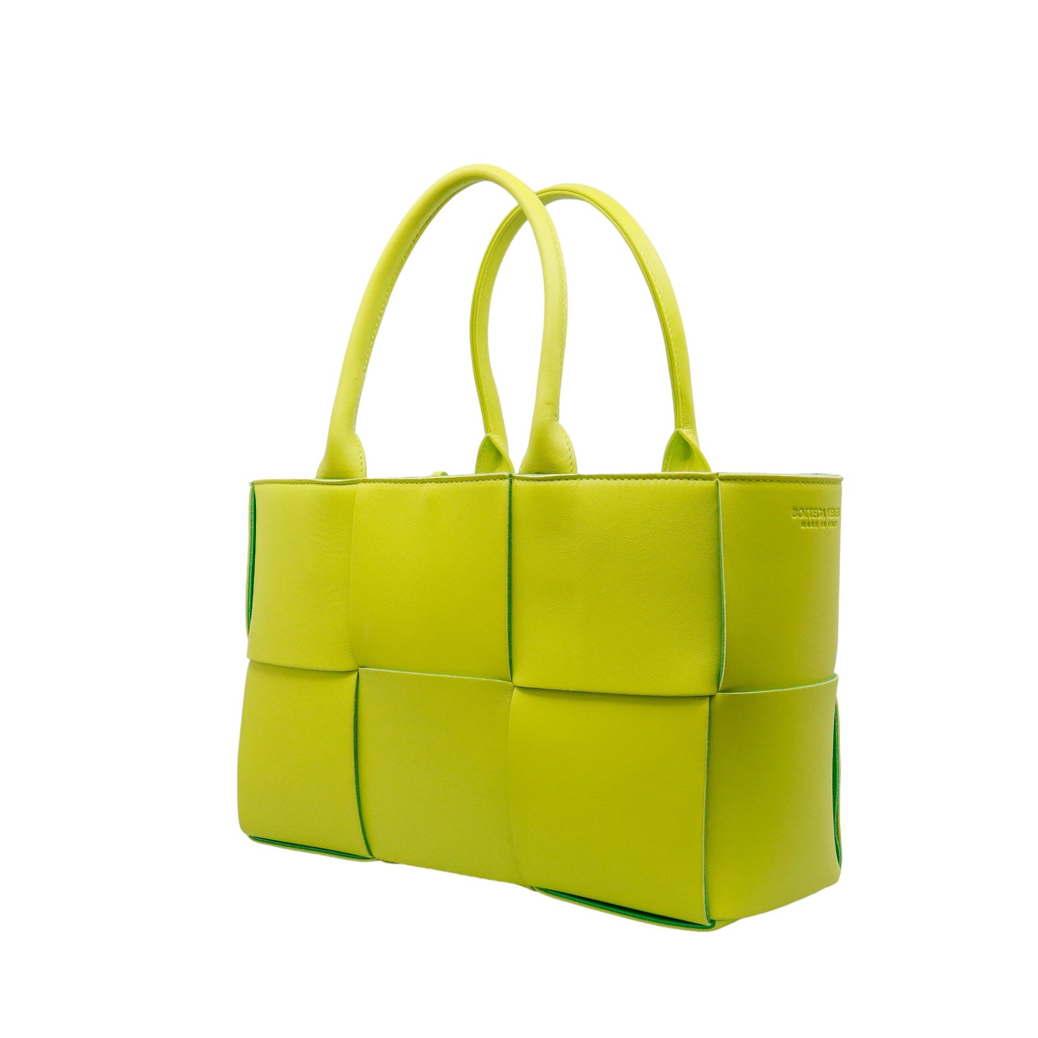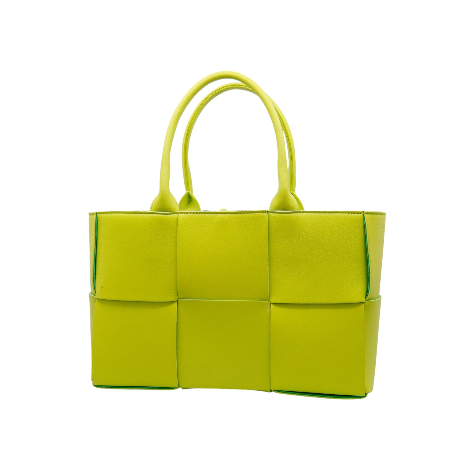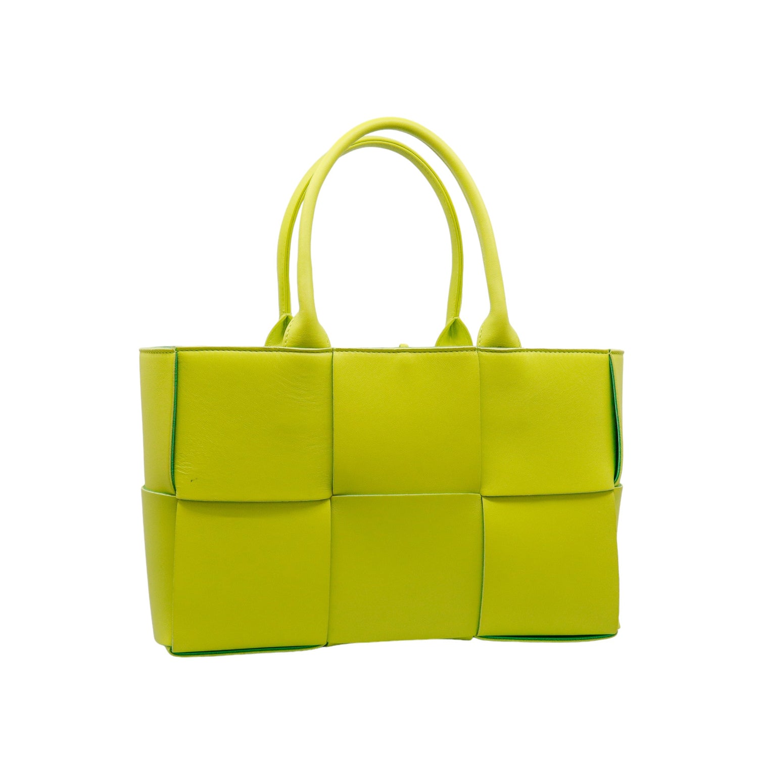 Bolso tipo tote Bottega Veneta Intrecciato de la línea Arco, confeccionado en piel color verde limón, bolso interno extraíble y forro en color verde, con 2 asas rígidas, pequeña mancha al interior.