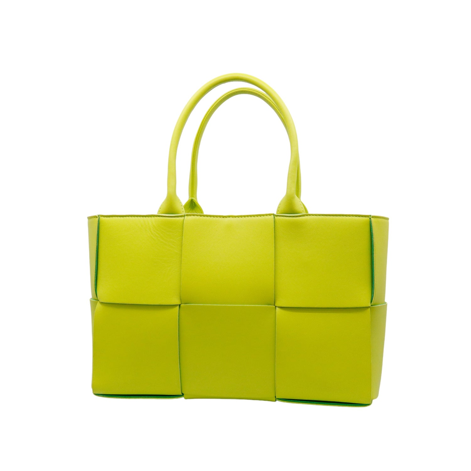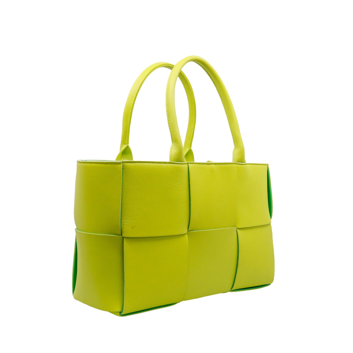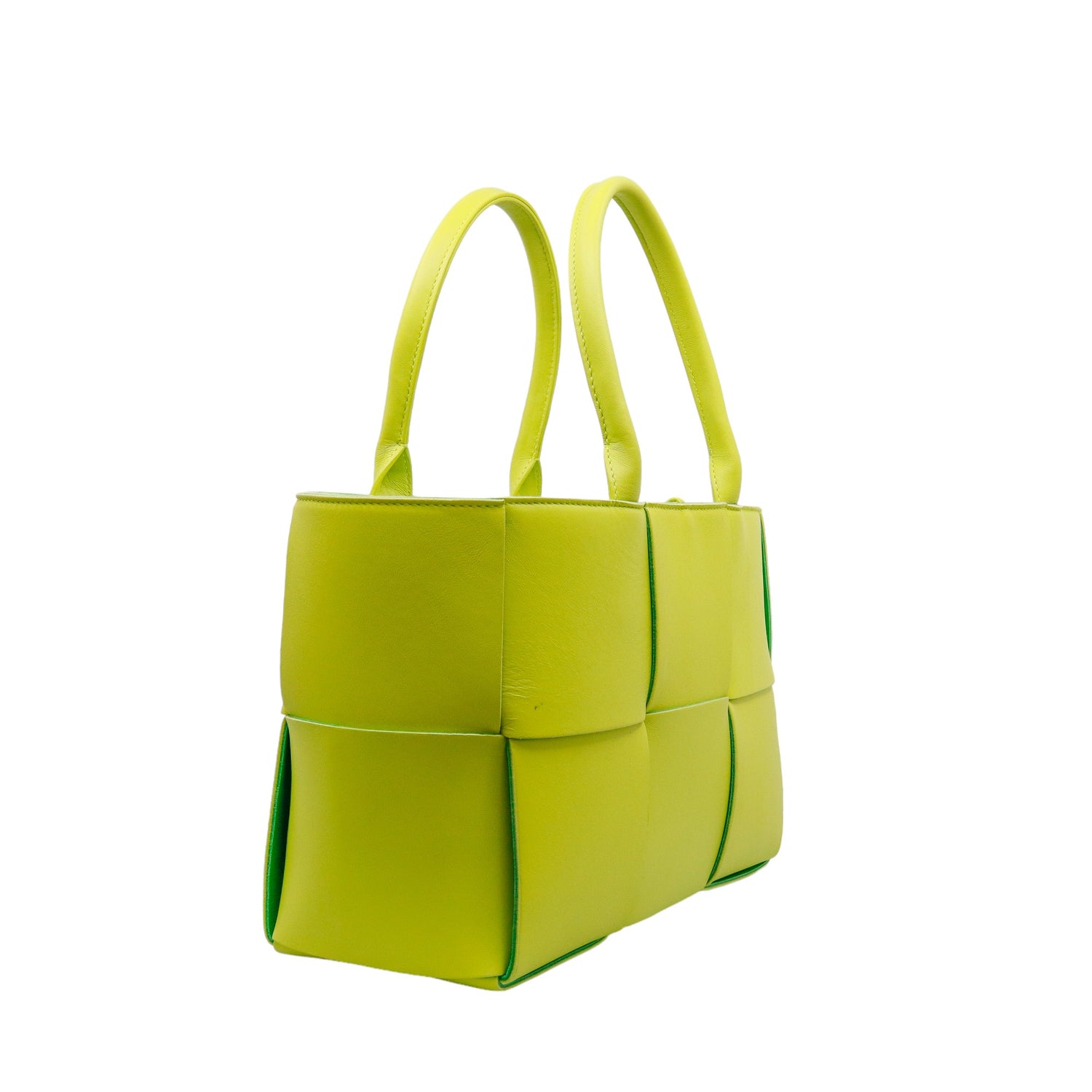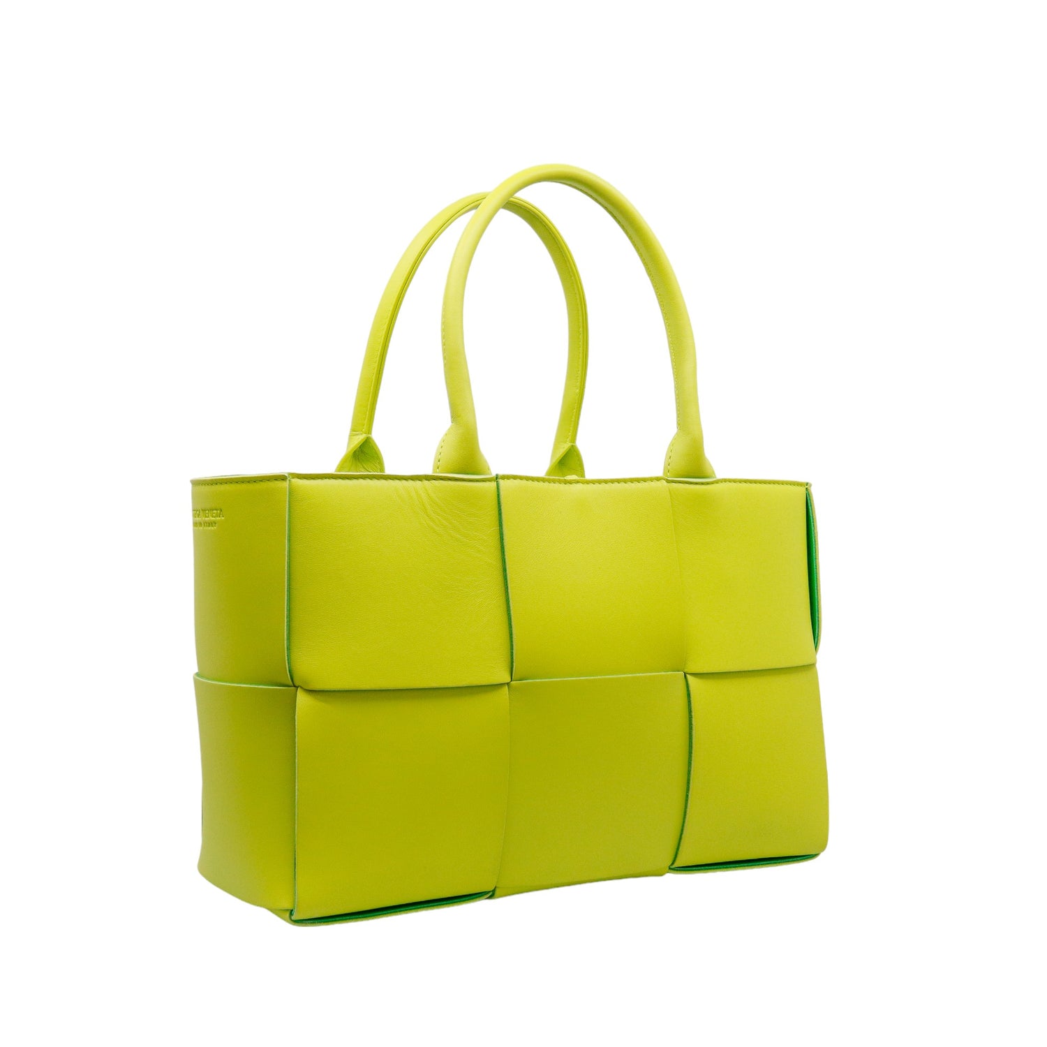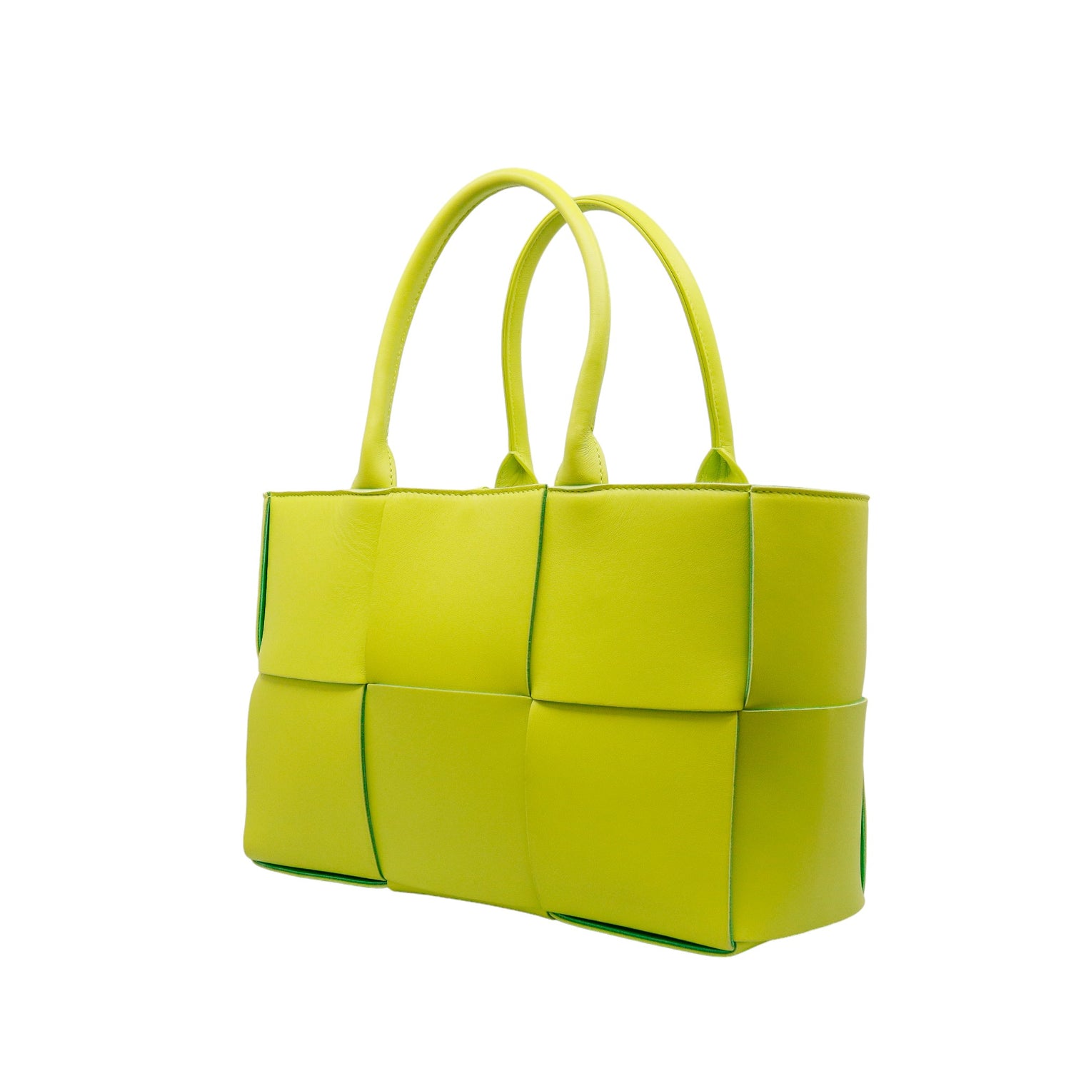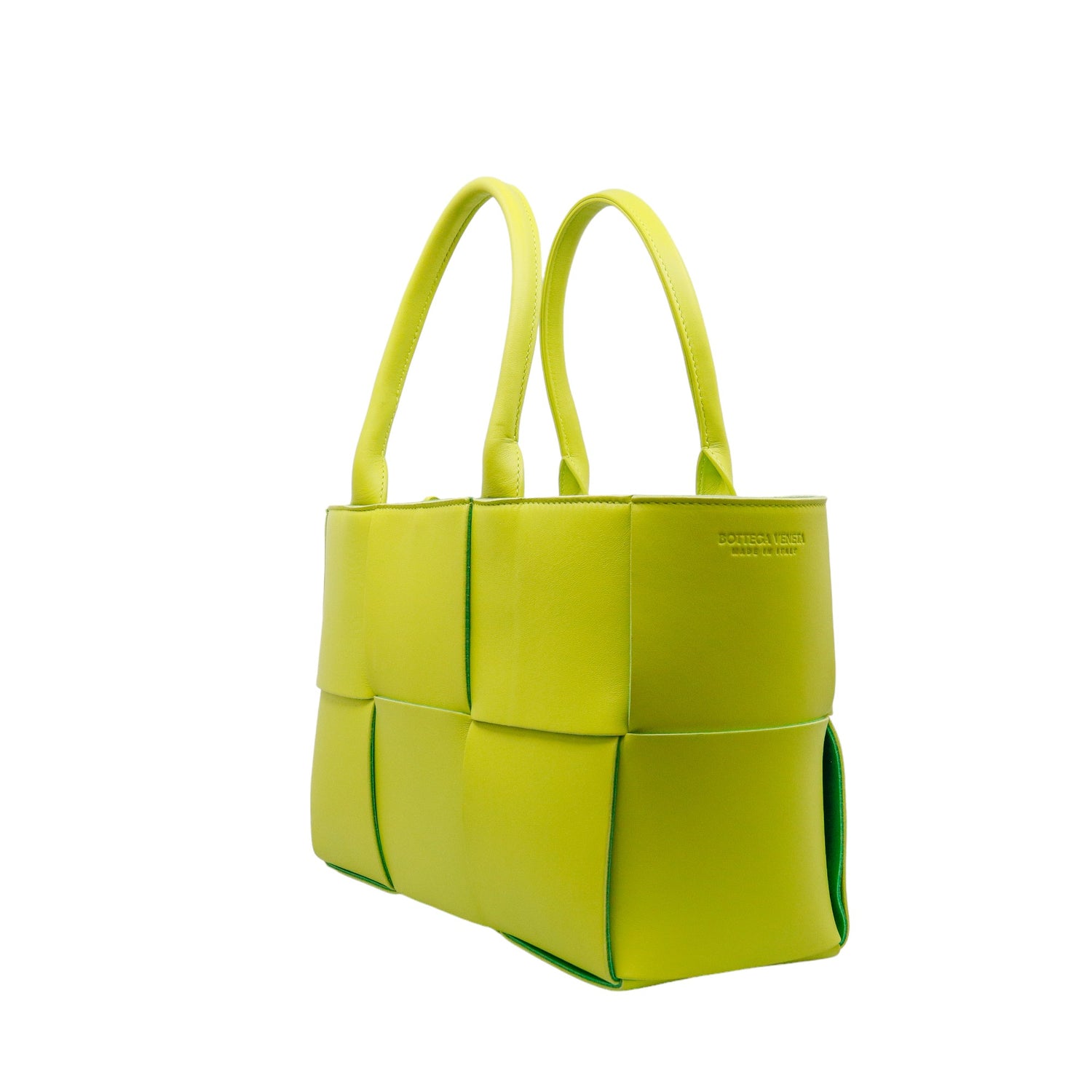 Bolso tipo tote Bottega Veneta Intrecciato de la línea Arco, confeccionado en piel color verde limón, bolso interno extraíble y forro en color verde, con 2 asas rígidas, pequeña mancha al interior.