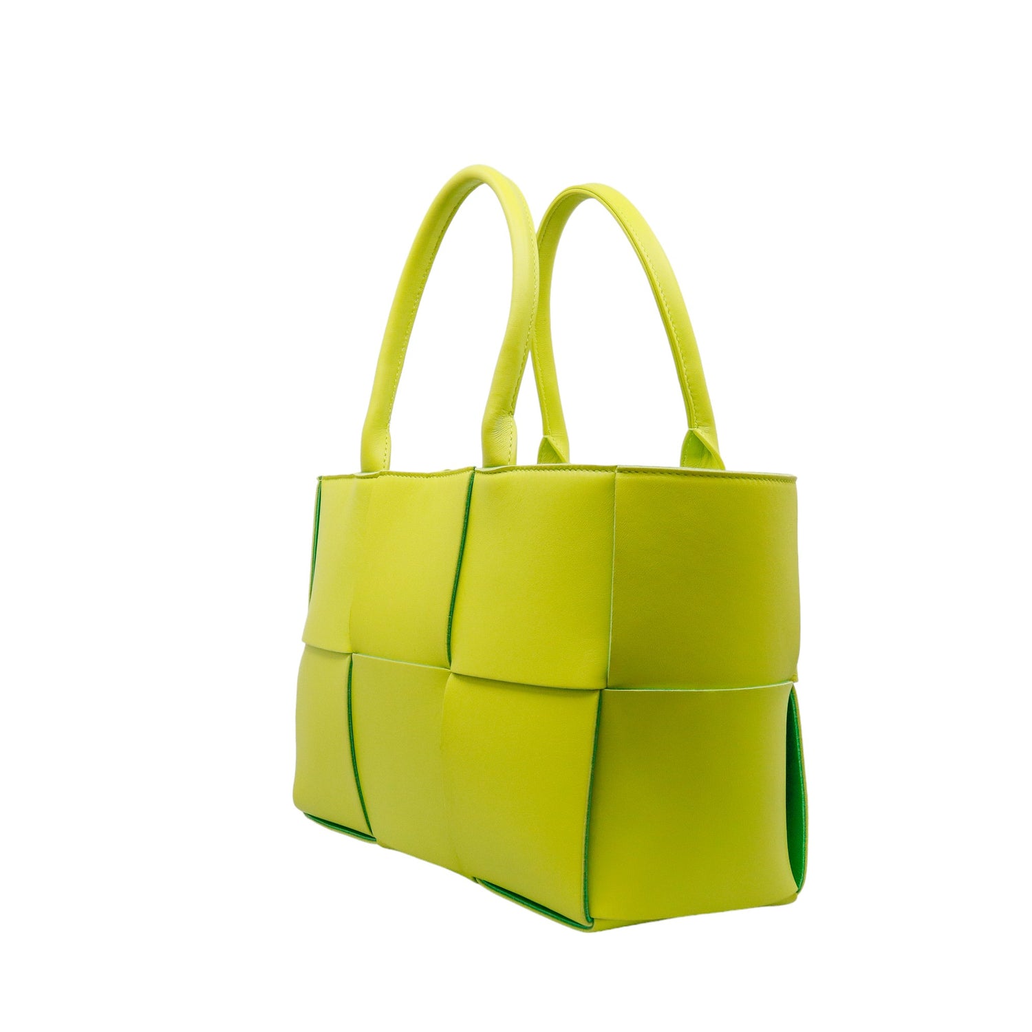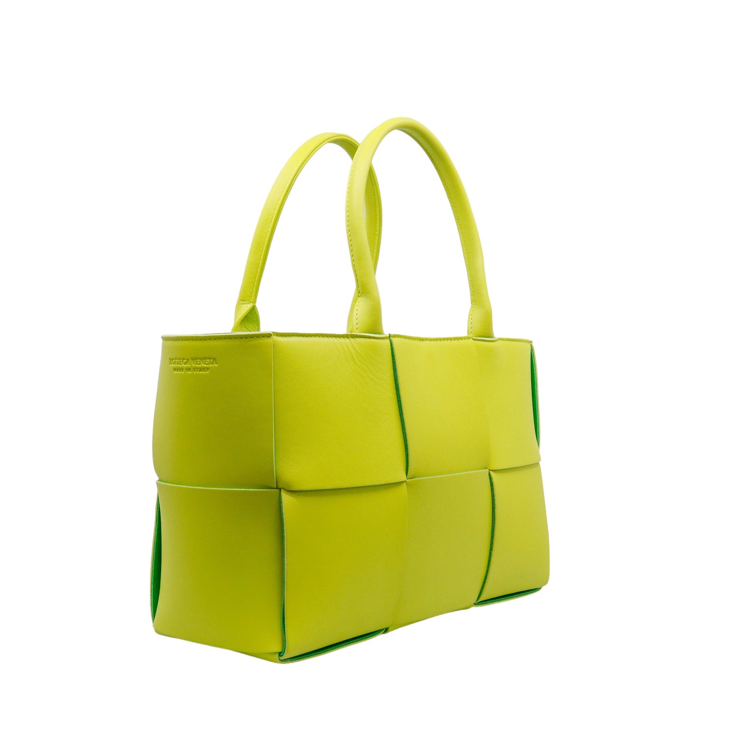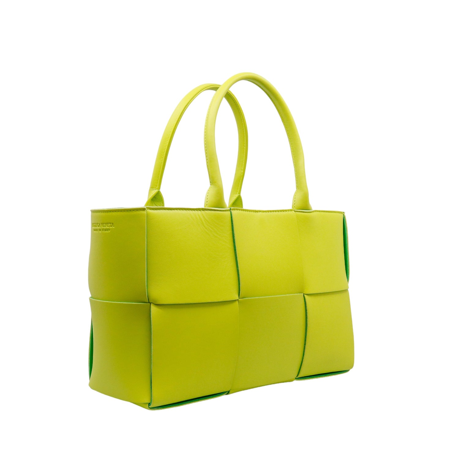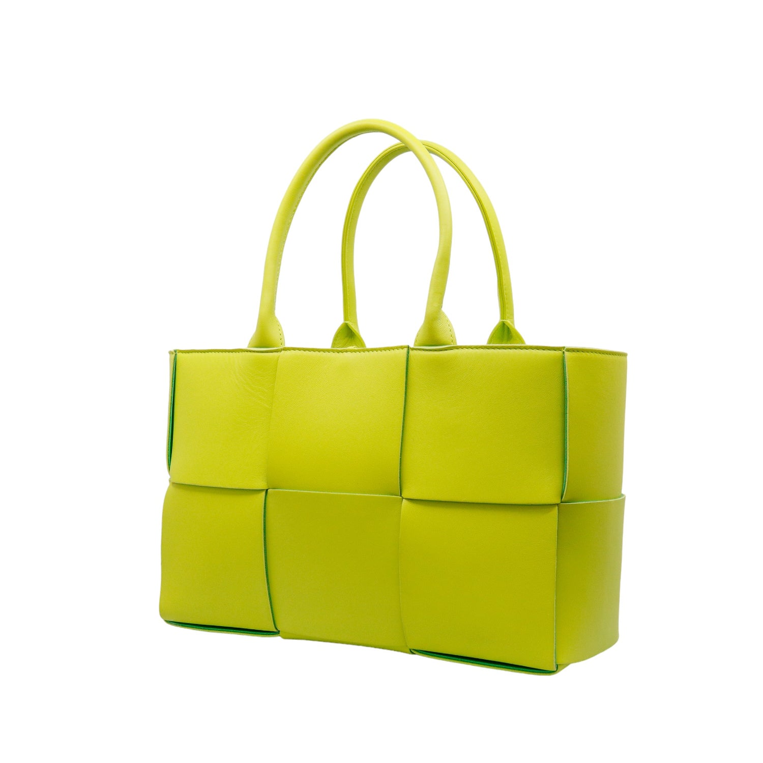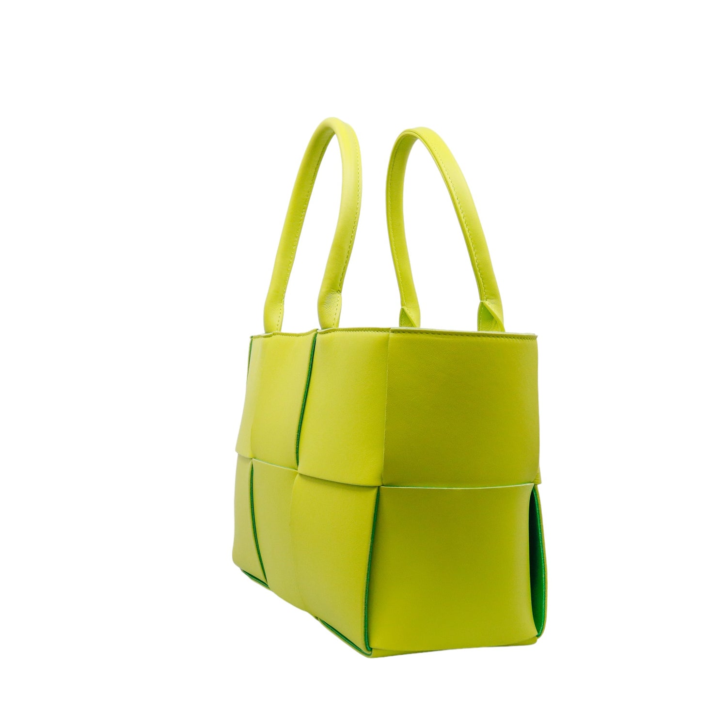 Bolso tipo tote Bottega Veneta Intrecciato de la línea Arco, confeccionado en piel color verde limón, bolso interno extraíble y forro en color verde, con 2 asas rígidas, pequeña mancha al interior.