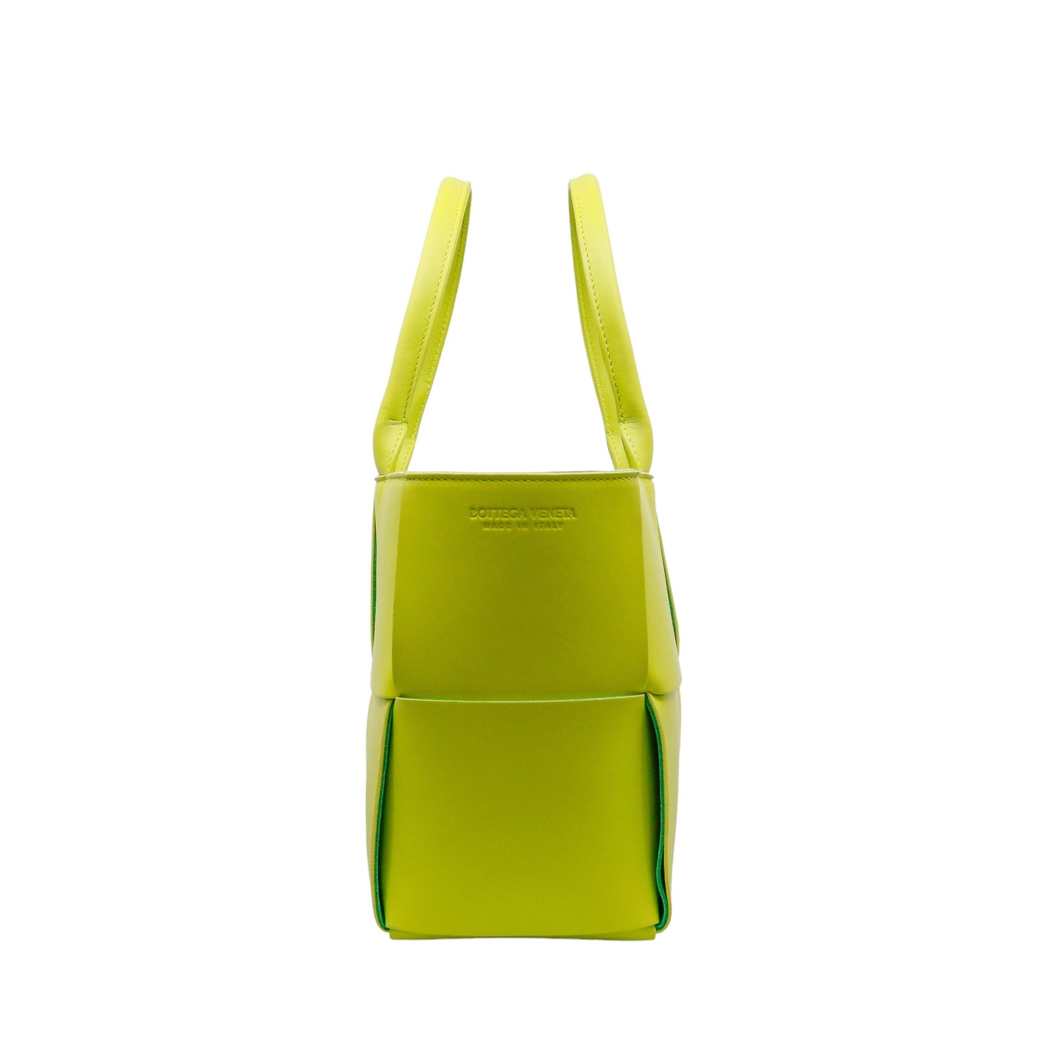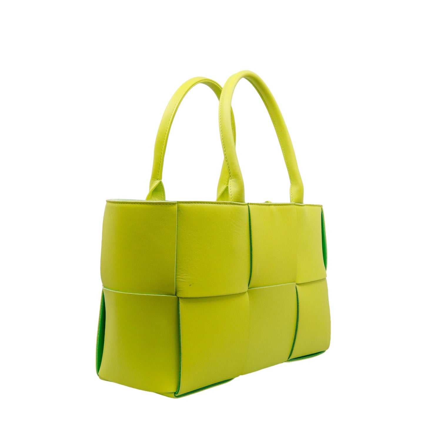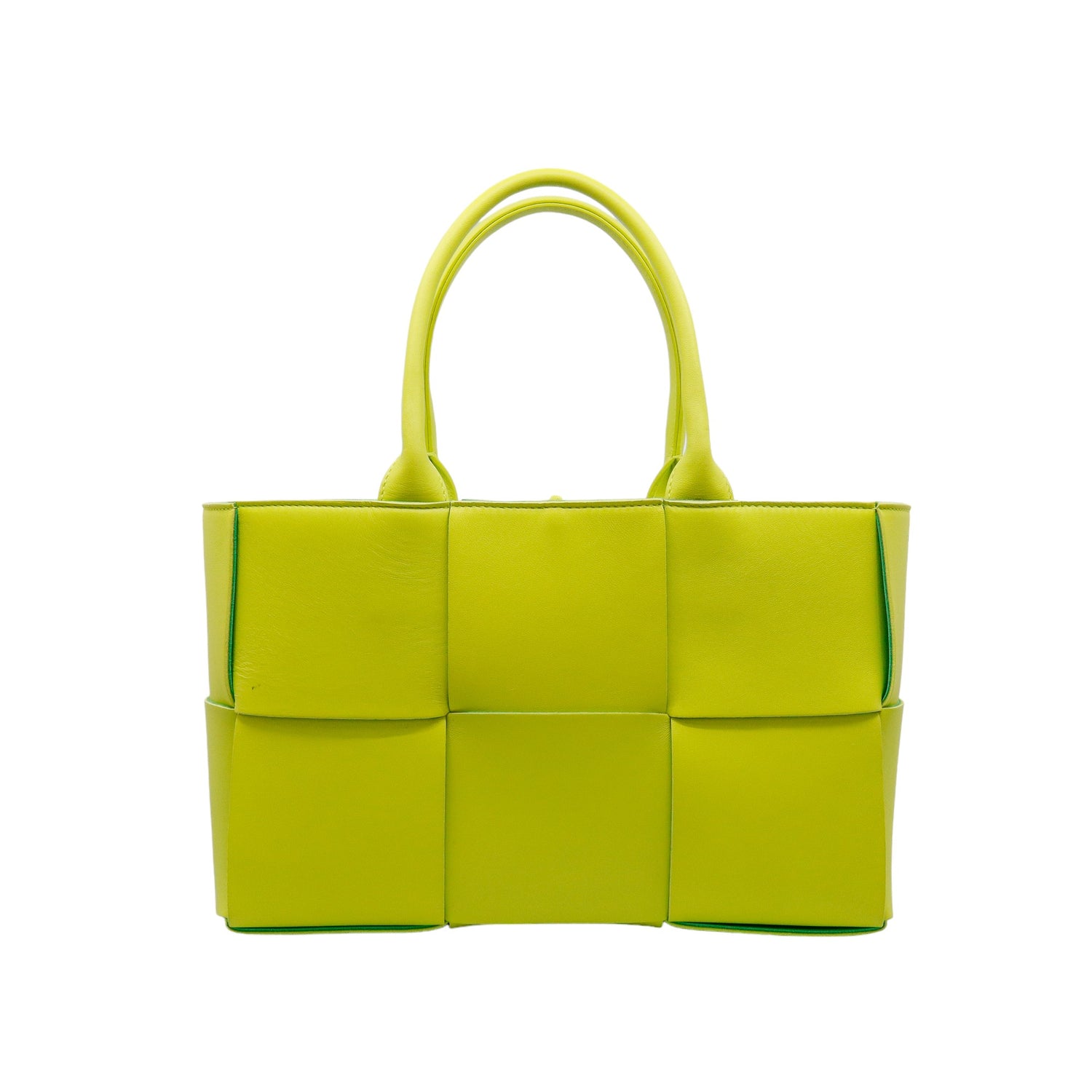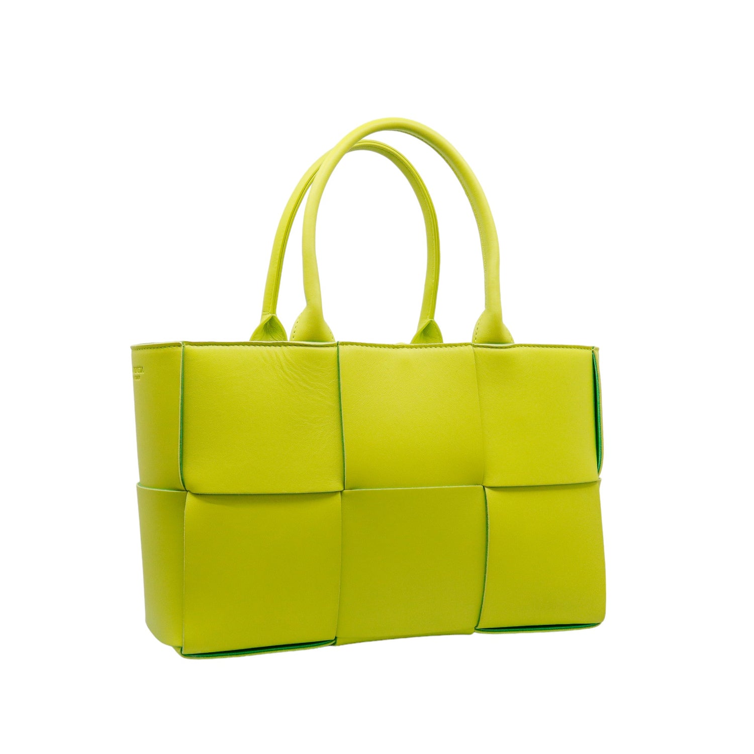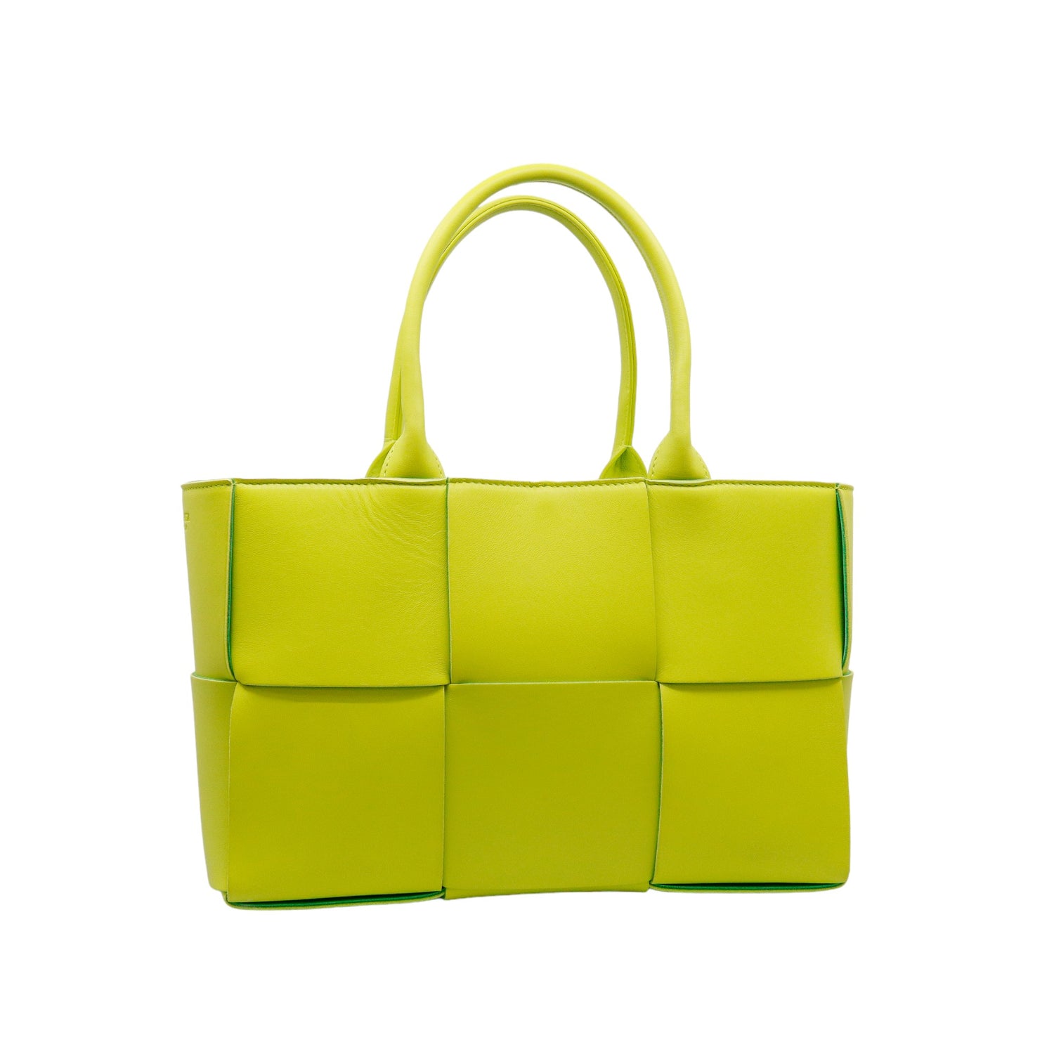 Bolso tipo tote Bottega Veneta Intrecciato de la línea Arco, confeccionado en piel color verde limón, bolso interno extraíble y forro en color verde, con 2 asas rígidas, pequeña mancha al interior.