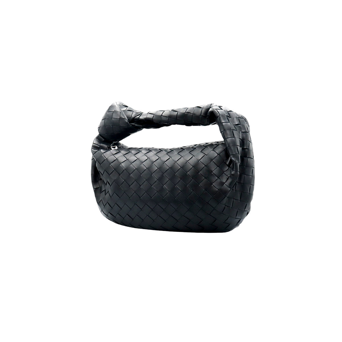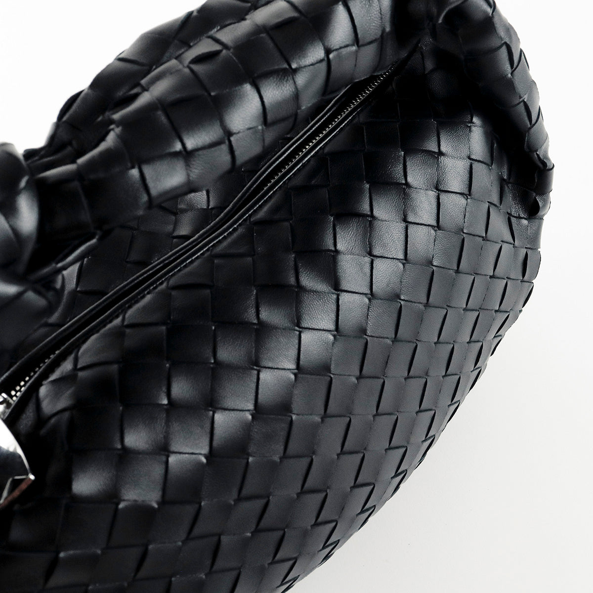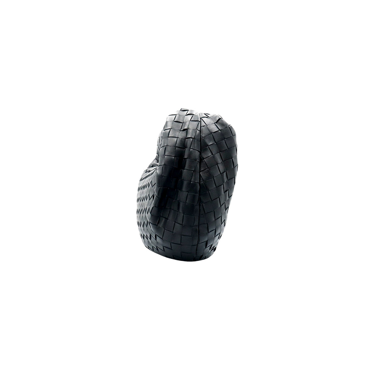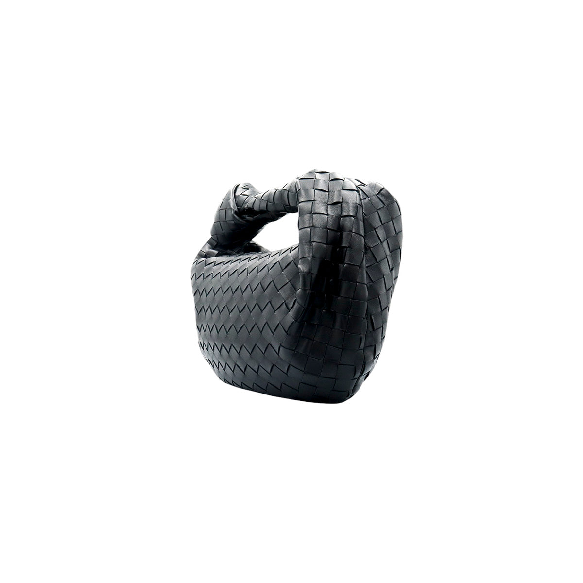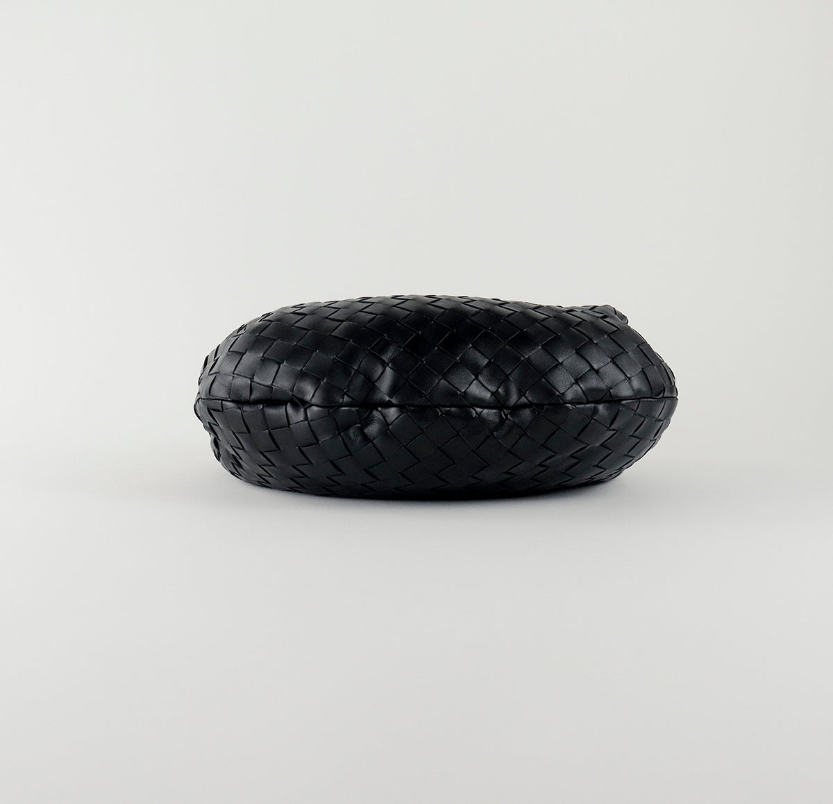 Bolso Bottega Veneta modelo Jodie confeccionado en suave cuero Intrecciato color negro, una sola asa de mismo material y color, forro interno en piel lisa, para lucir en la mano o al hombro, cierre de cremallera en color plata.