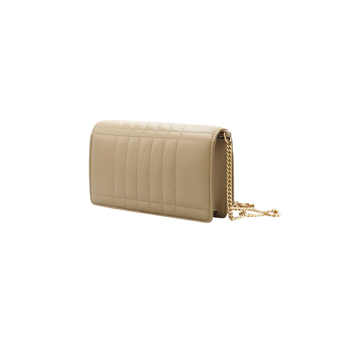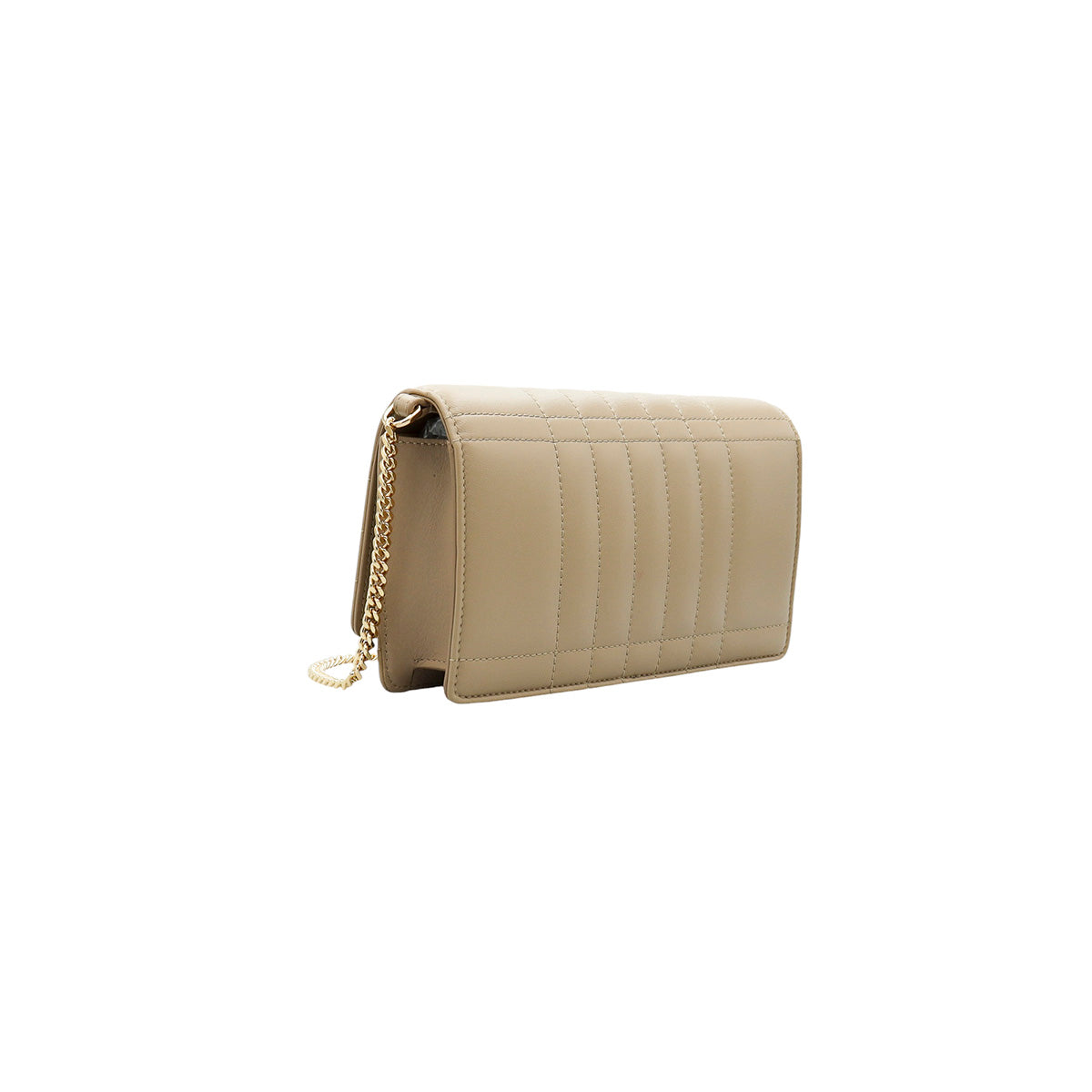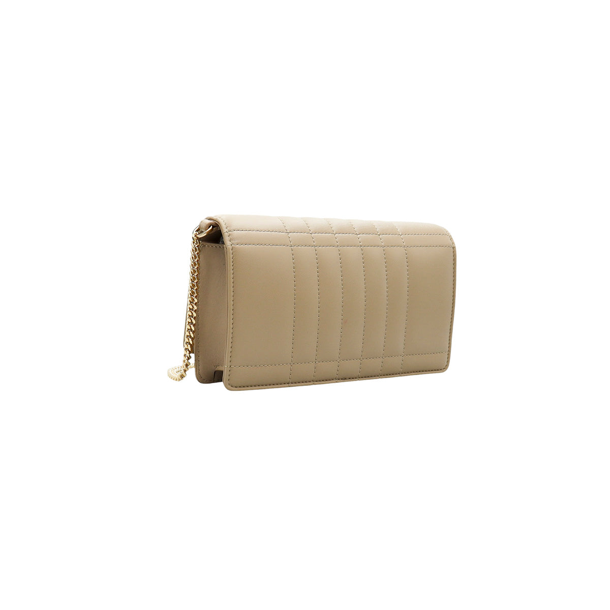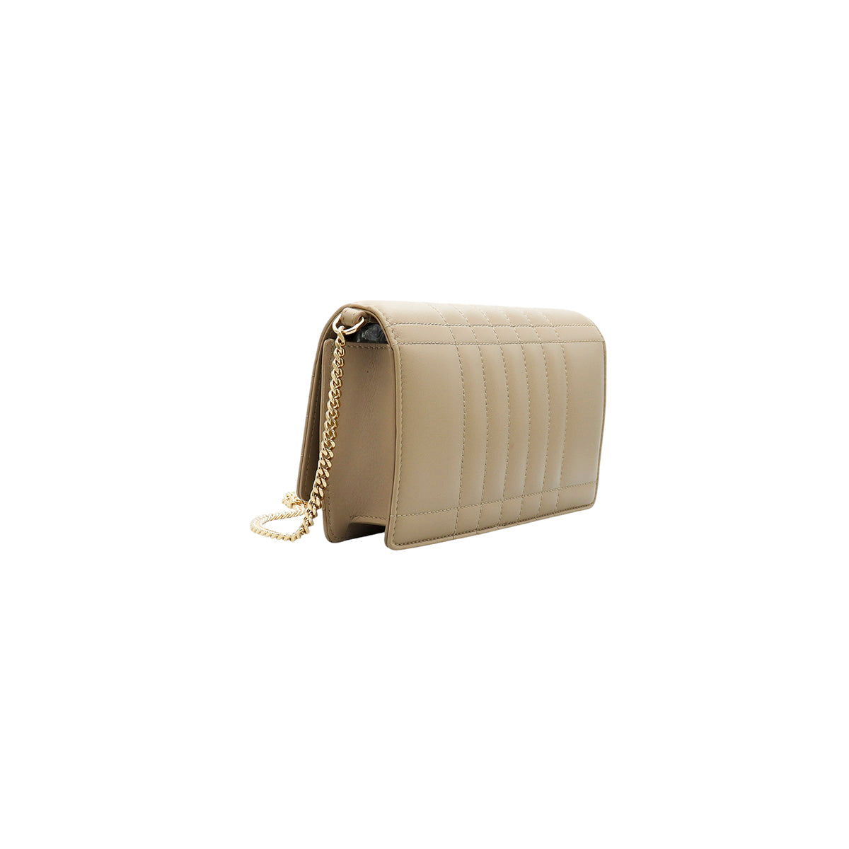 Bolso Burberry de la línea Lola, confeccionado en piel capitonada color nude, detalles por poco uso, solapa con el logo de la marca al frente, forro interno en textil, con cadena y herraje en color dorado.