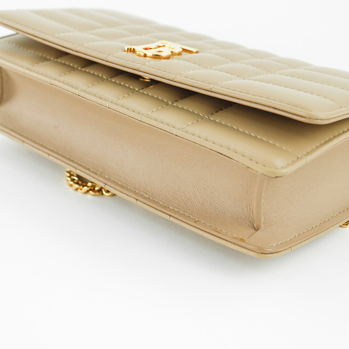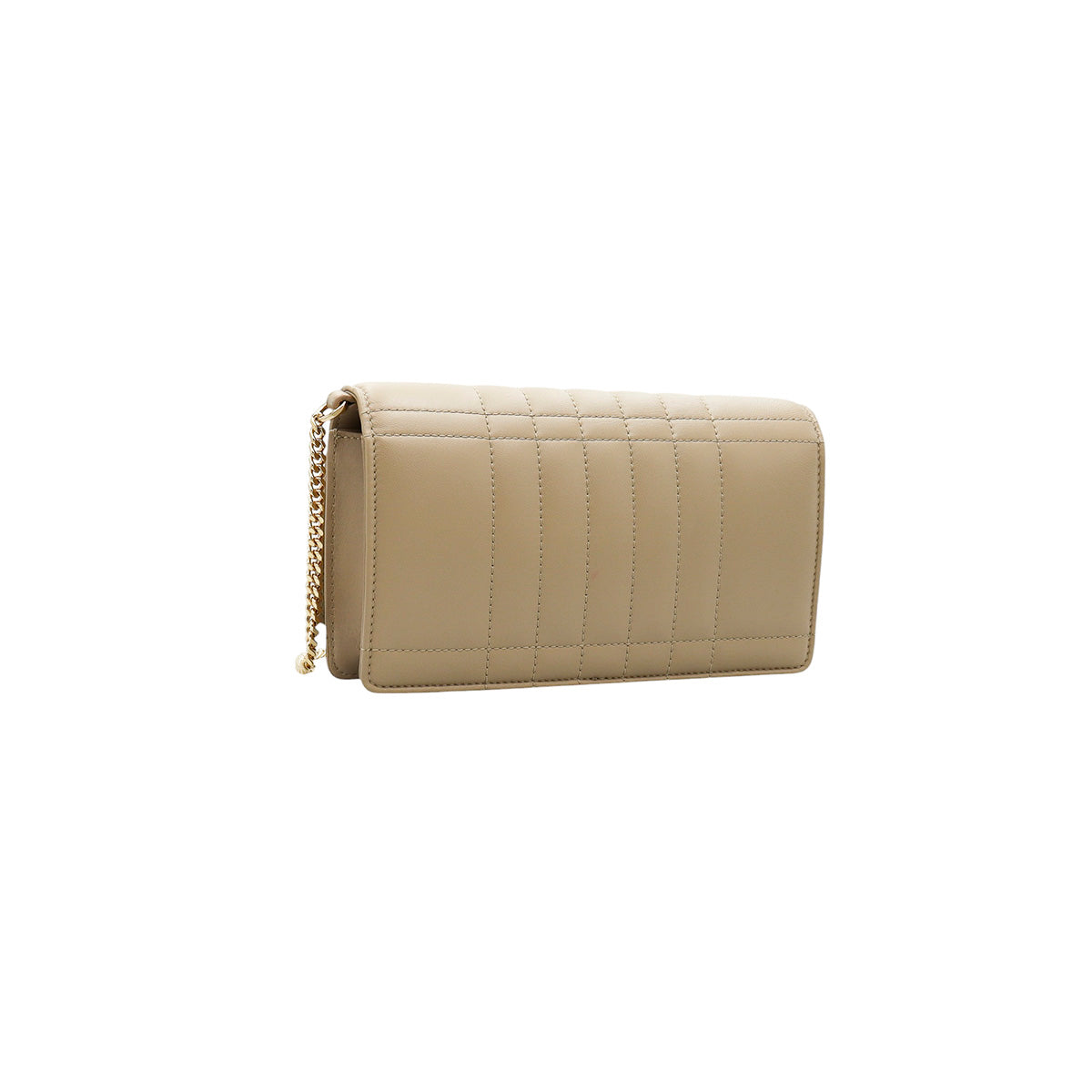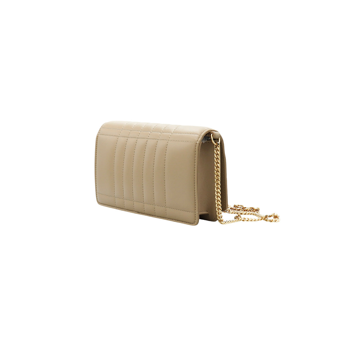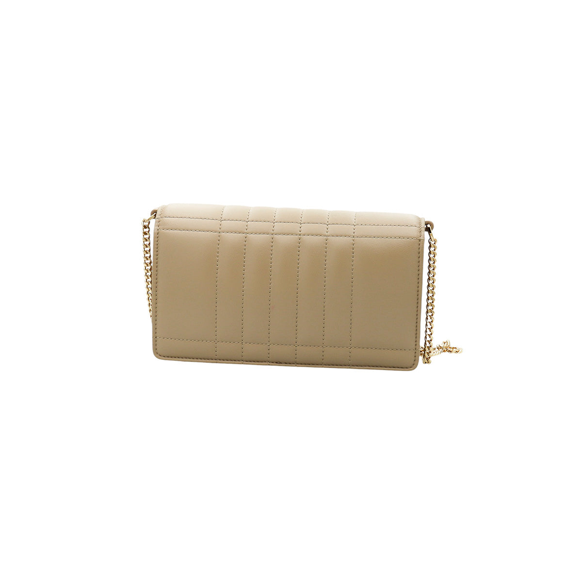 Bolso Burberry de la línea Lola, confeccionado en piel capitonada color nude, detalles por poco uso, solapa con el logo de la marca al frente, forro interno en textil, con cadena y herraje en color dorado.
