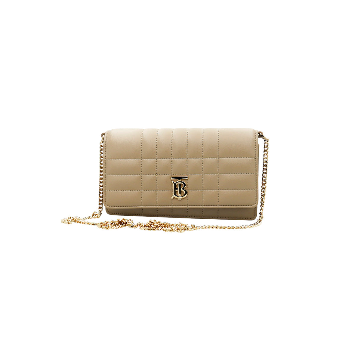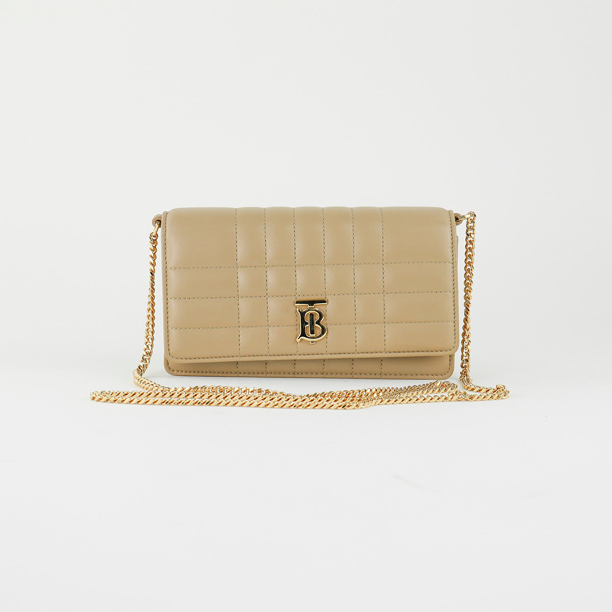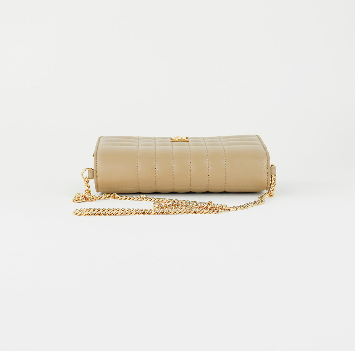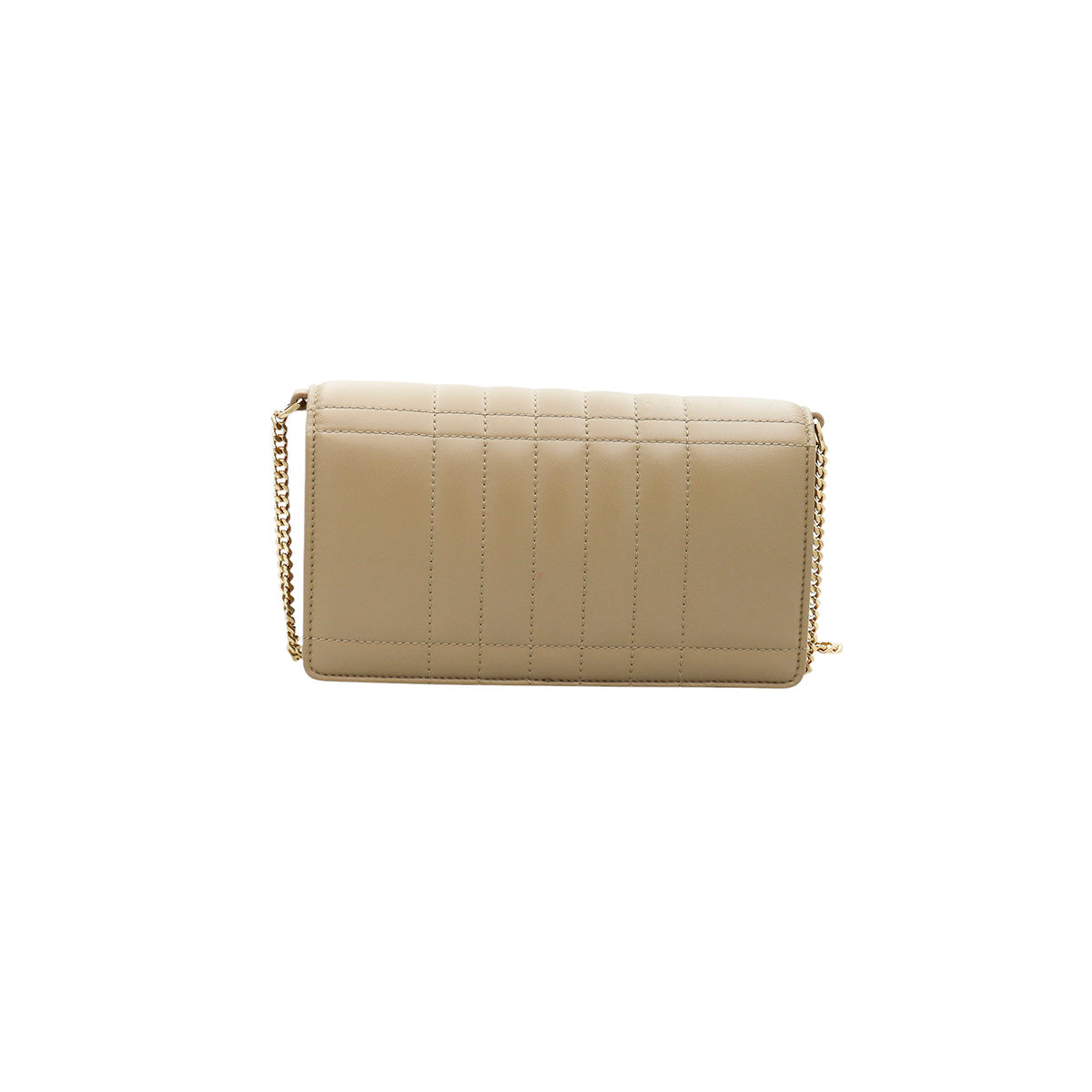 Bolso Burberry de la línea Lola, confeccionado en piel capitonada color nude, detalles por poco uso, solapa con el logo de la marca al frente, forro interno en textil, con cadena y herraje en color dorado.