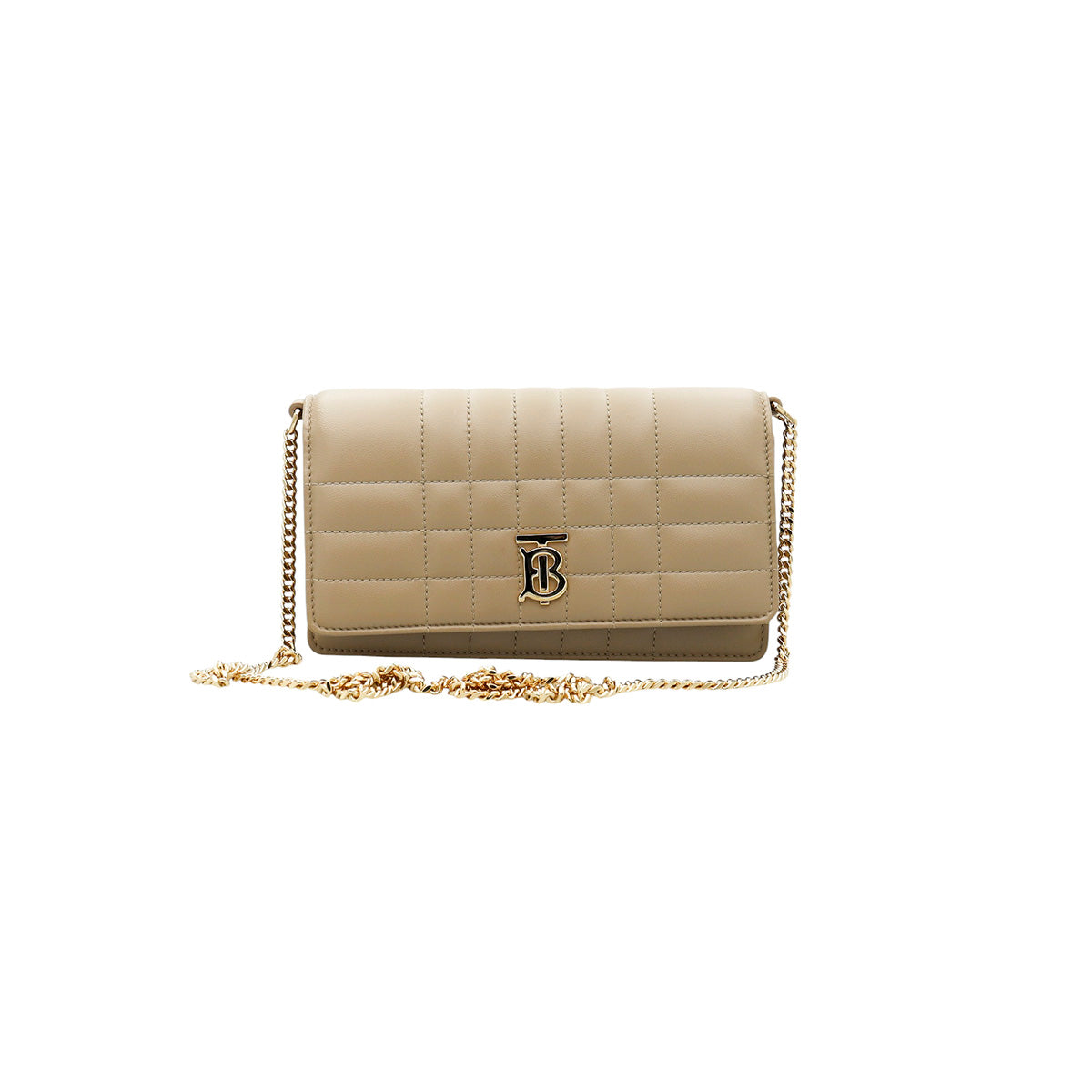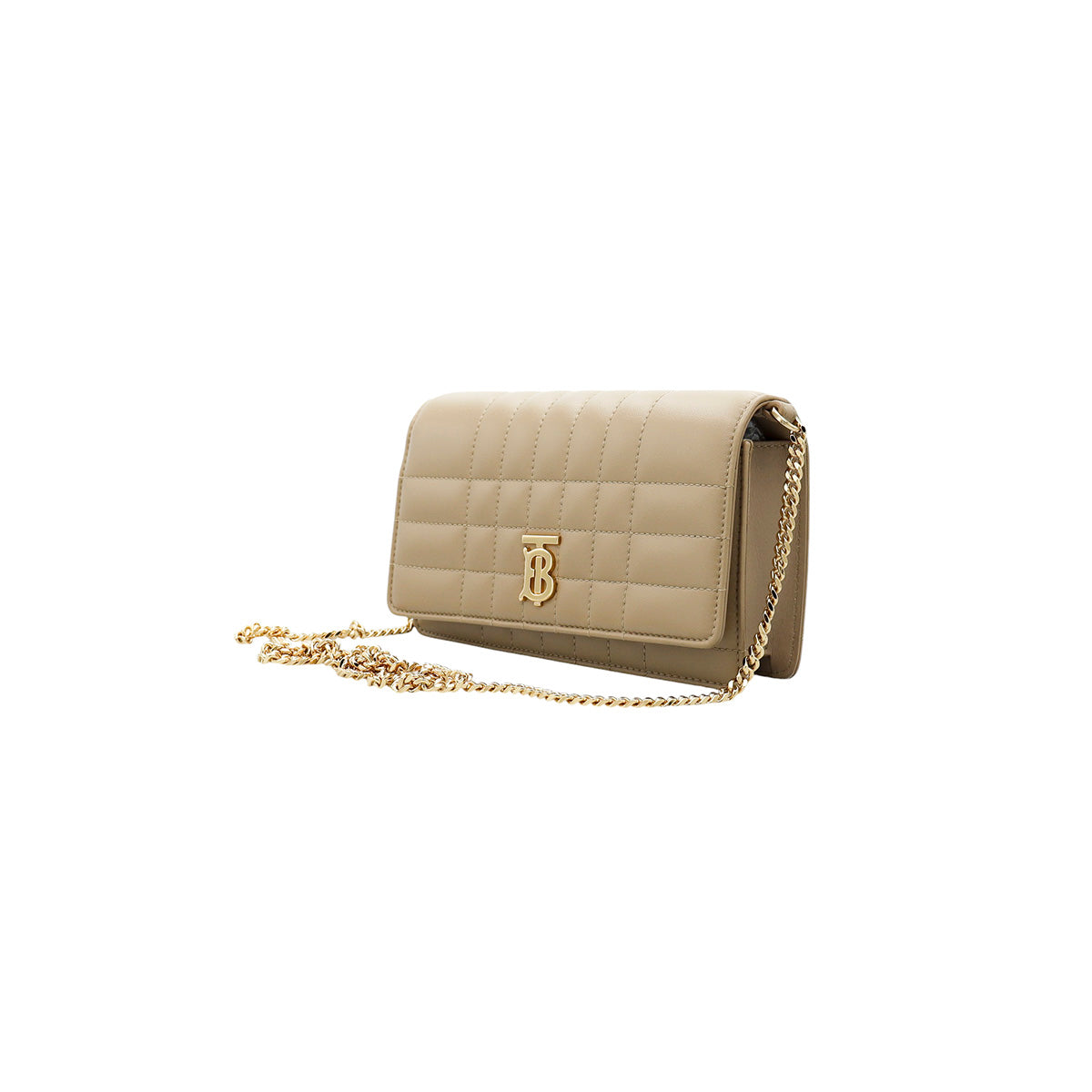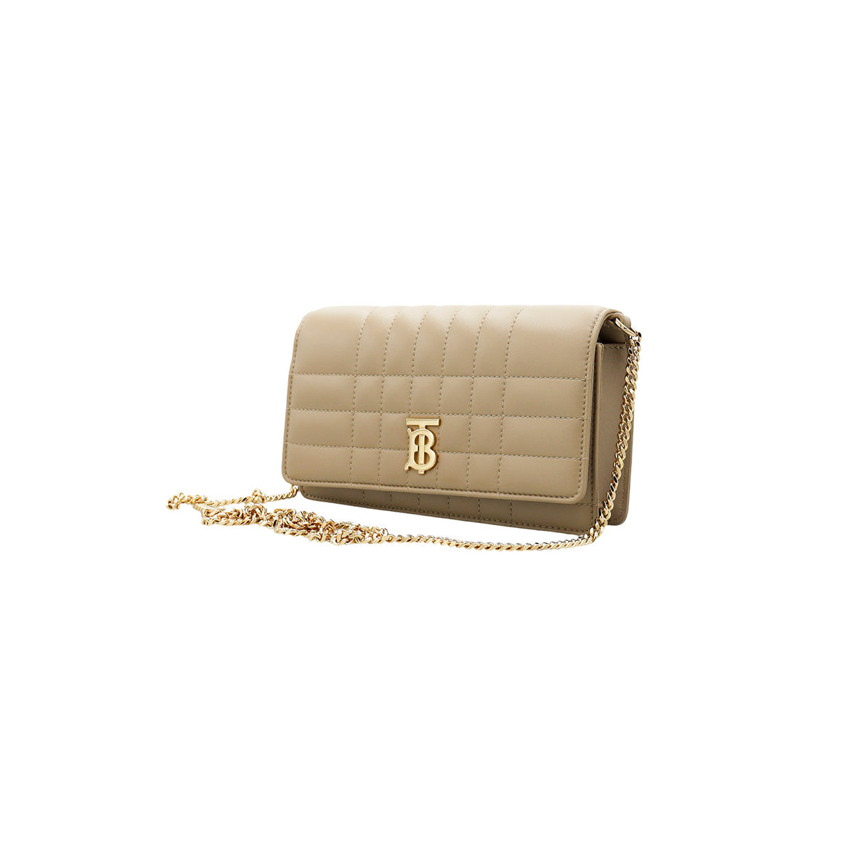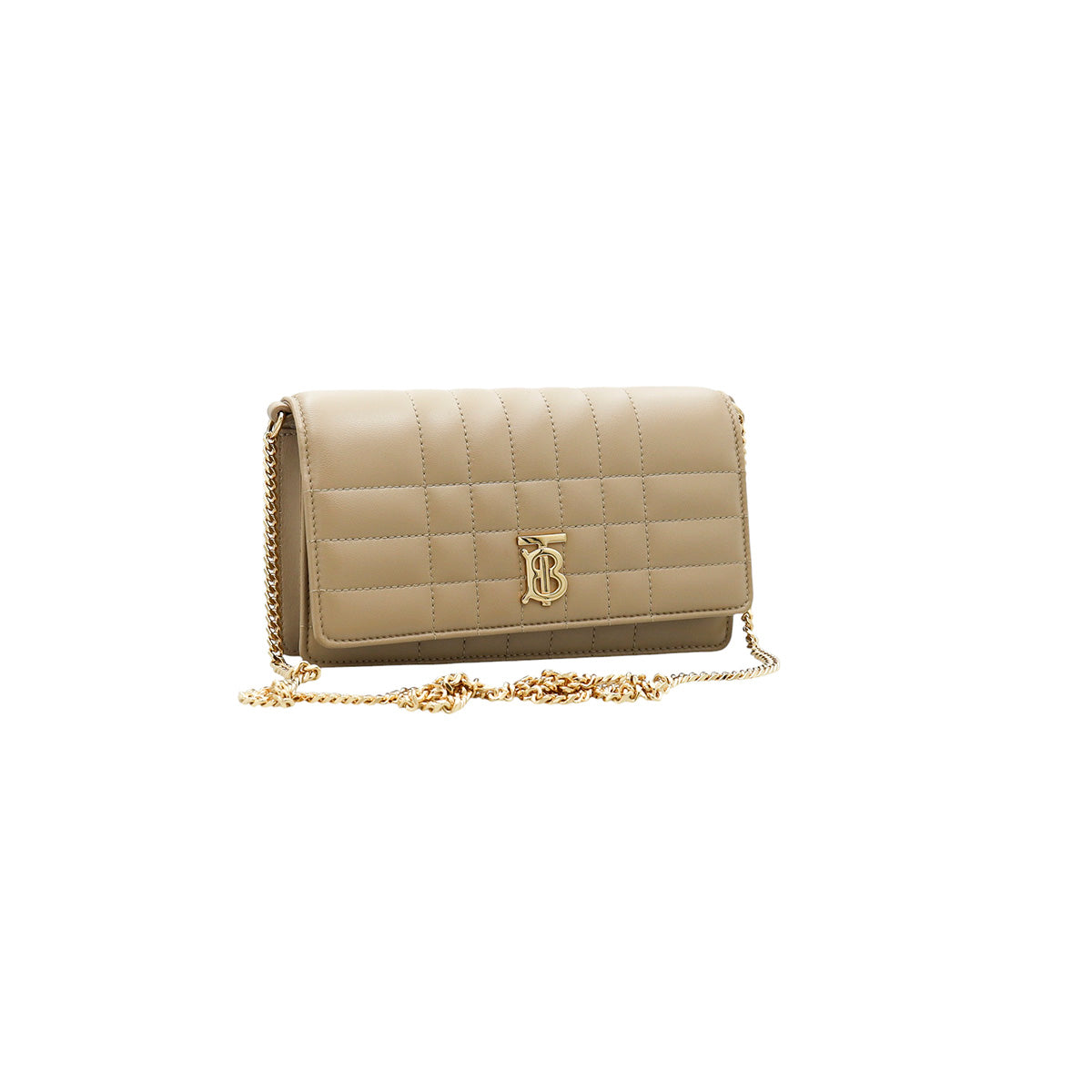 Bolso Burberry de la línea Lola, confeccionado en piel capitonada color nude, detalles por poco uso, solapa con el logo de la marca al frente, forro interno en textil, con cadena y herraje en color dorado.