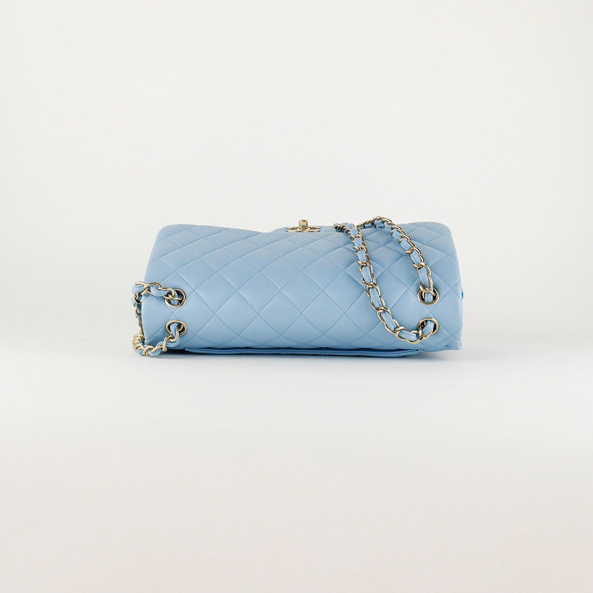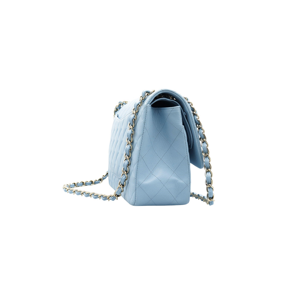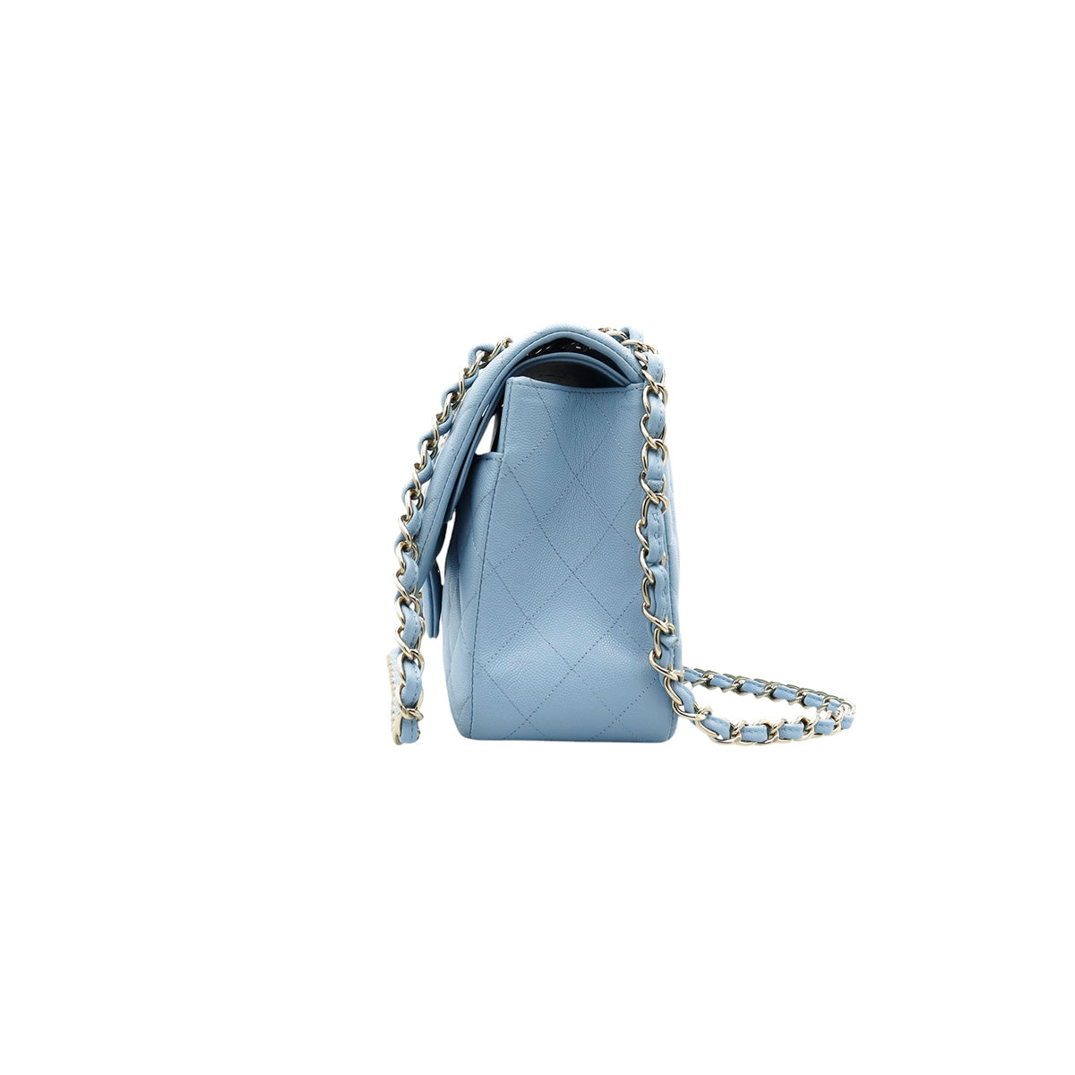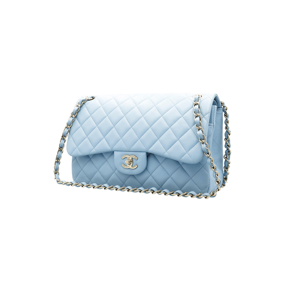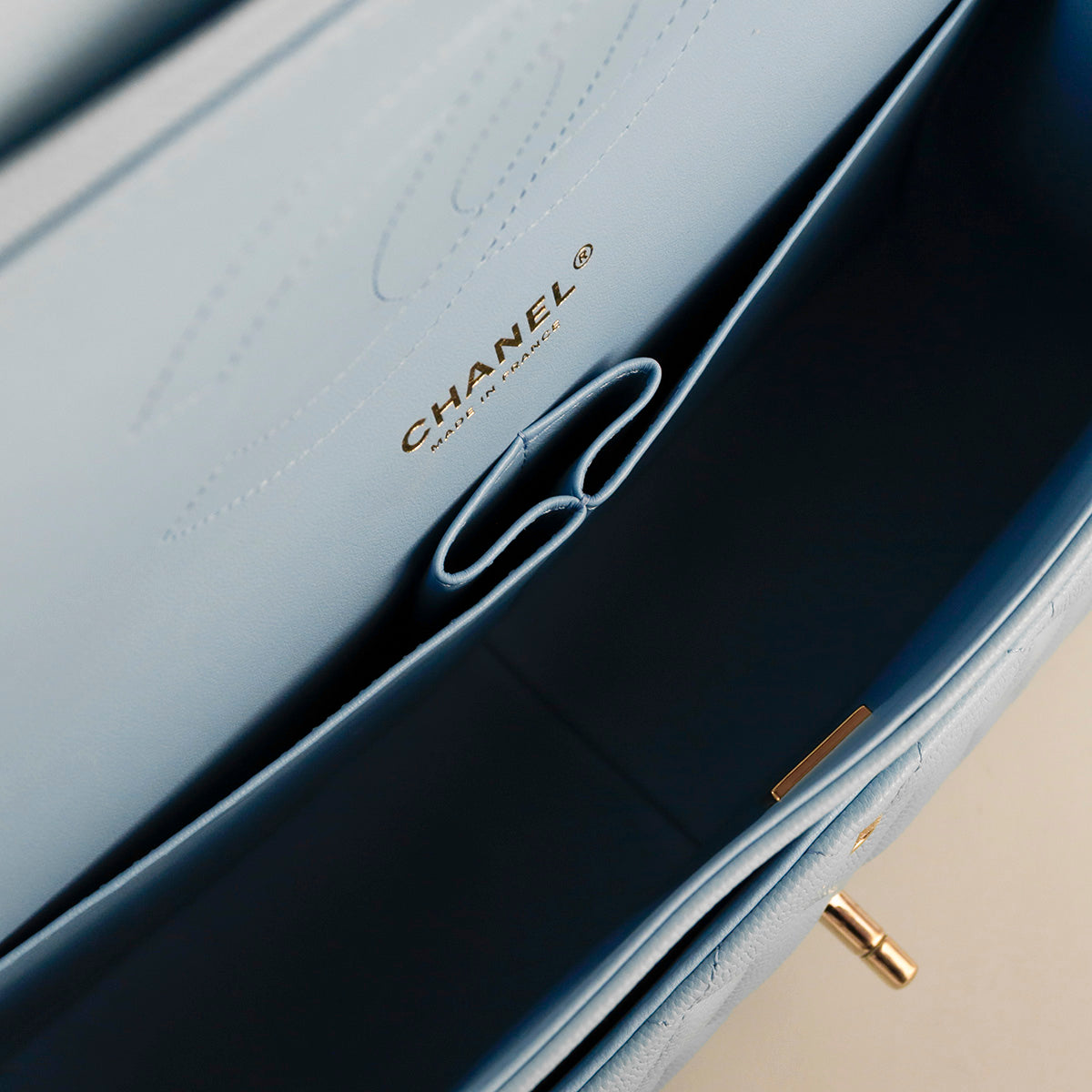 Bolso Chanel Classic, confeccionado en piel caviar color azul claro, solapa y cadena con apliques de piel y herrajes en color dorado.