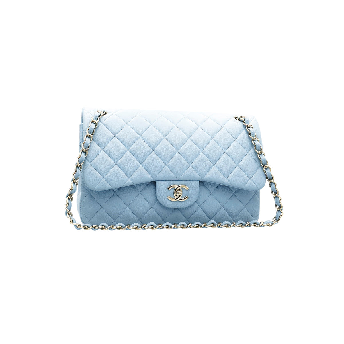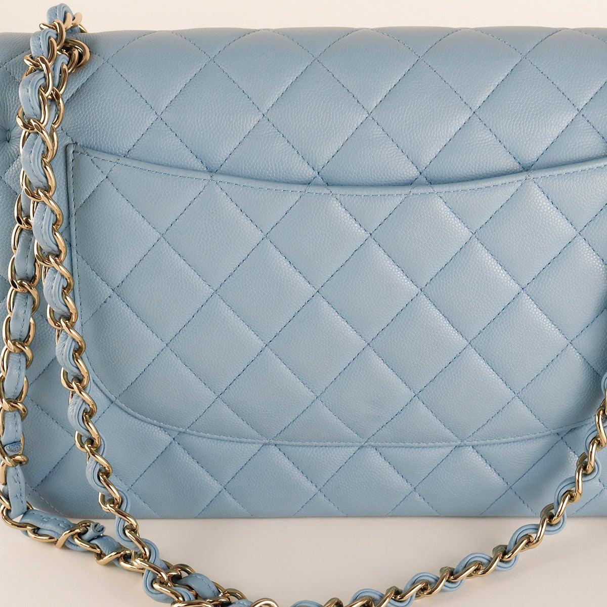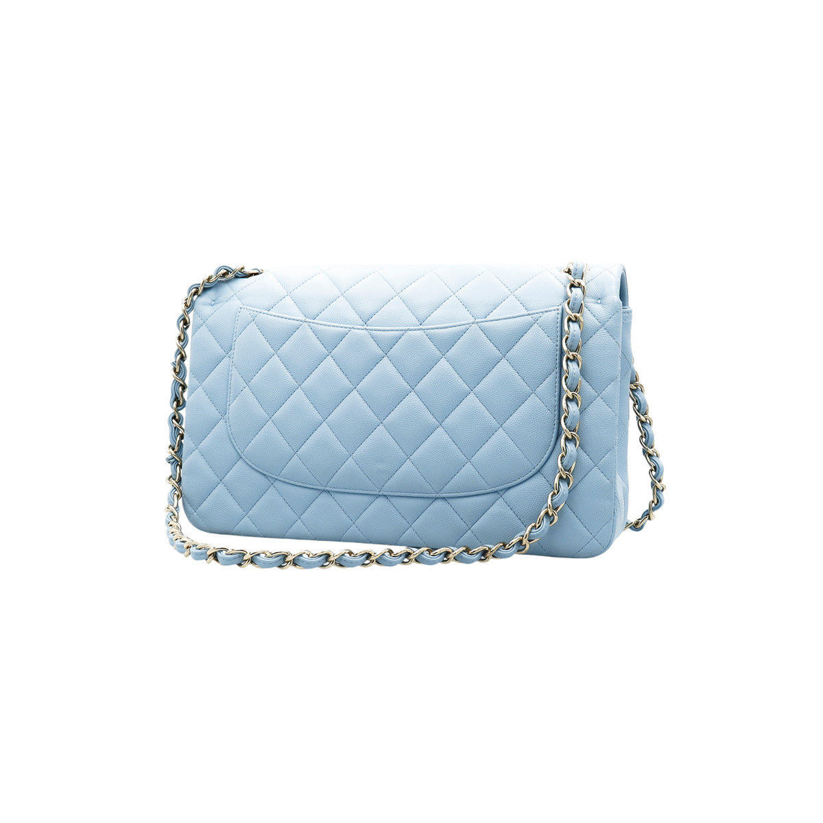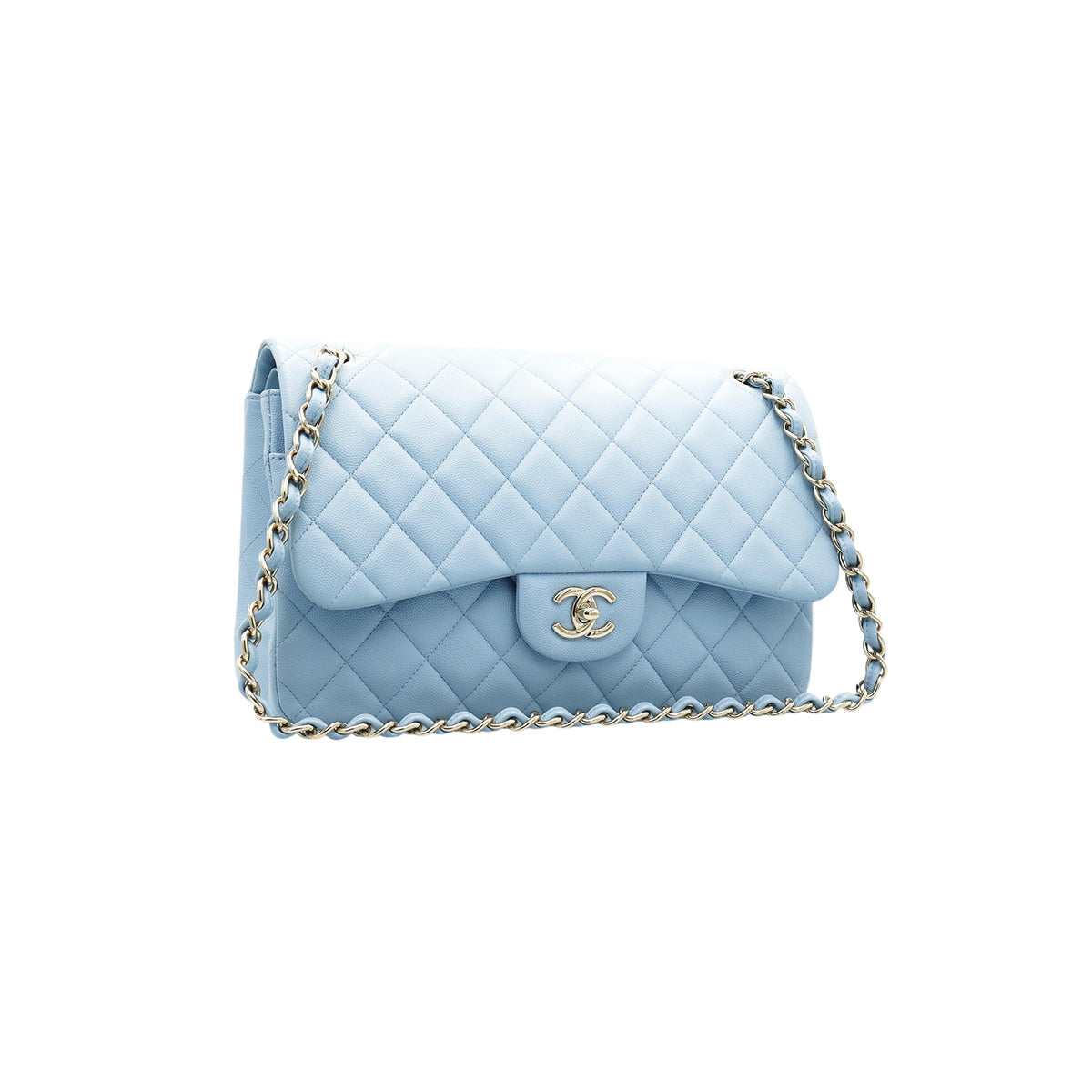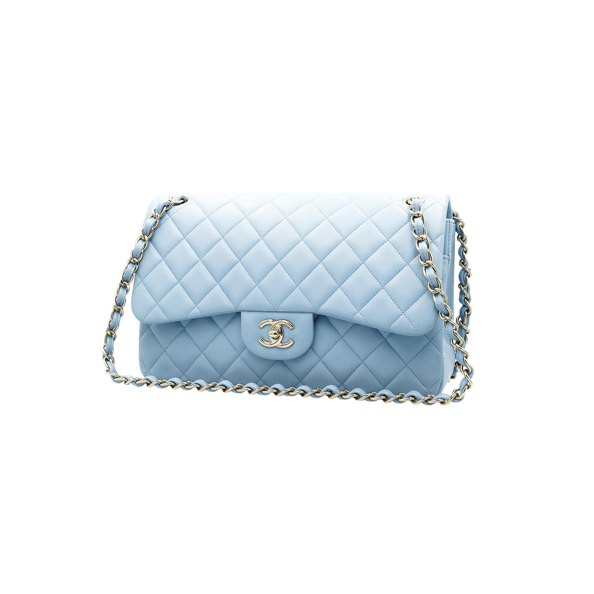 Bolso Chanel Classic, confeccionado en piel caviar color azul claro, solapa y cadena con apliques de piel y herrajes en color dorado.