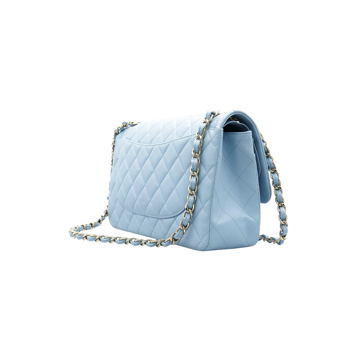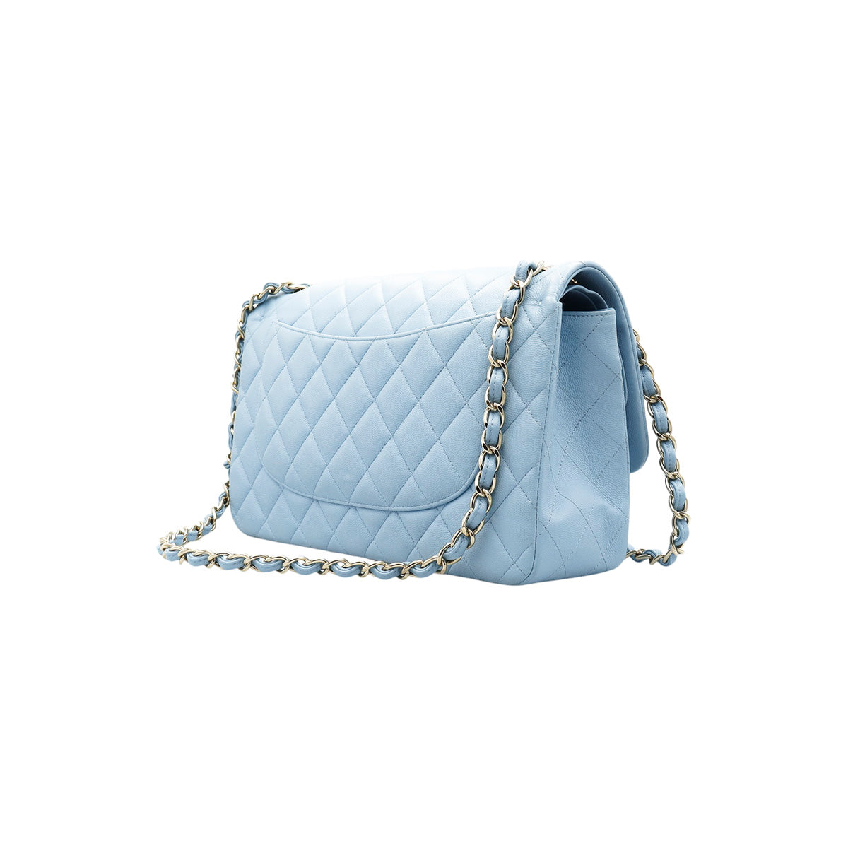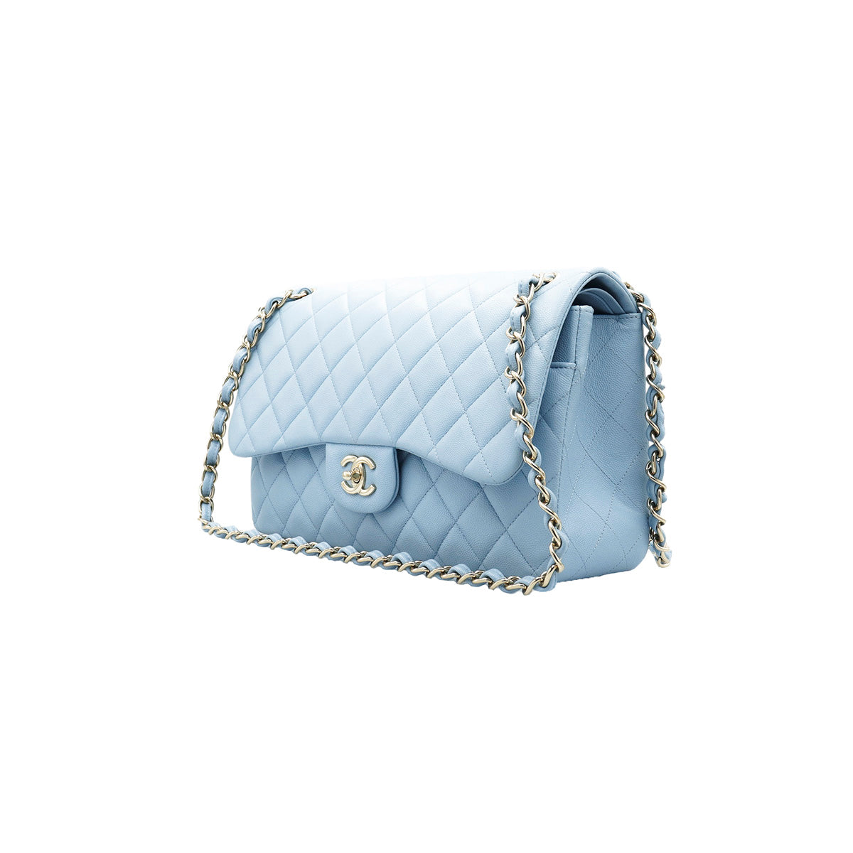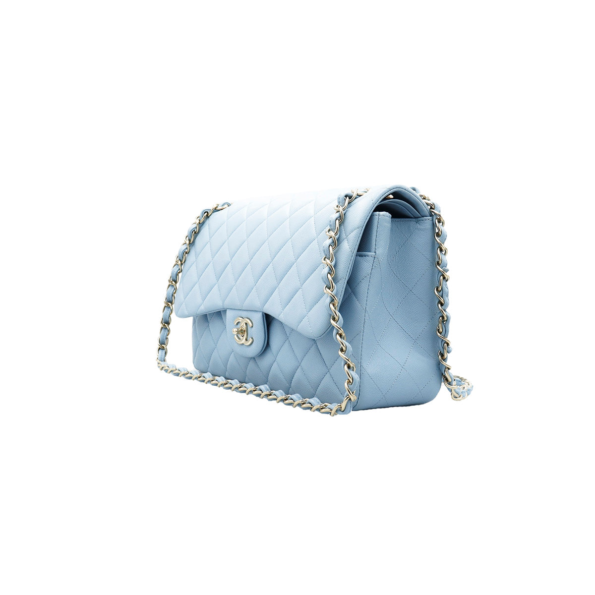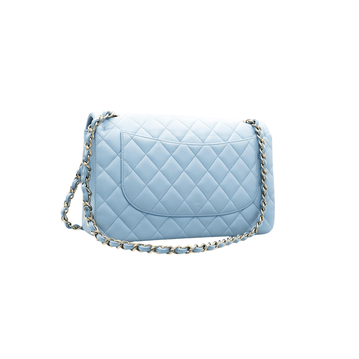 Bolso Chanel Classic, confeccionado en piel caviar color azul claro, solapa y cadena con apliques de piel y herrajes en color dorado.