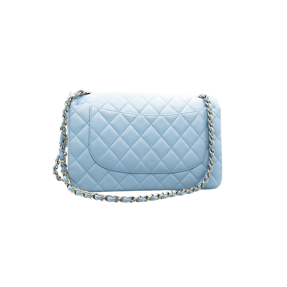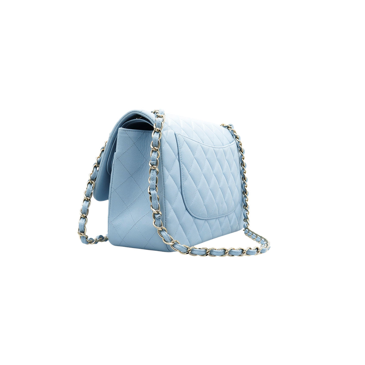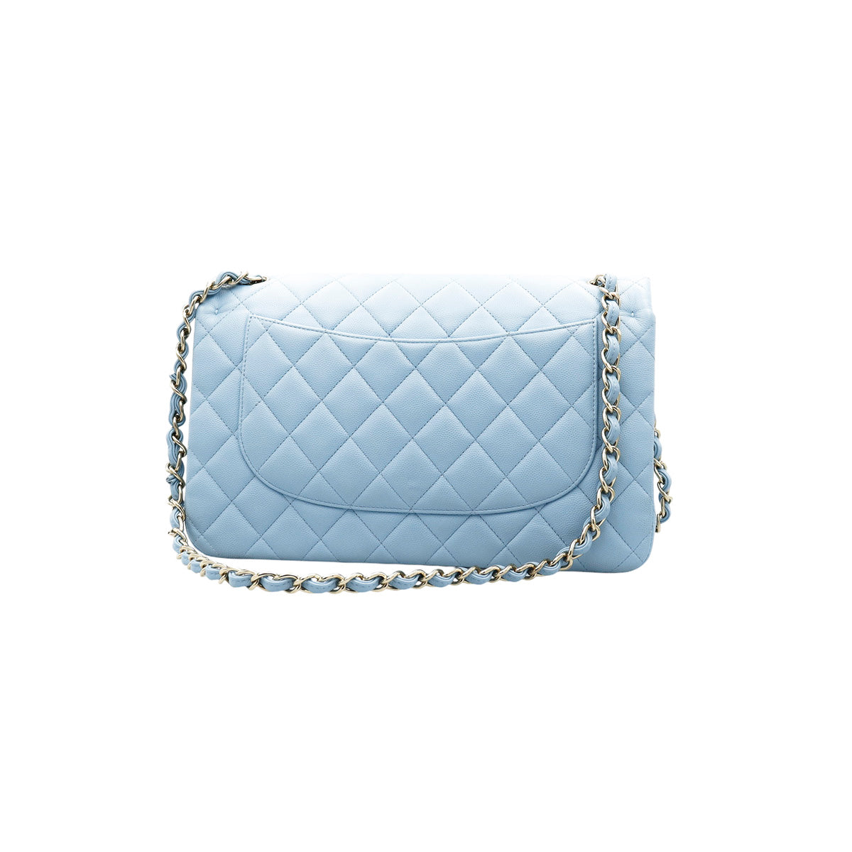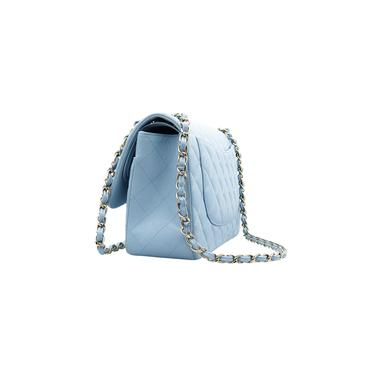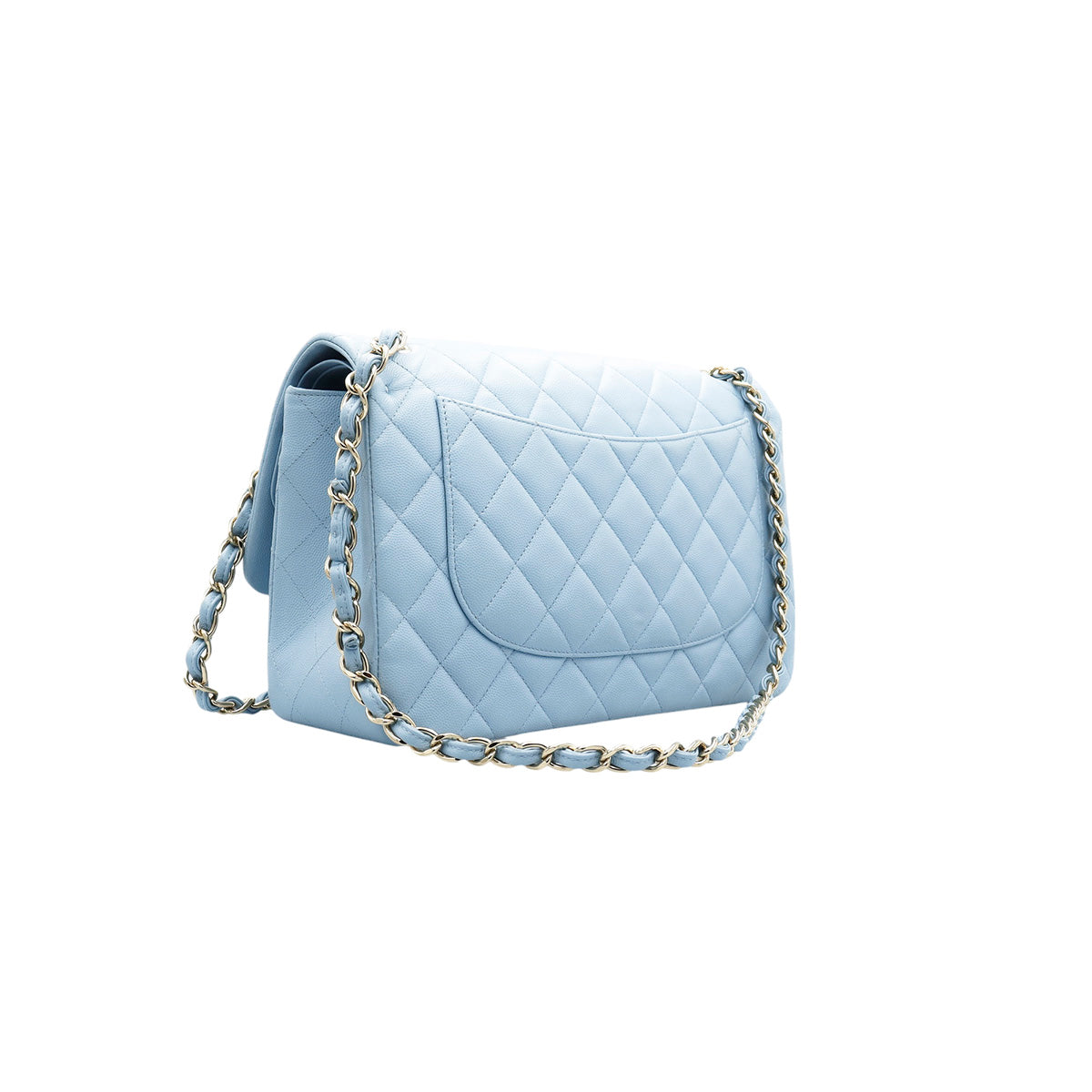 Bolso Chanel Classic, confeccionado en piel caviar color azul claro, solapa y cadena con apliques de piel y herrajes en color dorado.