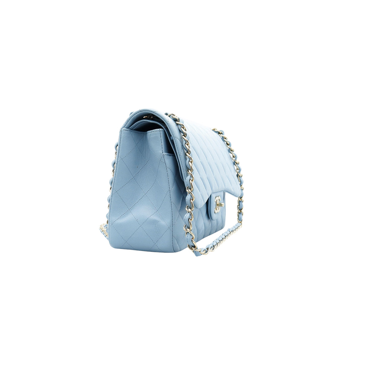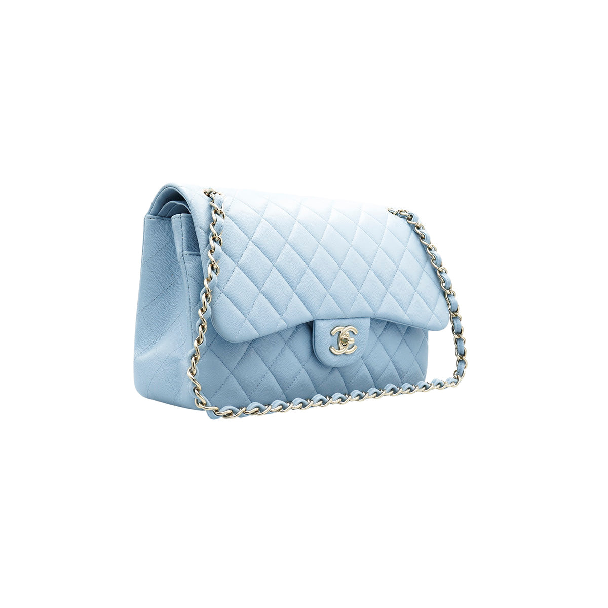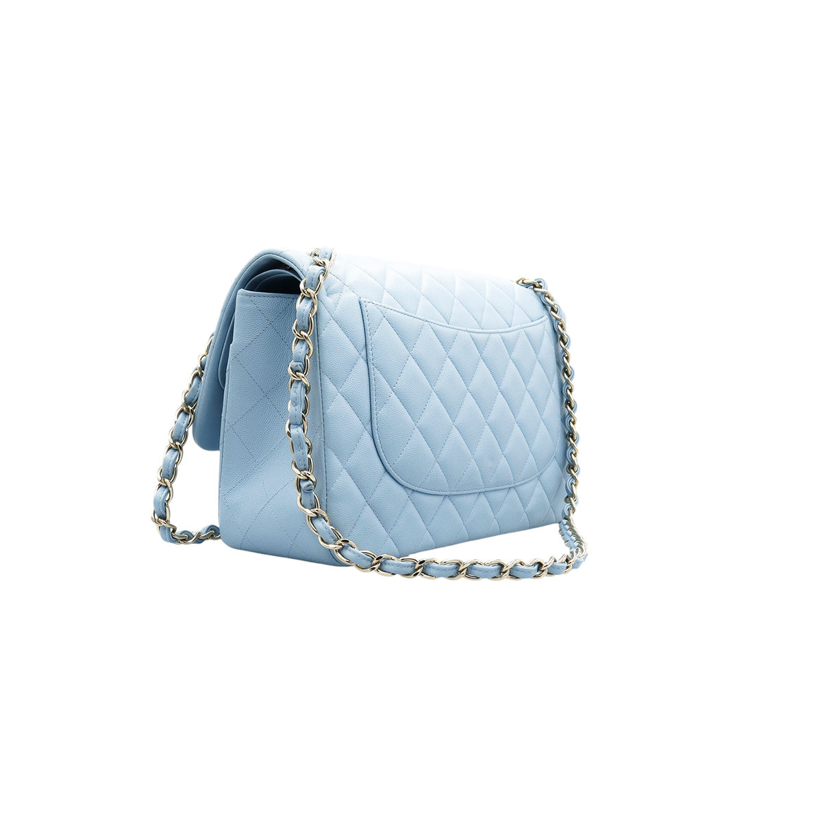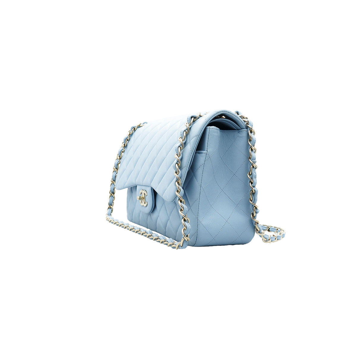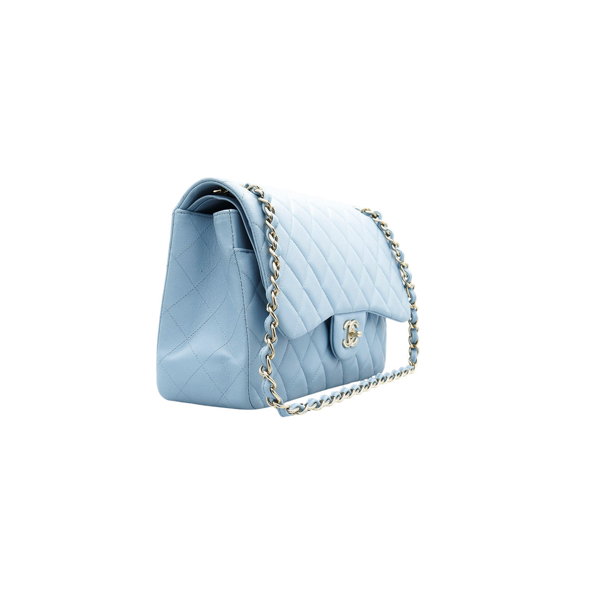 Bolso Chanel Classic, confeccionado en piel caviar color azul claro, solapa y cadena con apliques de piel y herrajes en color dorado.