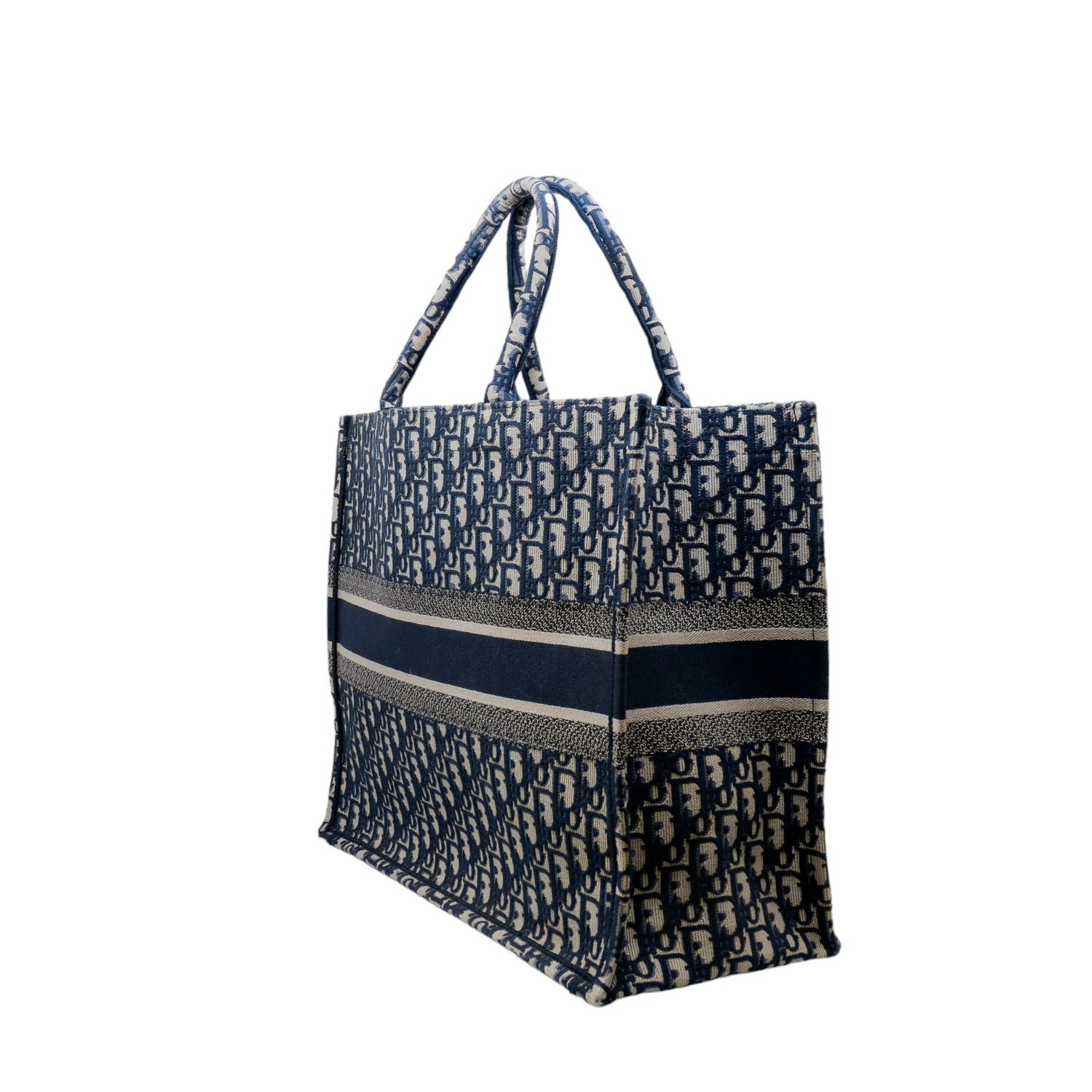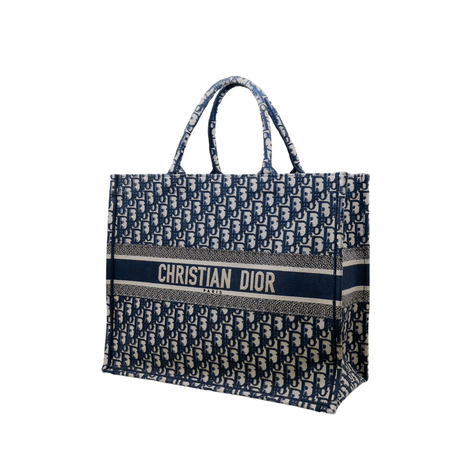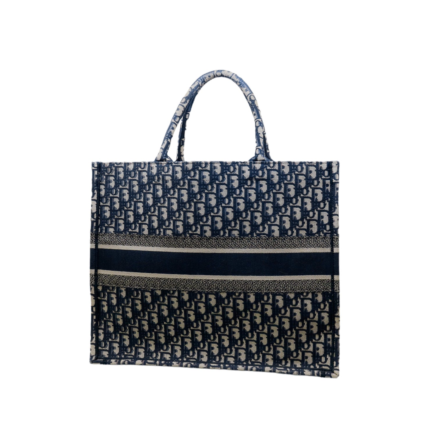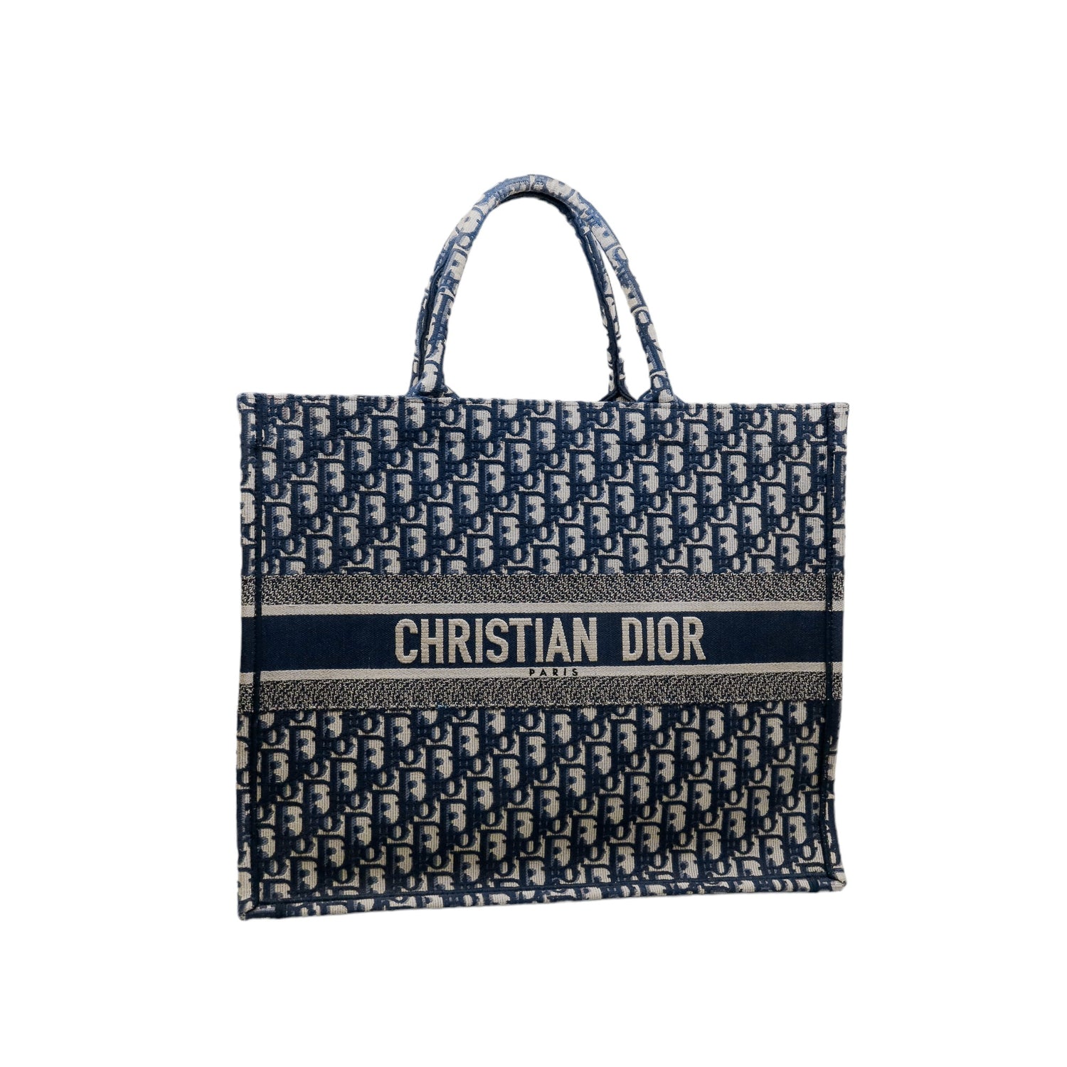Bolso Christian Dior tipo Tote, confeccionado en lienzo blanco con negro con el monograma de la marca, poco sucia en asas, base y esquina.