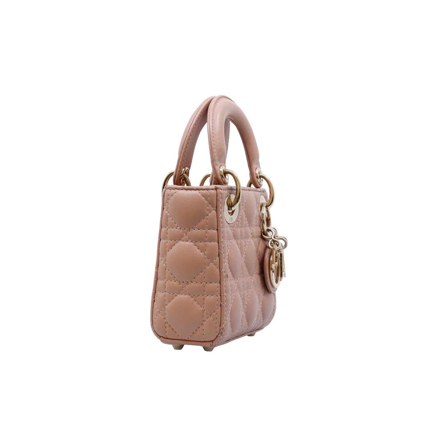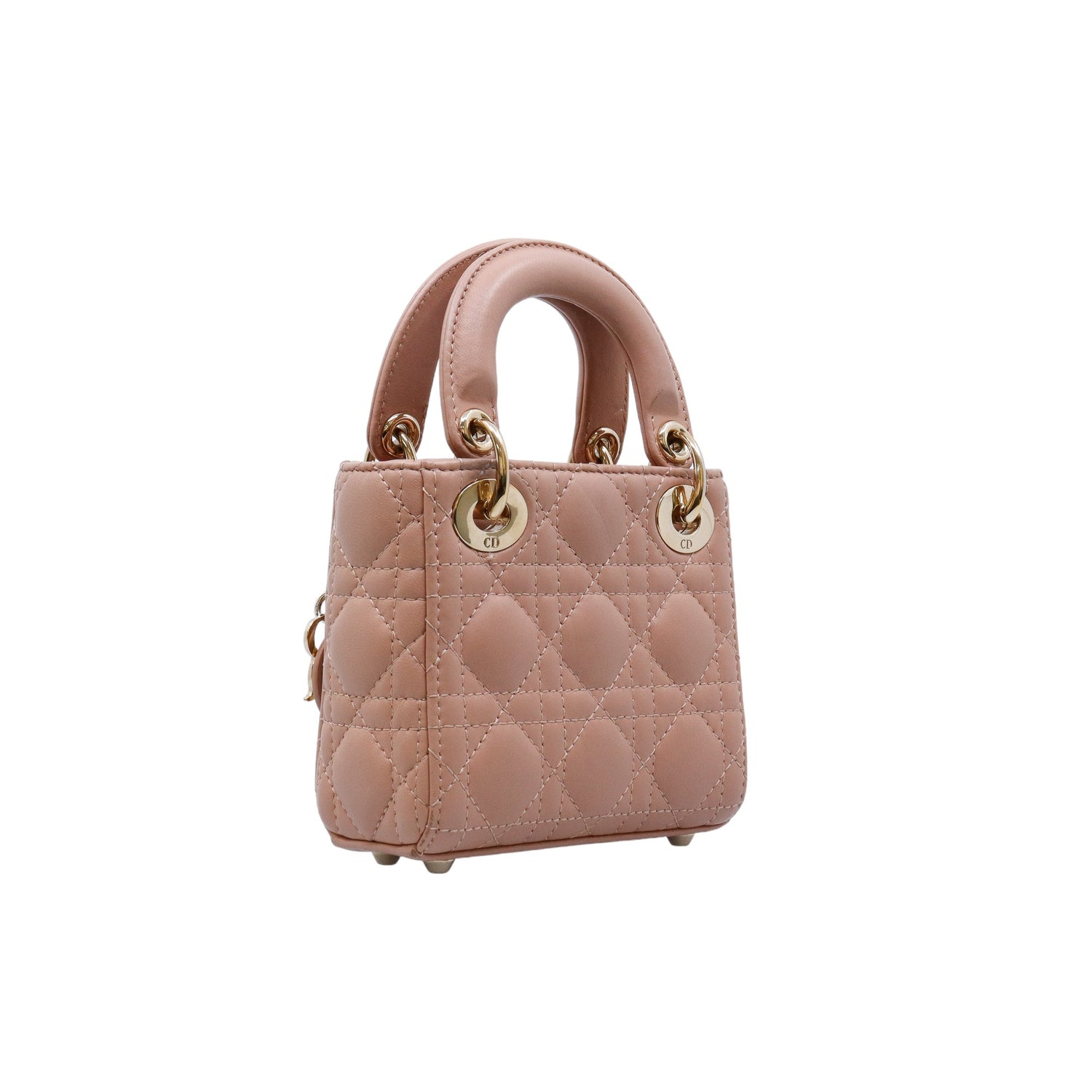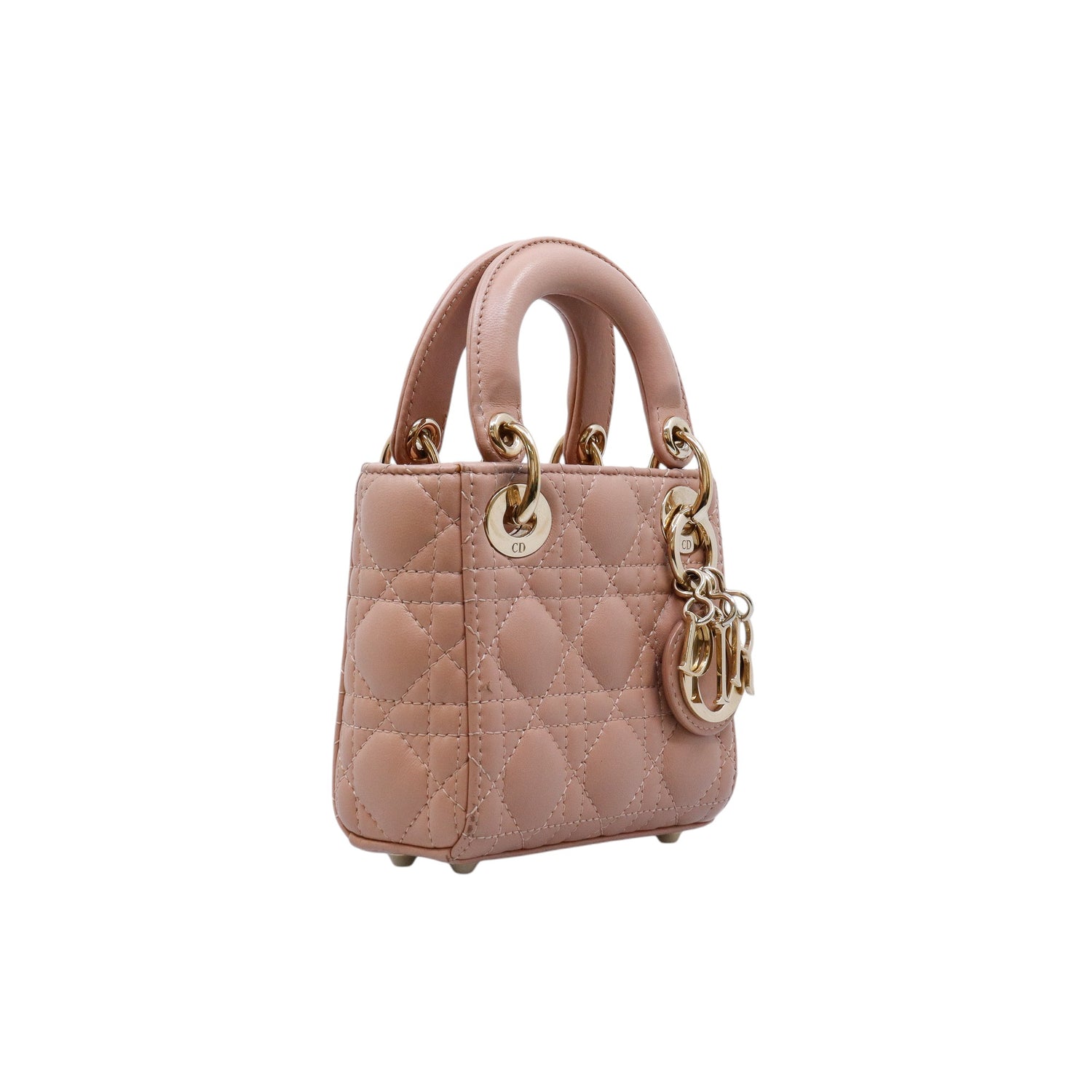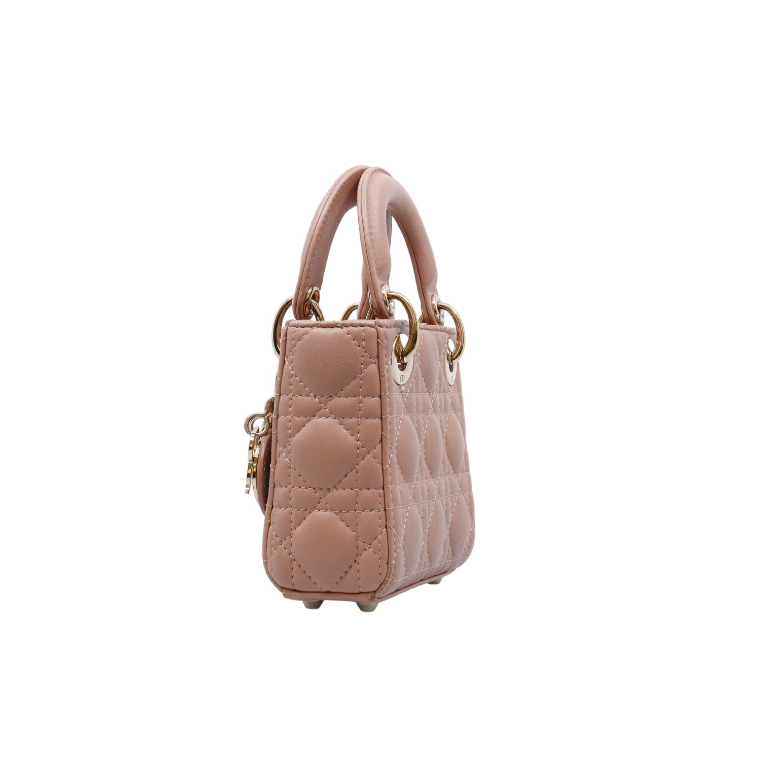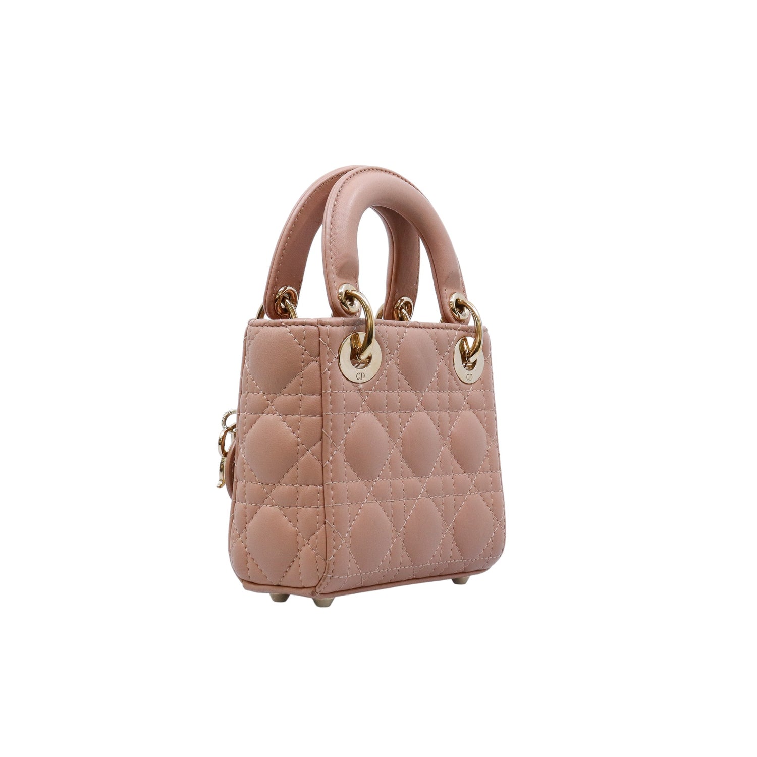 Bolso Christian Dior modelo Lady Dior Micro Bag, confeccionado en piel color nude, interior en ante del mismo tono, con bandolera ajustable al hombro, con 2 asas superiores rígidas, con herrajes y charm en color dorado, poco sucia en interior y exterior. Pequeña rasgada al frente.