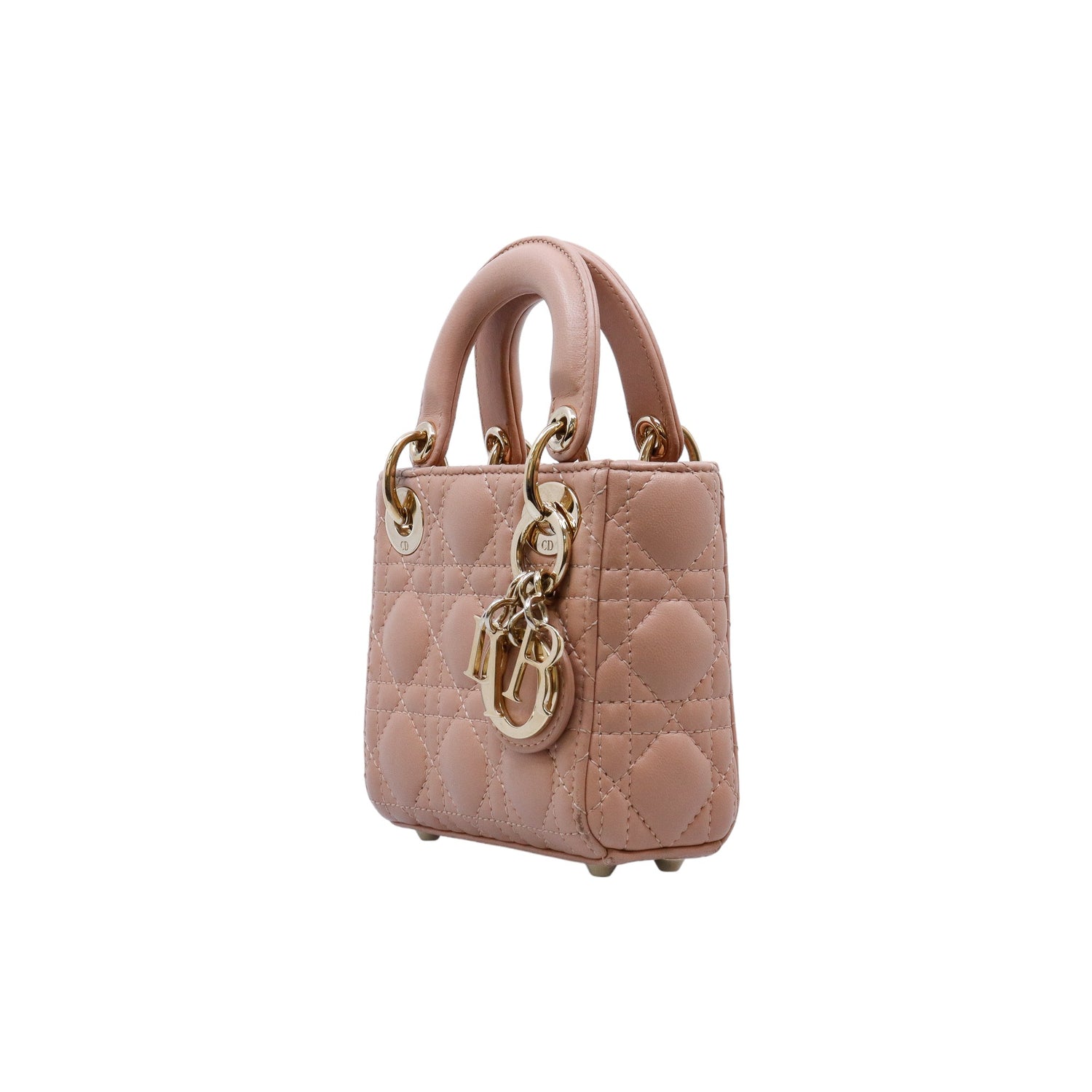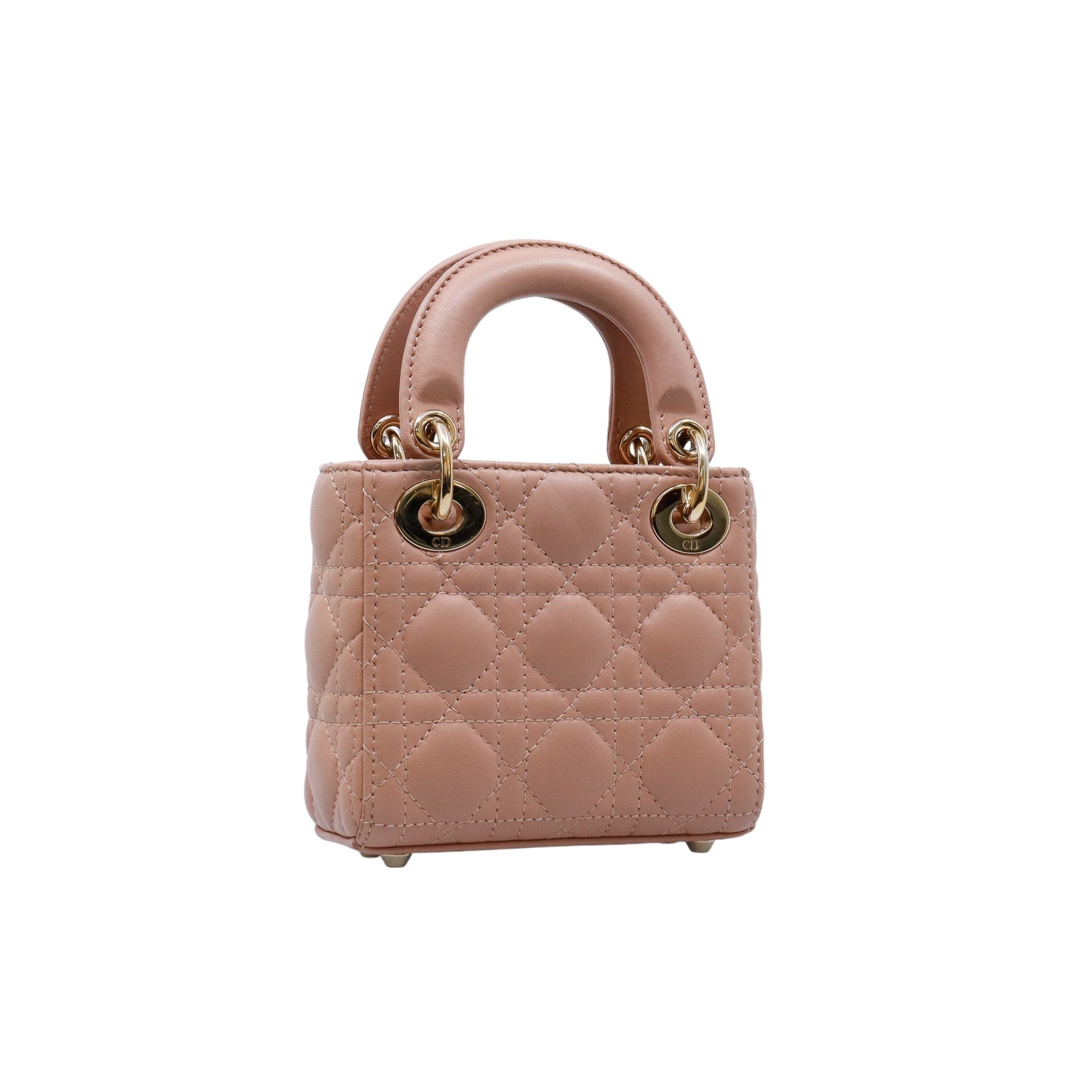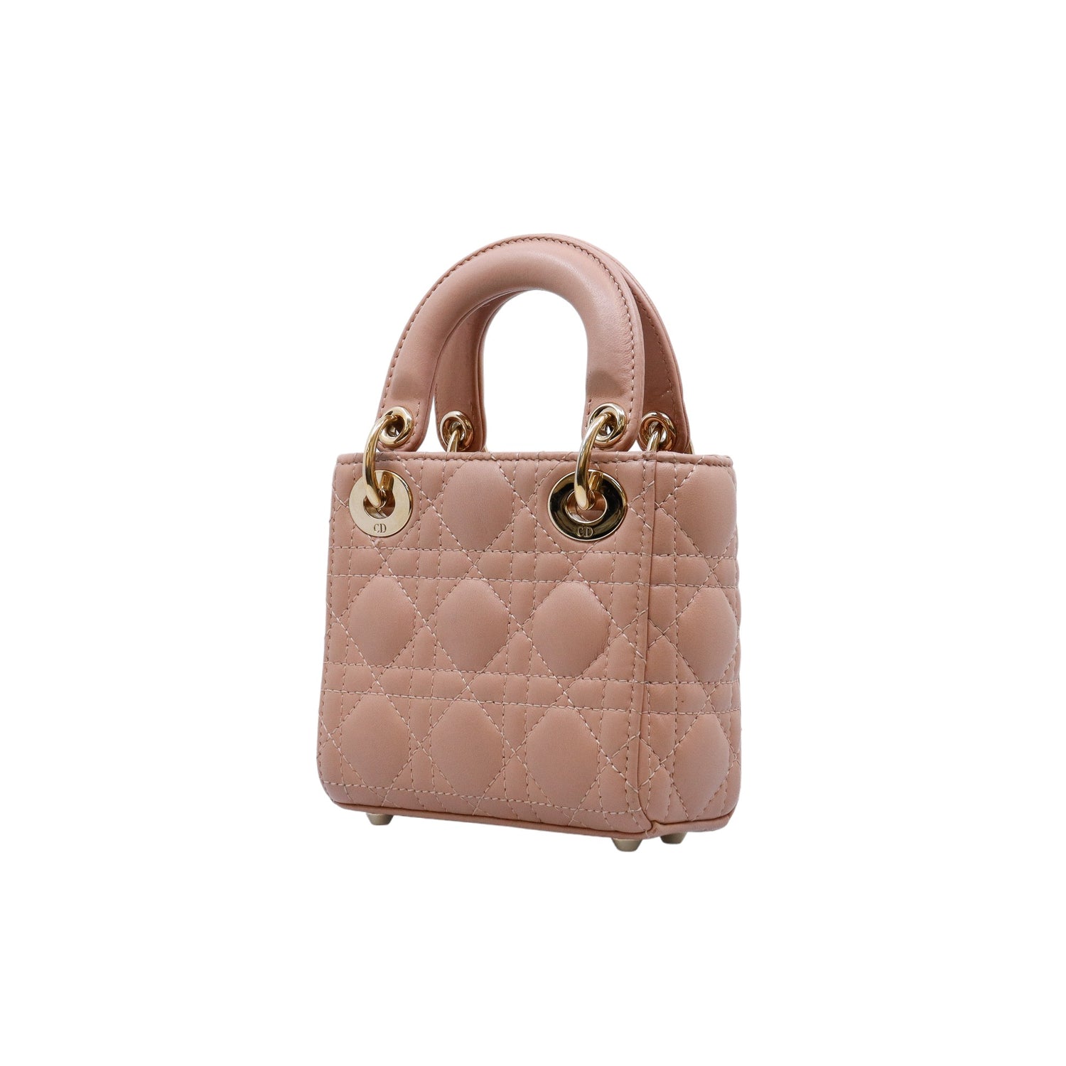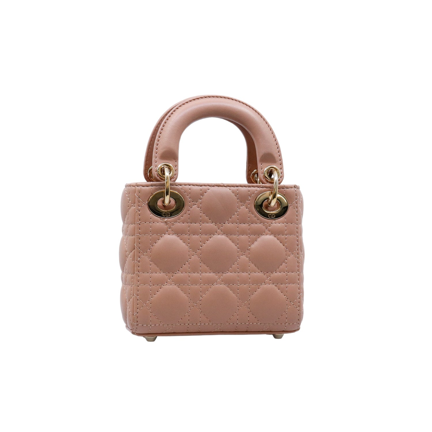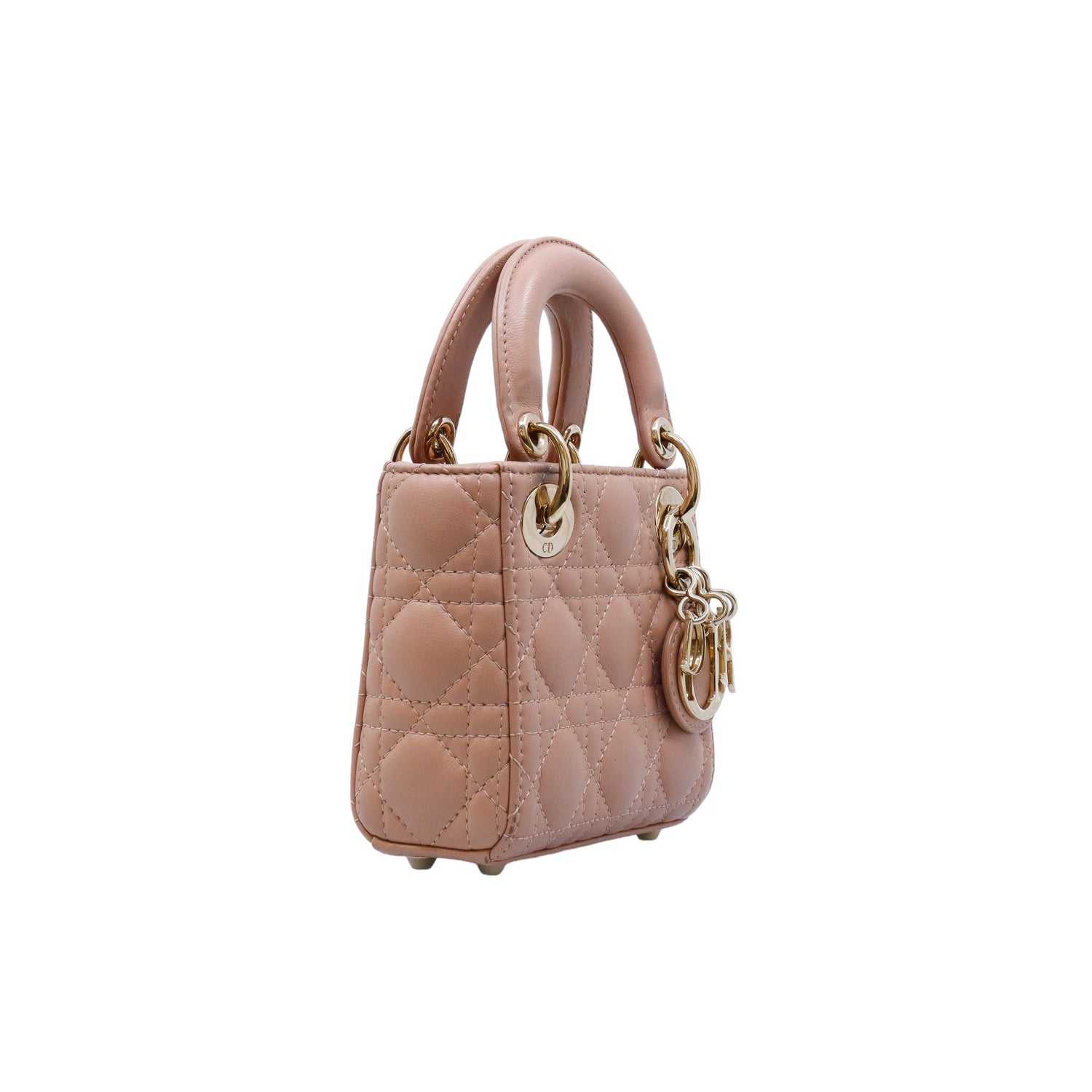 Bolso Christian Dior modelo Lady Dior Micro Bag, confeccionado en piel color nude, interior en ante del mismo tono, con bandolera ajustable al hombro, con 2 asas superiores rígidas, con herrajes y charm en color dorado, poco sucia en interior y exterior. Pequeña rasgada al frente.