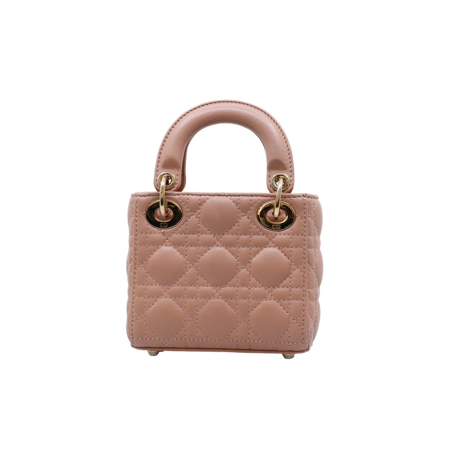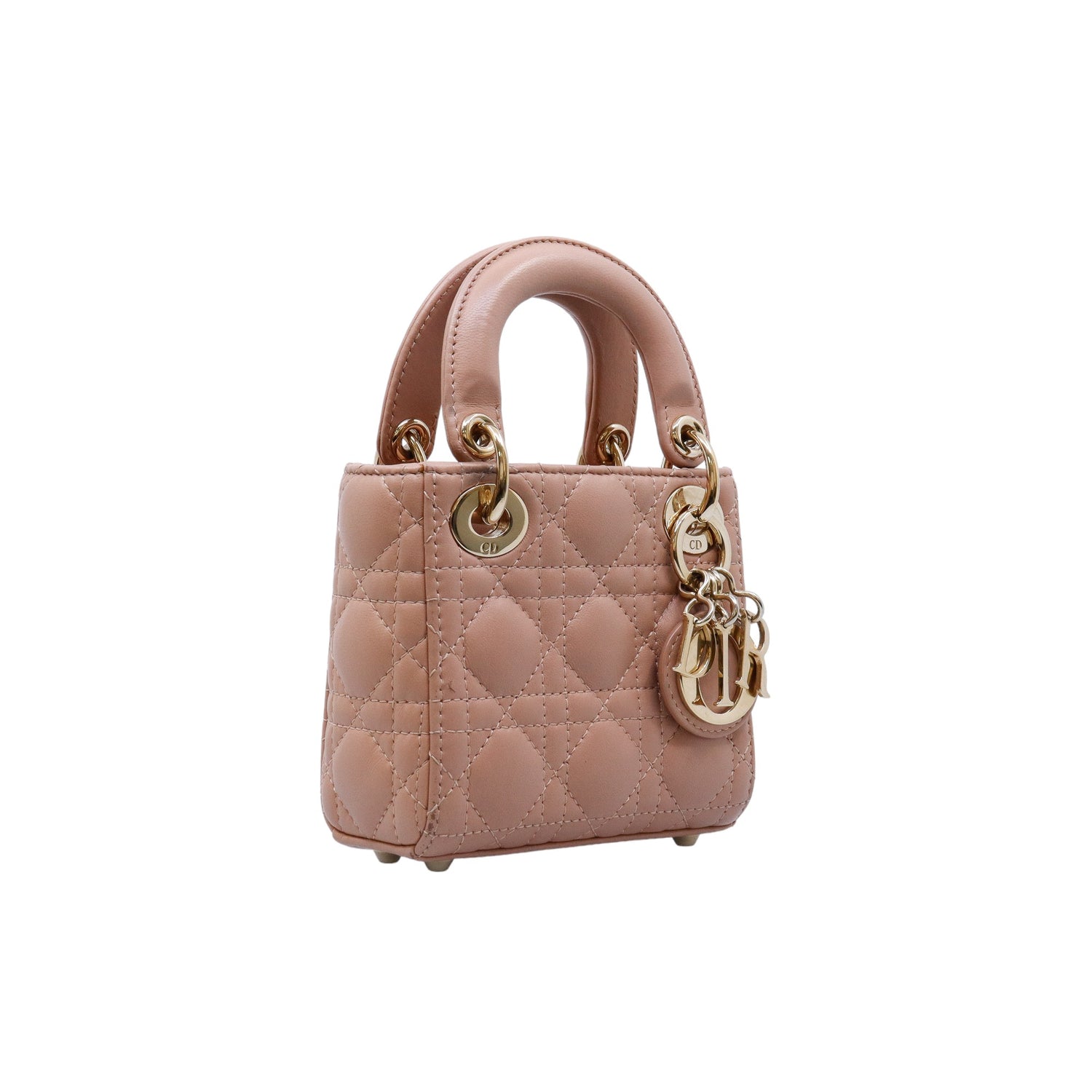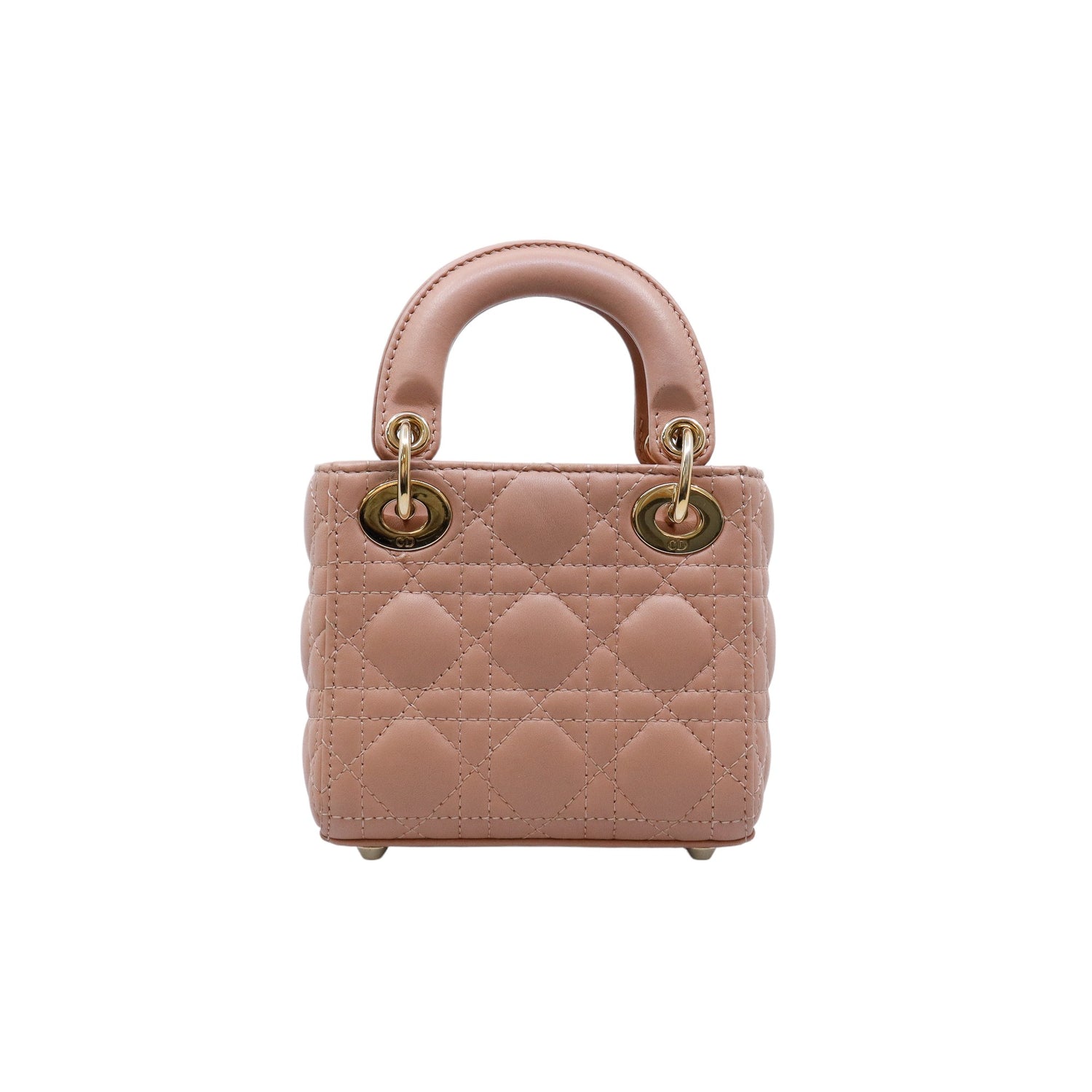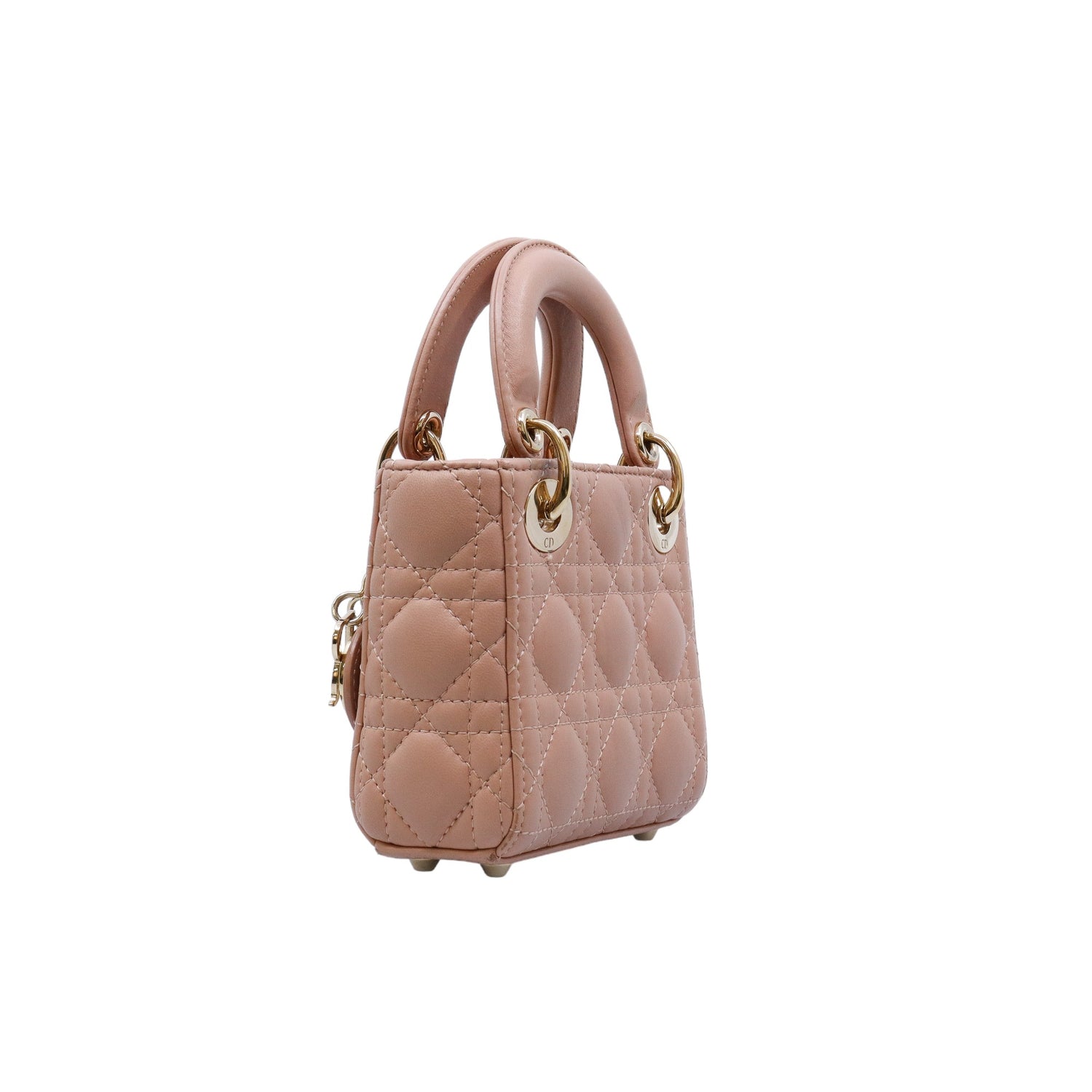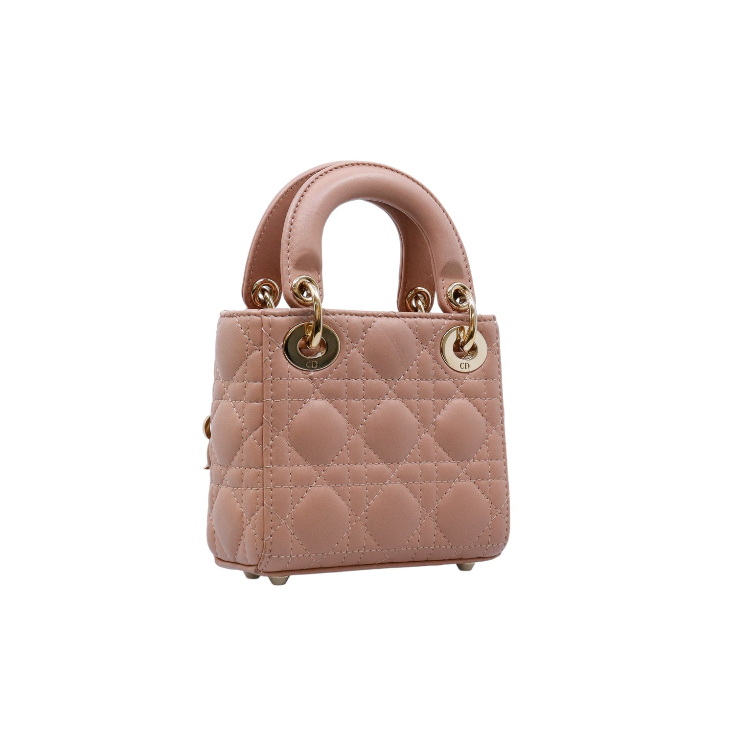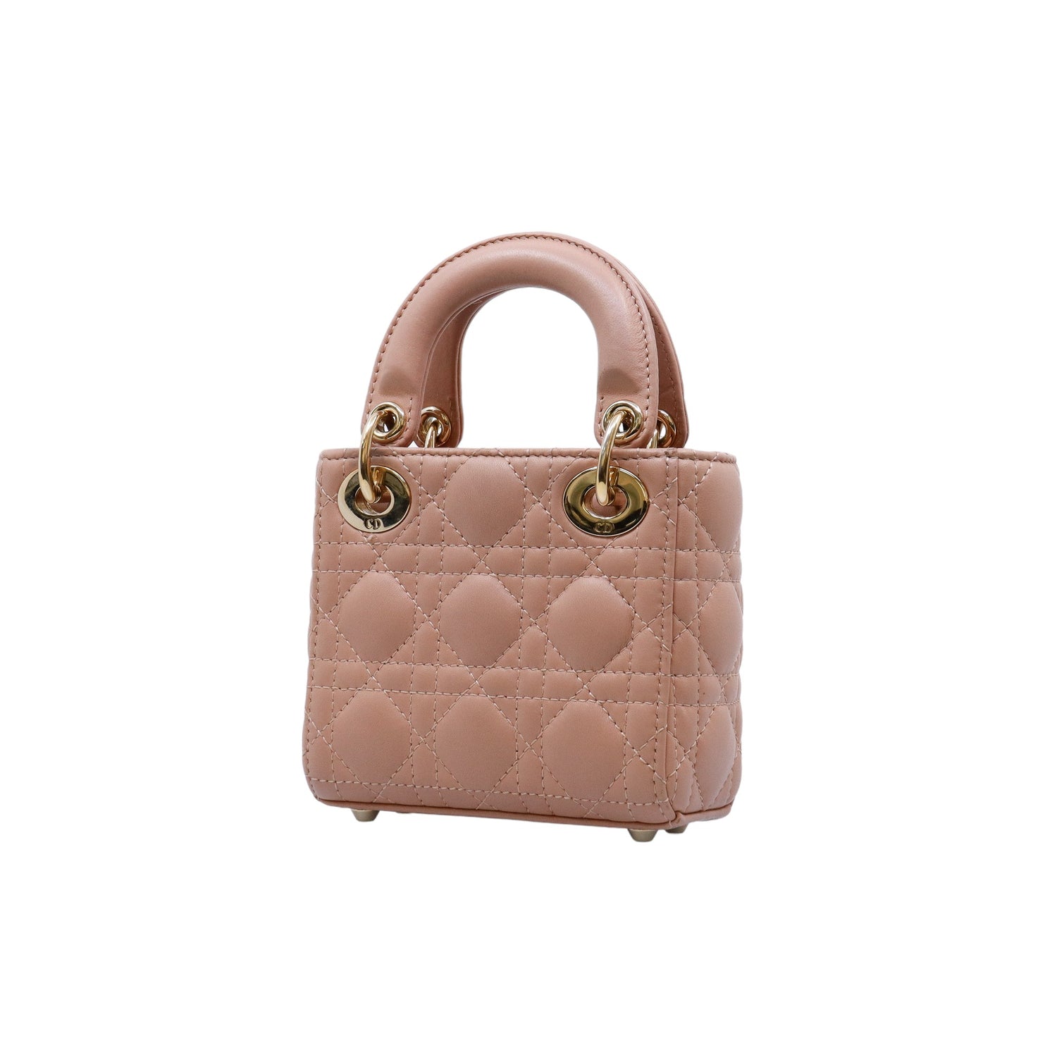 Bolso Christian Dior modelo Lady Dior Micro Bag, confeccionado en piel color nude, interior en ante del mismo tono, con bandolera ajustable al hombro, con 2 asas superiores rígidas, con herrajes y charm en color dorado, poco sucia en interior y exterior. Pequeña rasgada al frente.
