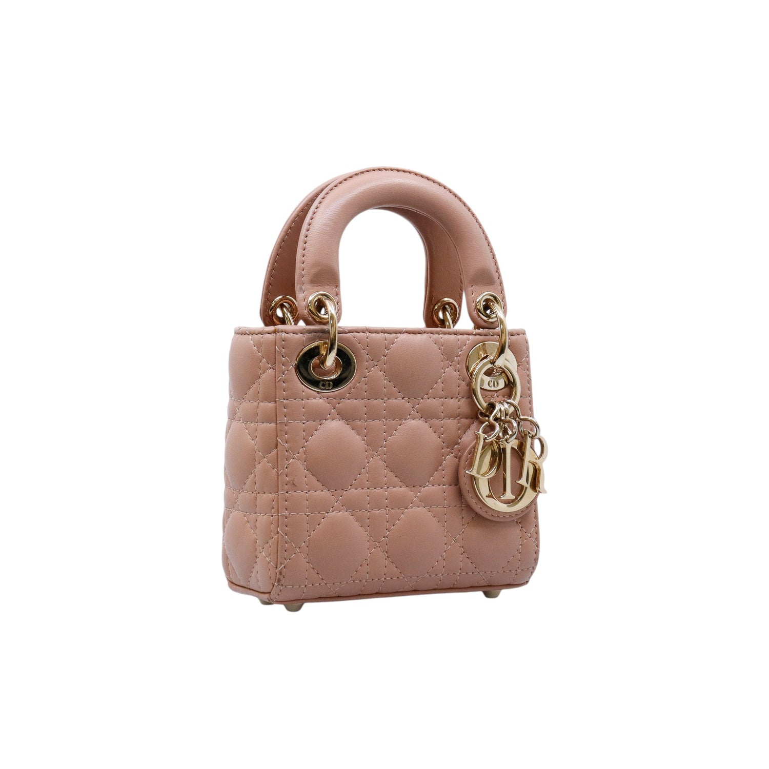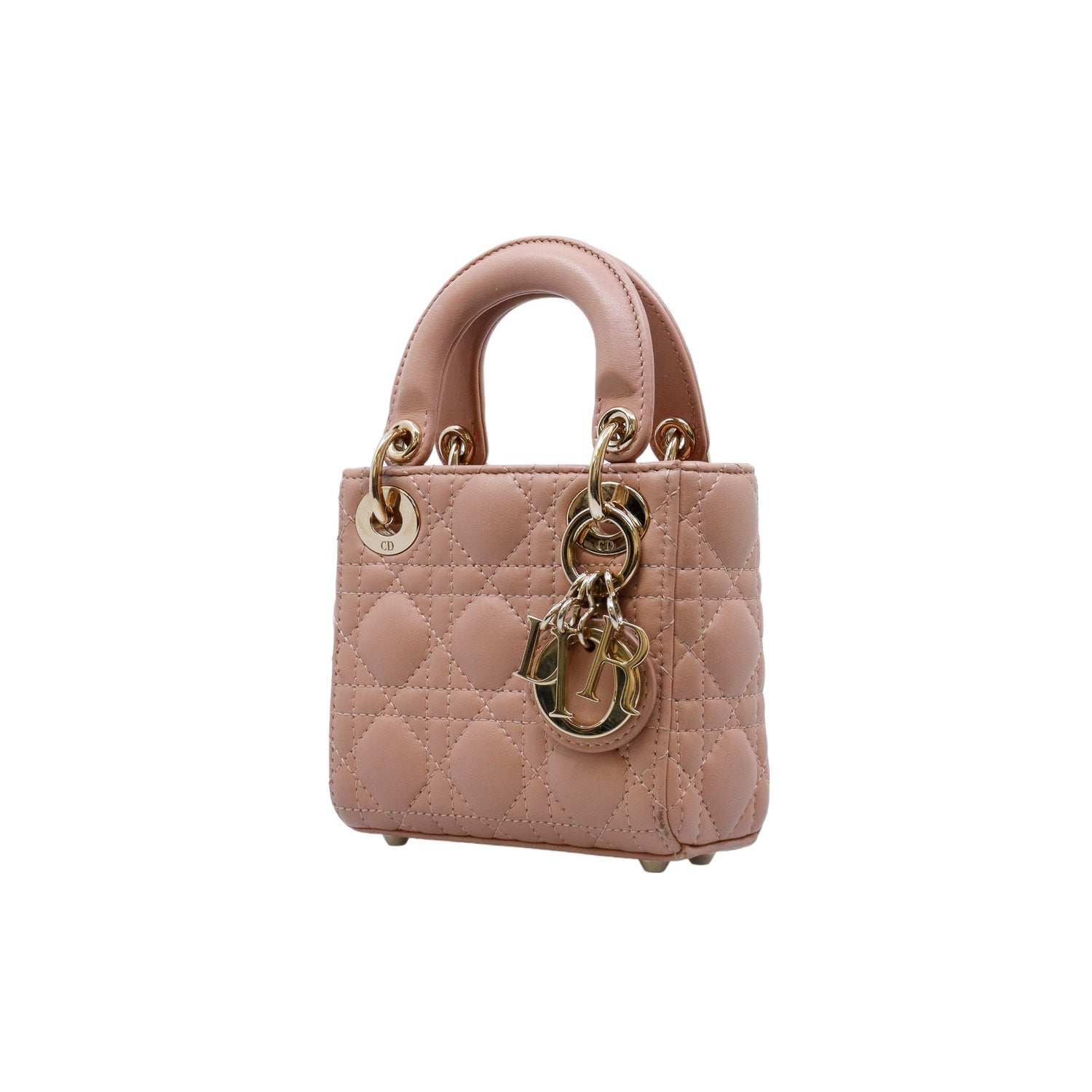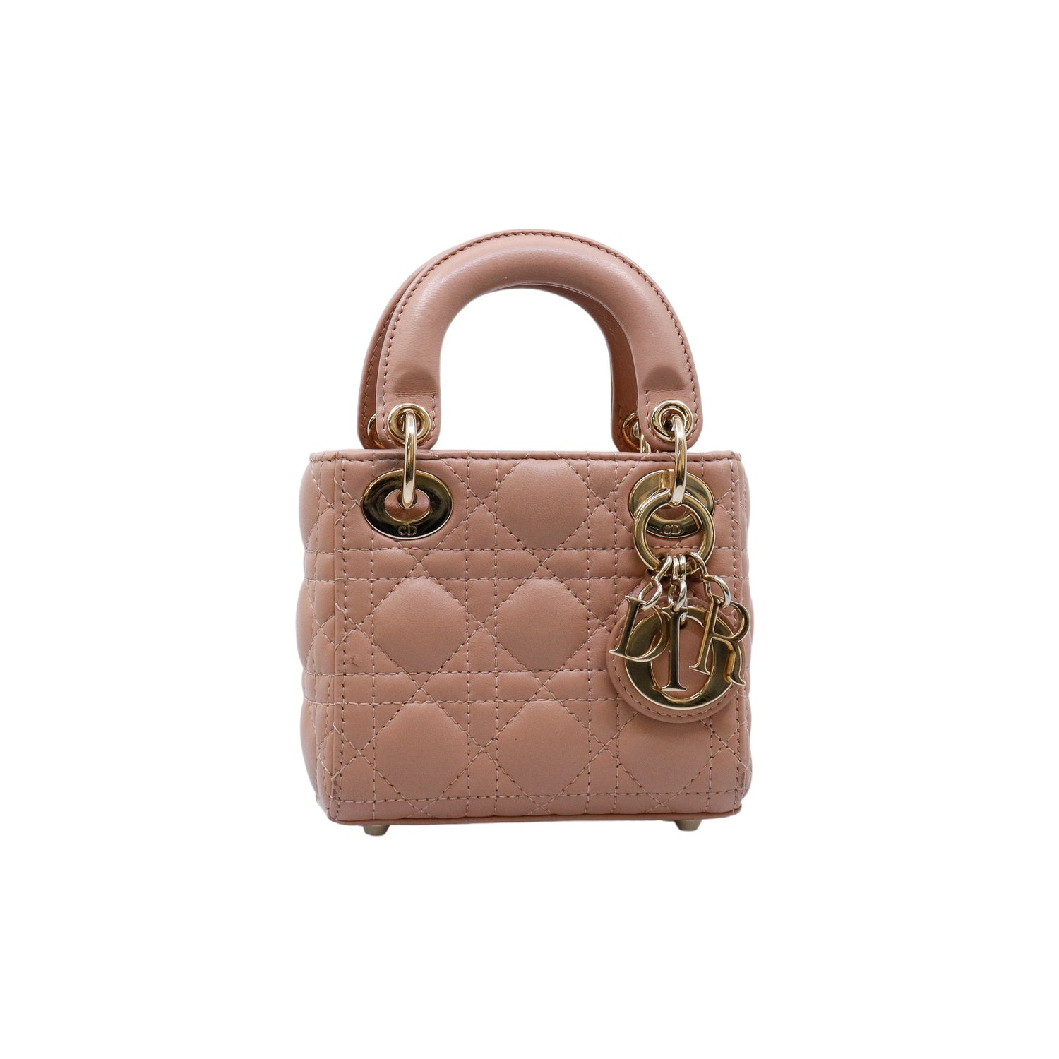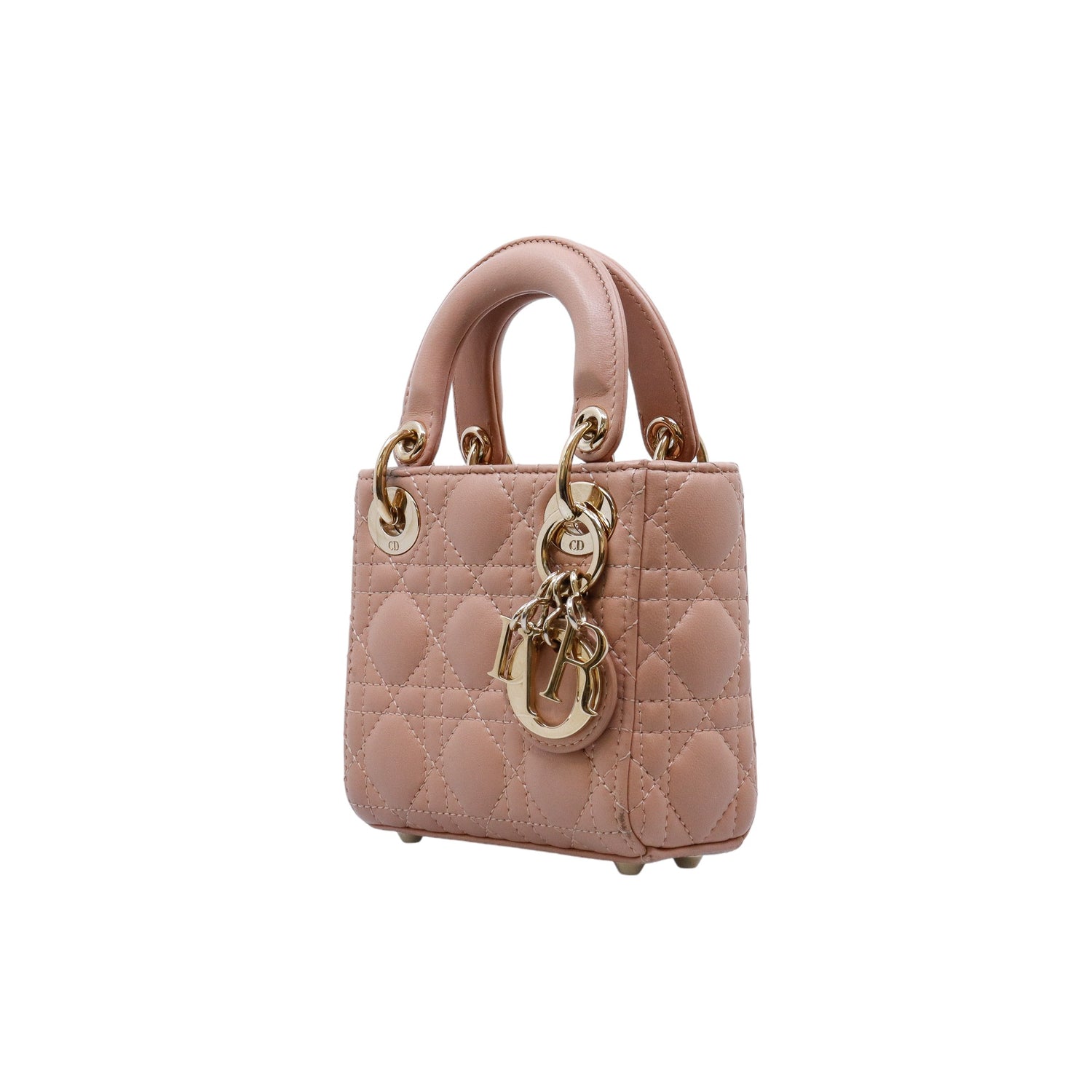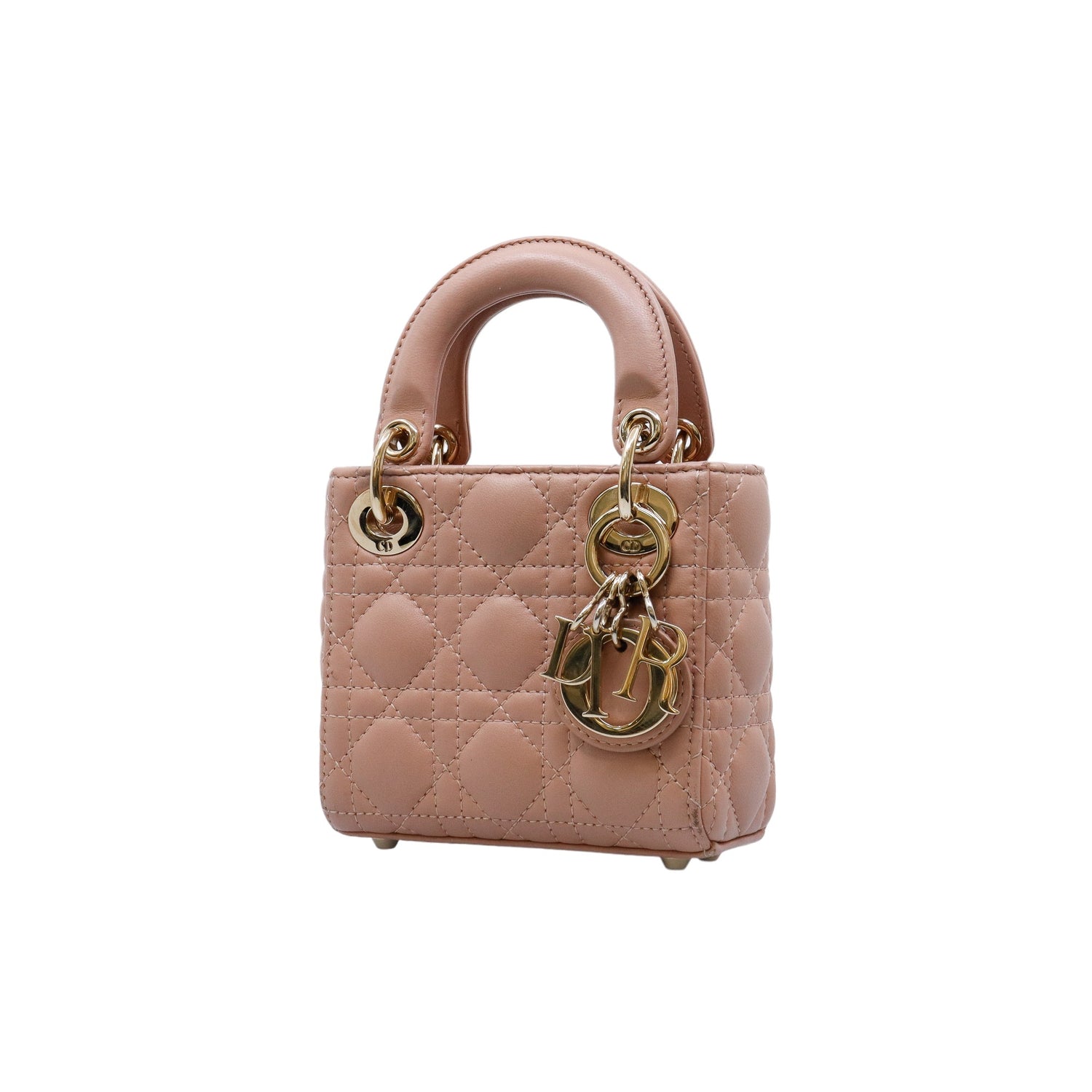 Bolso Christian Dior modelo Lady Dior Micro Bag, confeccionado en piel color nude, interior en ante del mismo tono, con bandolera ajustable al hombro, con 2 asas superiores rígidas, con herrajes y charm en color dorado, poco sucia en interior y exterior. Pequeña rasgada al frente.