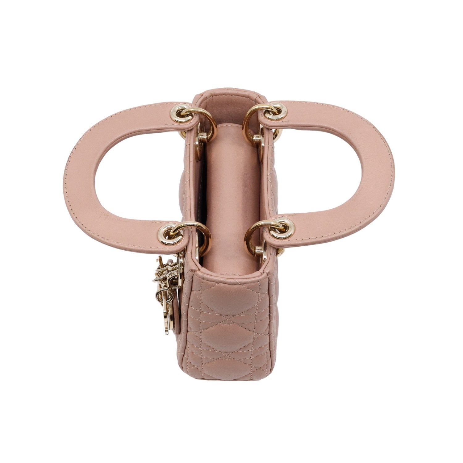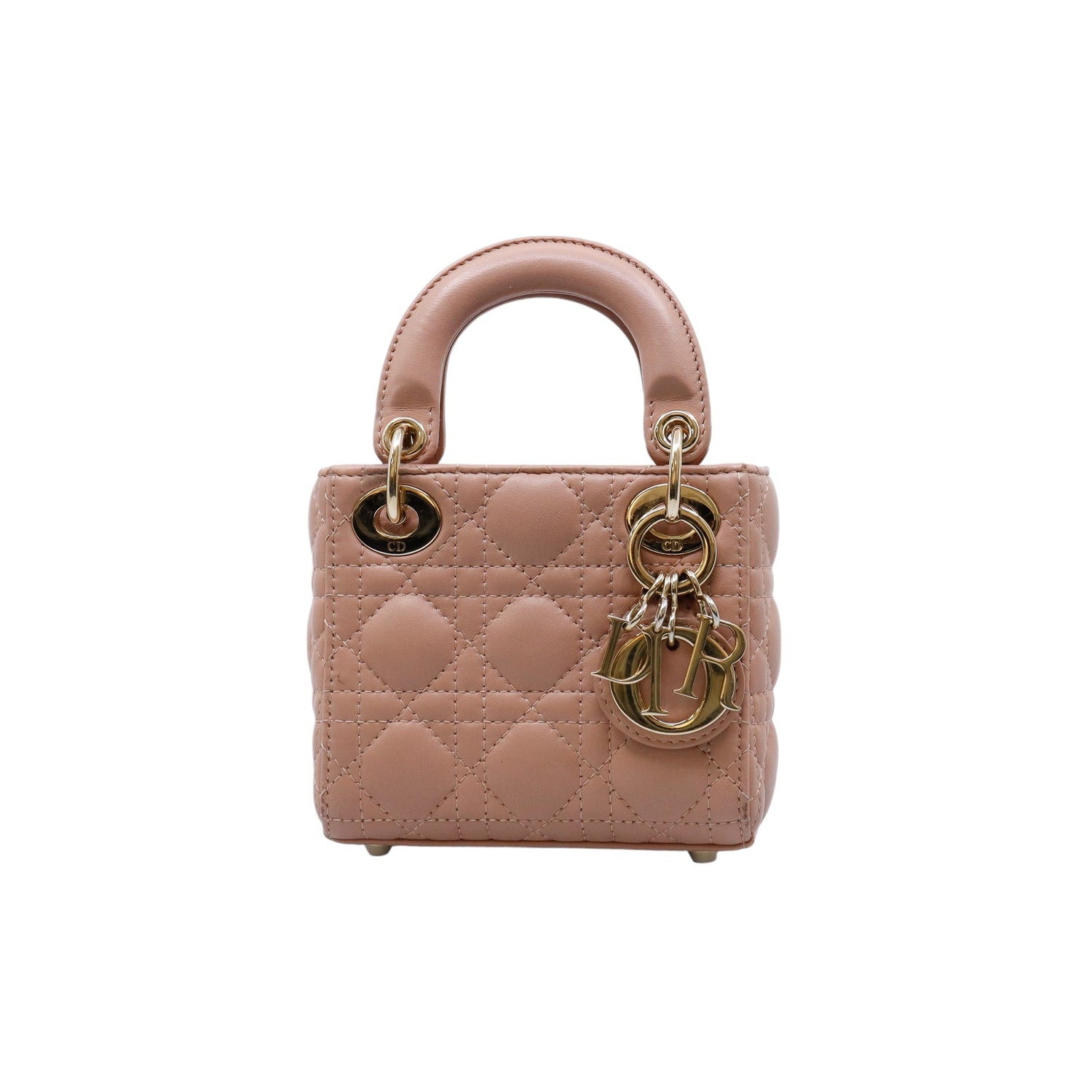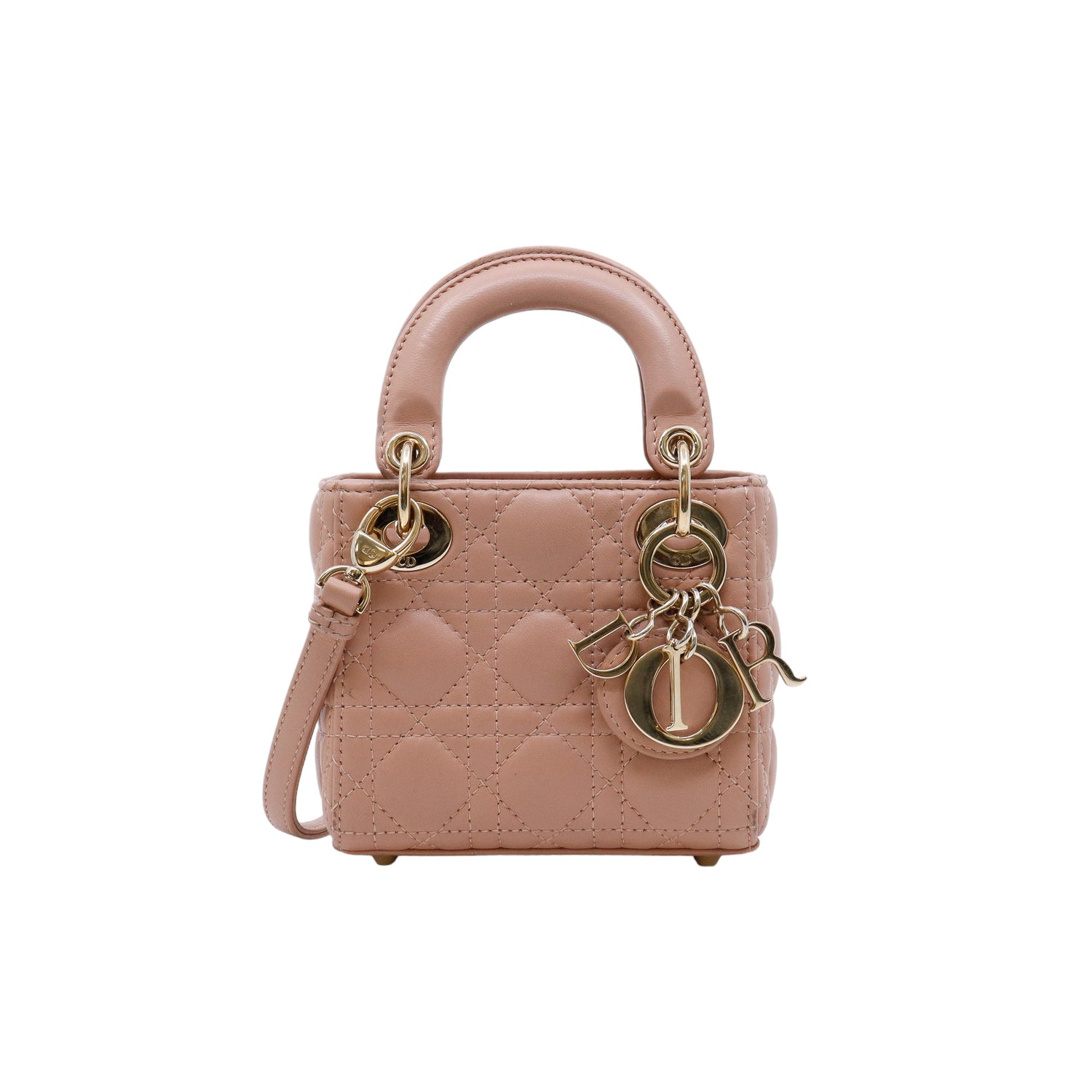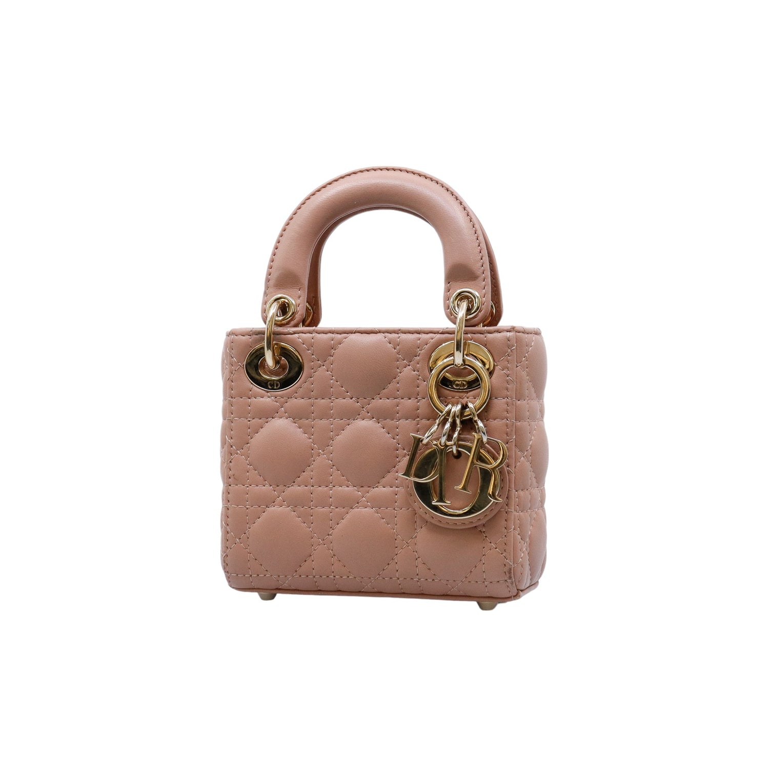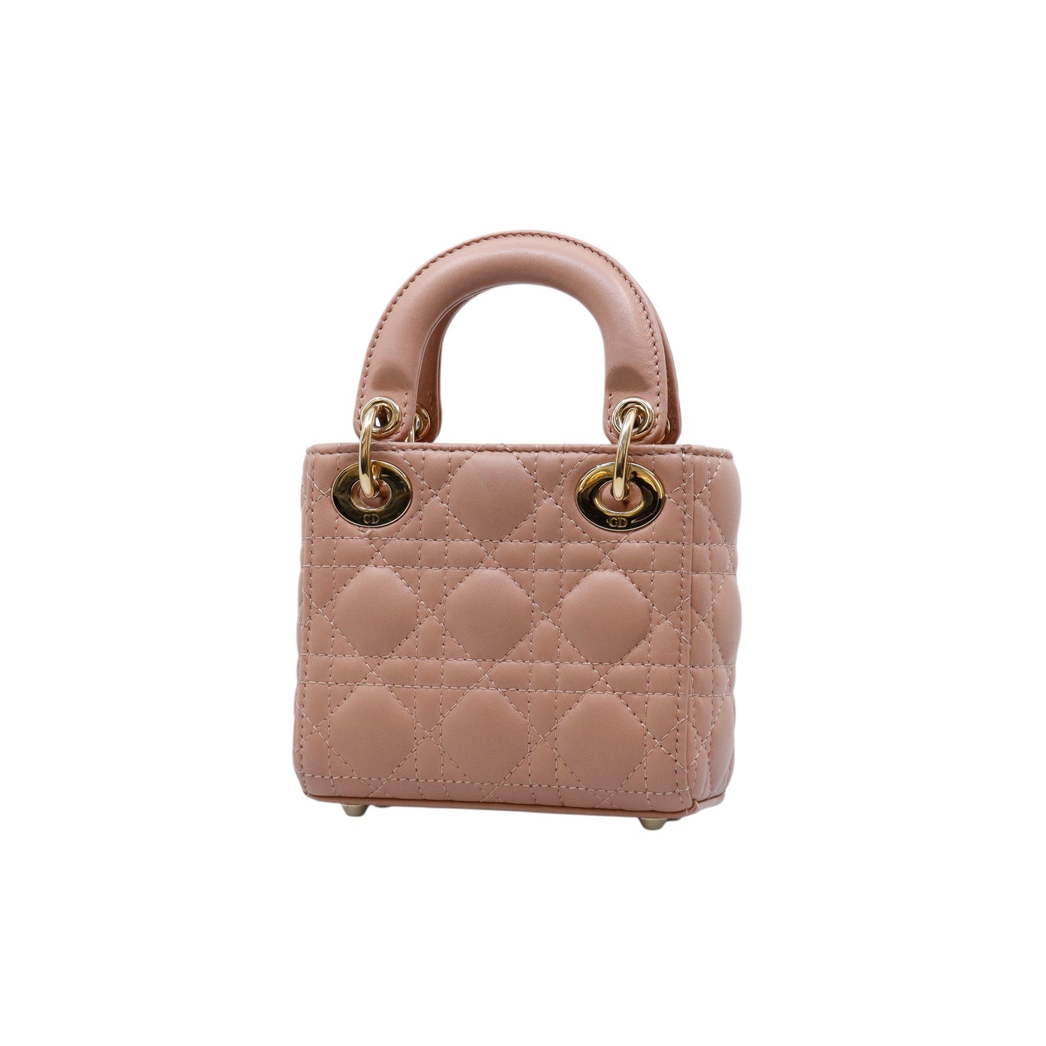 Bolso Christian Dior modelo Lady Dior Micro Bag, confeccionado en piel color nude, interior en ante del mismo tono, con bandolera ajustable al hombro, con 2 asas superiores rígidas, con herrajes y charm en color dorado, poco sucia en interior y exterior. Pequeña rasgada al frente.