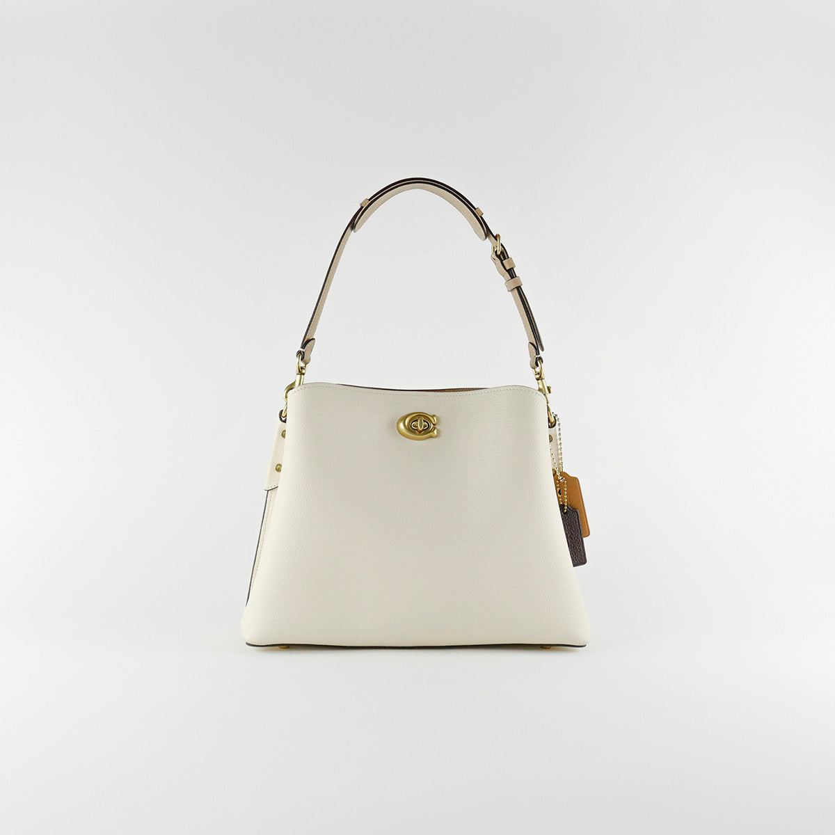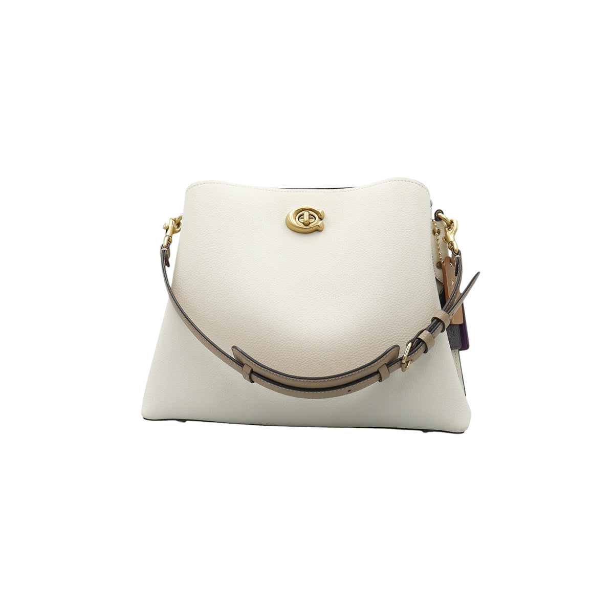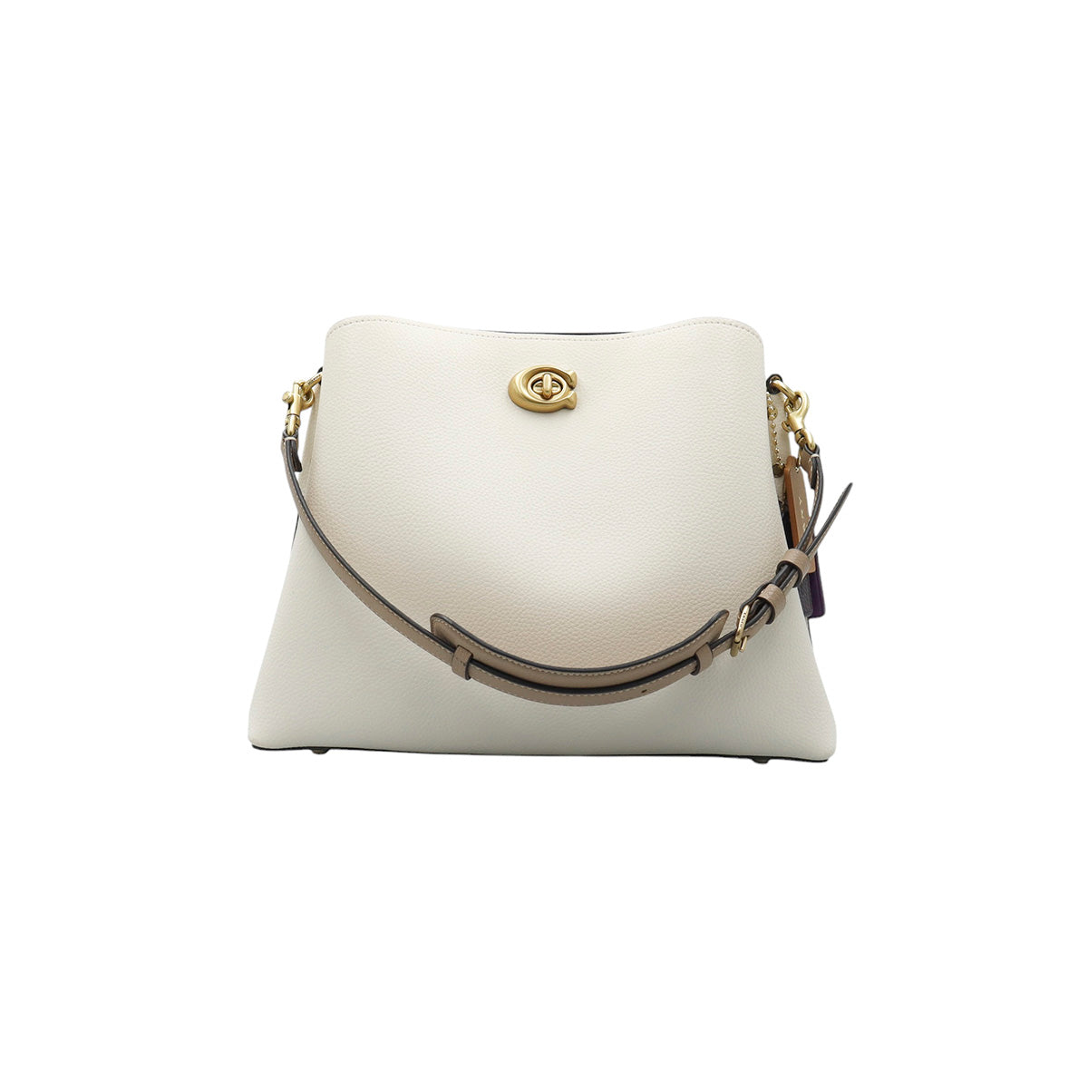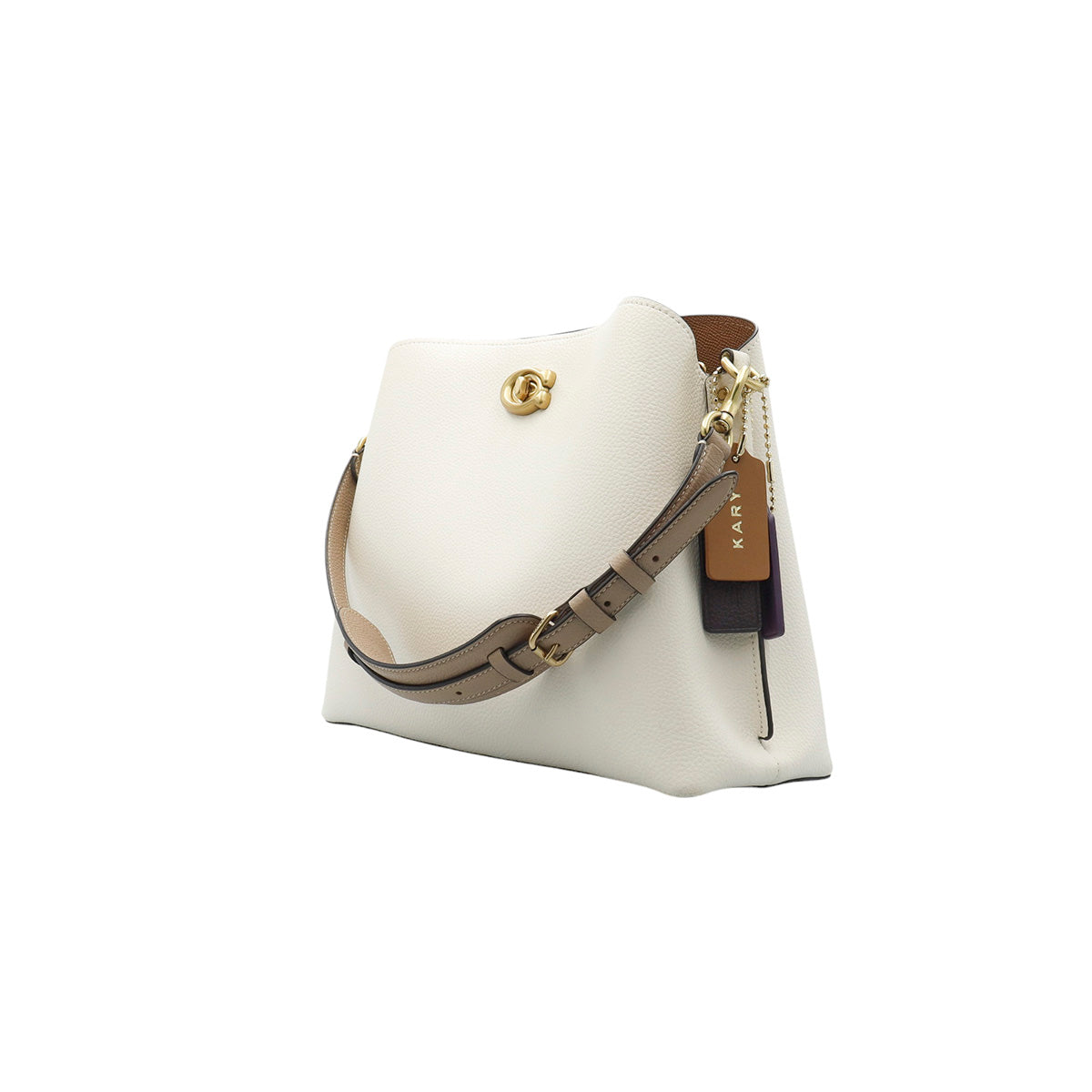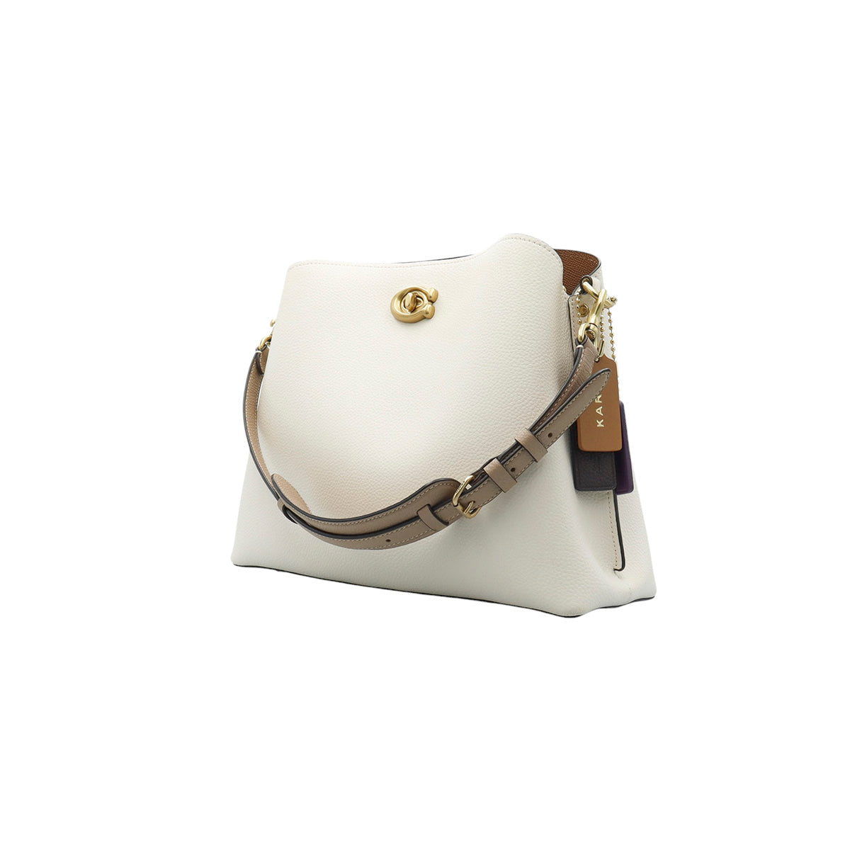 Bolso Coach de la línea Willow Colorblock, confeccionado en piel color blanco marfil, con asa y correa desmontables, bolsillo interno con cierre de cremallera y cierre magnético, en buen estado, algunas manchas leves en superficie, con 3 charms (etiquetas)de piel.