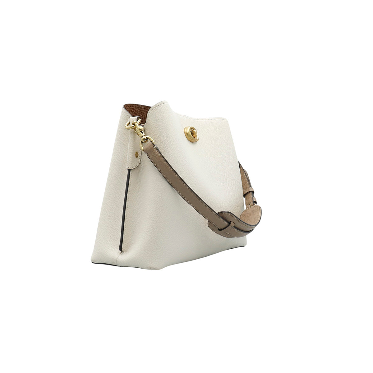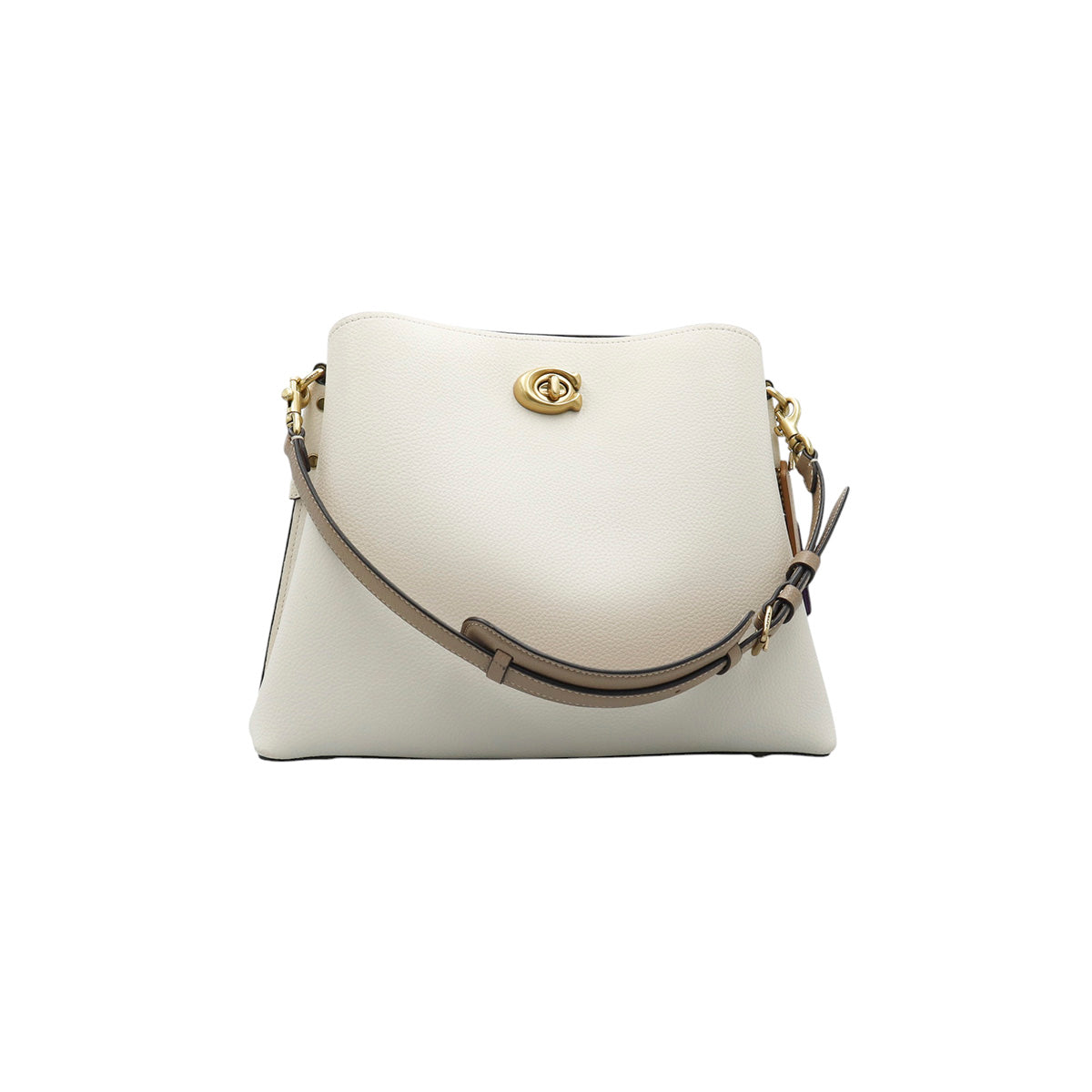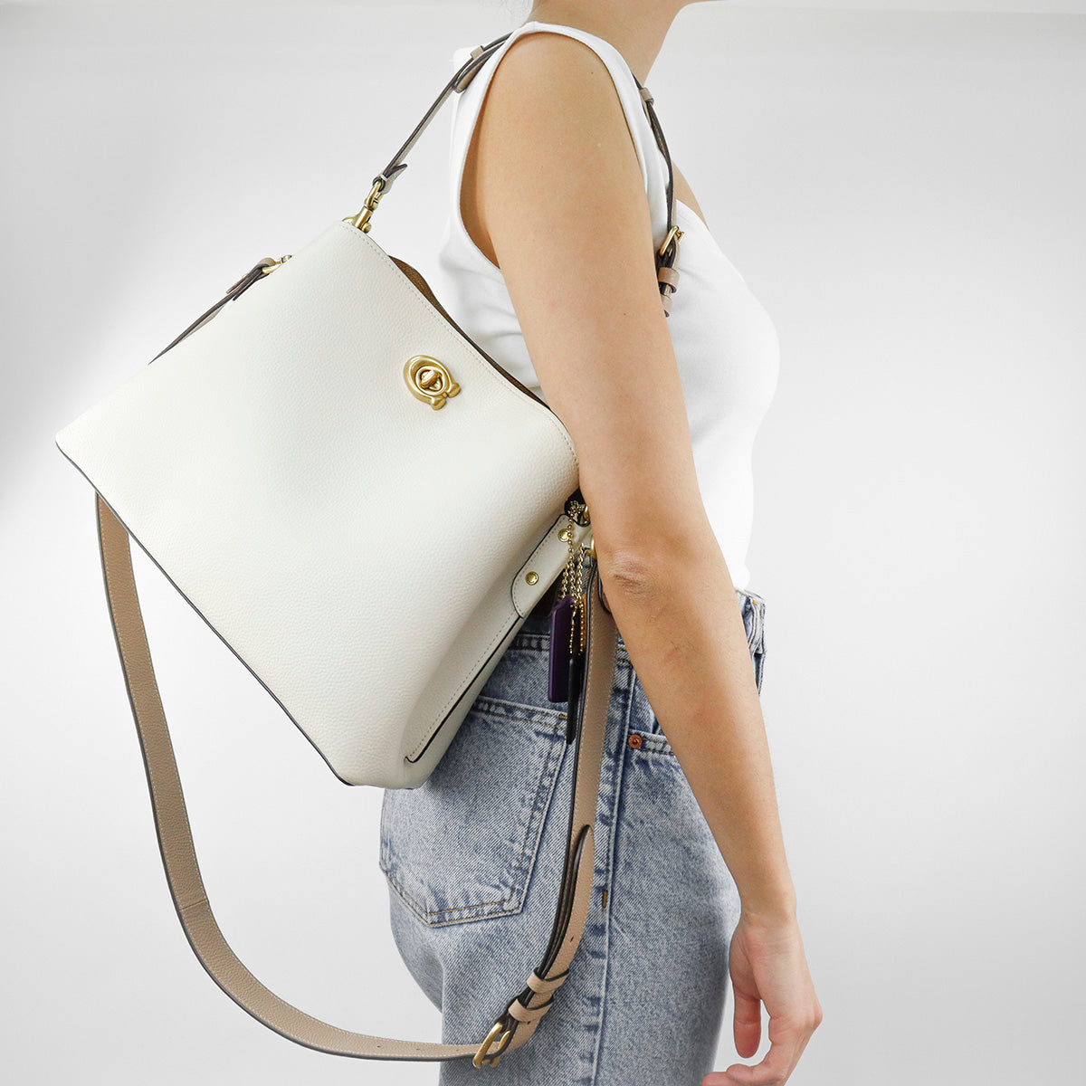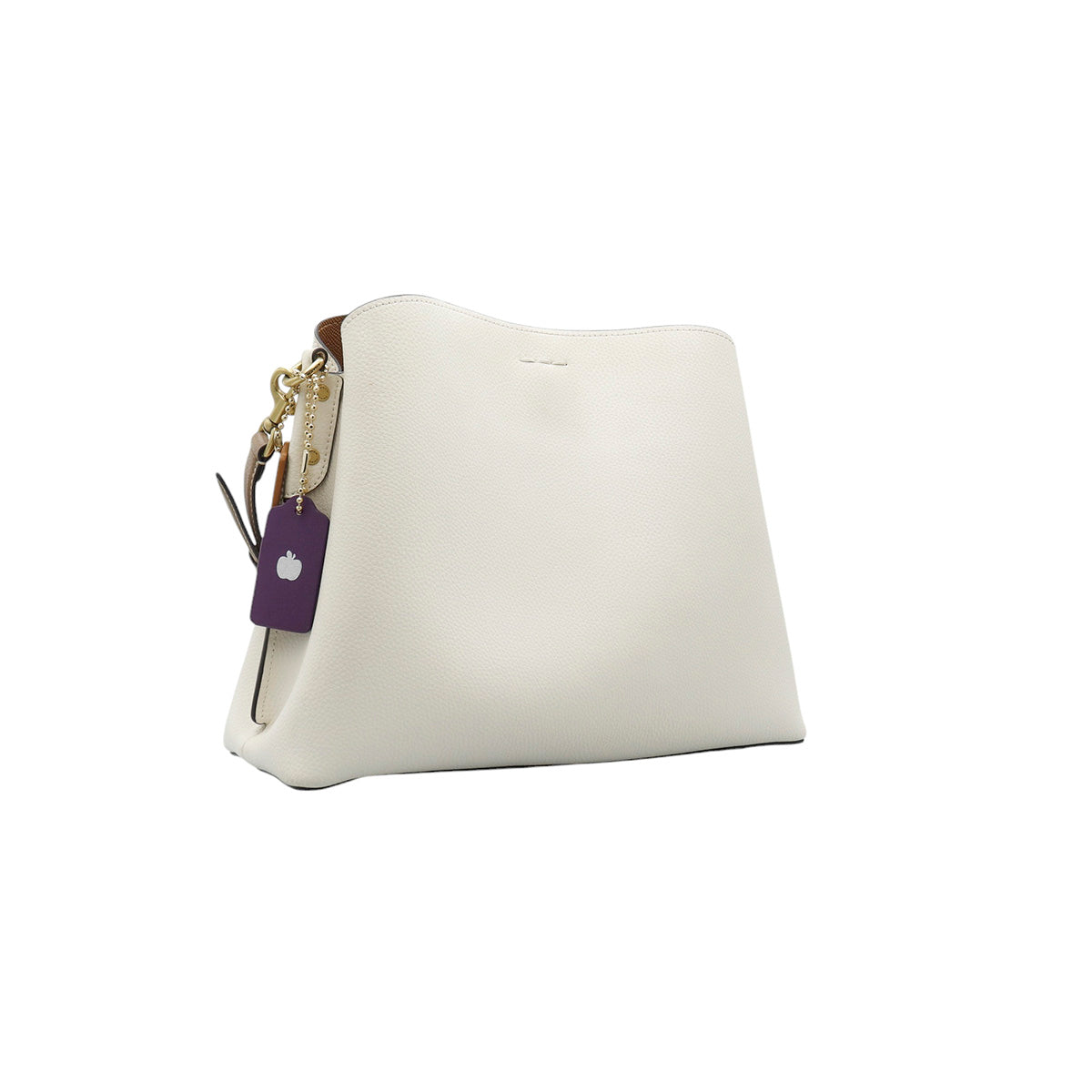 Bolso Coach de la línea Willow Colorblock, confeccionado en piel color blanco marfil, con asa y correa desmontables, bolsillo interno con cierre de cremallera y cierre magnético, en buen estado, algunas manchas leves en superficie, con 3 charms (etiquetas)de piel.