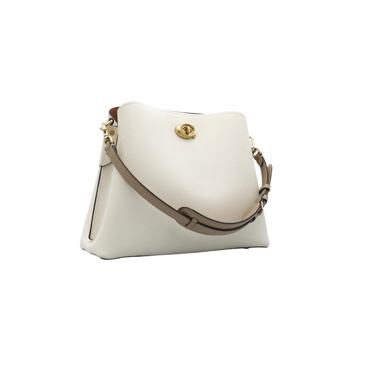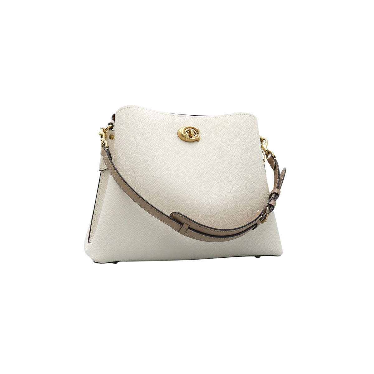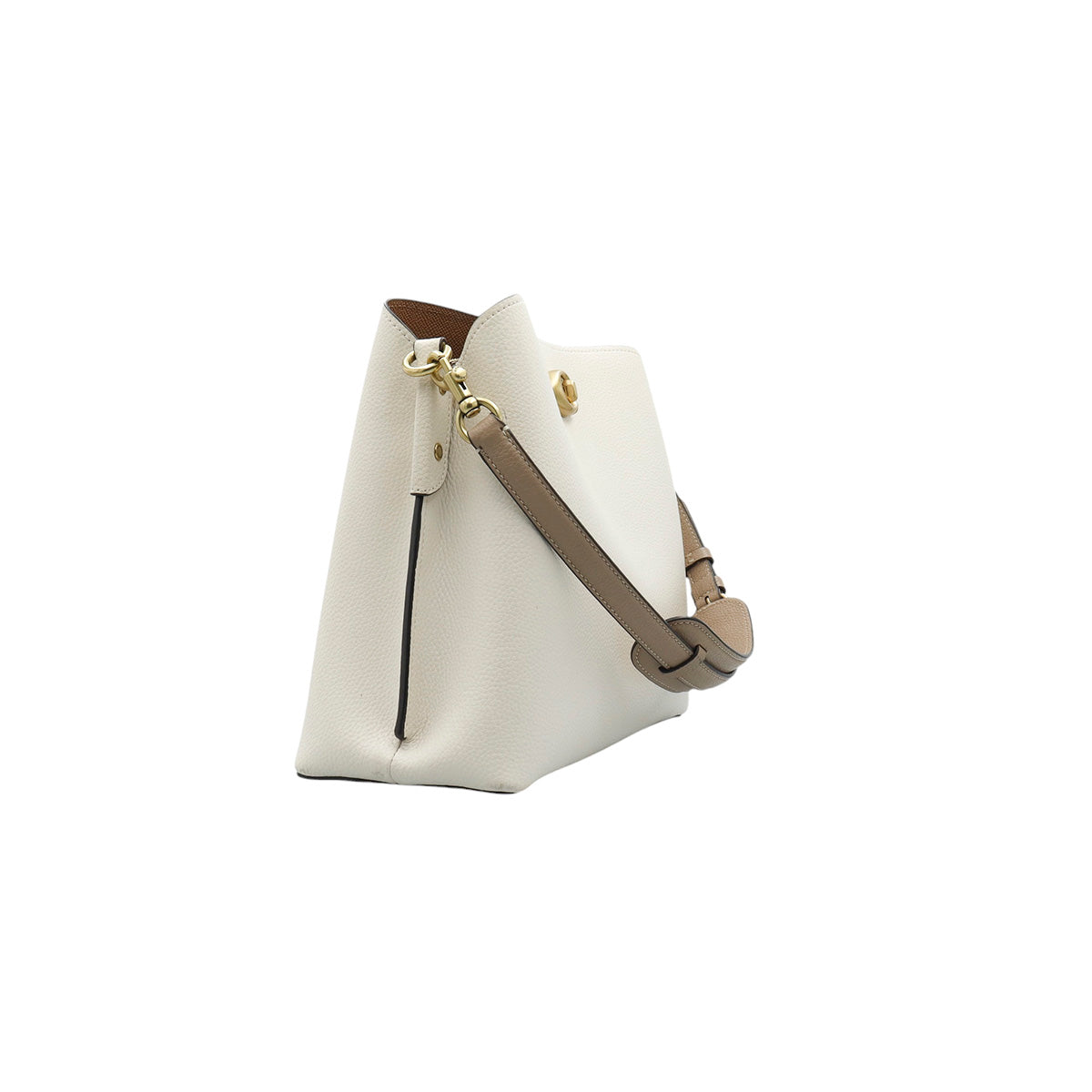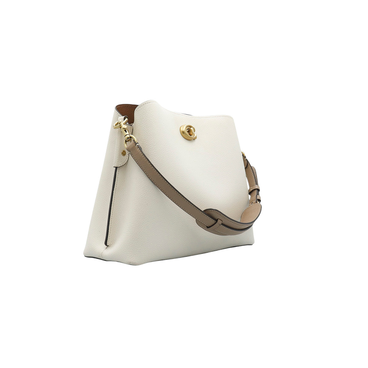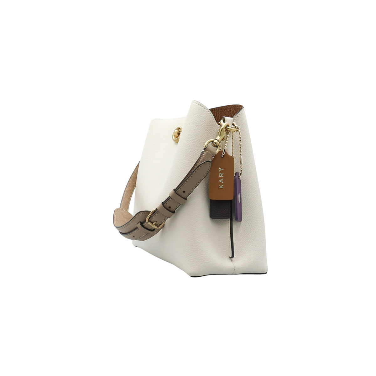 Bolso Coach de la línea Willow Colorblock, confeccionado en piel color blanco marfil, con asa y correa desmontables, bolsillo interno con cierre de cremallera y cierre magnético, en buen estado, algunas manchas leves en superficie, con 3 charms (etiquetas)de piel.