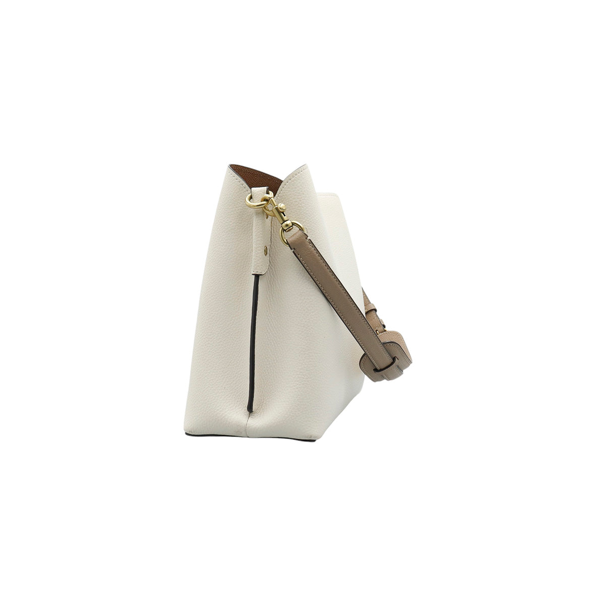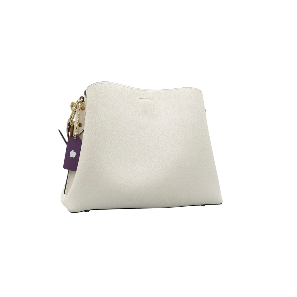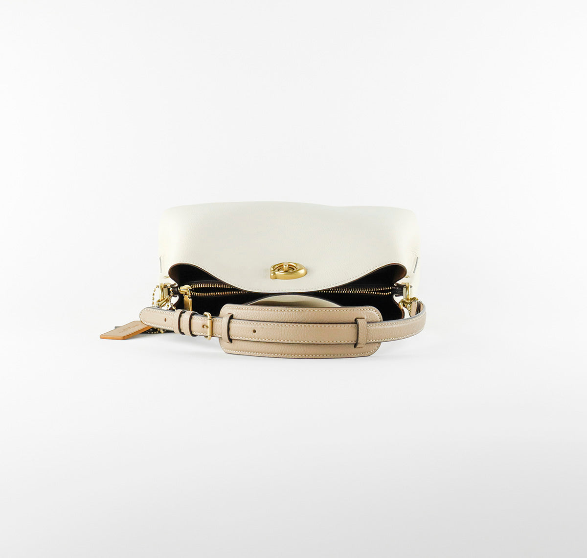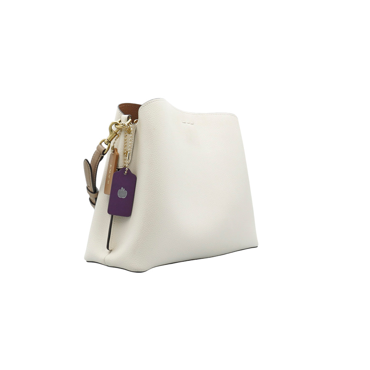 Bolso Coach de la línea Willow Colorblock, confeccionado en piel color blanco marfil, con asa y correa desmontables, bolsillo interno con cierre de cremallera y cierre magnético, en buen estado, algunas manchas leves en superficie, con 3 charms (etiquetas)de piel.