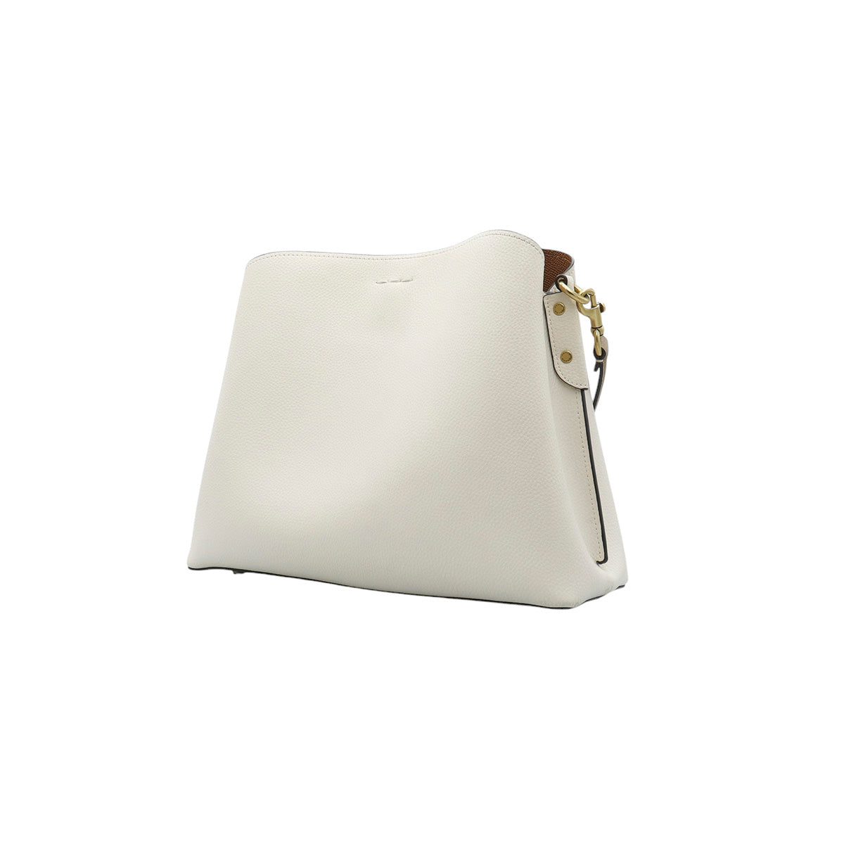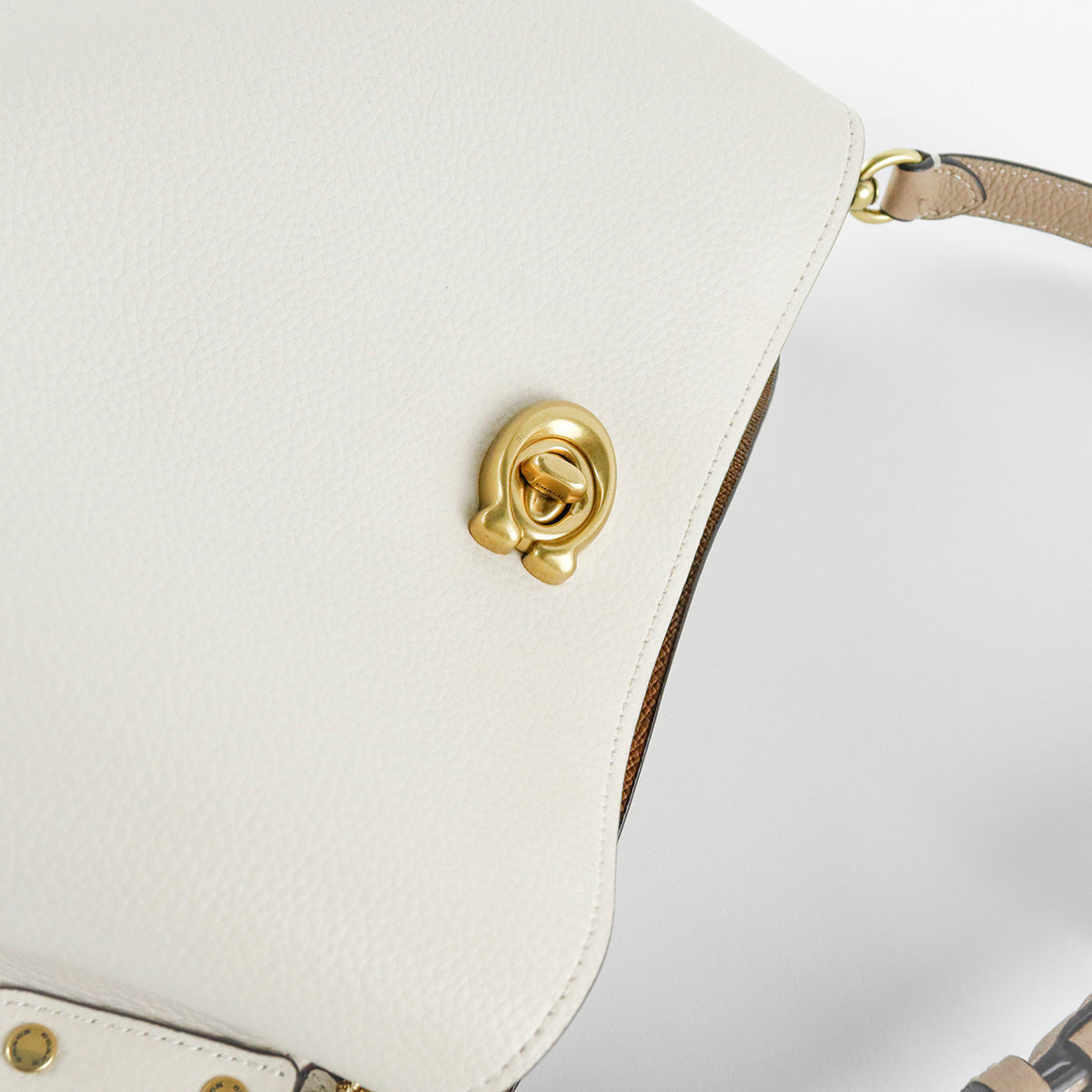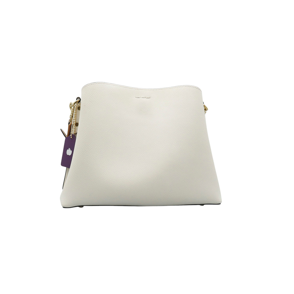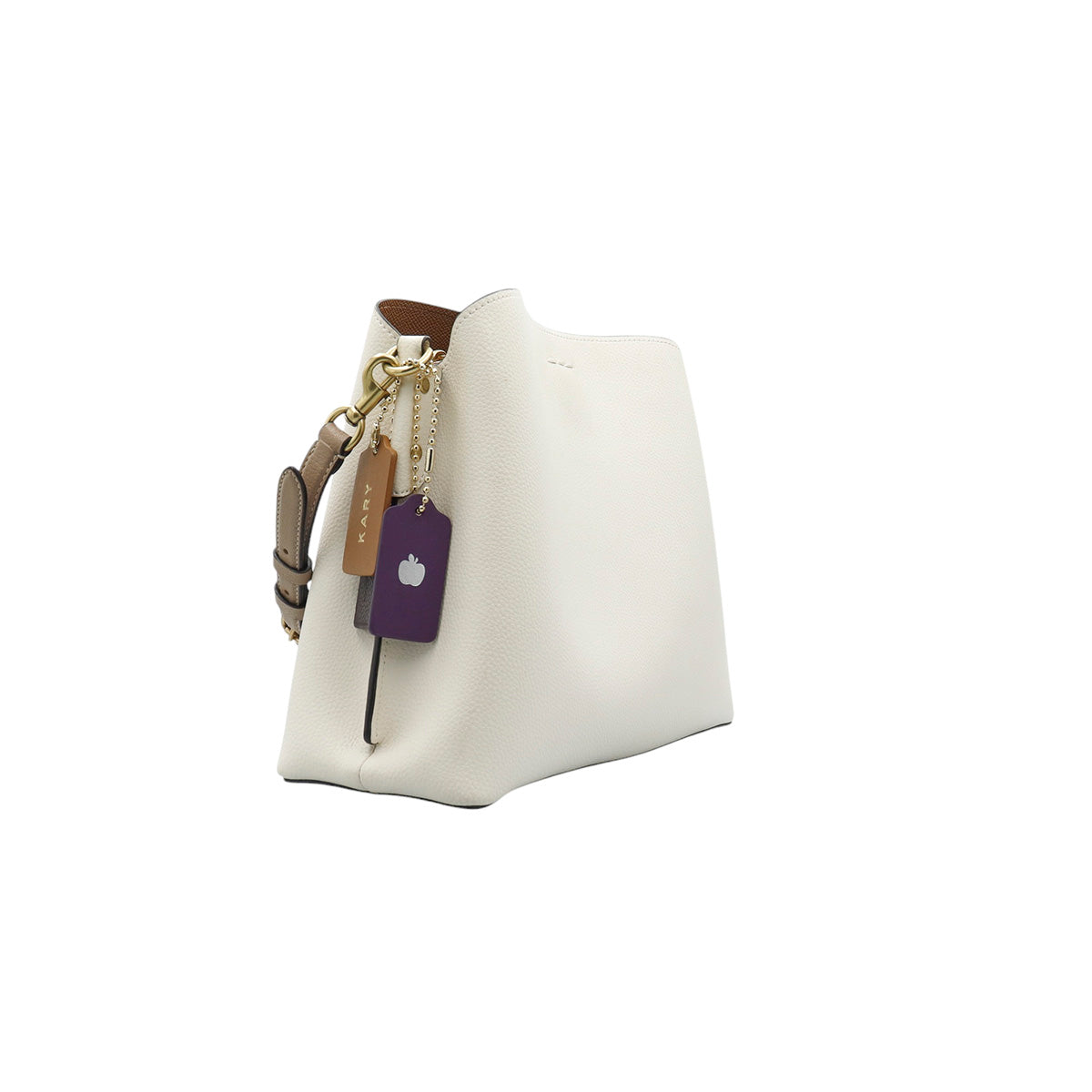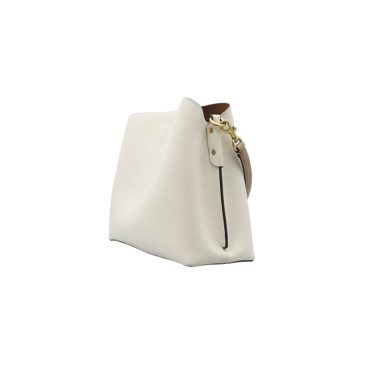 Bolso Coach de la línea Willow Colorblock, confeccionado en piel color blanco marfil, con asa y correa desmontables, bolsillo interno con cierre de cremallera y cierre magnético, en buen estado, algunas manchas leves en superficie, con 3 charms (etiquetas)de piel.