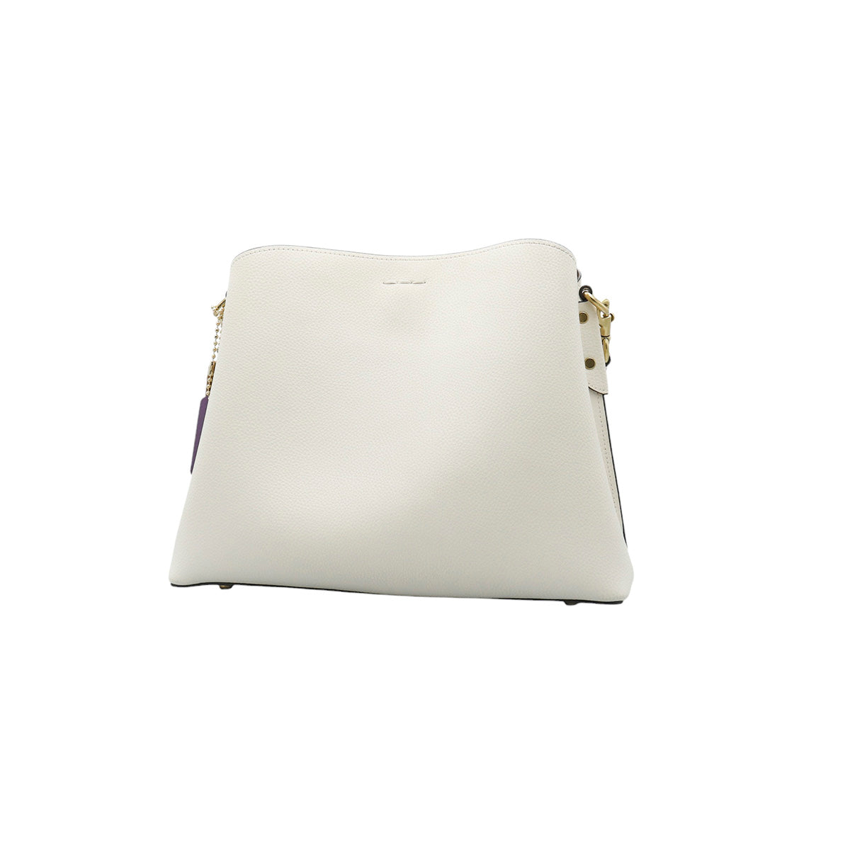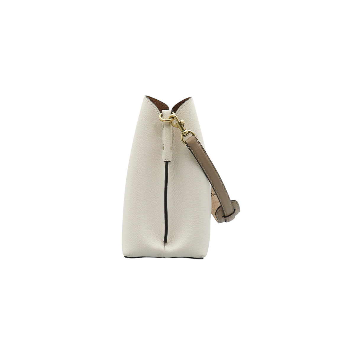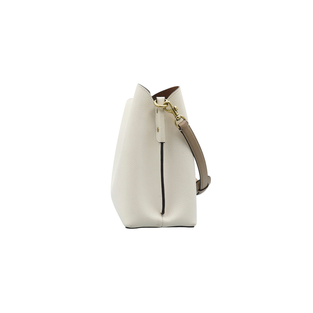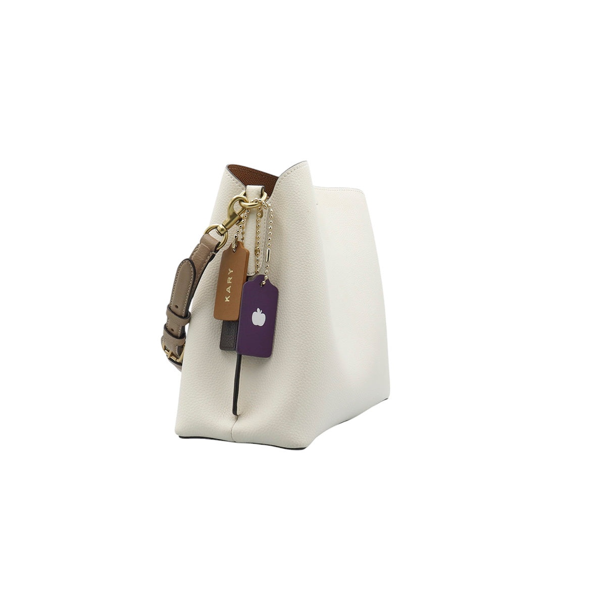 Bolso Coach de la línea Willow Colorblock, confeccionado en piel color blanco marfil, con asa y correa desmontables, bolsillo interno con cierre de cremallera y cierre magnético, en buen estado, algunas manchas leves en superficie, con 3 charms (etiquetas)de piel.