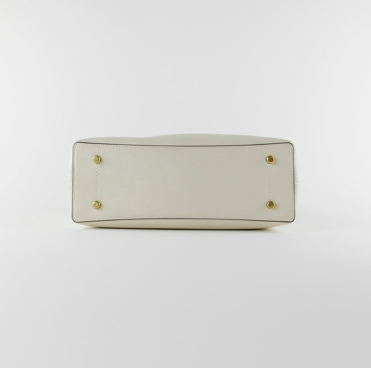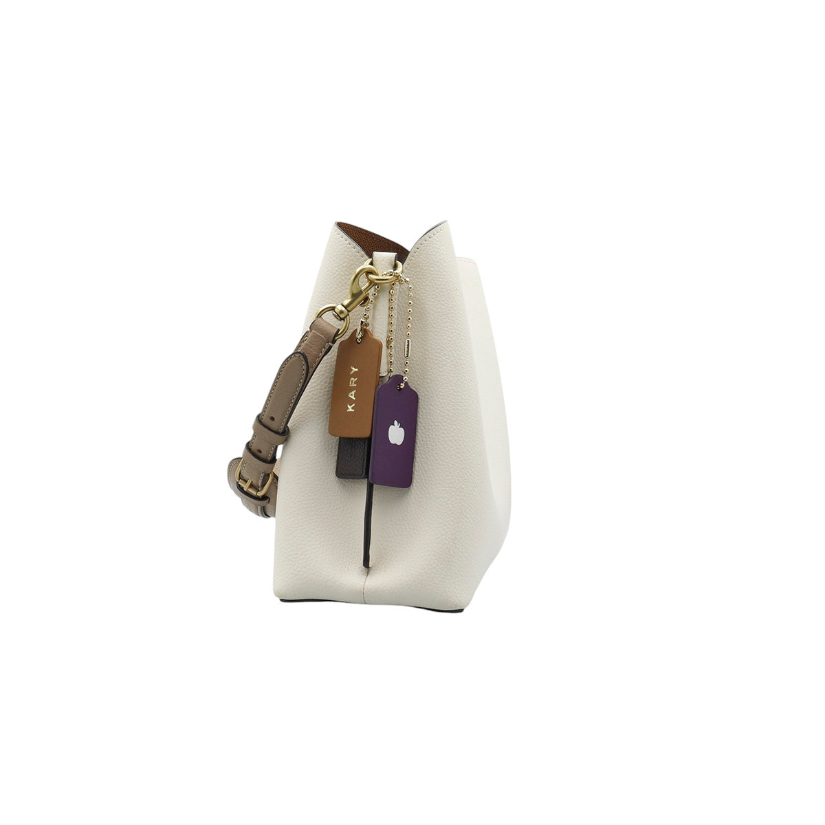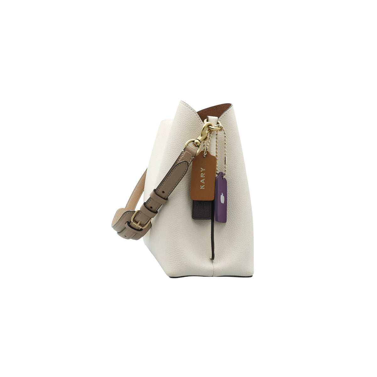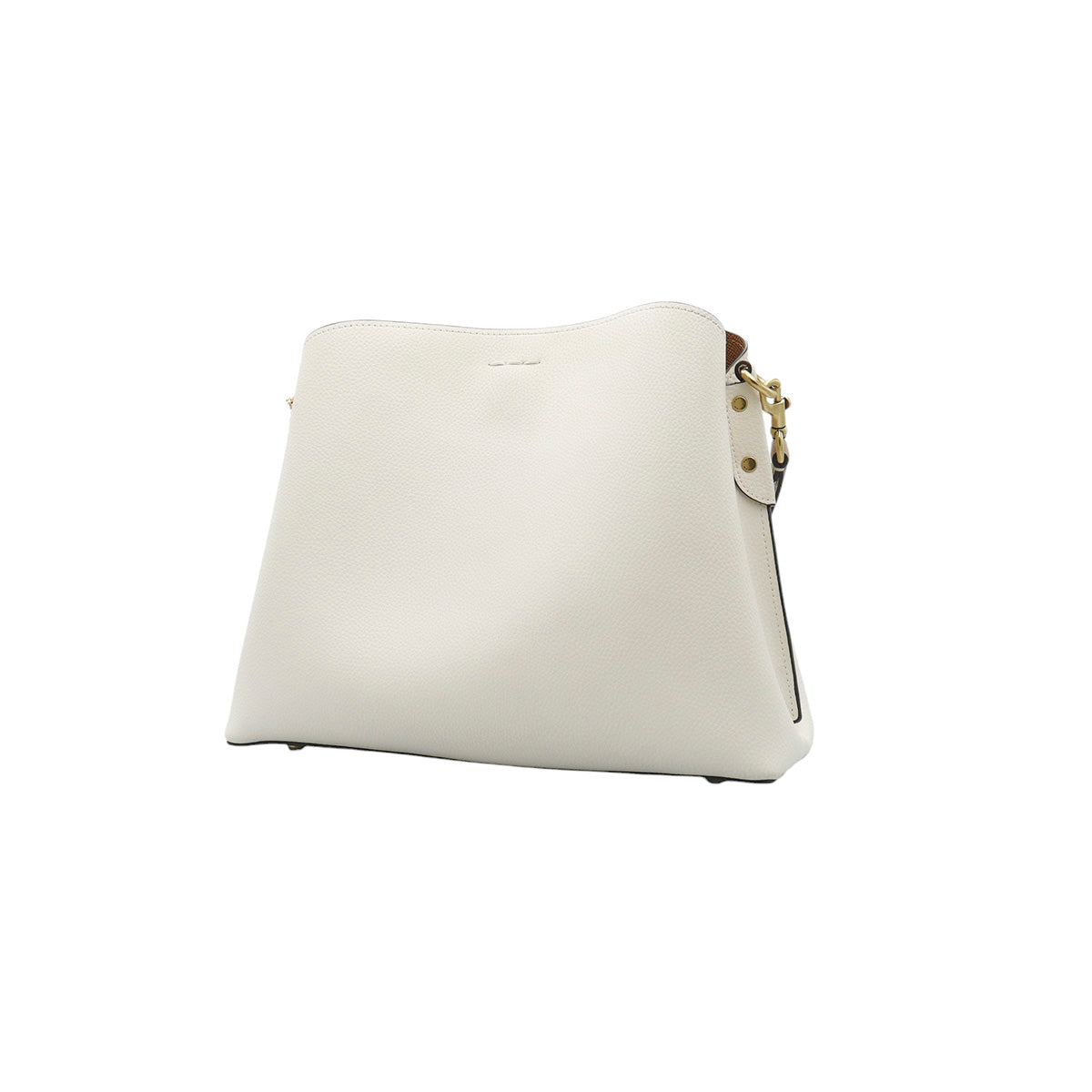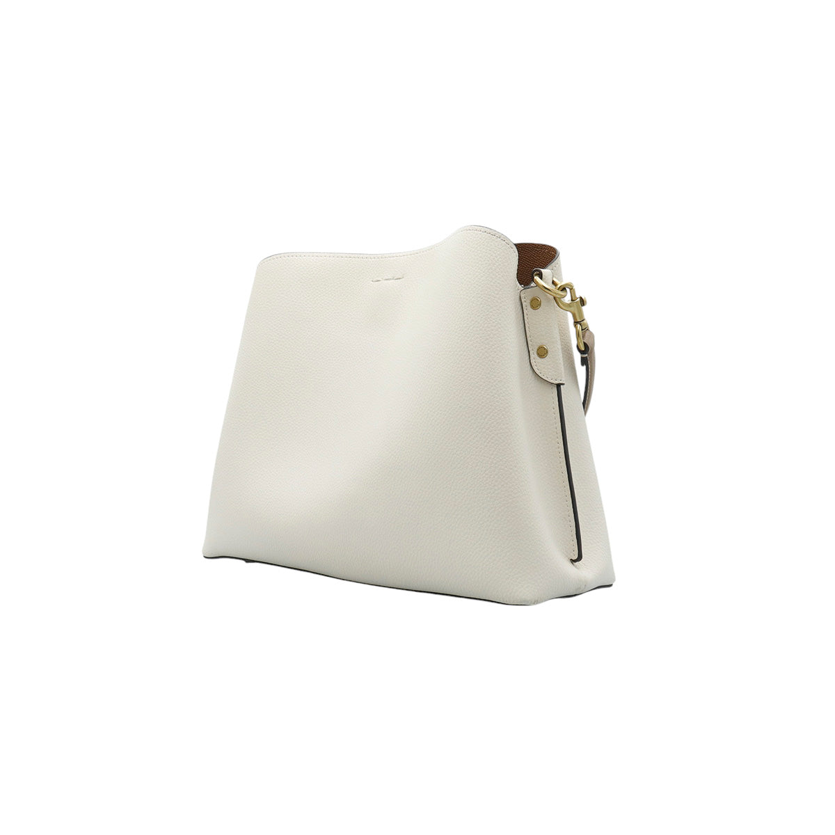 Bolso Coach de la línea Willow Colorblock, confeccionado en piel color blanco marfil, con asa y correa desmontables, bolsillo interno con cierre de cremallera y cierre magnético, en buen estado, algunas manchas leves en superficie, con 3 charms (etiquetas)de piel.