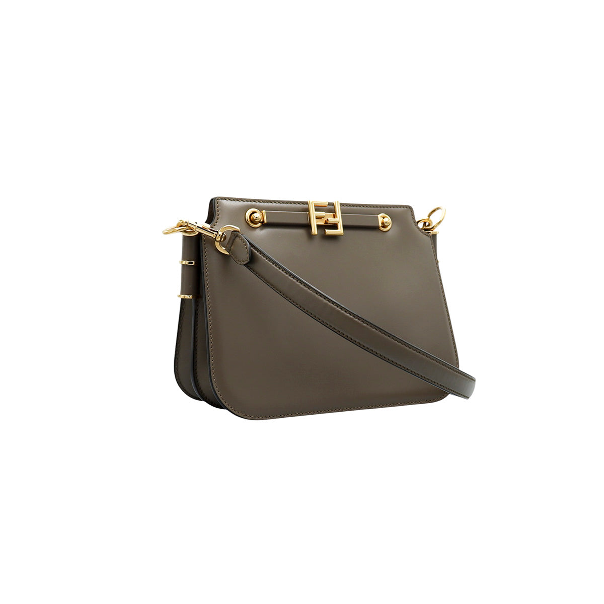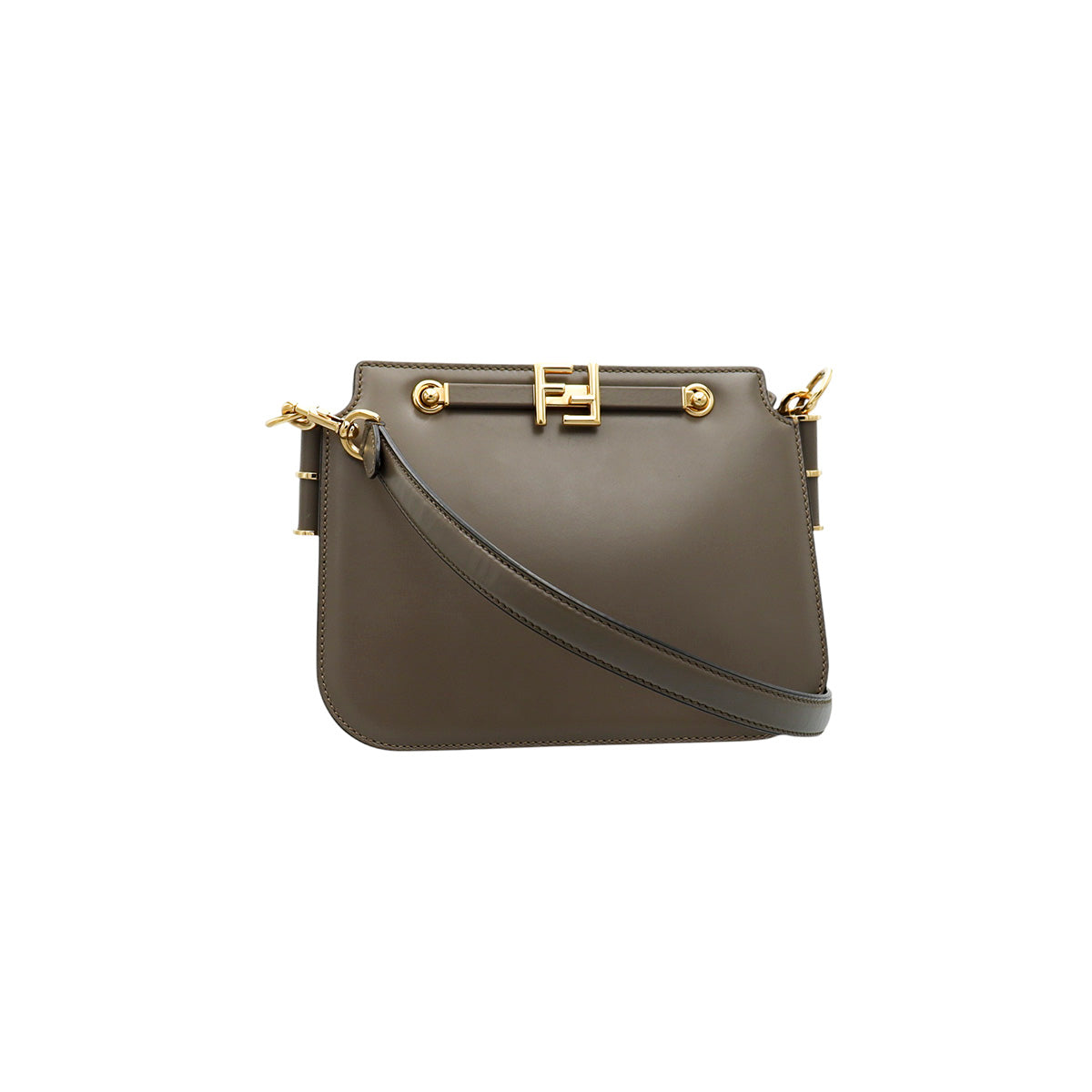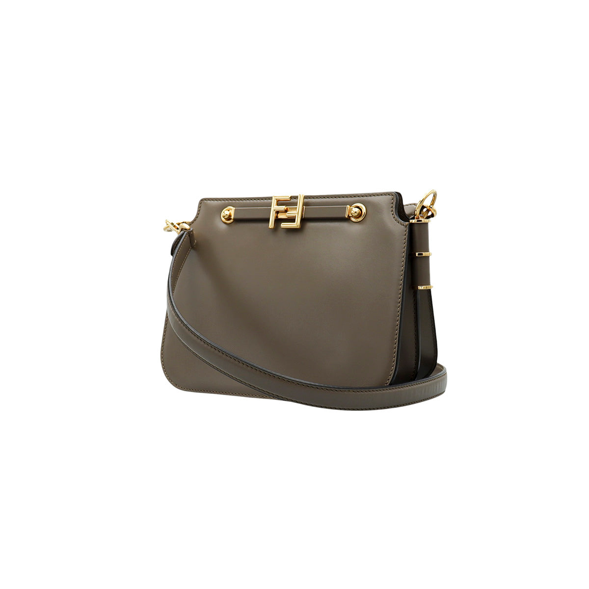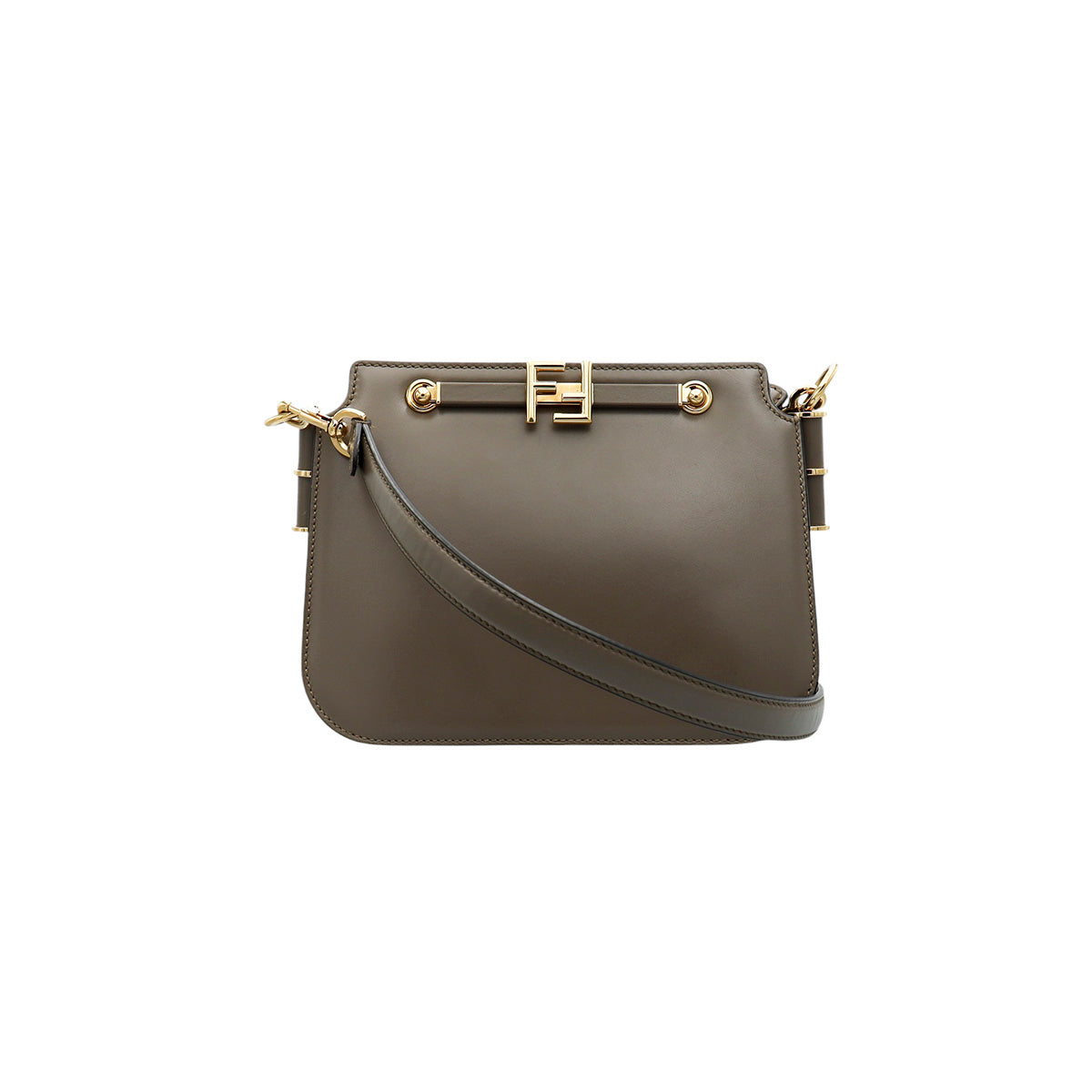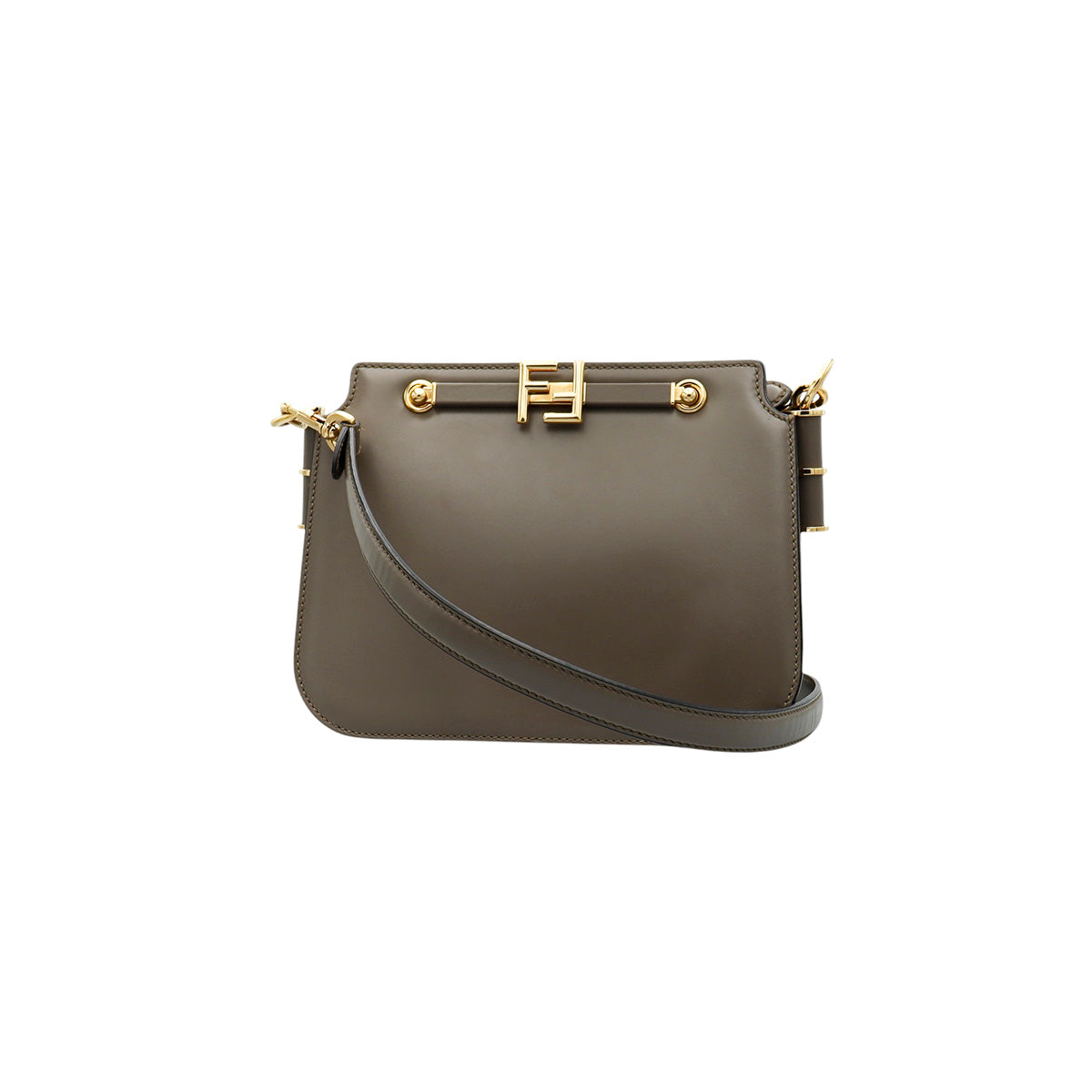Bolso Fendi de la línea Touch, confeccionado en piel color arena con bandolera extraíble, superficie con detalles de uso, interior en cuero crudo y herrajes en color dorado.