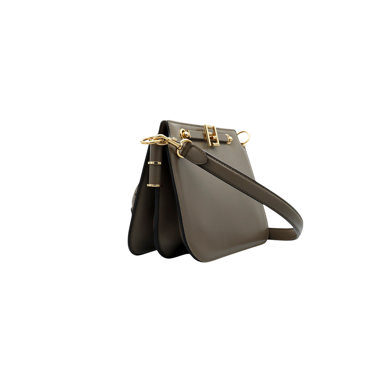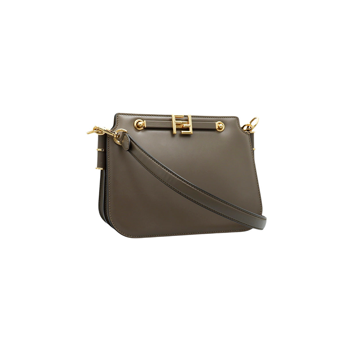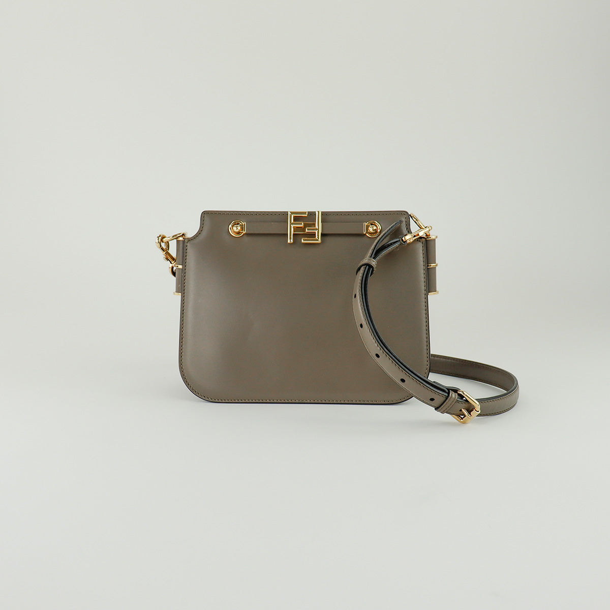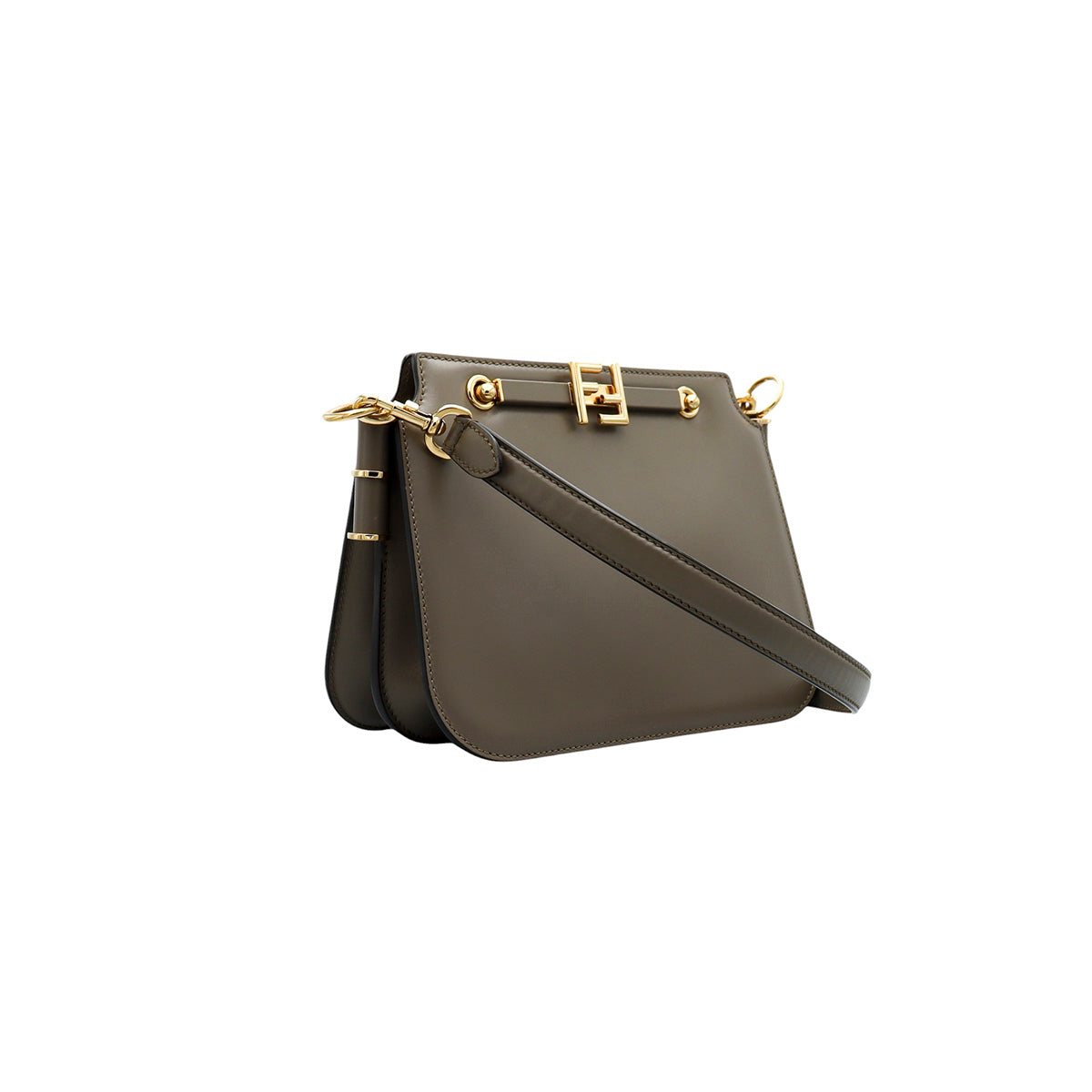 Bolso Fendi de la línea Touch, confeccionado en piel color arena con bandolera extraíble, superficie con detalles de uso, interior en cuero crudo y herrajes en color dorado.