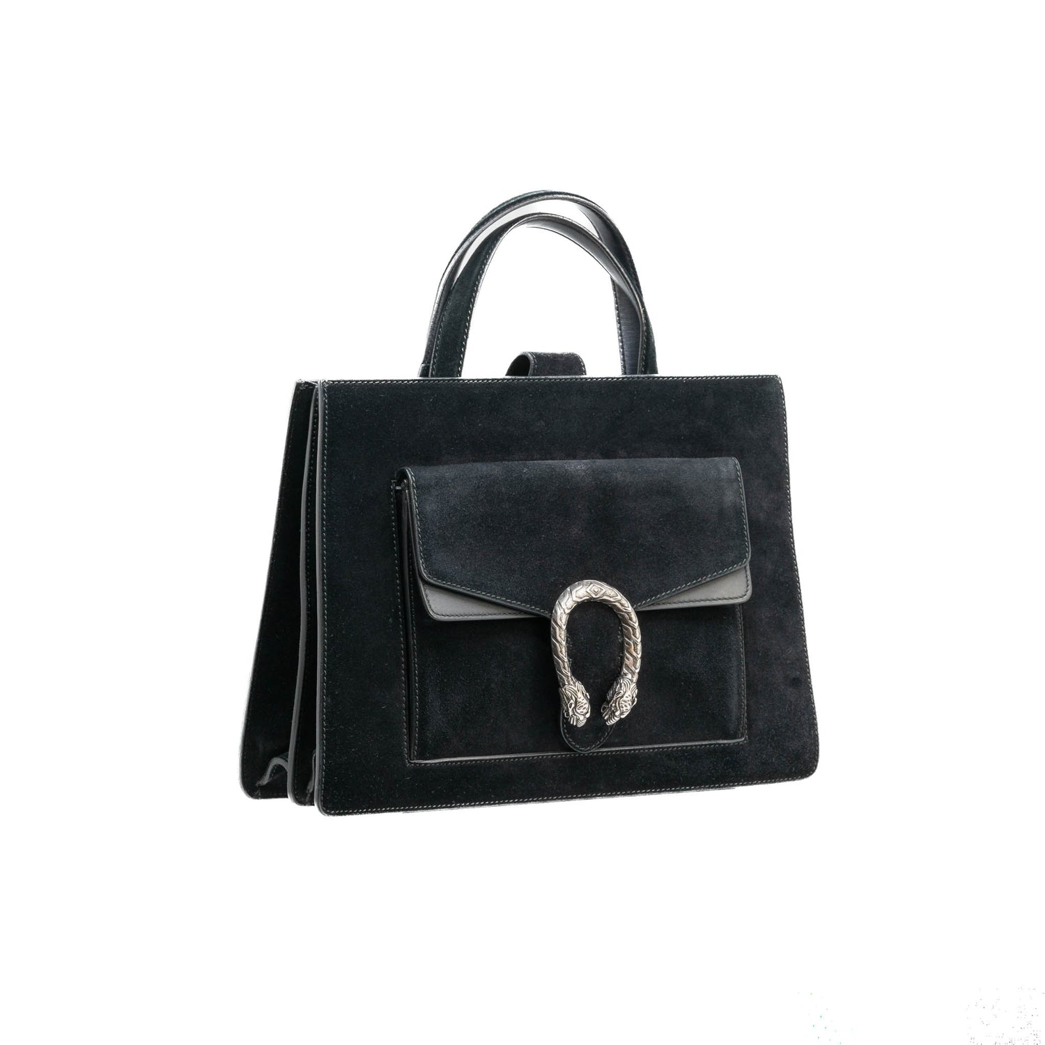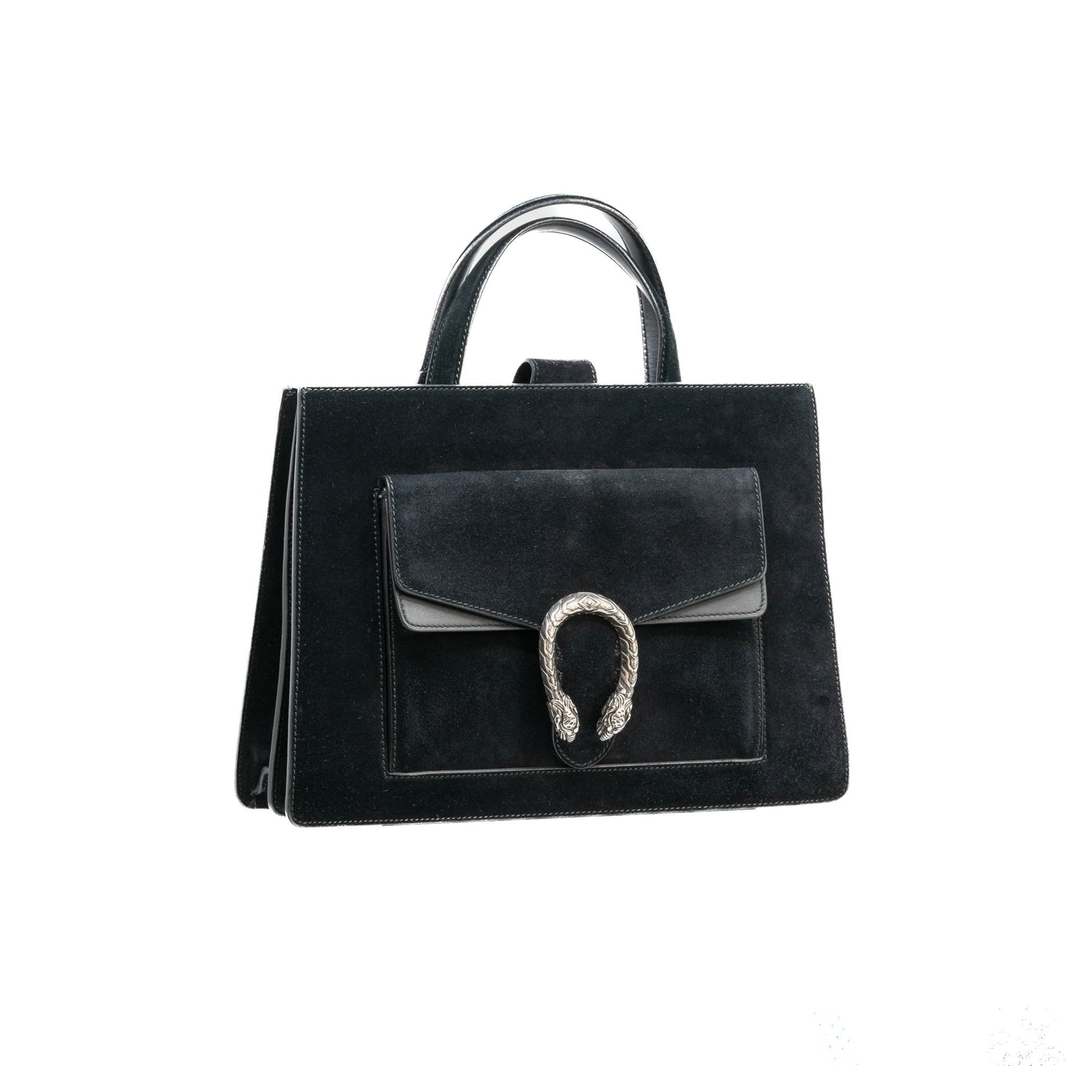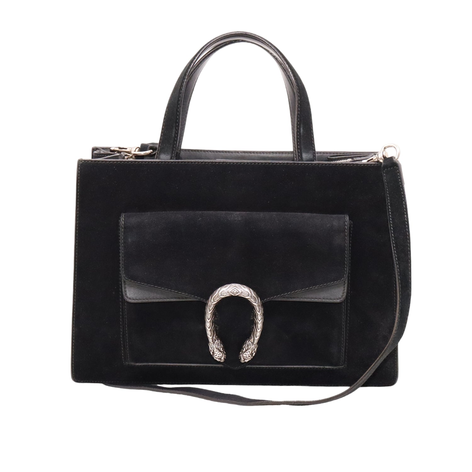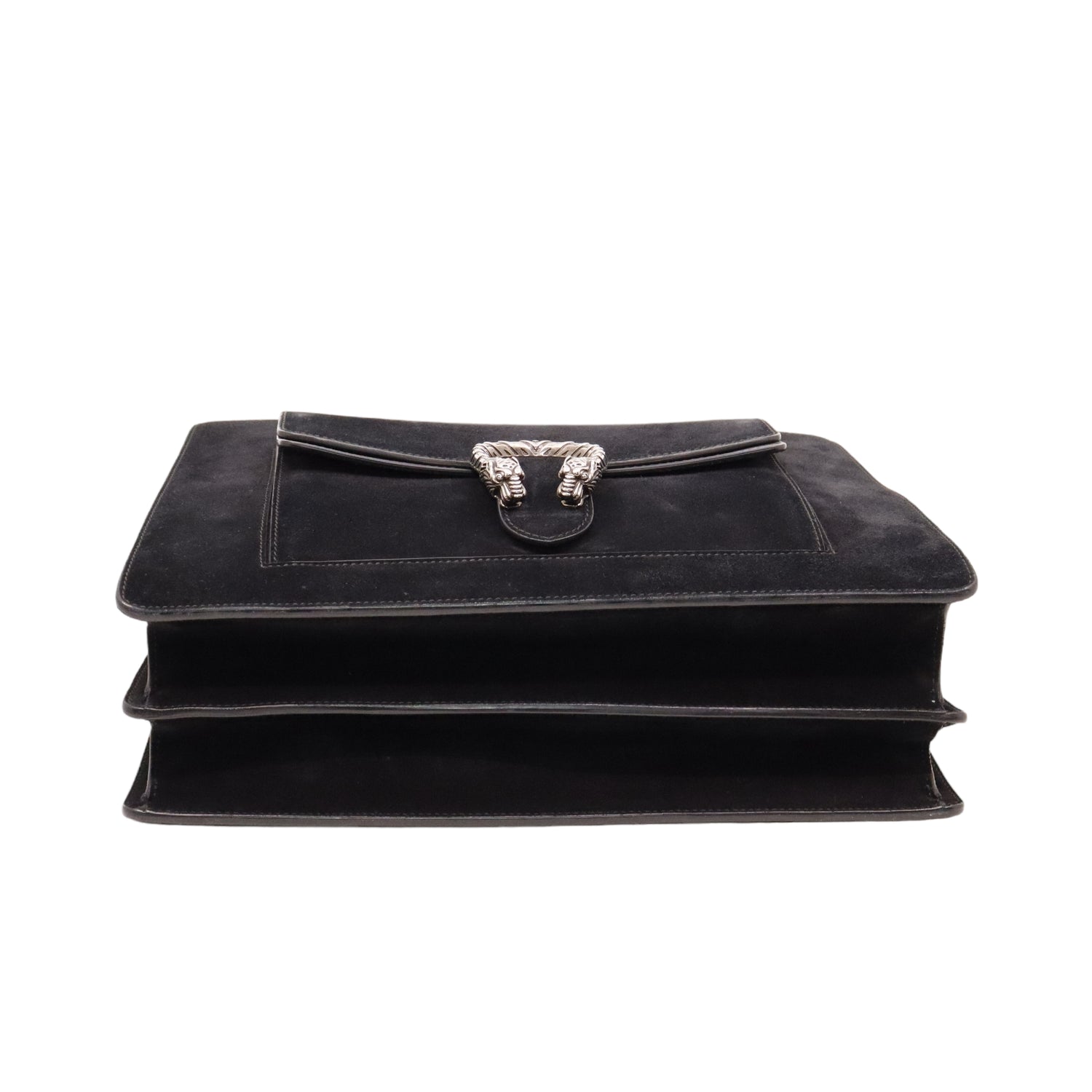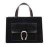 Bolso Gucci modelo Dionysus confeccionado en ante negro con forros interiores en piel de becerro del mismo color, asas planas y bandolera en mismo material, con 3 secciones interiores, con solapa y bolsillos exteriores dobles, con la característica espuela con cabezas de tigre en el broche, con leve desgaste por uso. Buen estado, no cuenta con Dustbag.