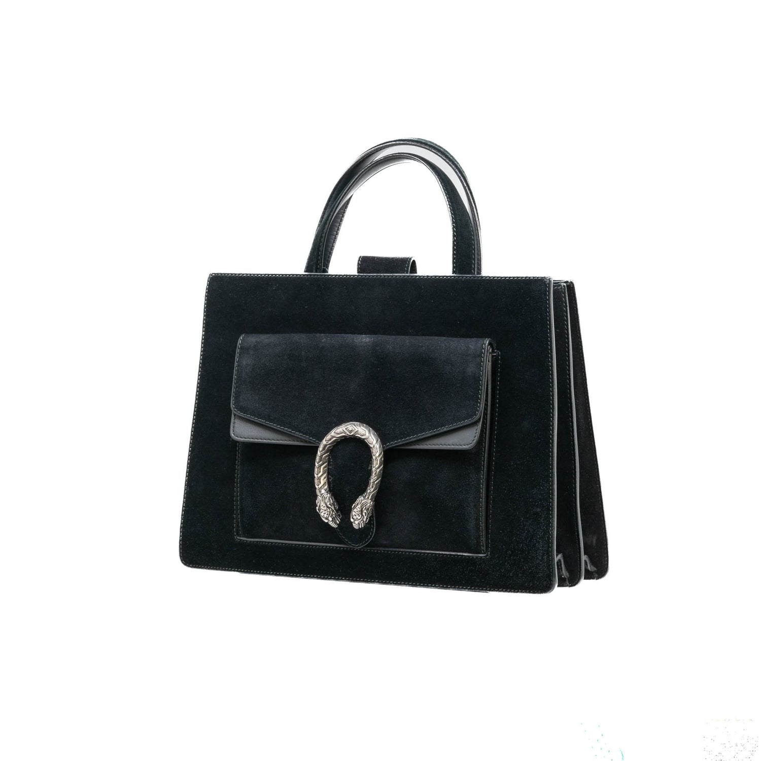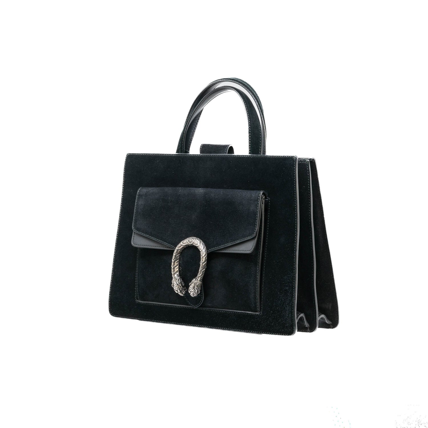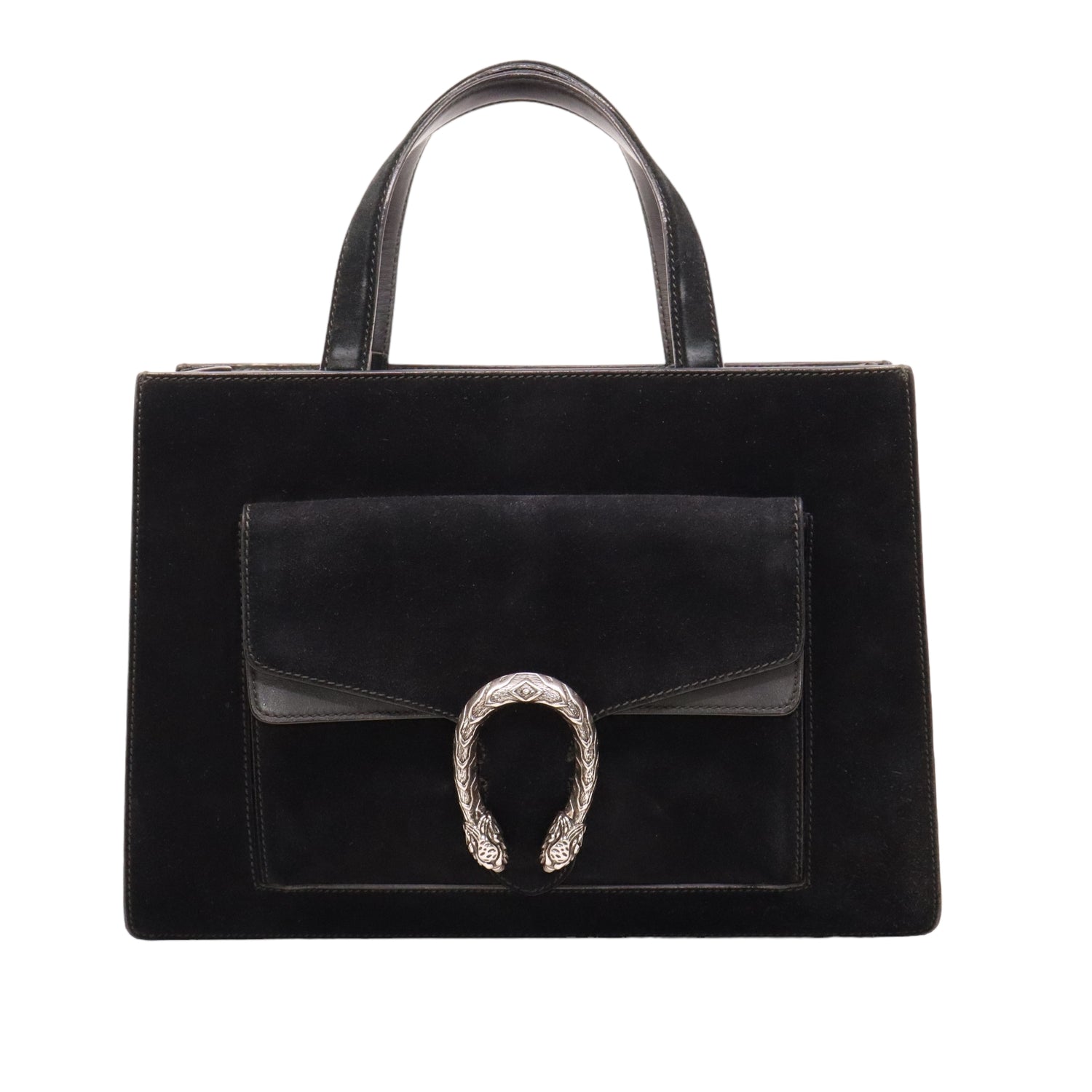 Bolso Gucci modelo Dionysus confeccionado en ante negro con forros interiores en piel de becerro del mismo color, asas planas y bandolera en mismo material, con 3 secciones interiores, con solapa y bolsillos exteriores dobles, con la característica espuela con cabezas de tigre en el broche, con leve desgaste por uso. Buen estado, no cuenta con Dustbag.