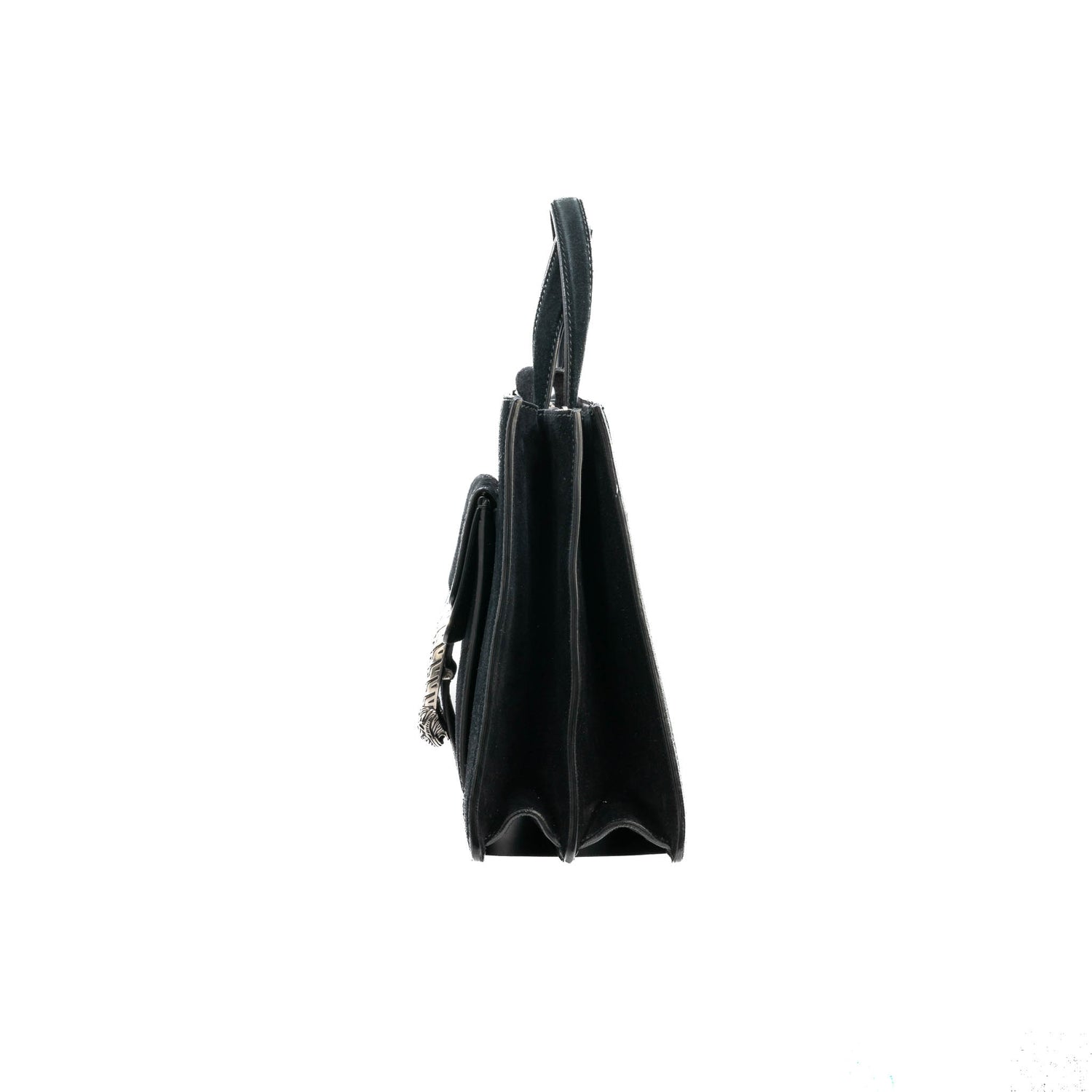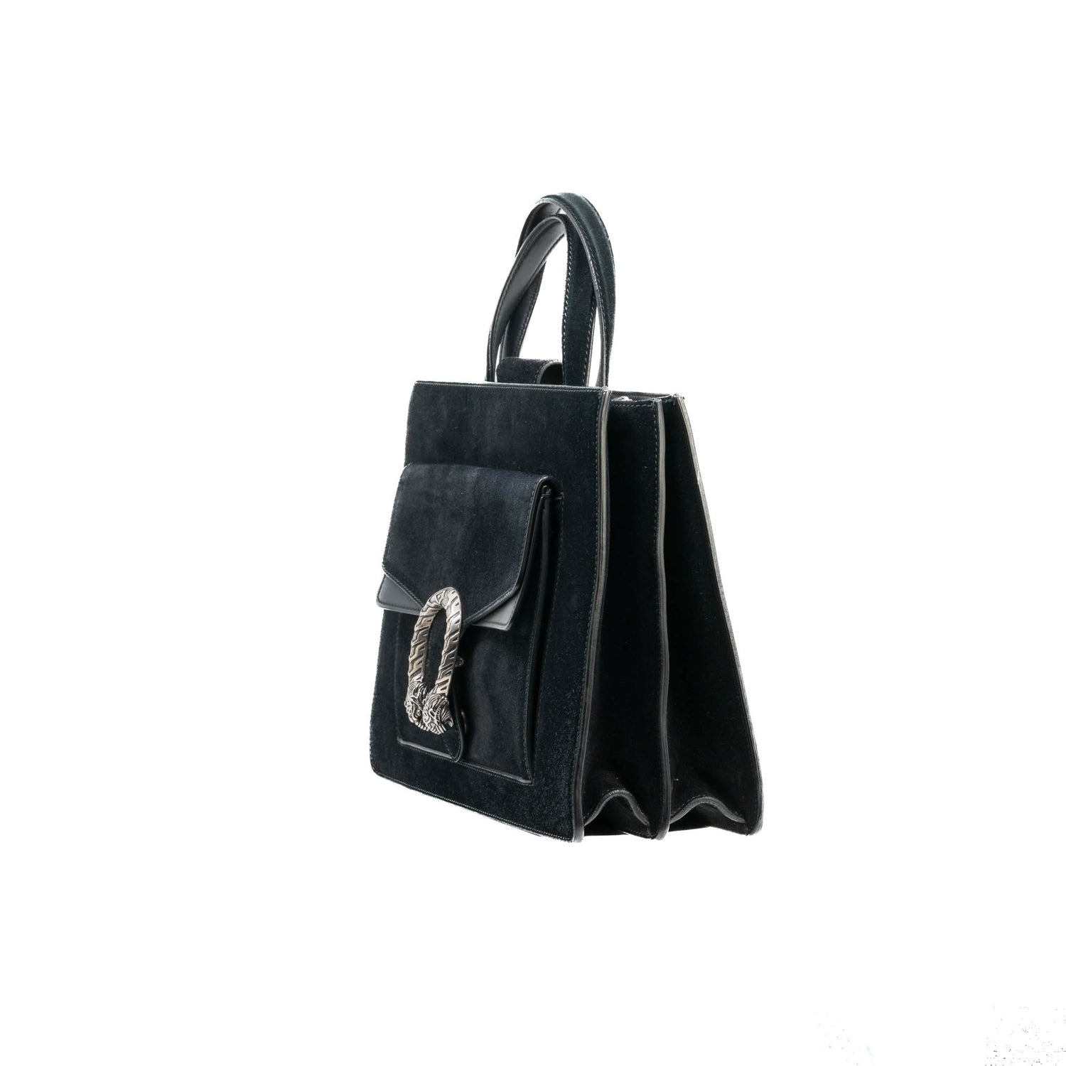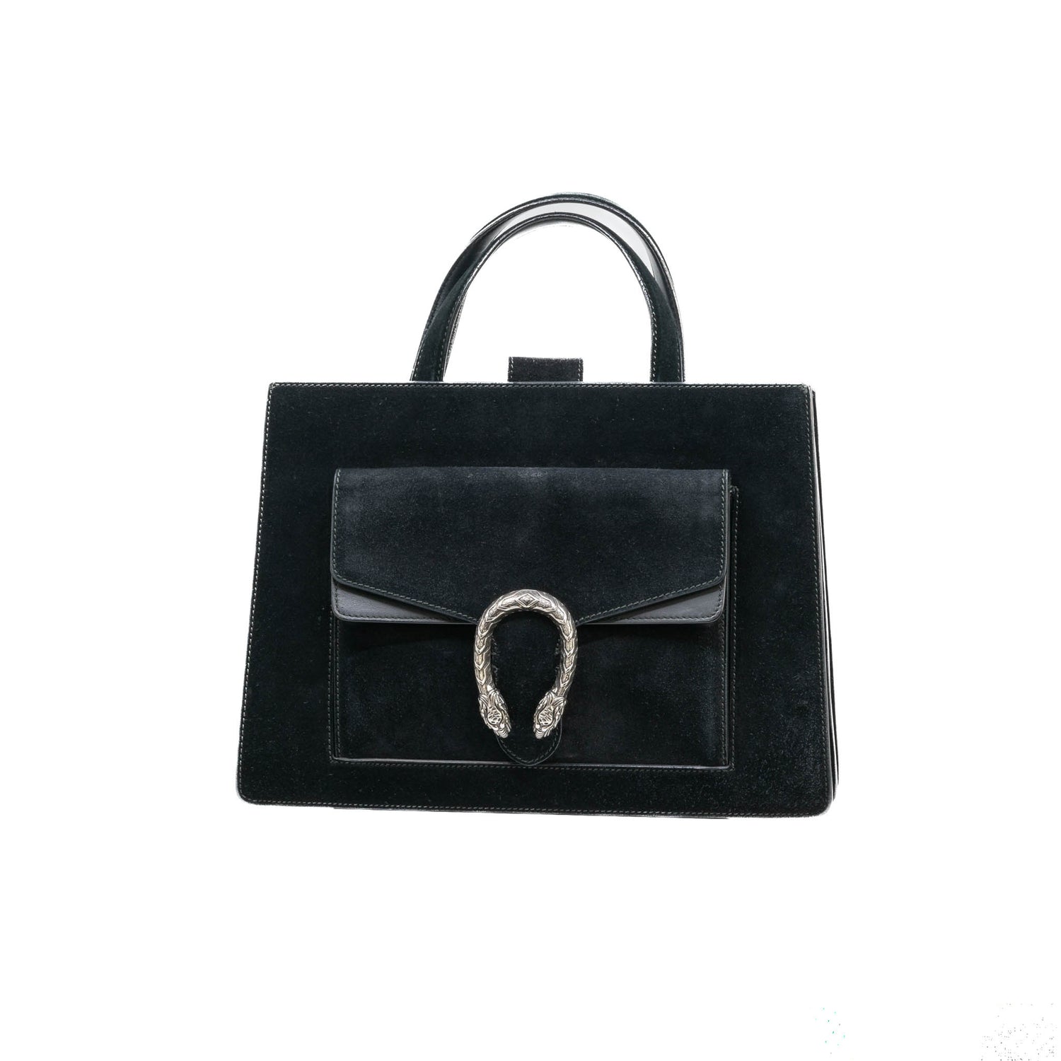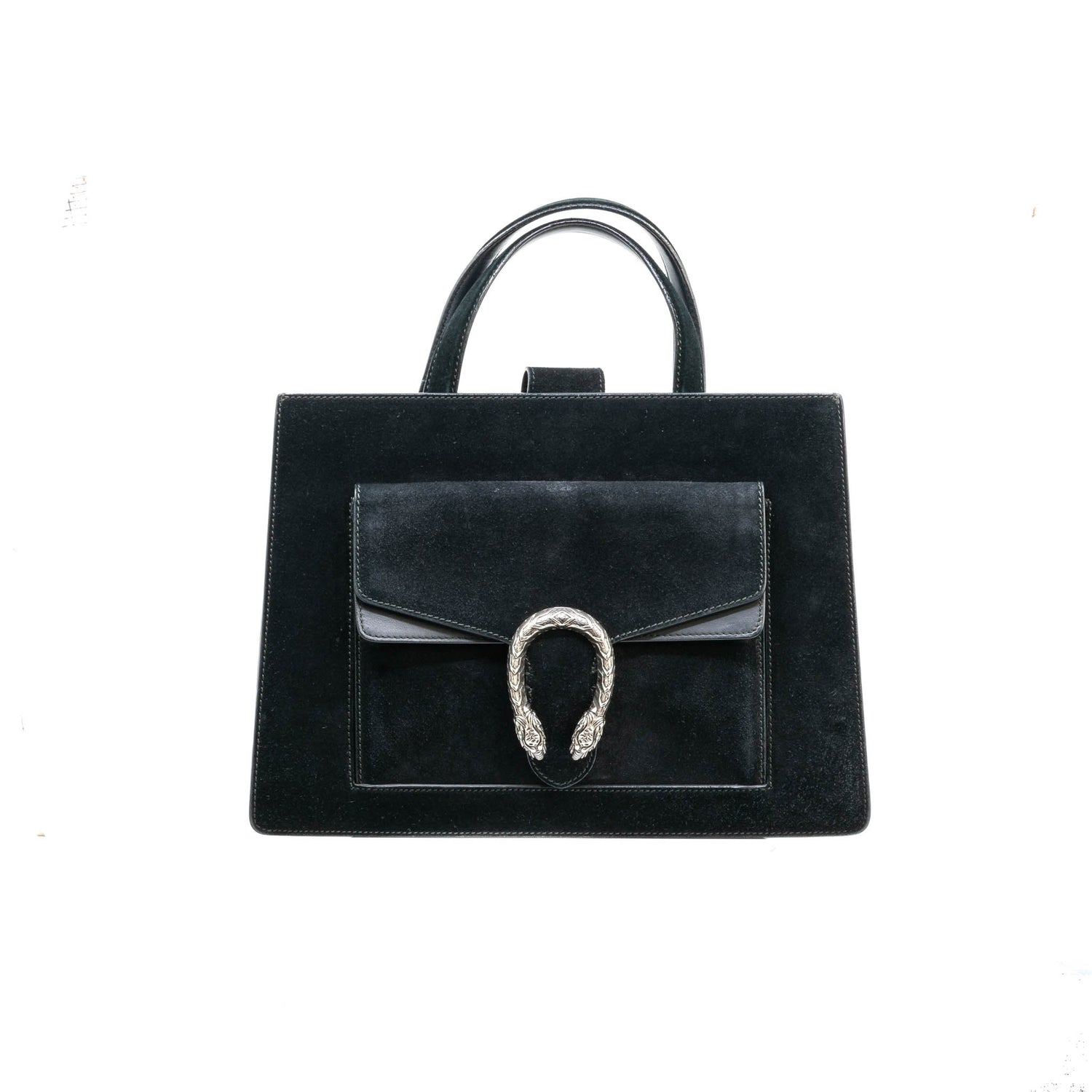 Bolso Gucci modelo Dionysus confeccionado en ante negro con forros interiores en piel de becerro del mismo color, asas planas y bandolera en mismo material, con 3 secciones interiores, con solapa y bolsillos exteriores dobles, con la característica espuela con cabezas de tigre en el broche, con leve desgaste por uso. Buen estado, no cuenta con Dustbag.