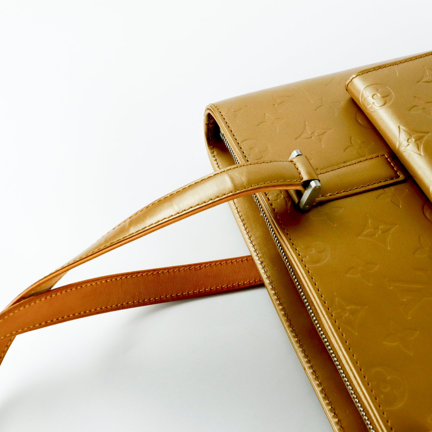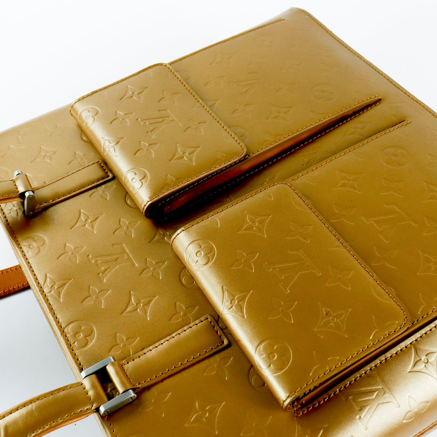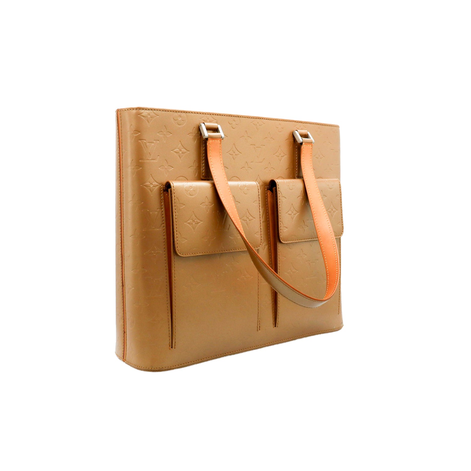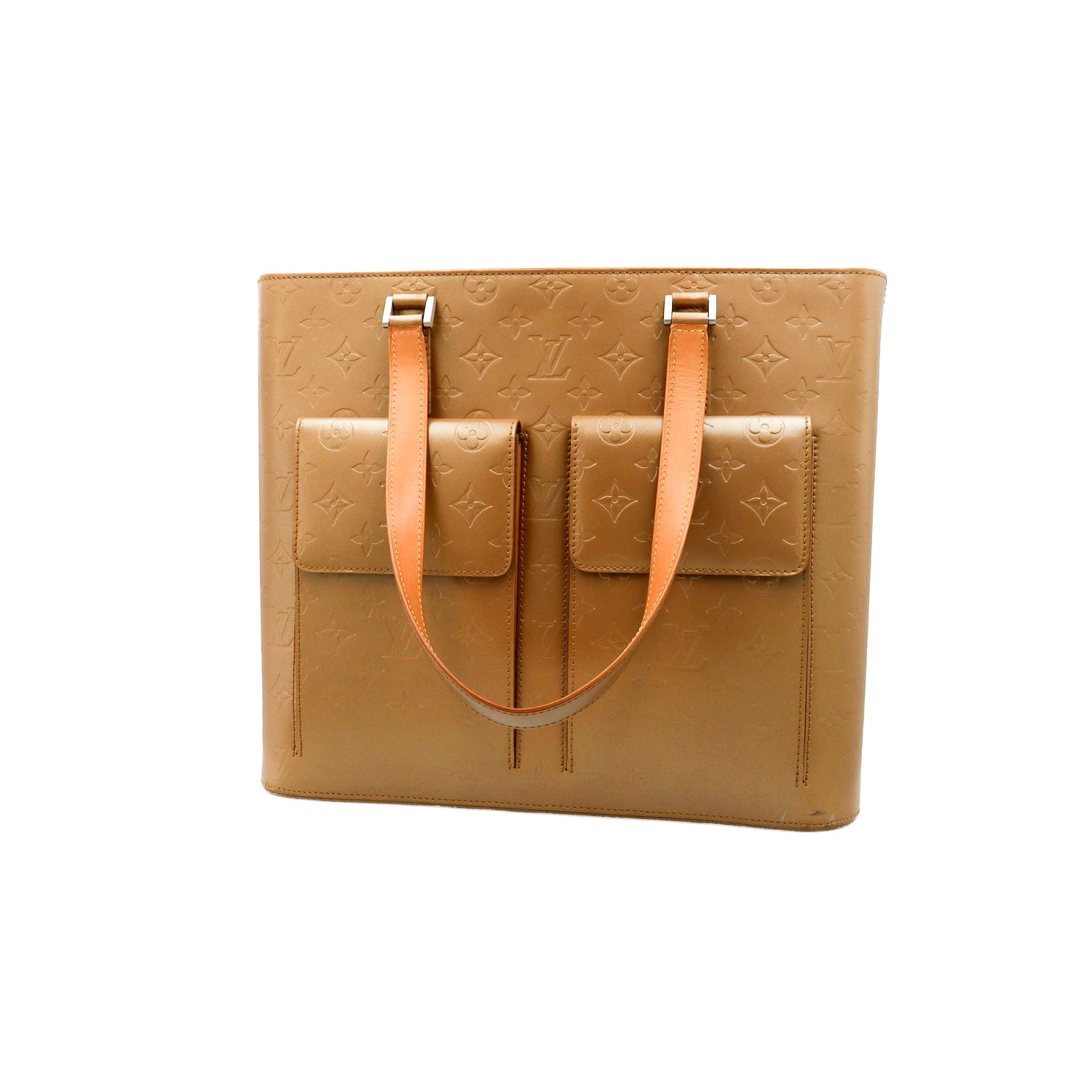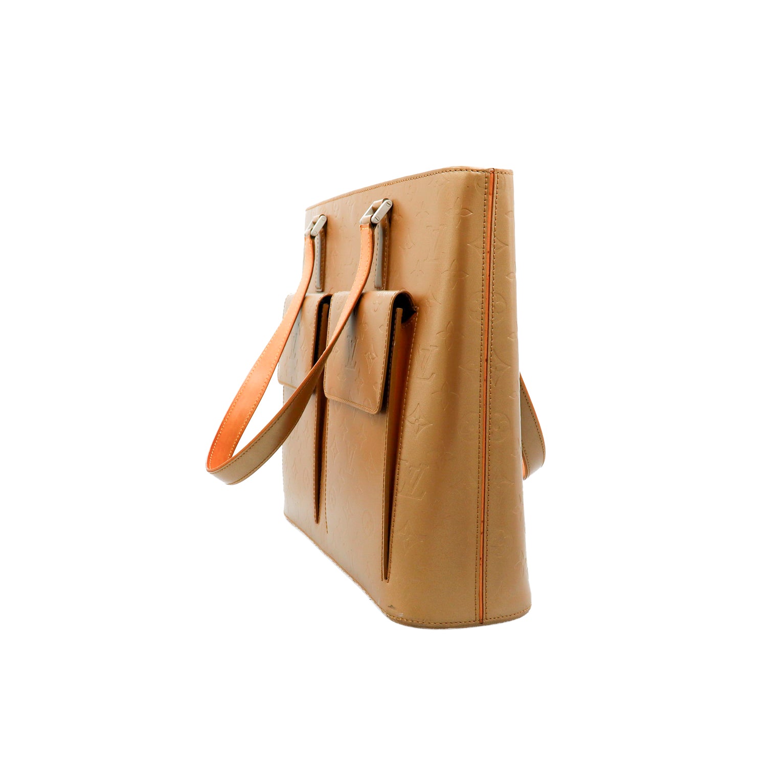 Bolso marca Louis Vuitton de la línea Mat Wilwood en piel vernis color dorado con monograma en acabado mate, forro interno en textil café, cuenta con 2 bolsillos externos con solapa, asas de cuero plana y cierres tipo cremallera.