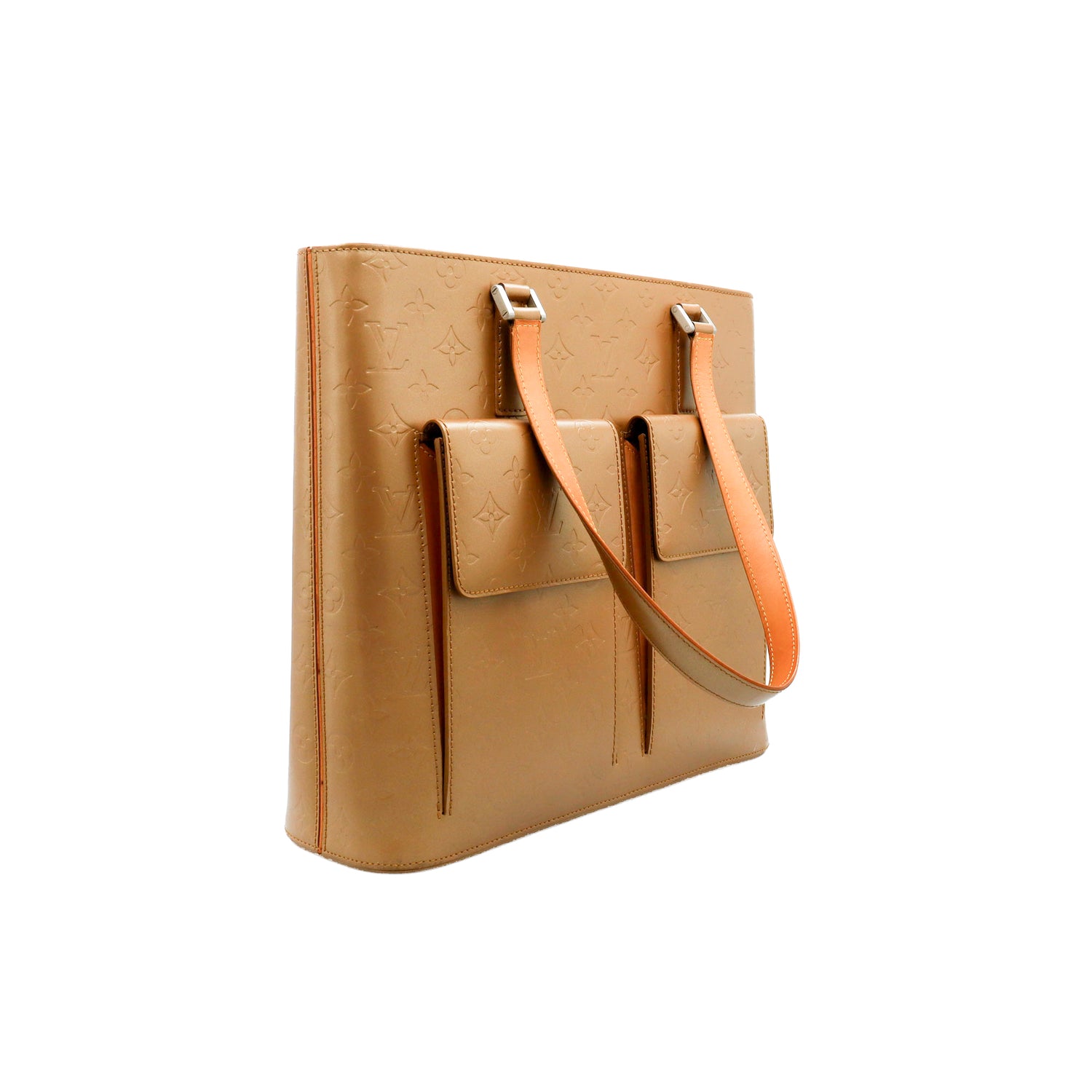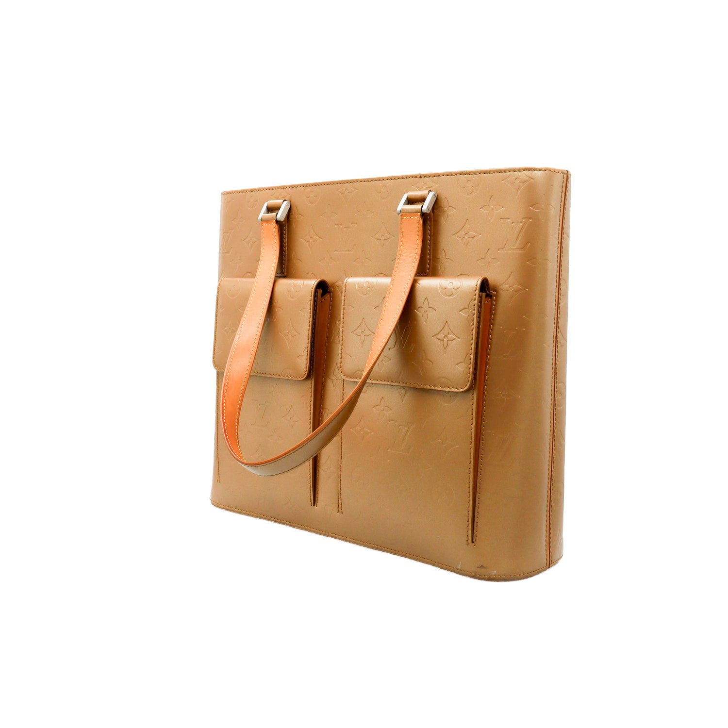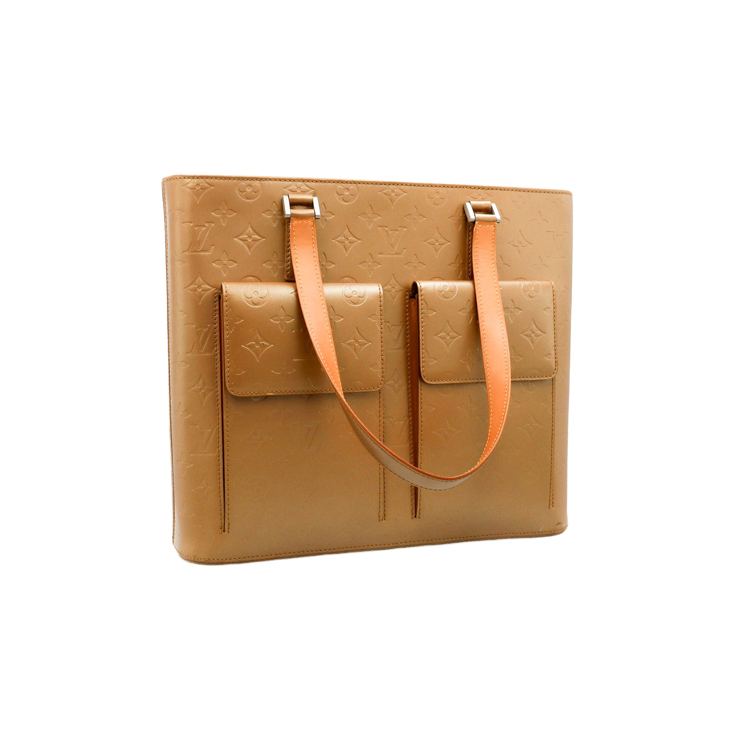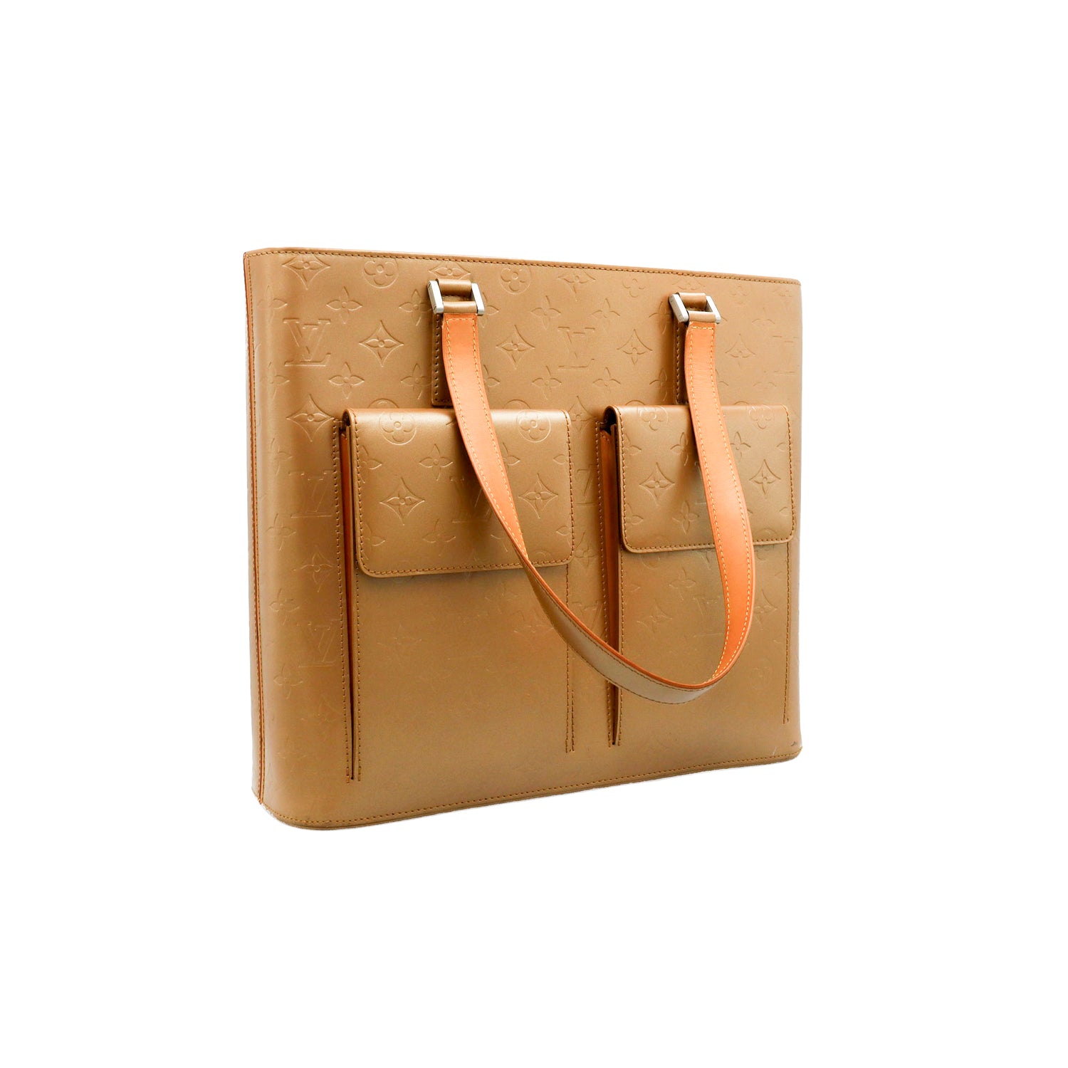 Bolso marca Louis Vuitton de la línea Mat Wilwood en piel vernis color dorado con monograma en acabado mate, forro interno en textil café, cuenta con 2 bolsillos externos con solapa, asas de cuero plana y cierres tipo cremallera.