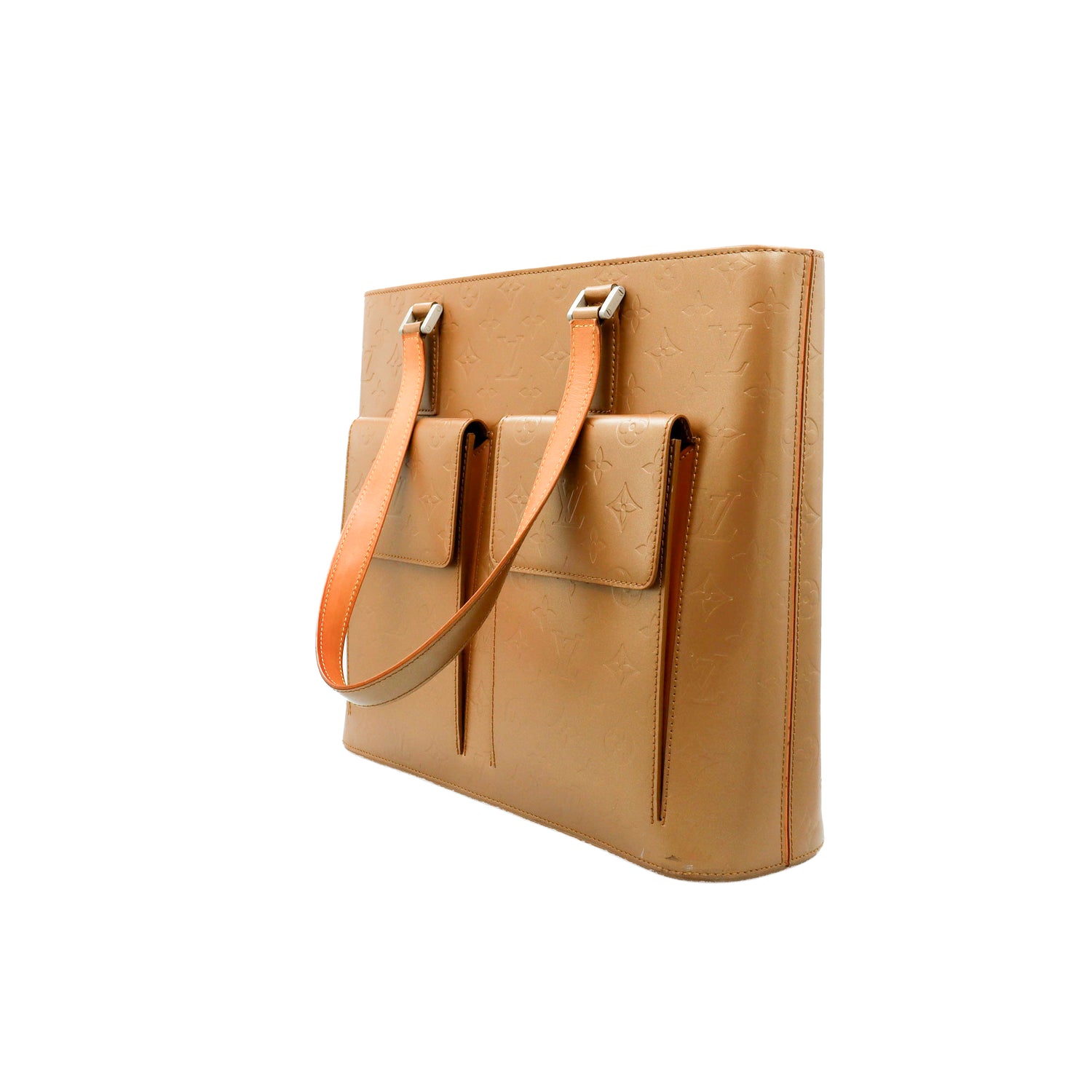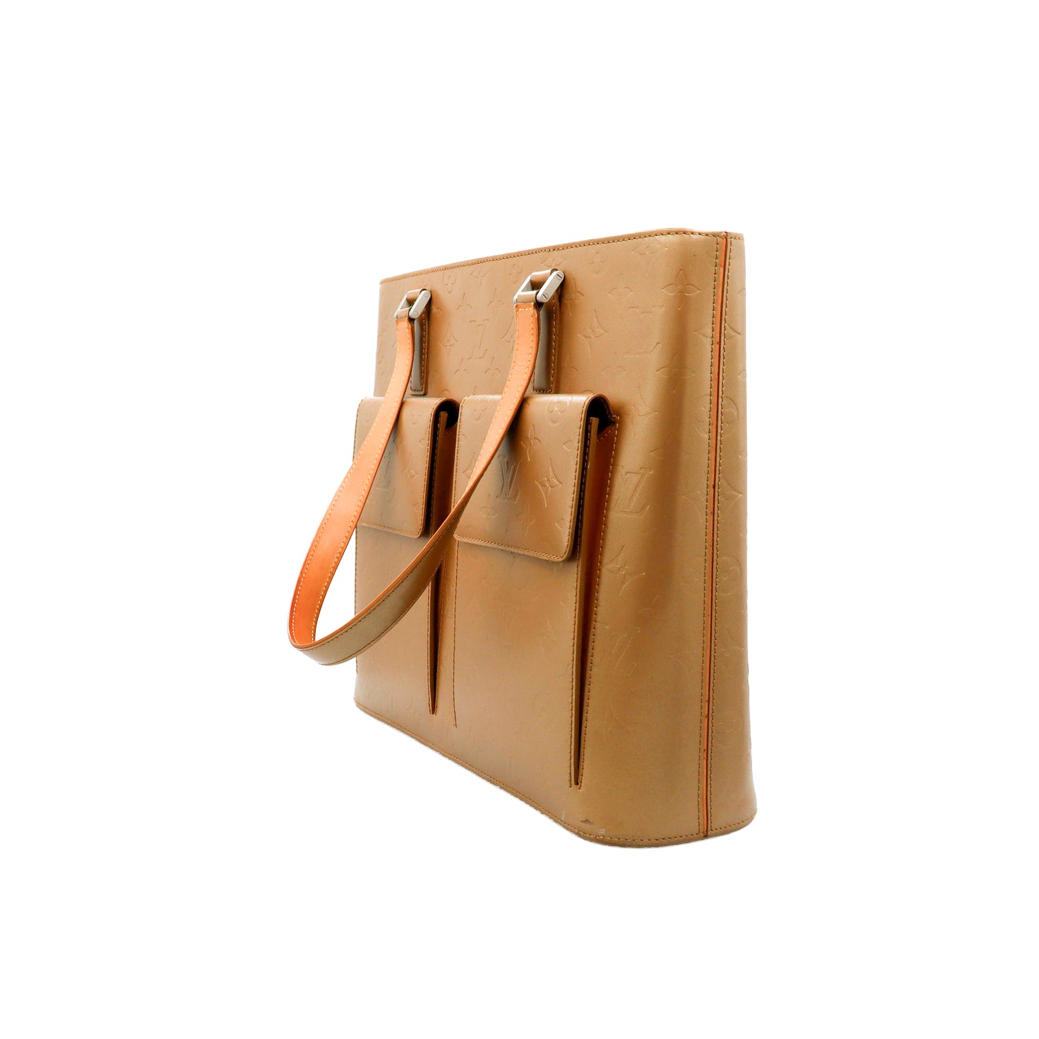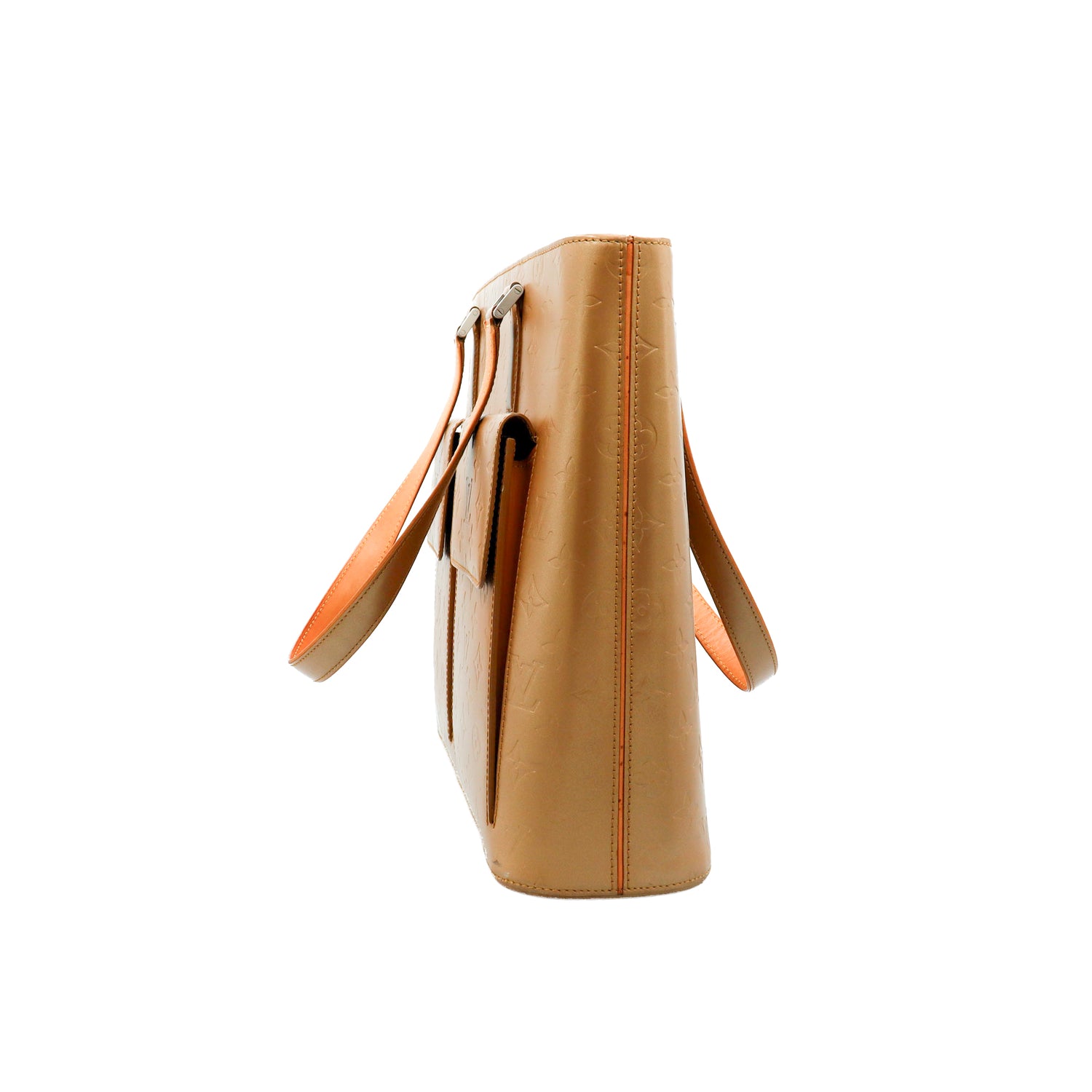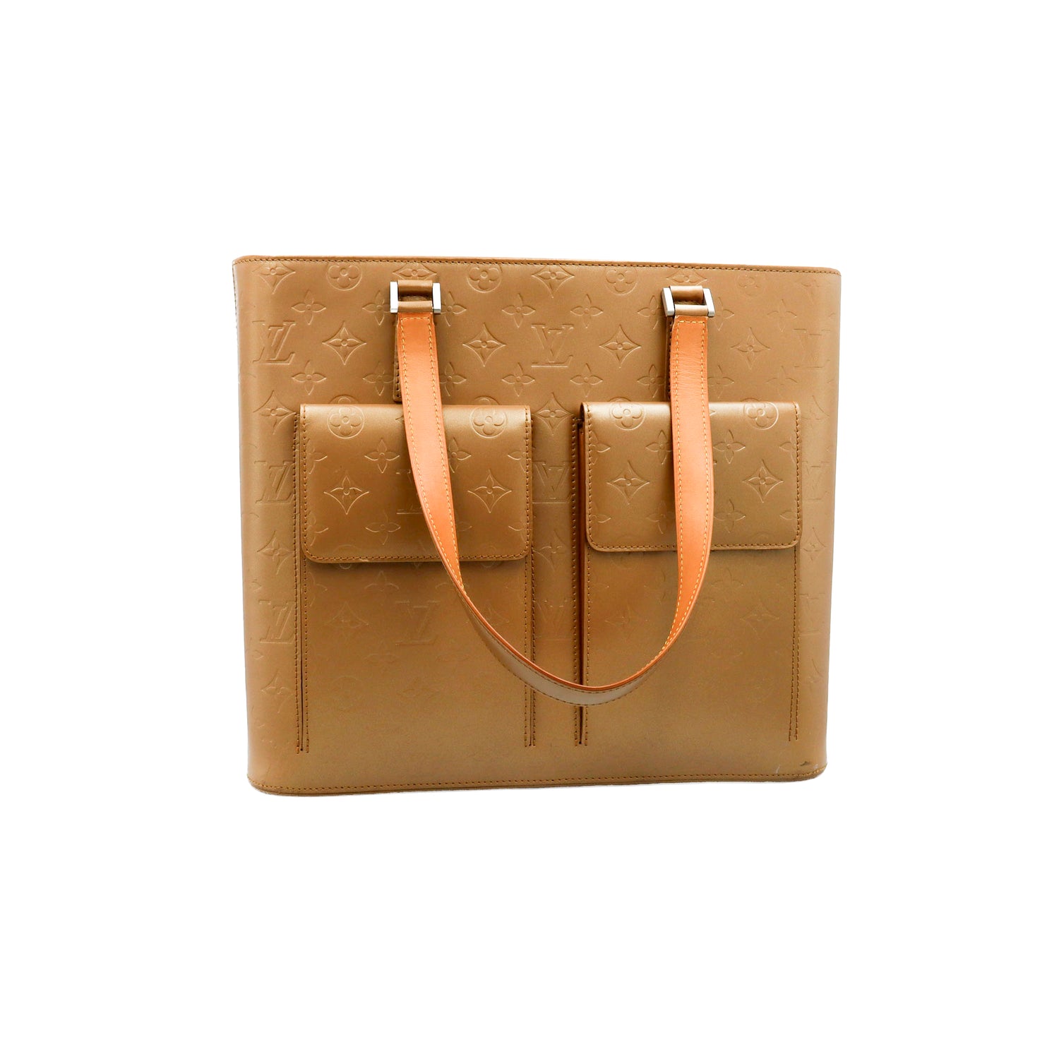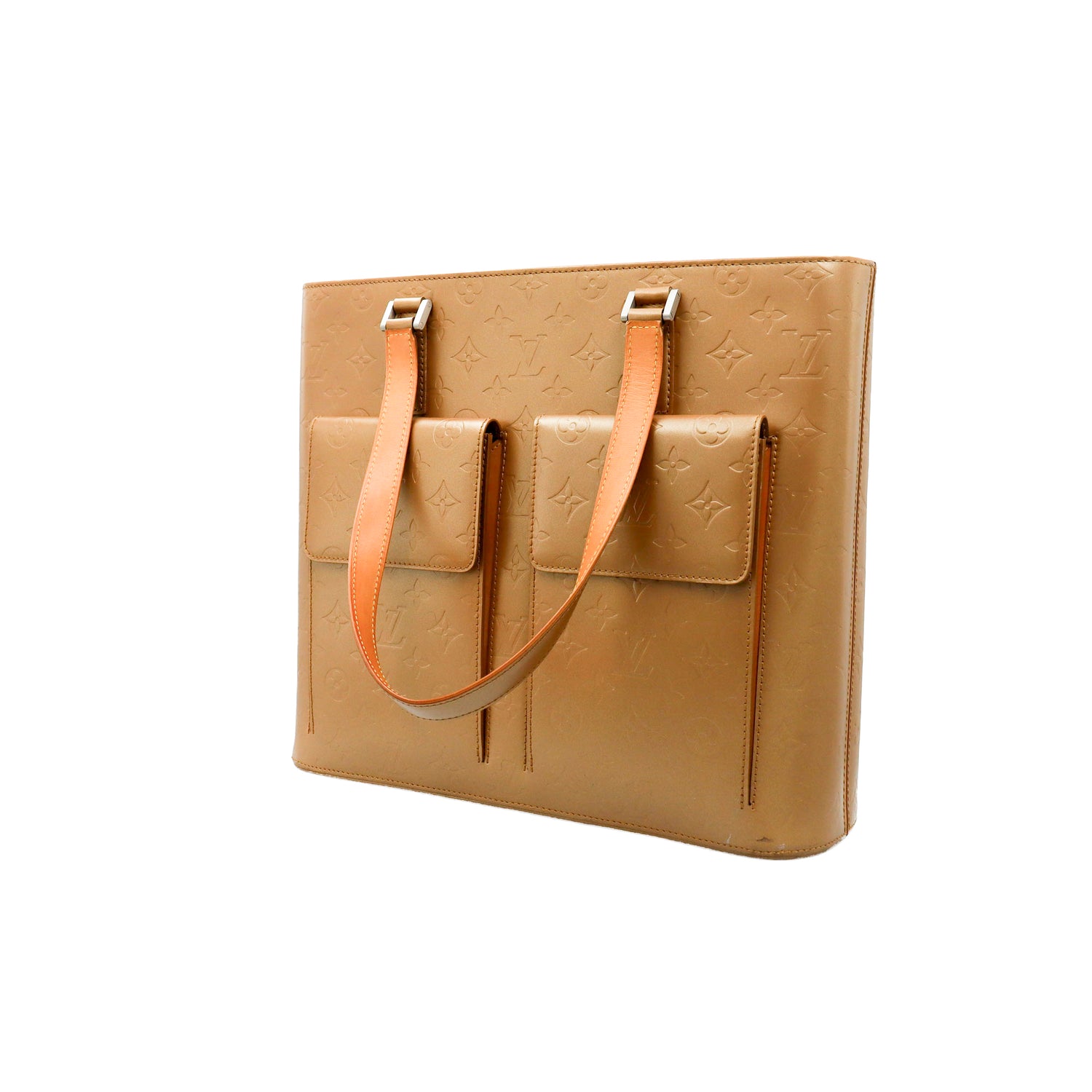 Bolso marca Louis Vuitton de la línea Mat Wilwood en piel vernis color dorado con monograma en acabado mate, forro interno en textil café, cuenta con 2 bolsillos externos con solapa, asas de cuero plana y cierres tipo cremallera.