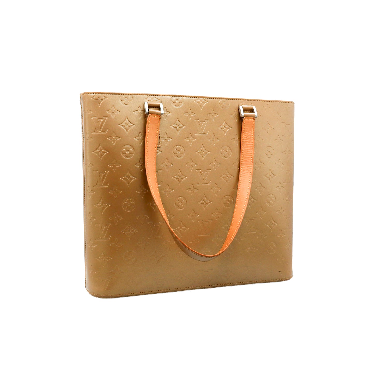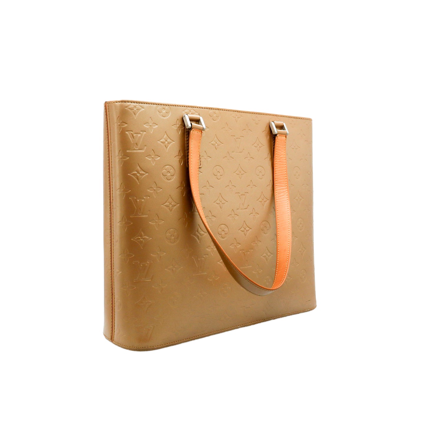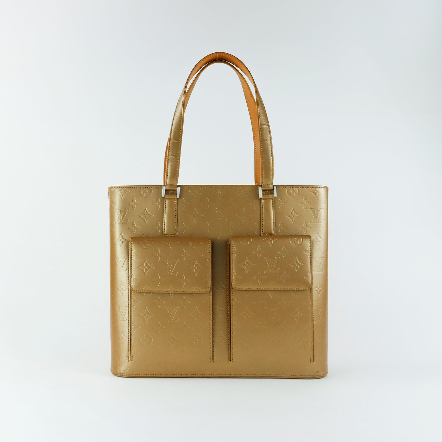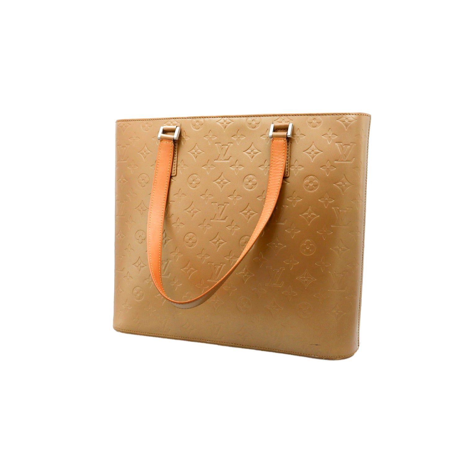 Bolso marca Louis Vuitton de la línea Mat Wilwood en piel vernis color dorado con monograma en acabado mate, forro interno en textil café, cuenta con 2 bolsillos externos con solapa, asas de cuero plana y cierres tipo cremallera.