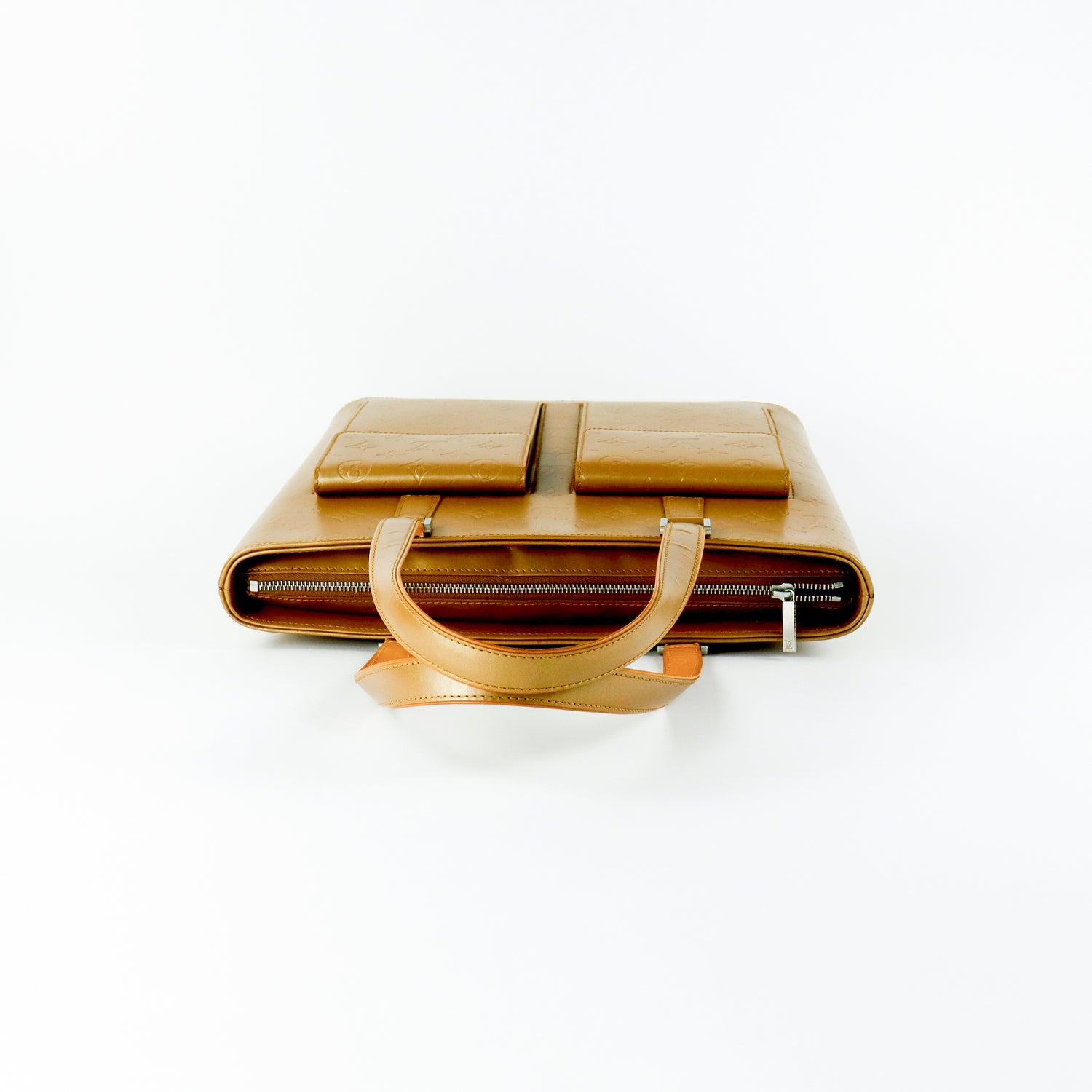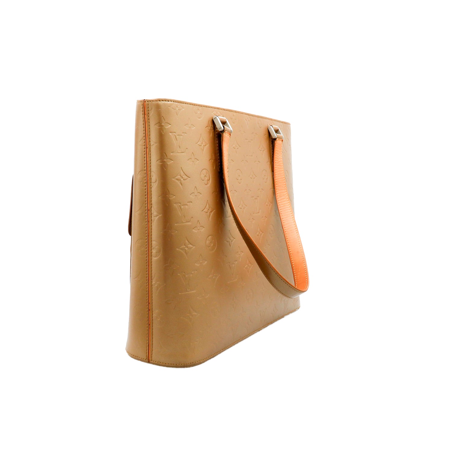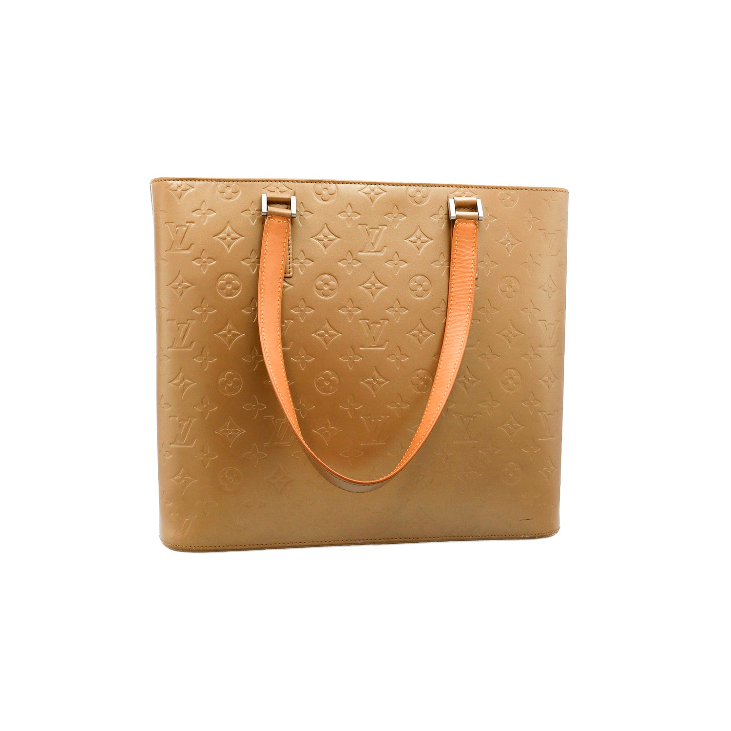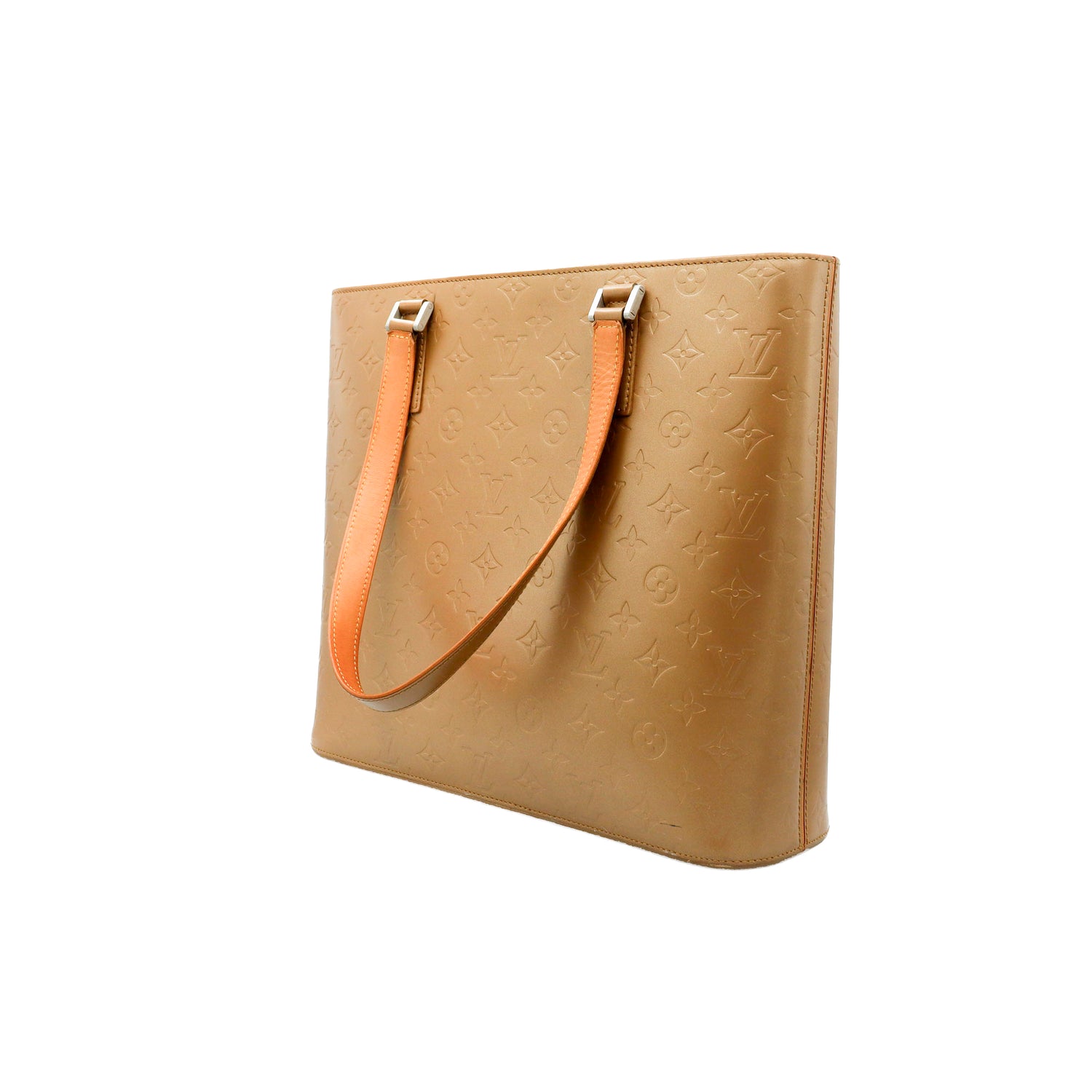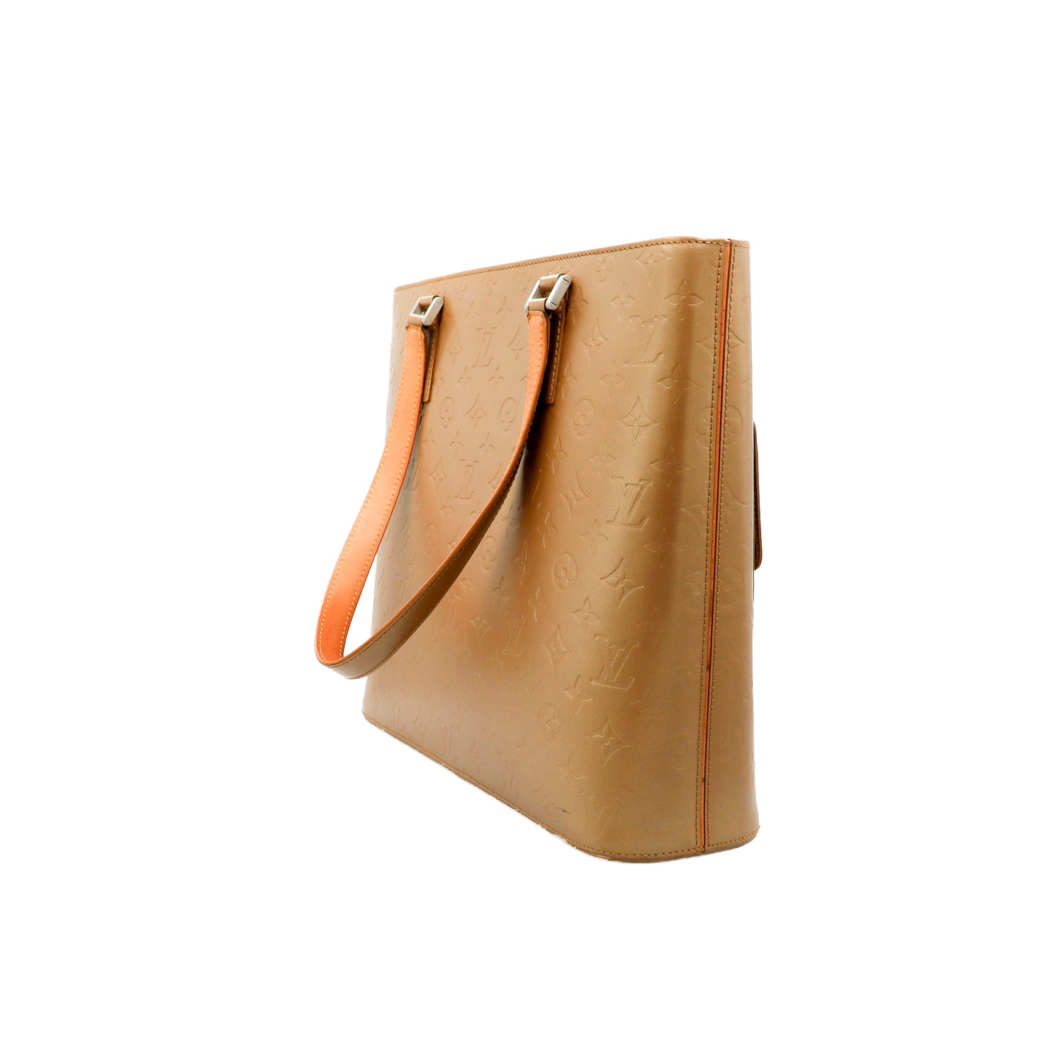 Bolso marca Louis Vuitton de la línea Mat Wilwood en piel vernis color dorado con monograma en acabado mate, forro interno en textil café, cuenta con 2 bolsillos externos con solapa, asas de cuero plana y cierres tipo cremallera.