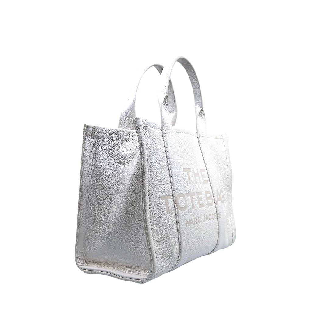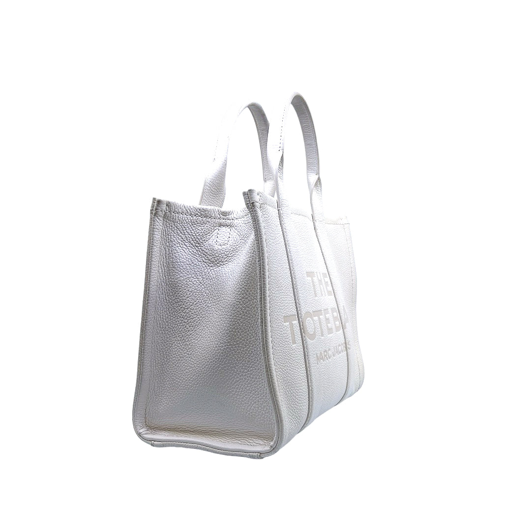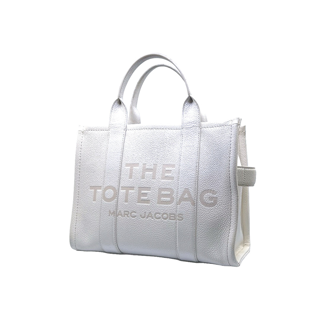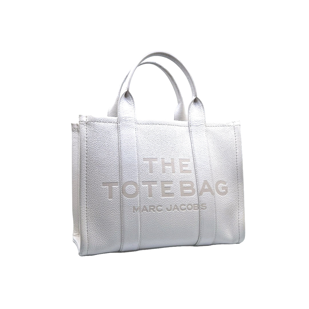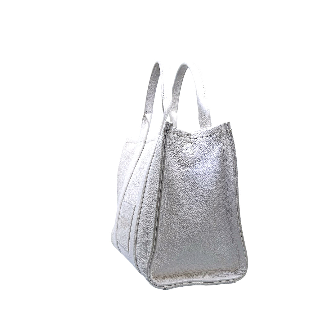 Bolso marca Marc Jacobs, de la línea The Tote Bag, confeccionado en piel color blanco, con 2 asas rígidas superiores, forro interior en tela, cuenta con correa para llevar al hombro, marcas de uso en asas y superficie.