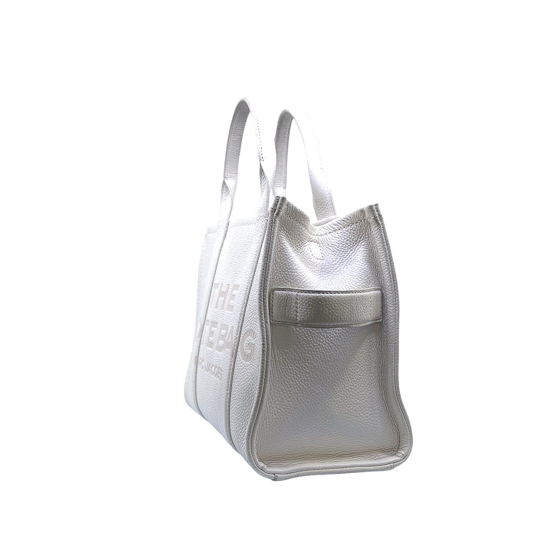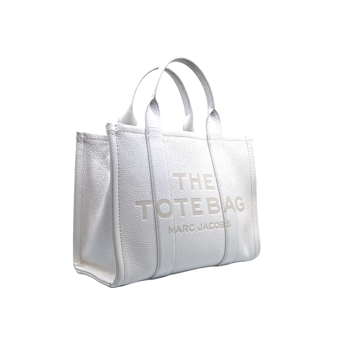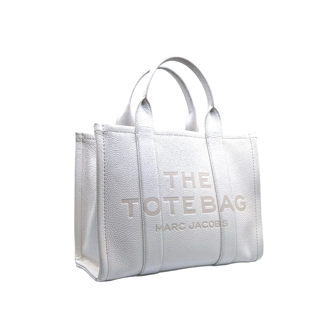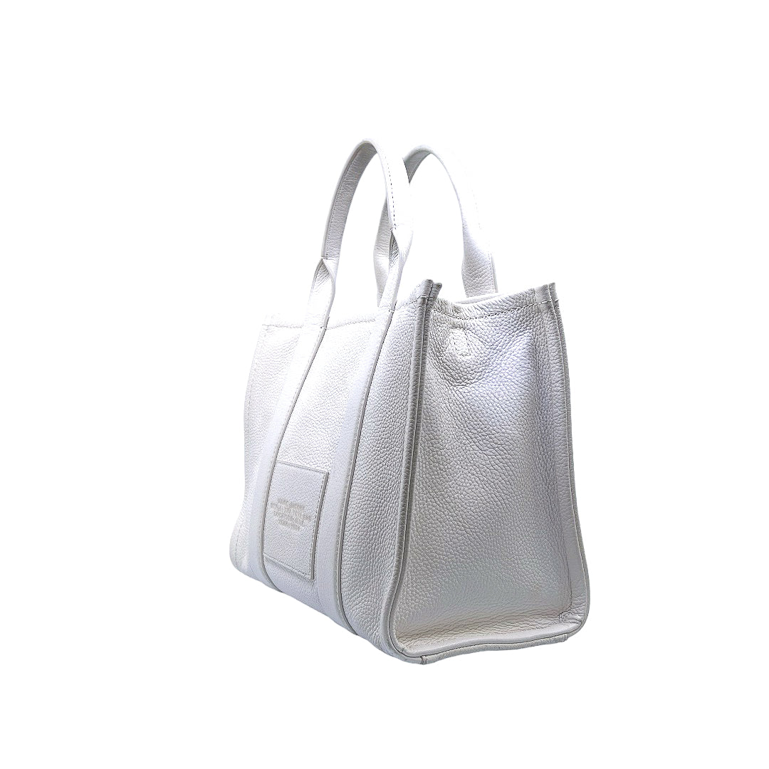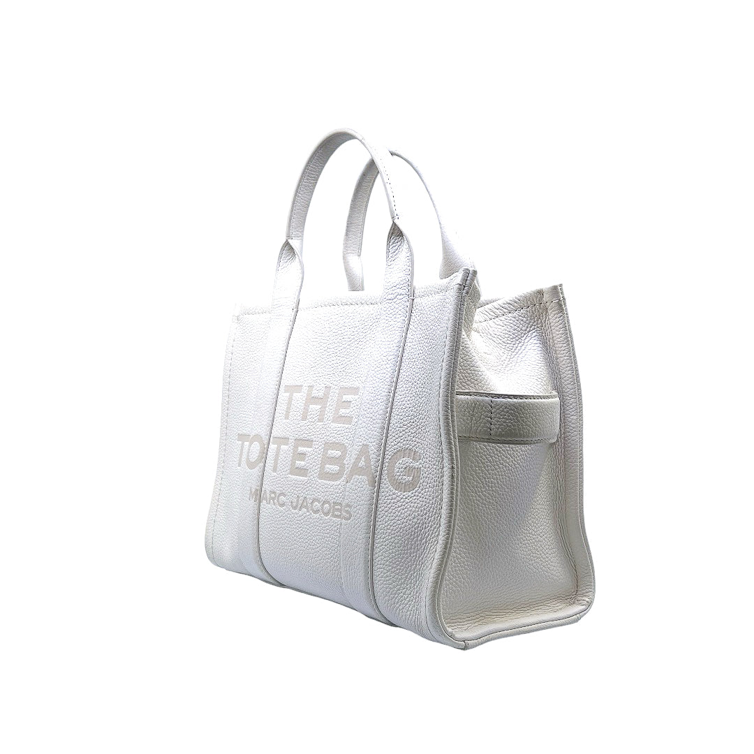 Bolso marca Marc Jacobs, de la línea The Tote Bag, confeccionado en piel color blanco, con 2 asas rígidas superiores, forro interior en tela, cuenta con correa para llevar al hombro, marcas de uso en asas y superficie.