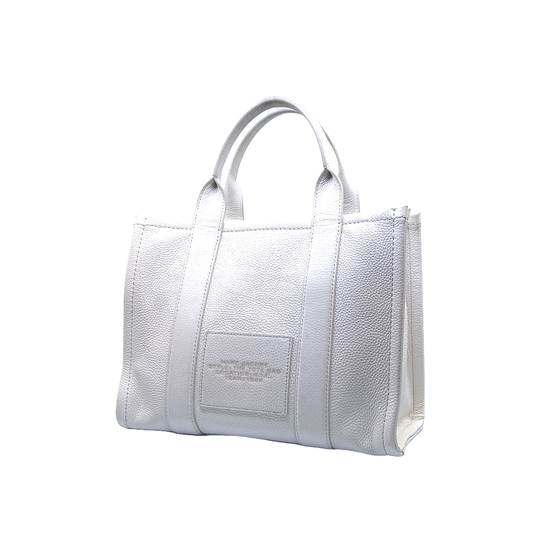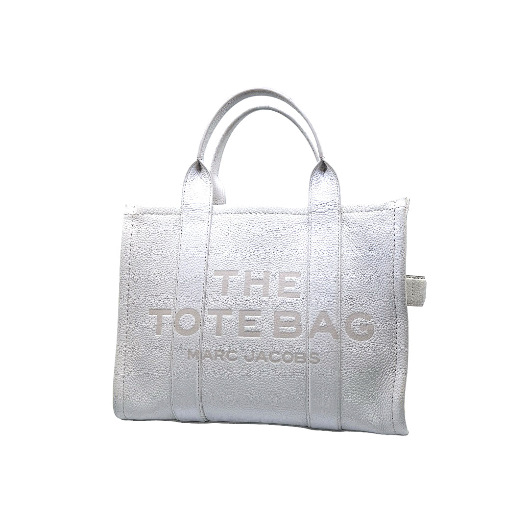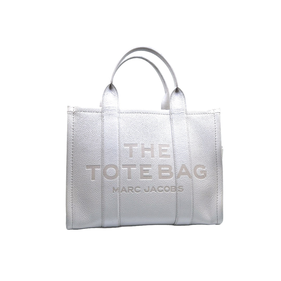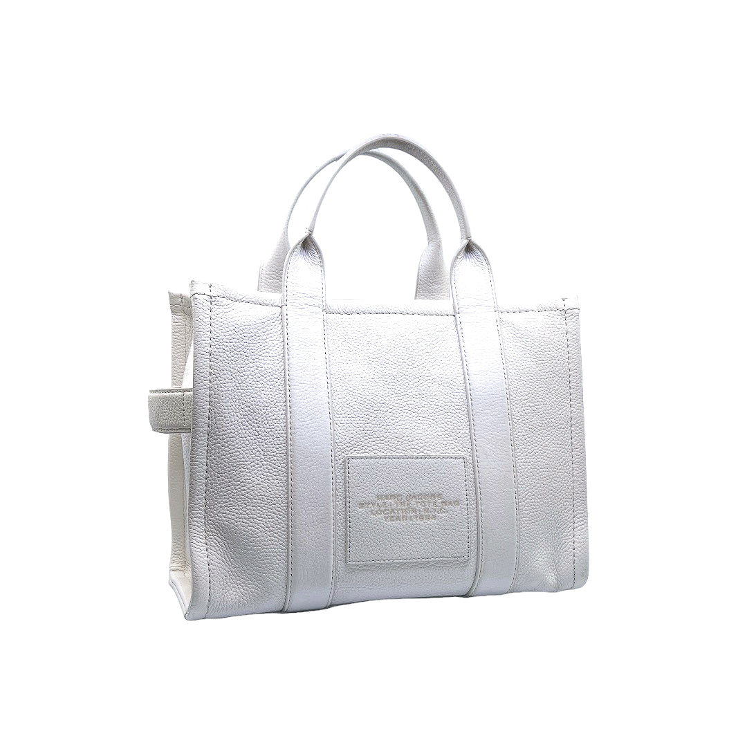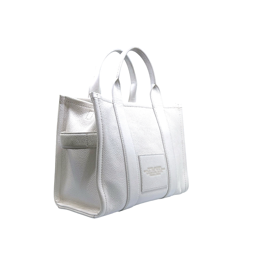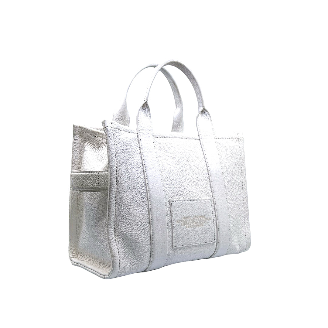 Bolso marca Marc Jacobs, de la línea The Tote Bag, confeccionado en piel color blanco, con 2 asas rígidas superiores, forro interior en tela, cuenta con correa para llevar al hombro, marcas de uso en asas y superficie.