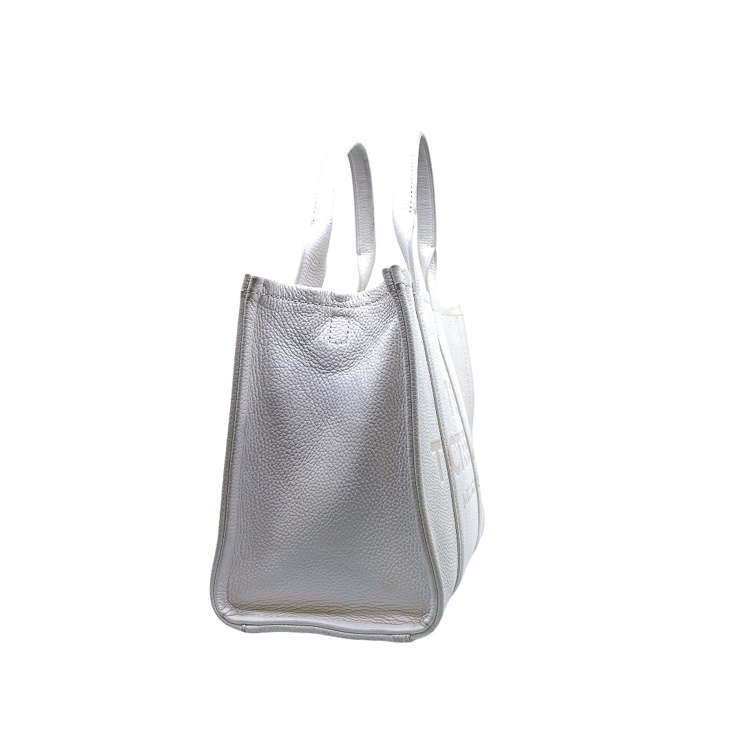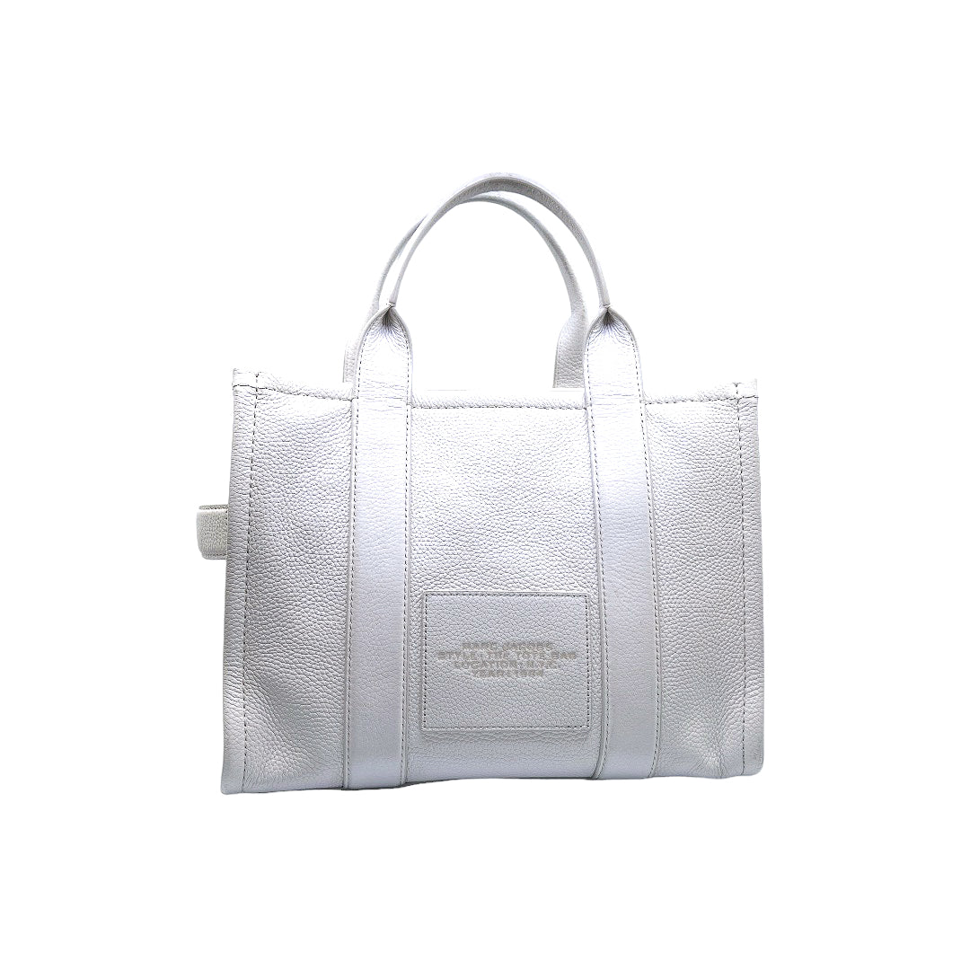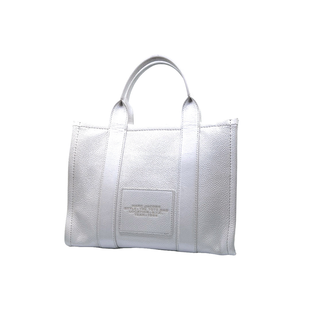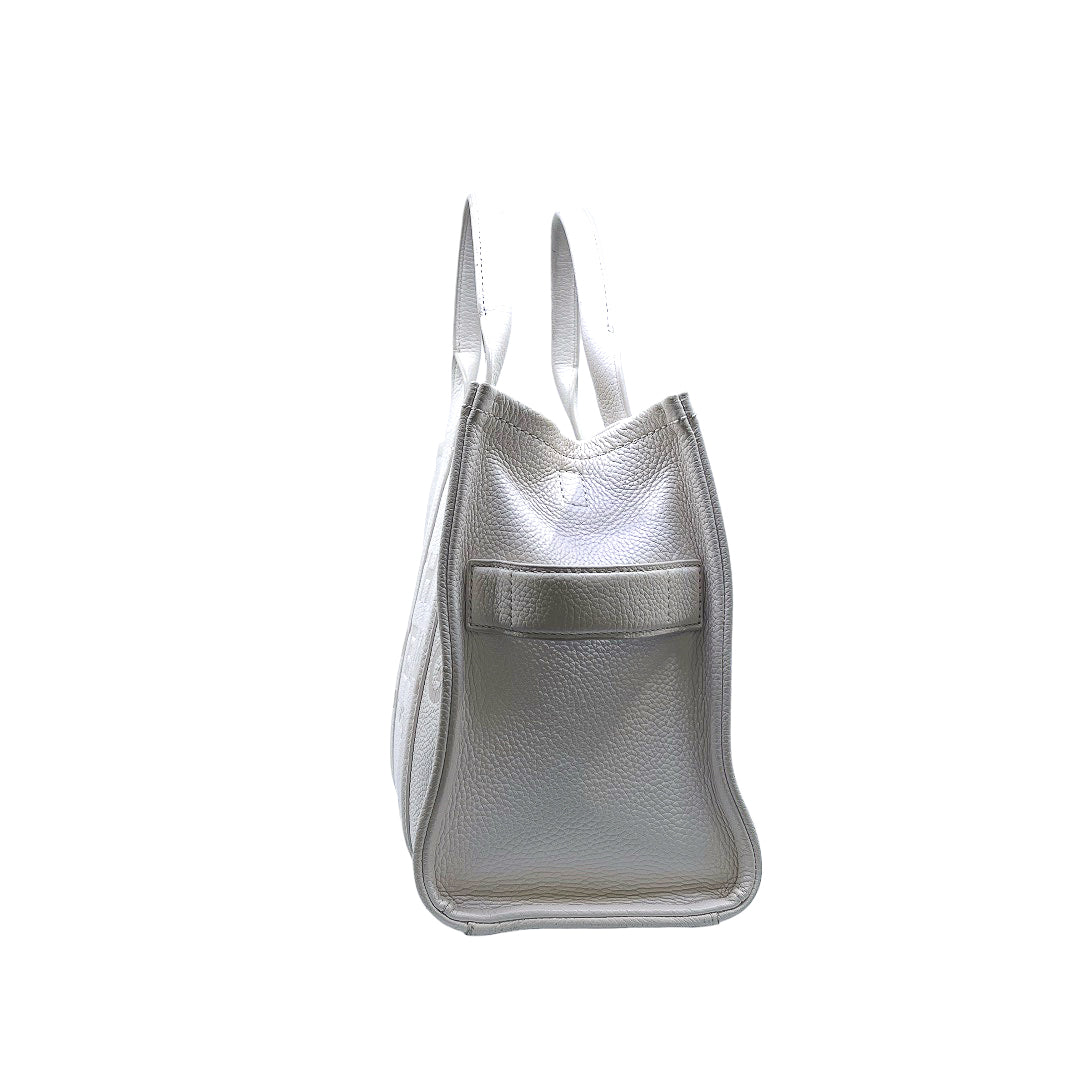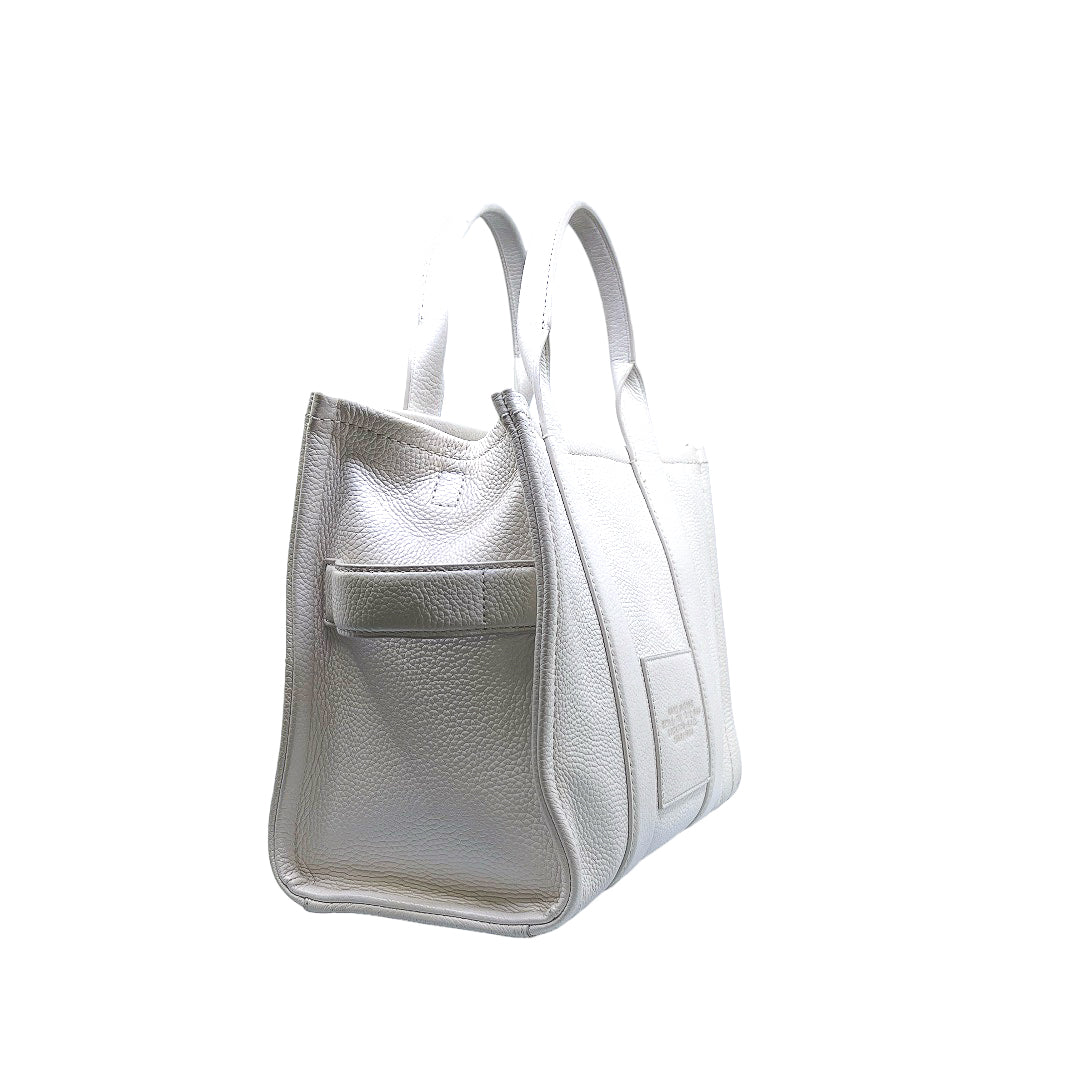 Bolso marca Marc Jacobs, de la línea The Tote Bag, confeccionado en piel color blanco, con 2 asas rígidas superiores, forro interior en tela, cuenta con correa para llevar al hombro, marcas de uso en asas y superficie.